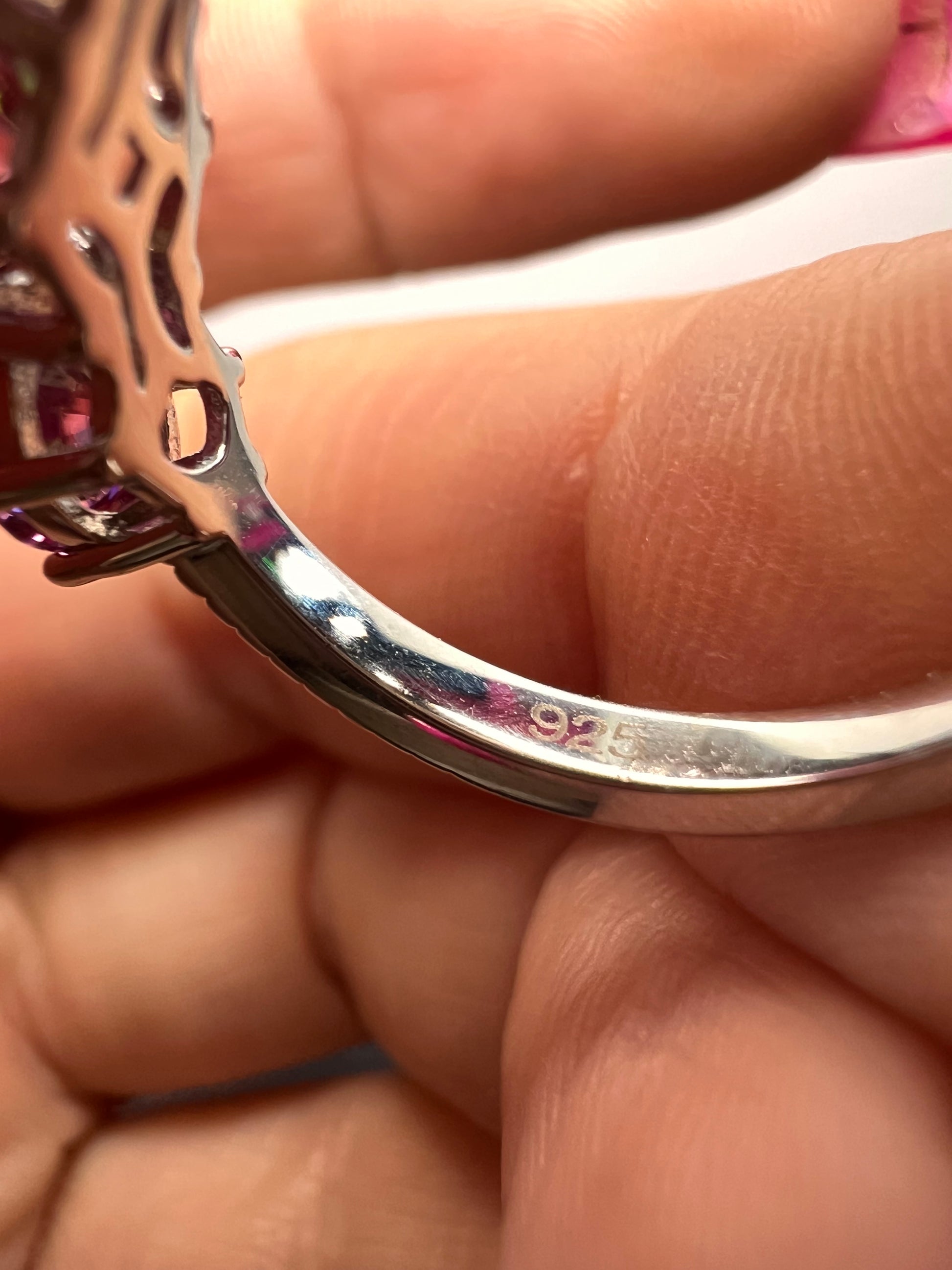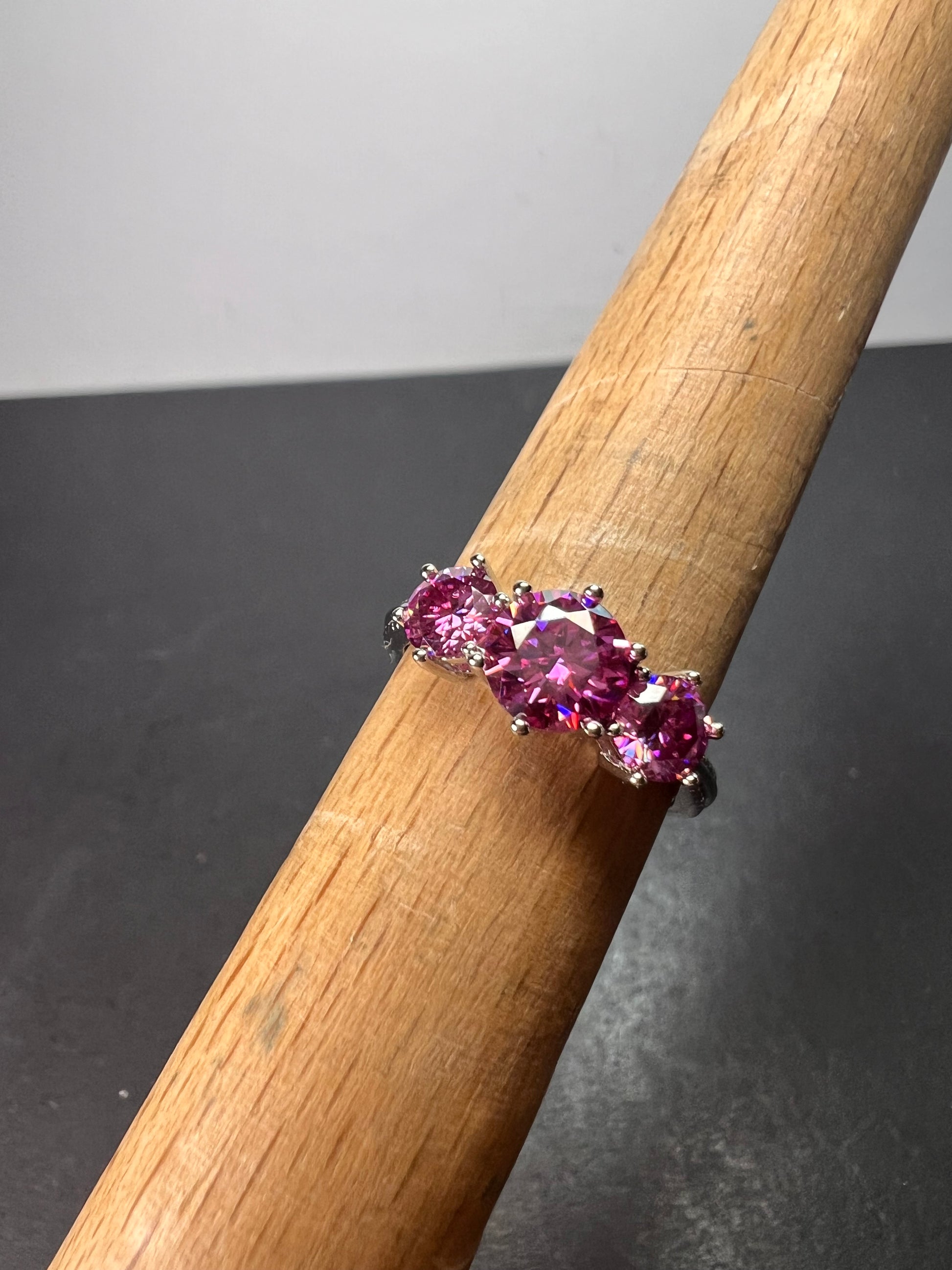Three pink moissanite stones totaling 1.85 ctw. Prong set in platinum over sterling silver. Size 7. 925 Djoy