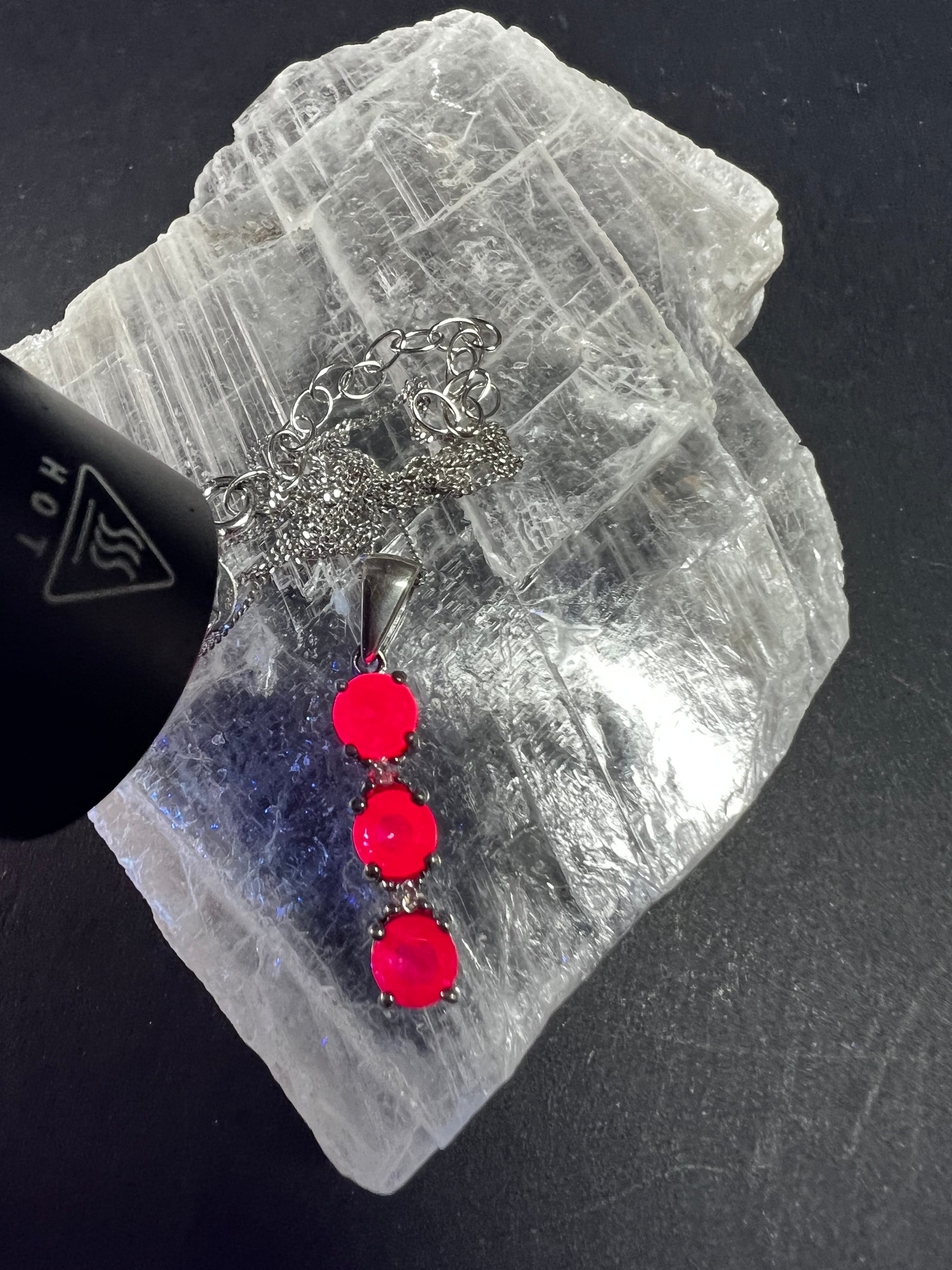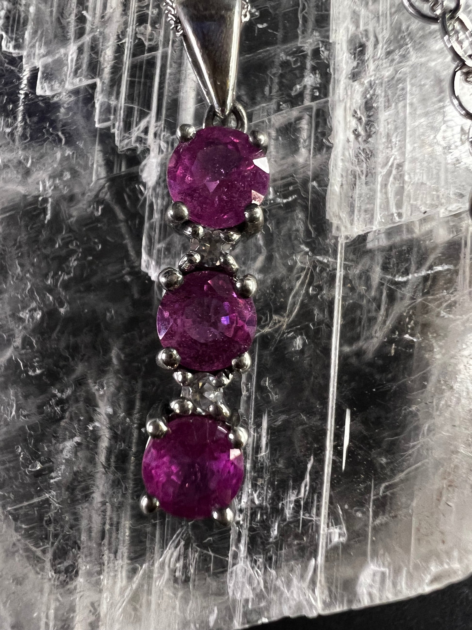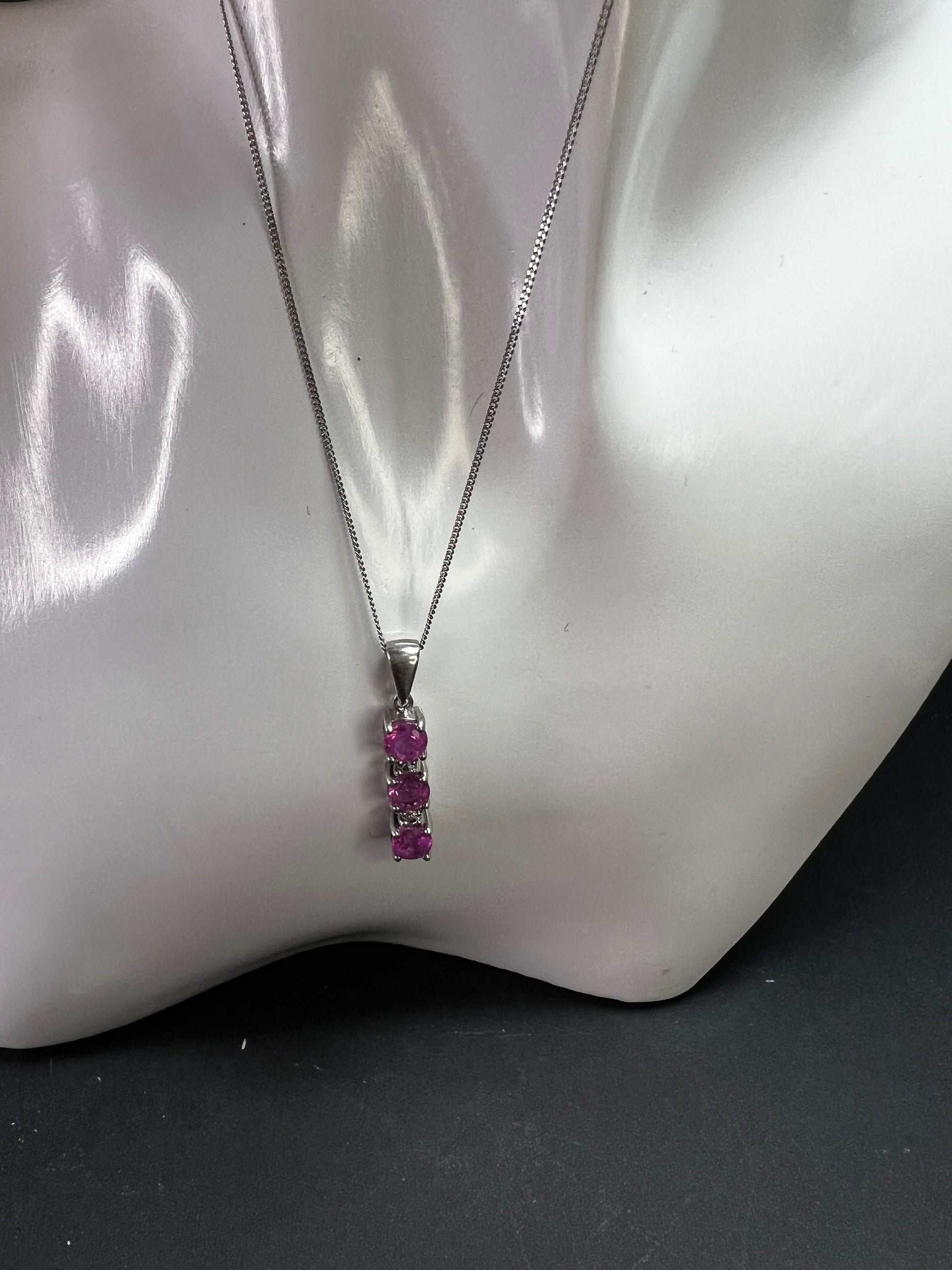 Pre-owned sterling silver pink sapphire and white topaz drop pendant necklace on adjustable 16–18” sterling chain. Features three vivid hot pink natural sapphires measuring approx 5mm each with sparkling white topaz accents between, marked 925 TGGC on bail. Total weight approx 3.26g. Estimated pink sapphire weight approx 1.75–2.05 ctw with ~0.10 ctw white topaz accents. Sapphires show bright bubblegum/hot pink color with natural inclusions and strong sparkle. Estate acquired and in very good pre-owned condition with light wear only. Eye-catching vertical drop design with substantial gemstone presence, perfect for layering or everyday wear.