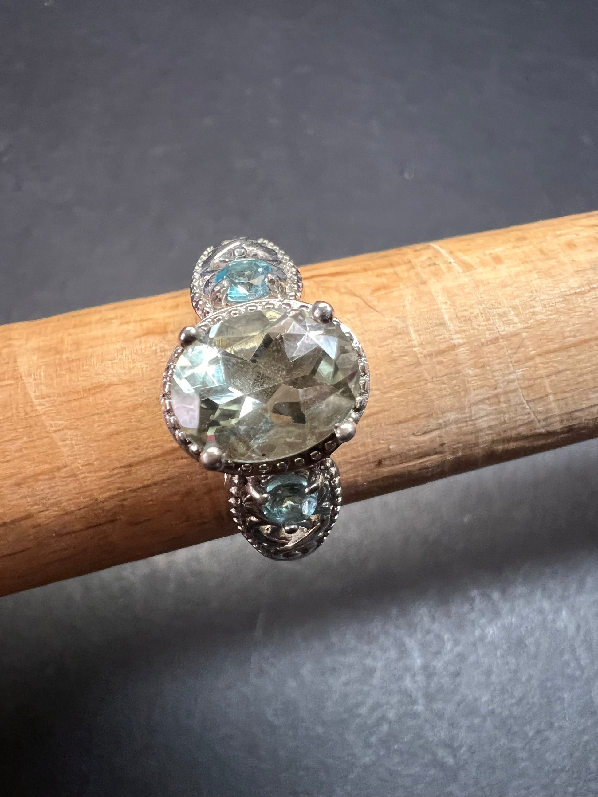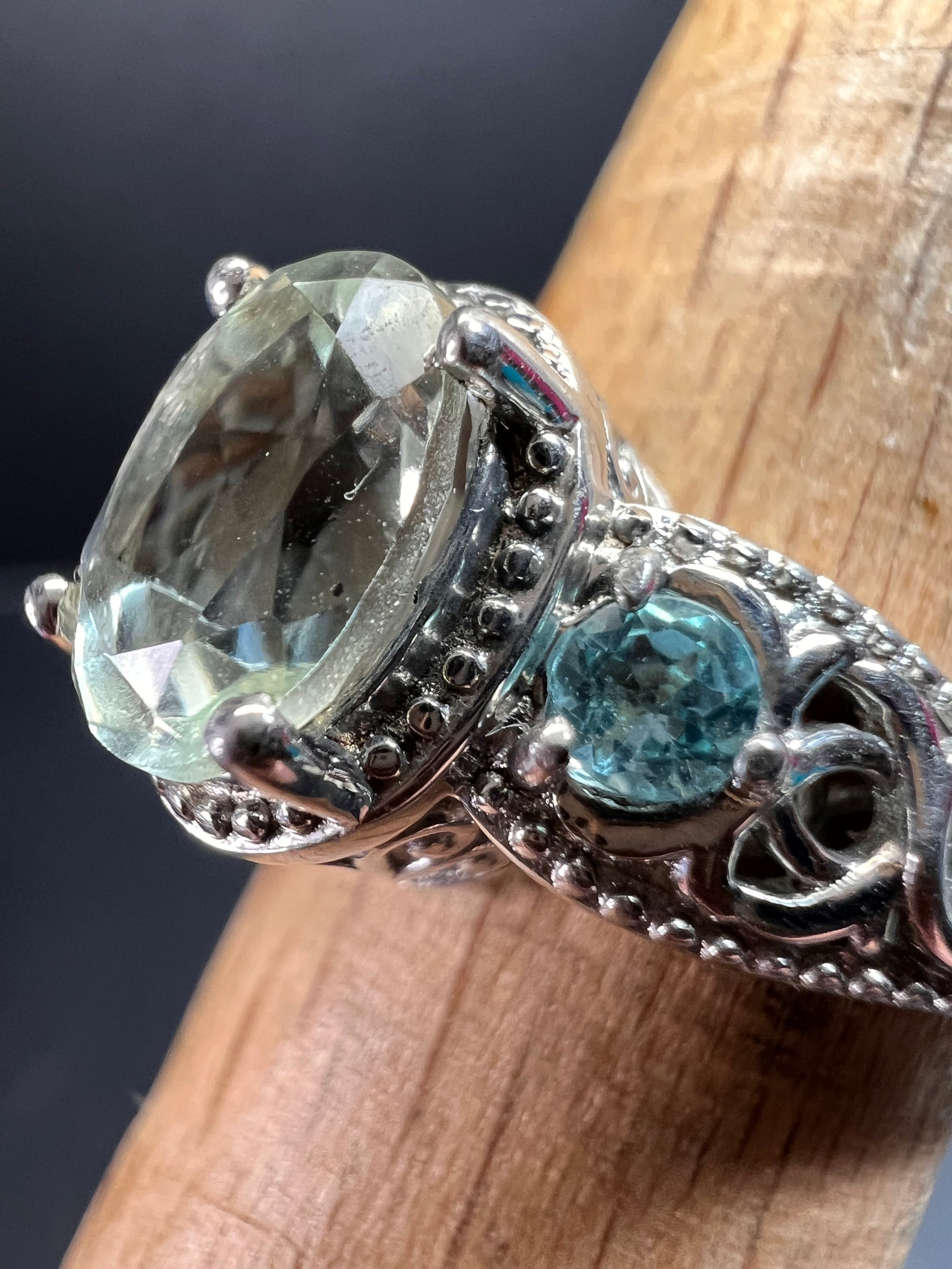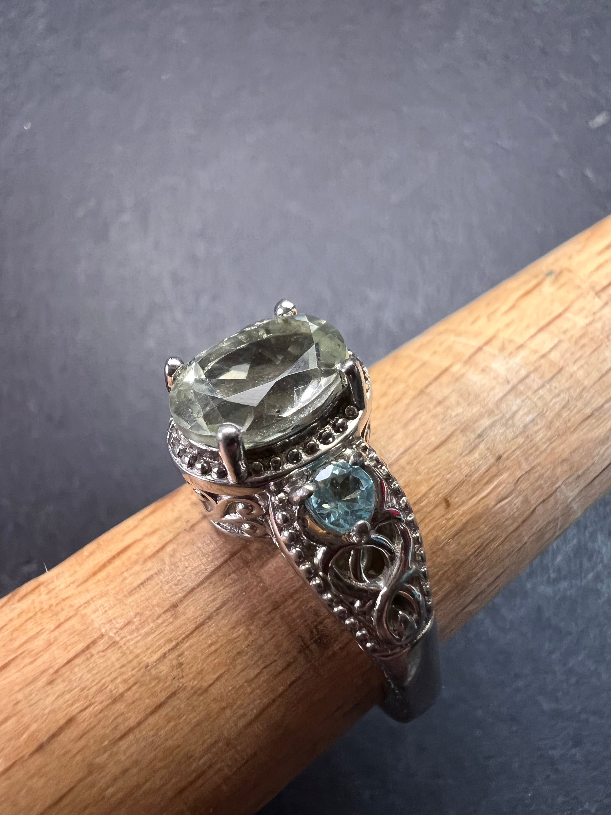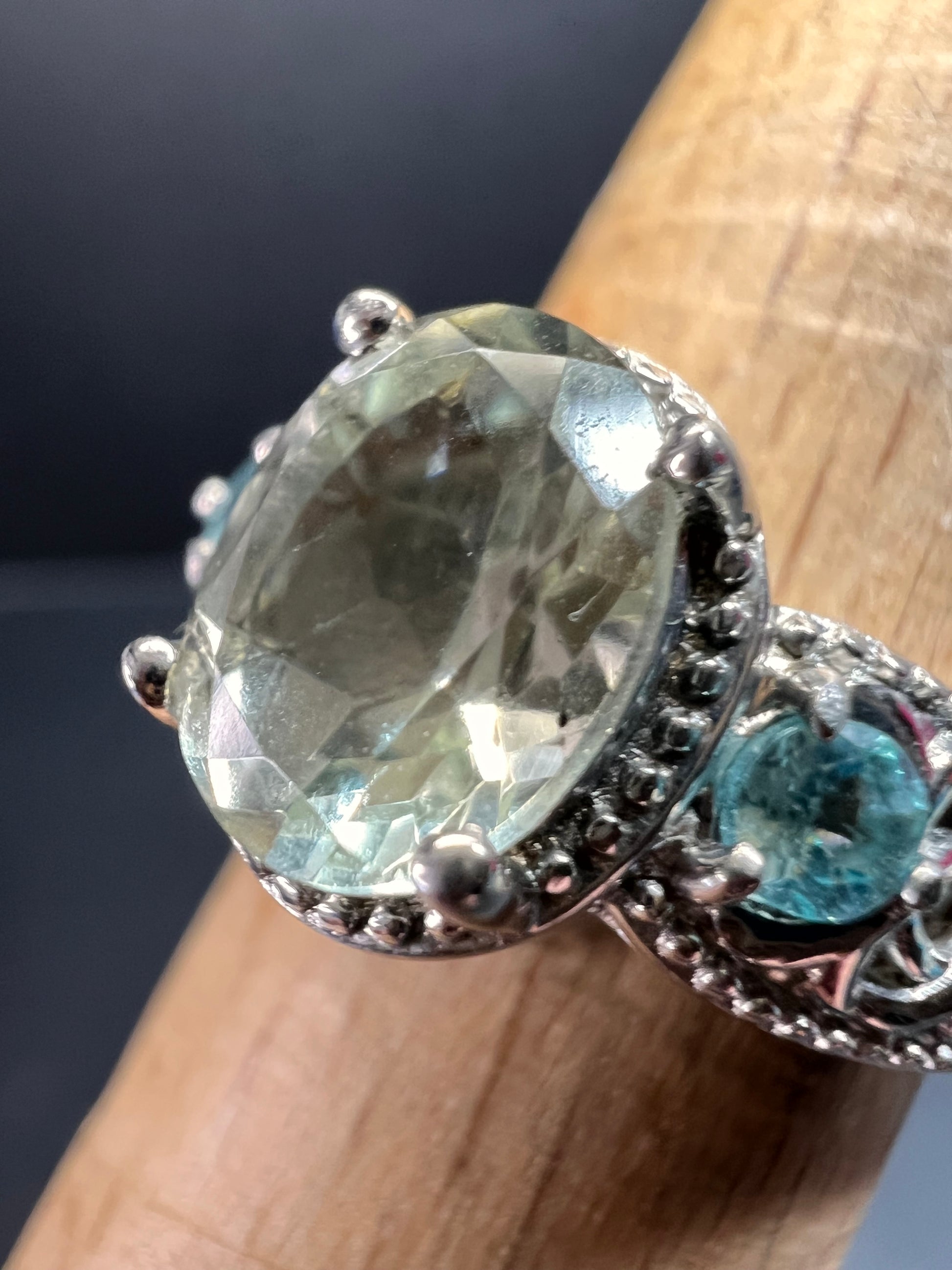 Genuine gemstones of prasiolite and blue apatite prong set in a platinum bond setting of platinum plated over copper with magnet. Measures a size 8