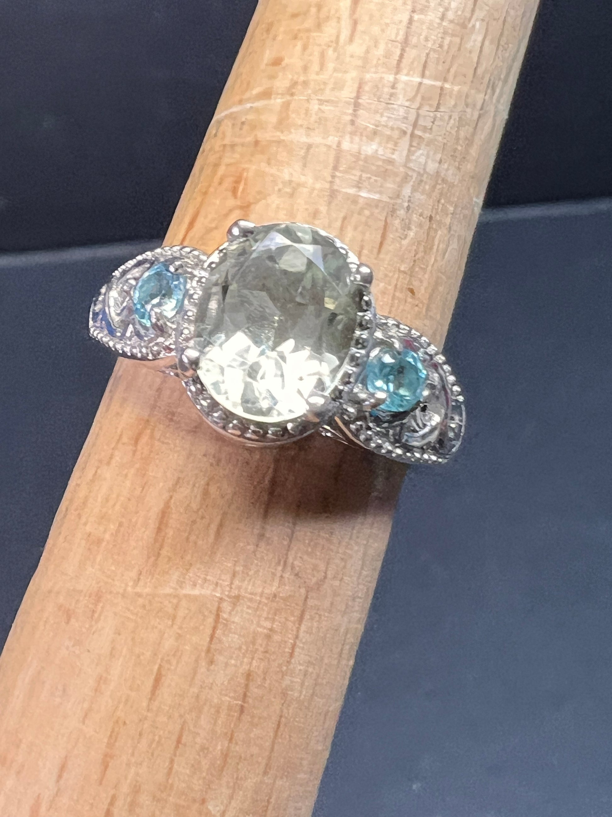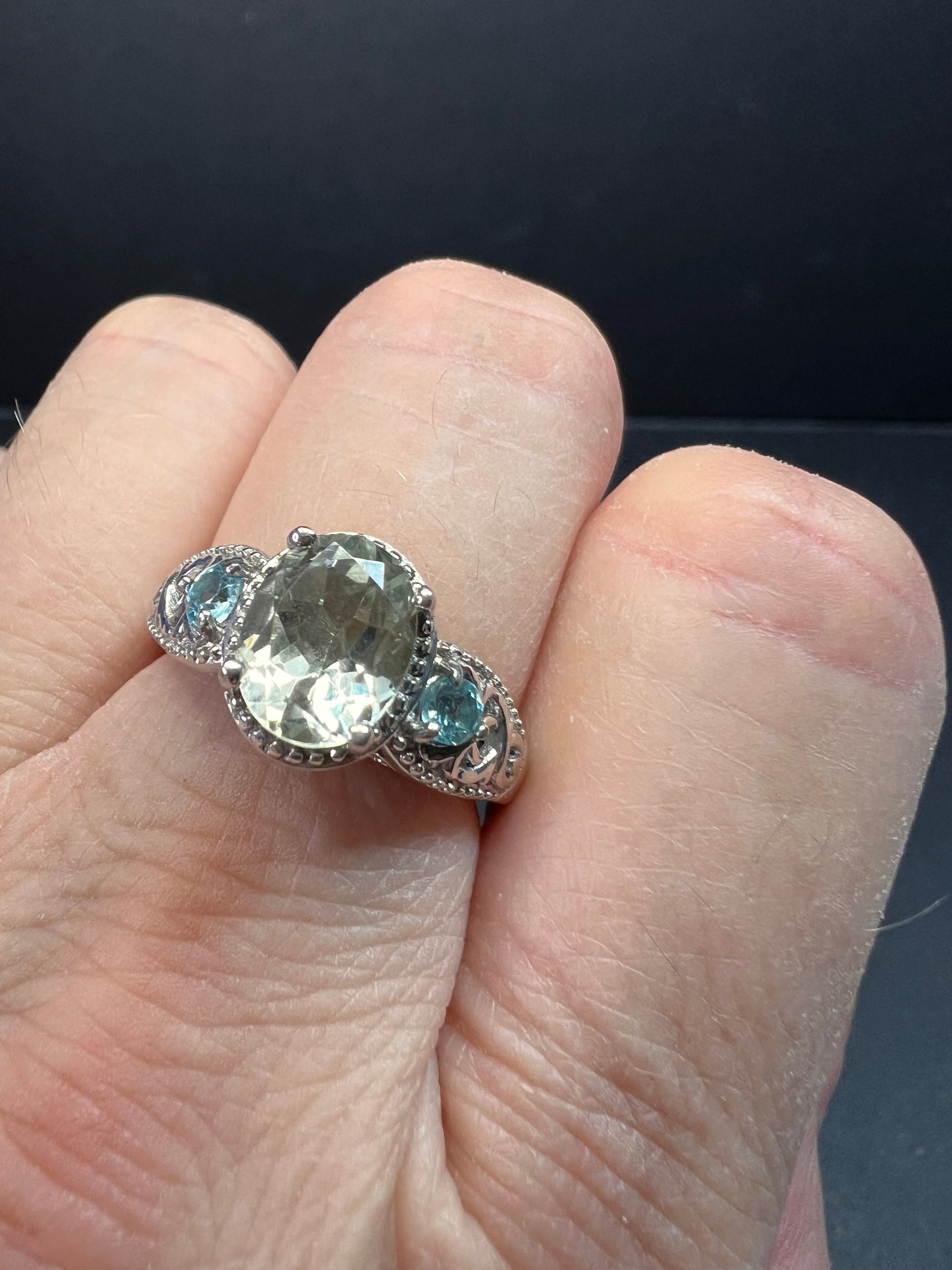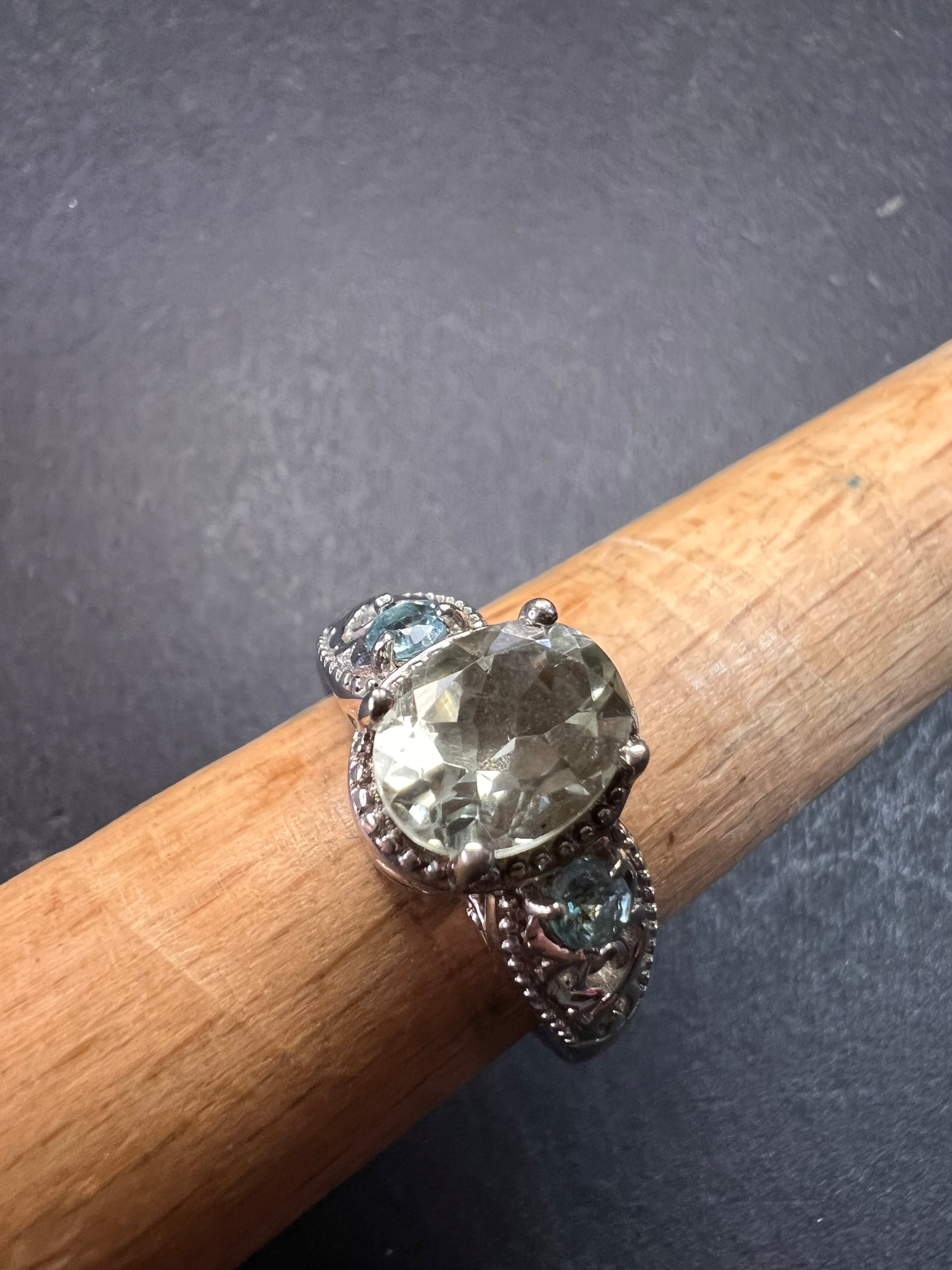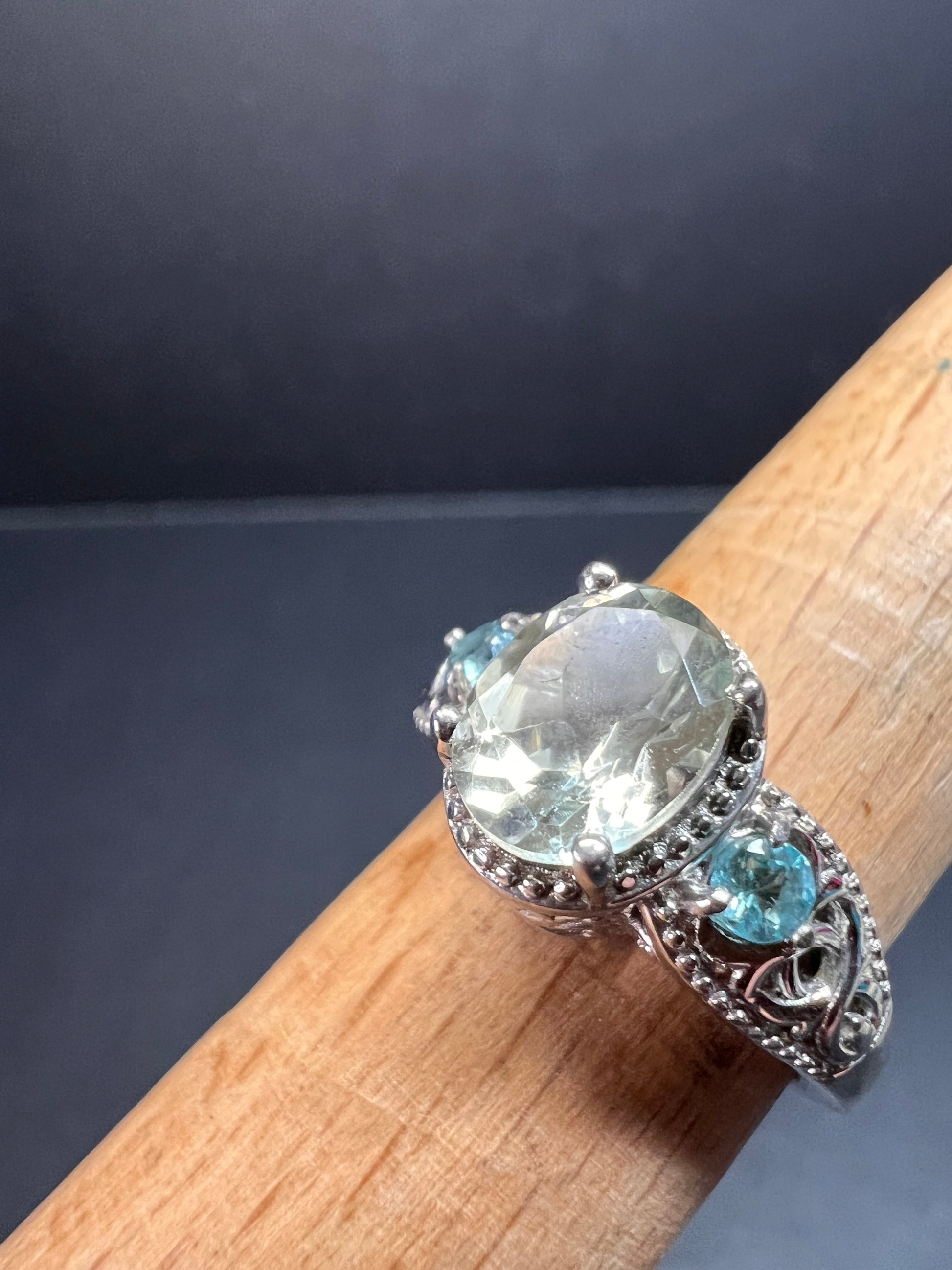 Genuine gemstones of prasiolite and blue apatite prong set in a platinum bond setting of platinum plated over copper with magnet. Measures a size 8