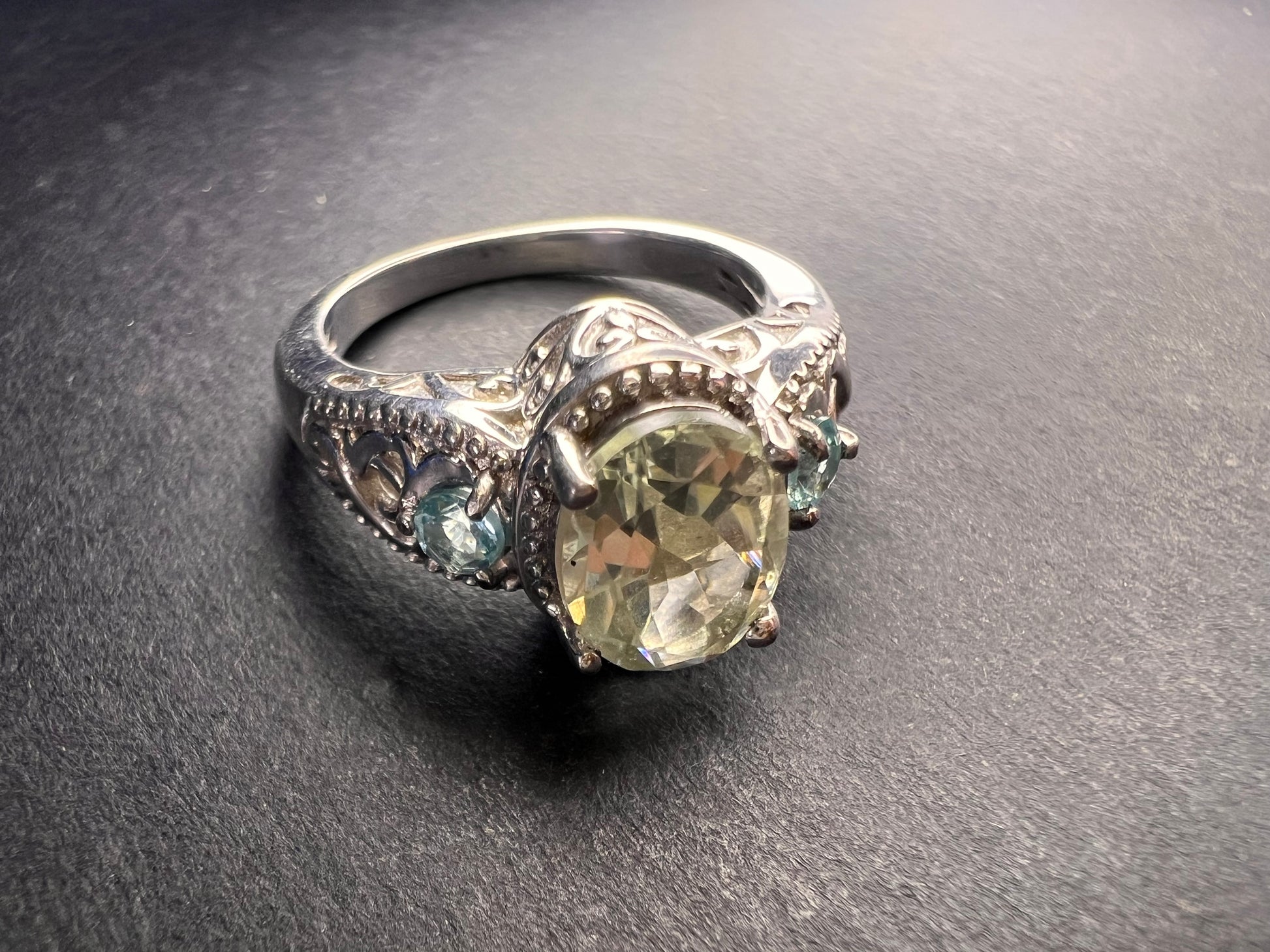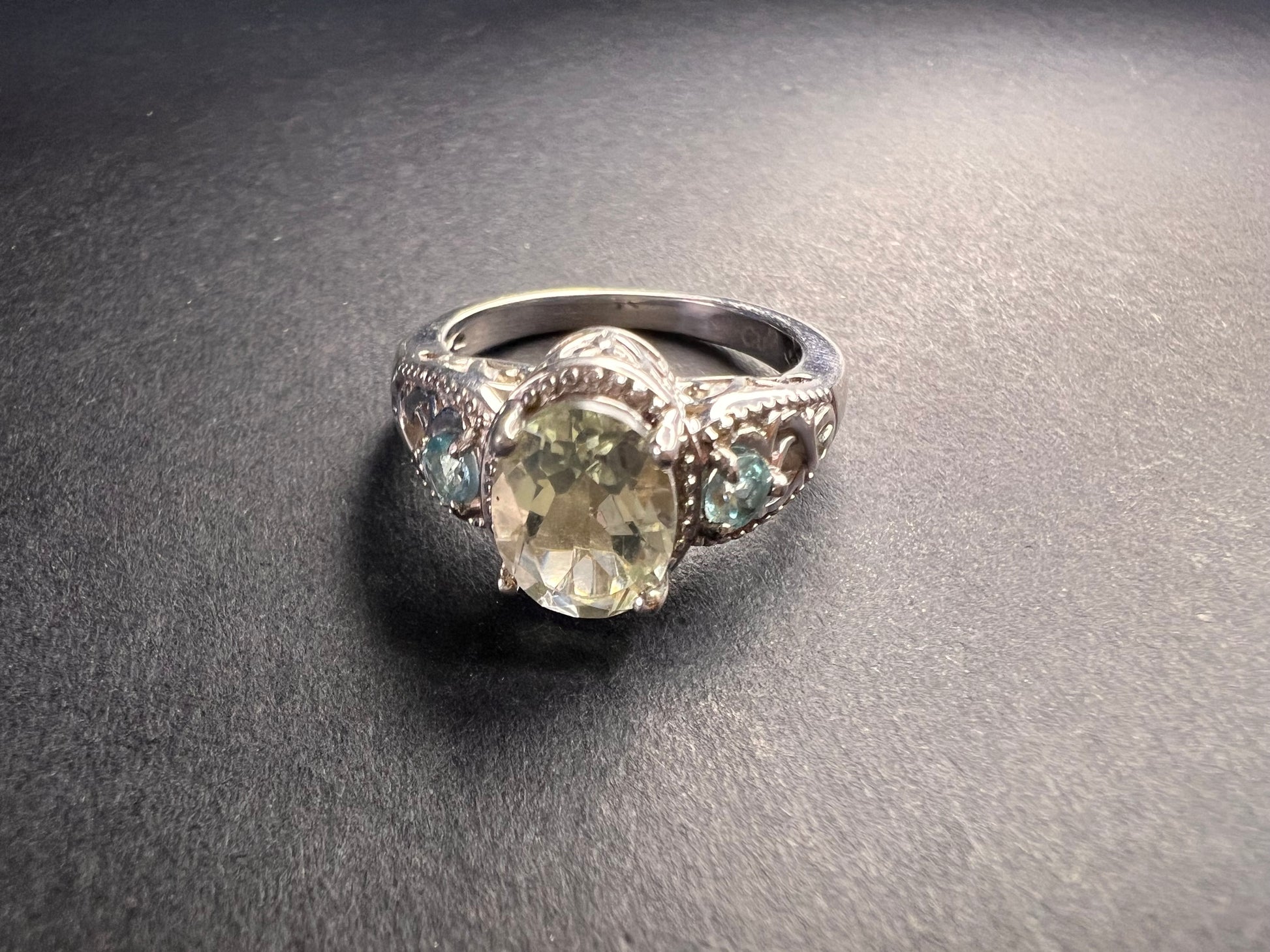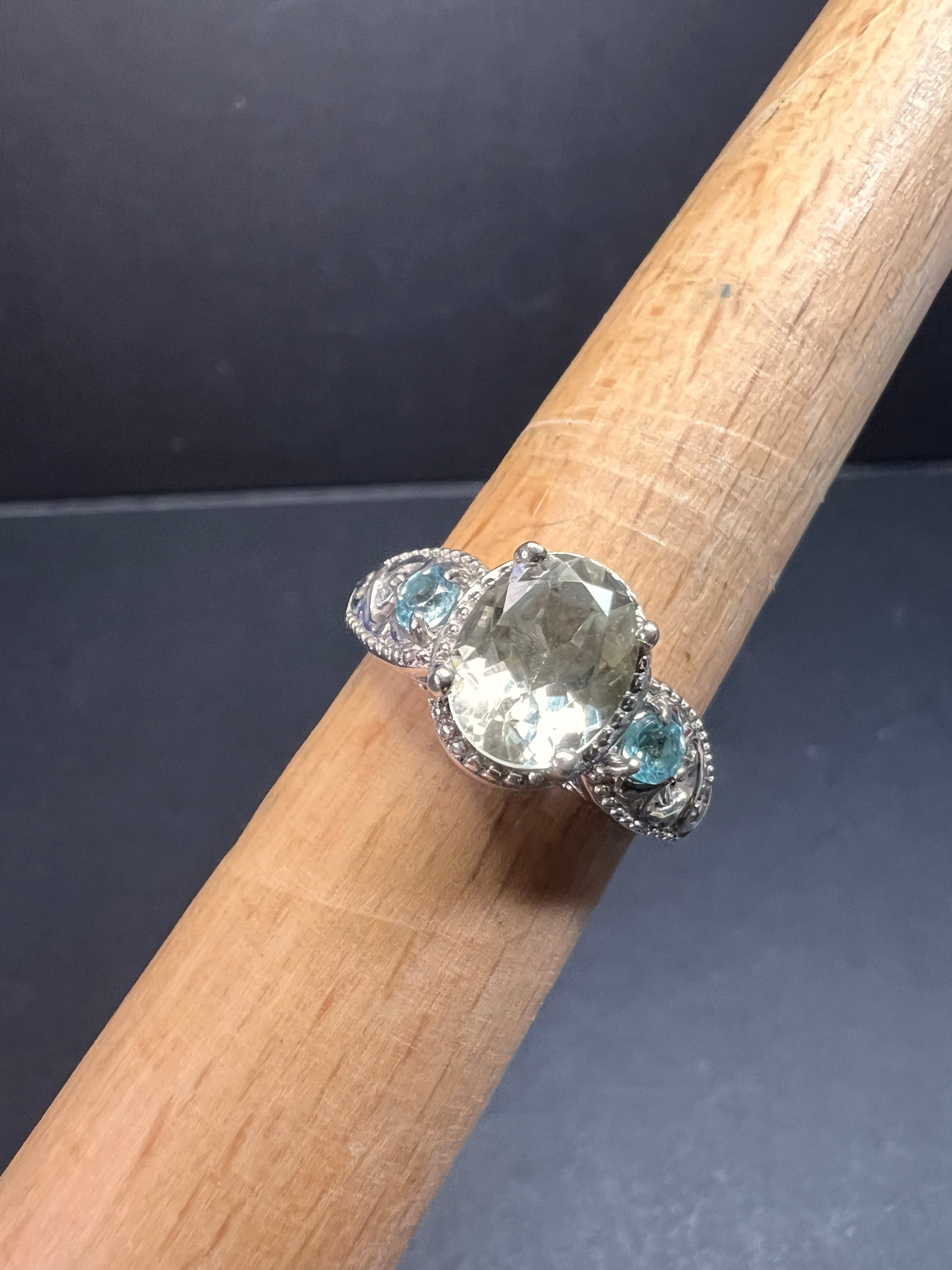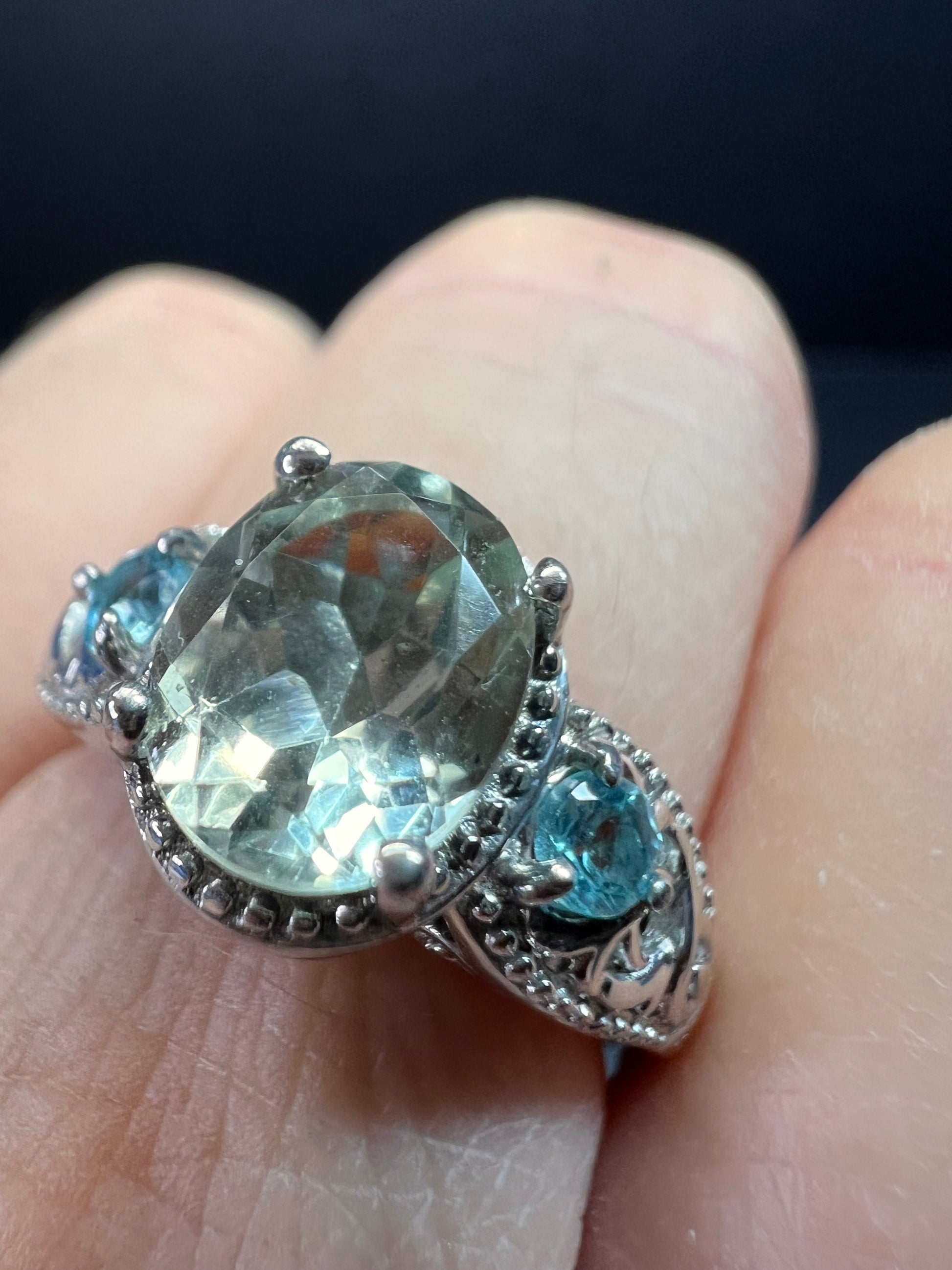 Genuine gemstones of prasiolite and blue apatite prong set in a platinum bond setting of platinum plated over copper with magnet. Measures a size 8