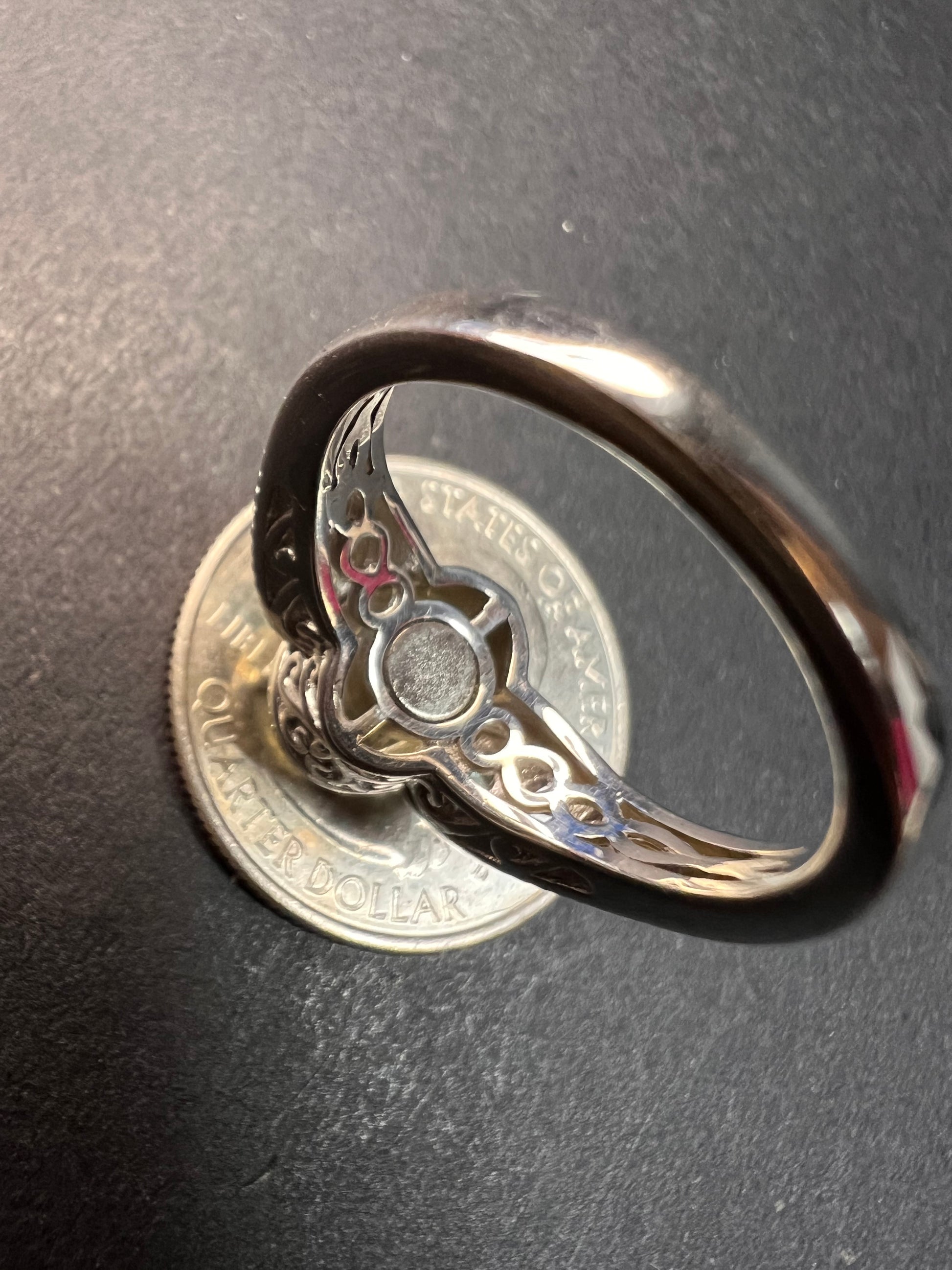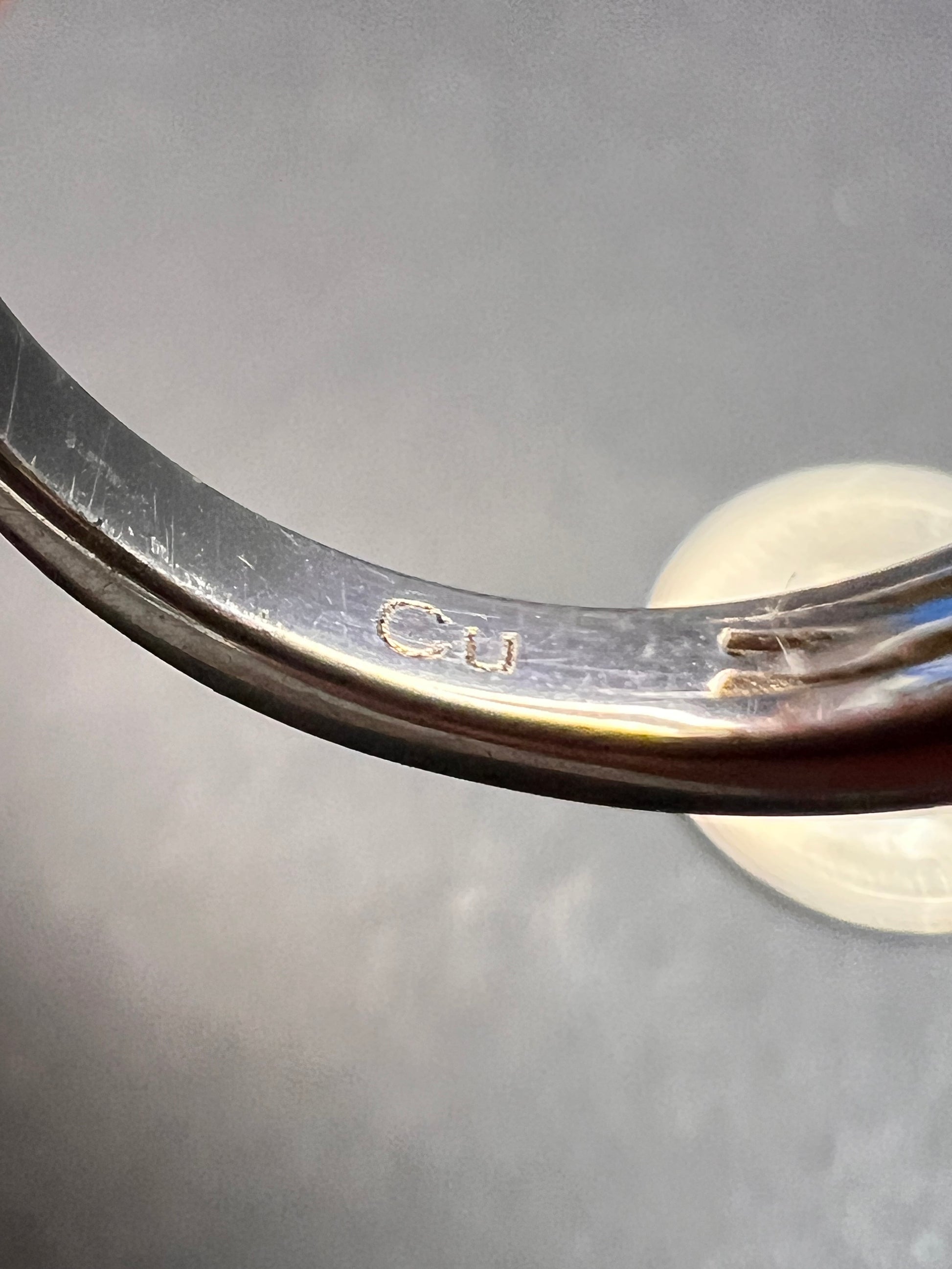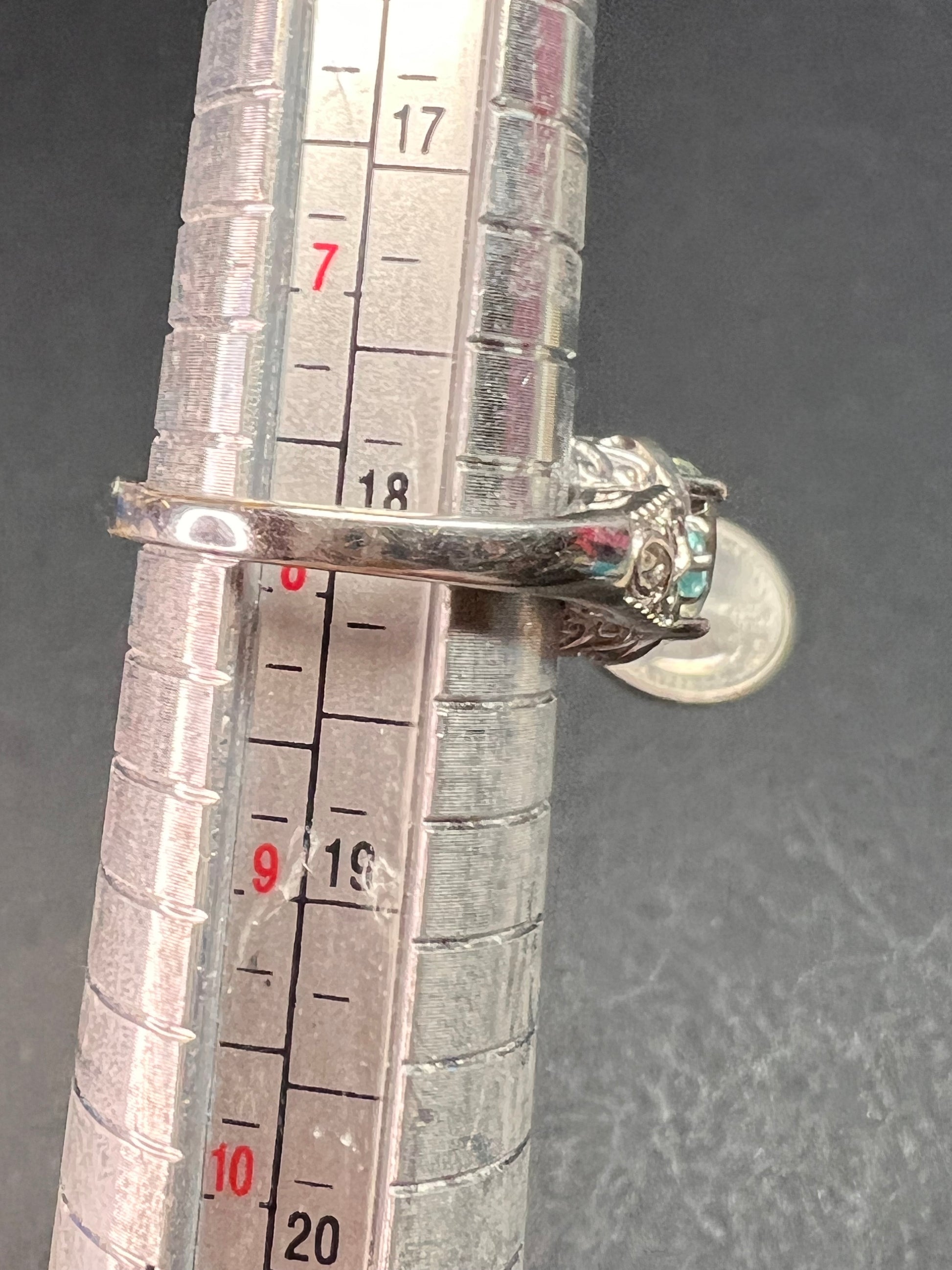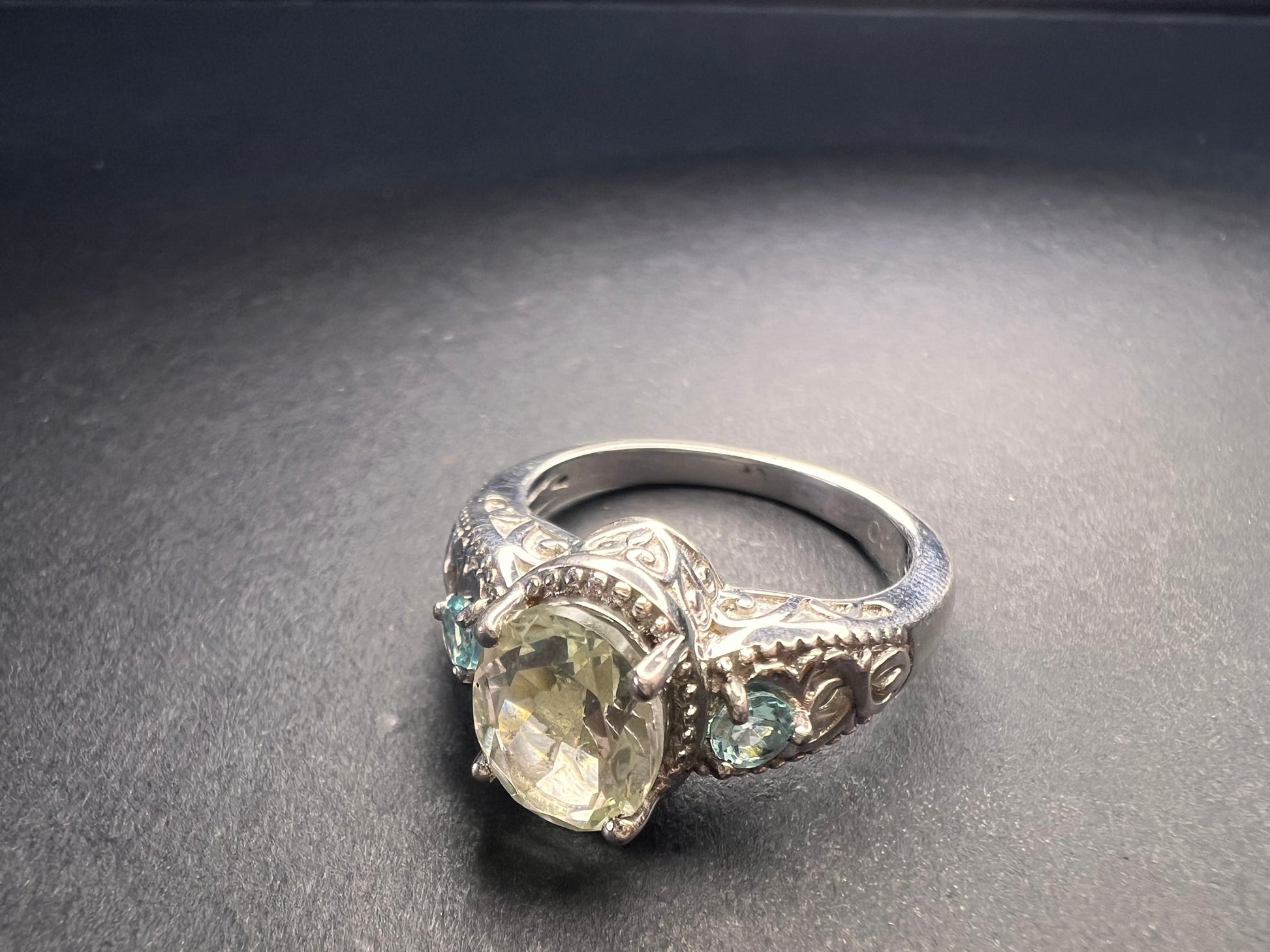 Genuine gemstones of prasiolite and blue apatite prong set in a platinum bond setting of platinum plated over copper with magnet. Measures a size 8