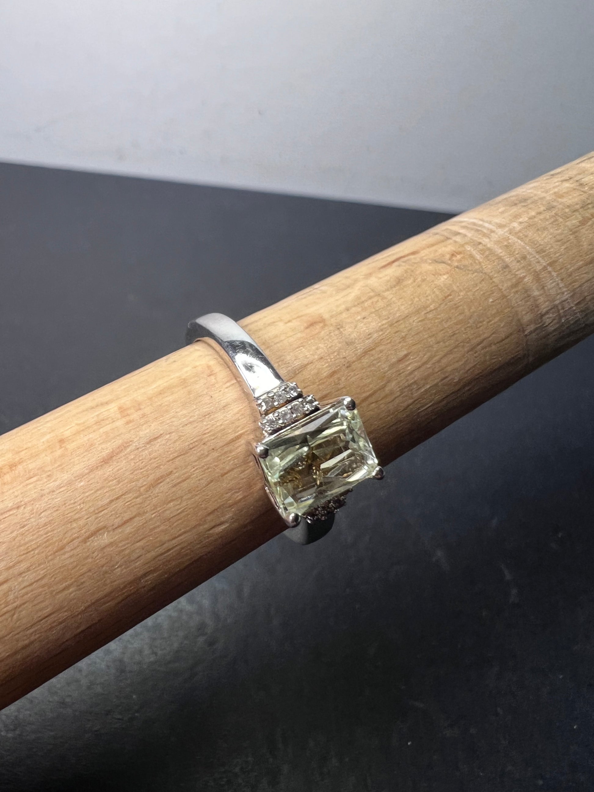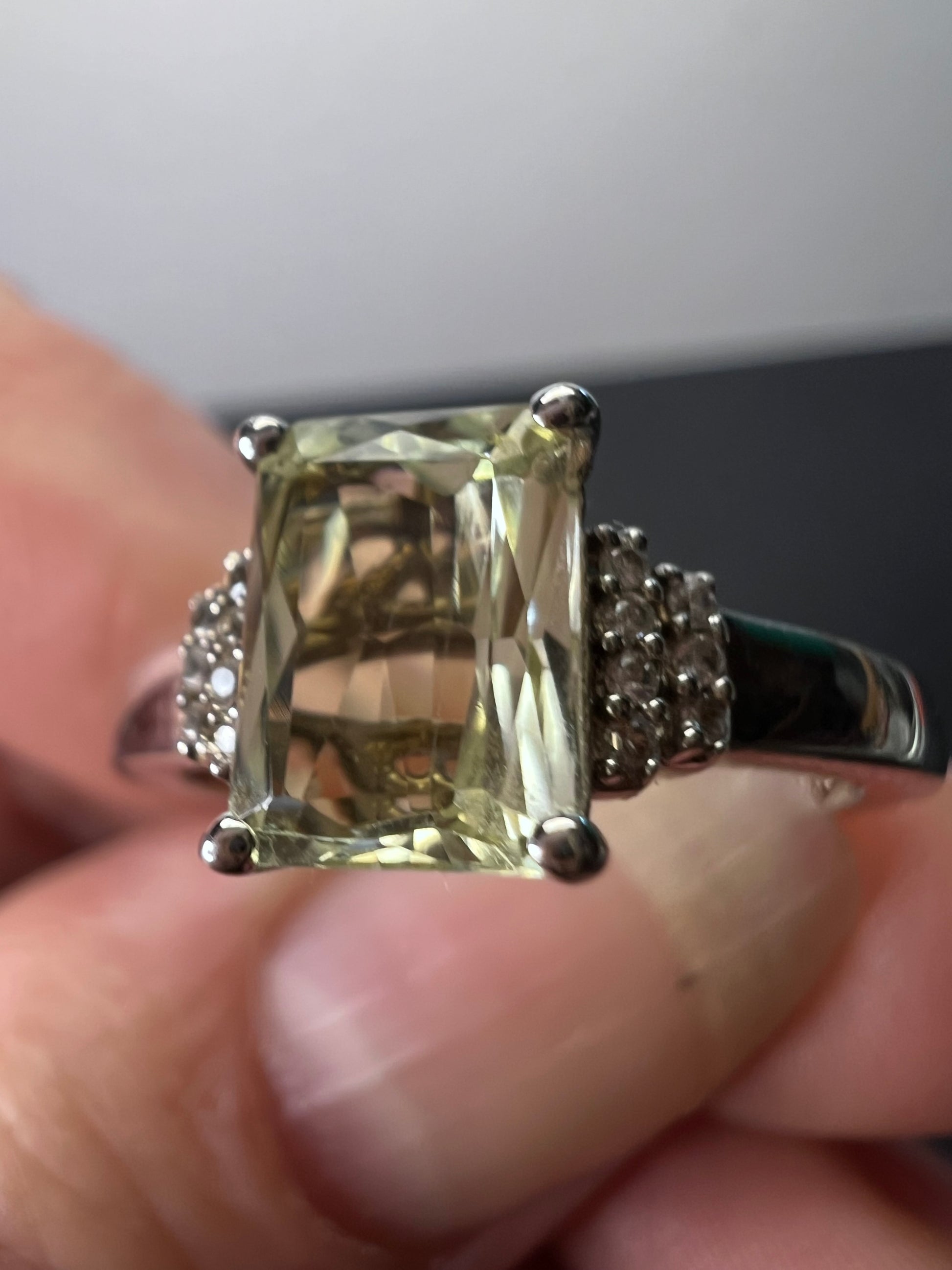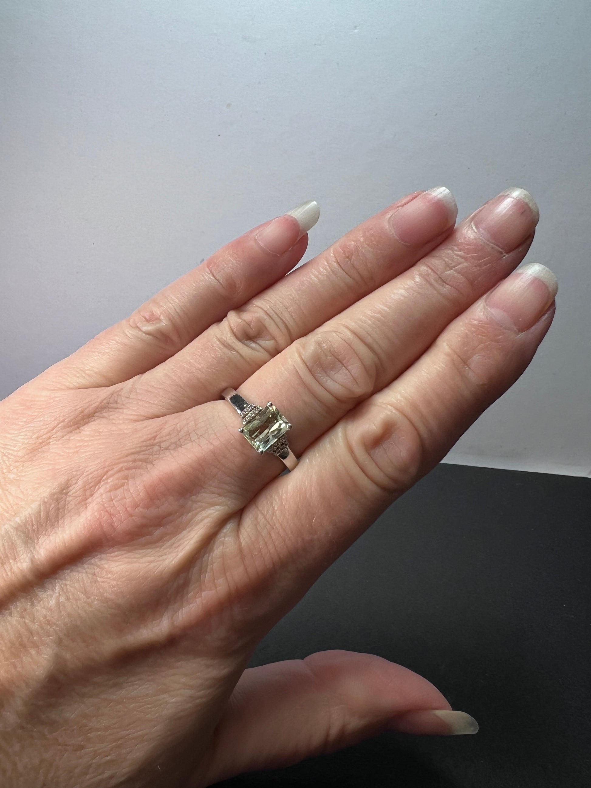 Pale green stone tests as Prasiolite. Tiny white accent stones test as zircon. This is rhodium plated over sterling silver. Size 9 . Prasiolite is sometimes referred to as green amethyst since it’s a green quartz.