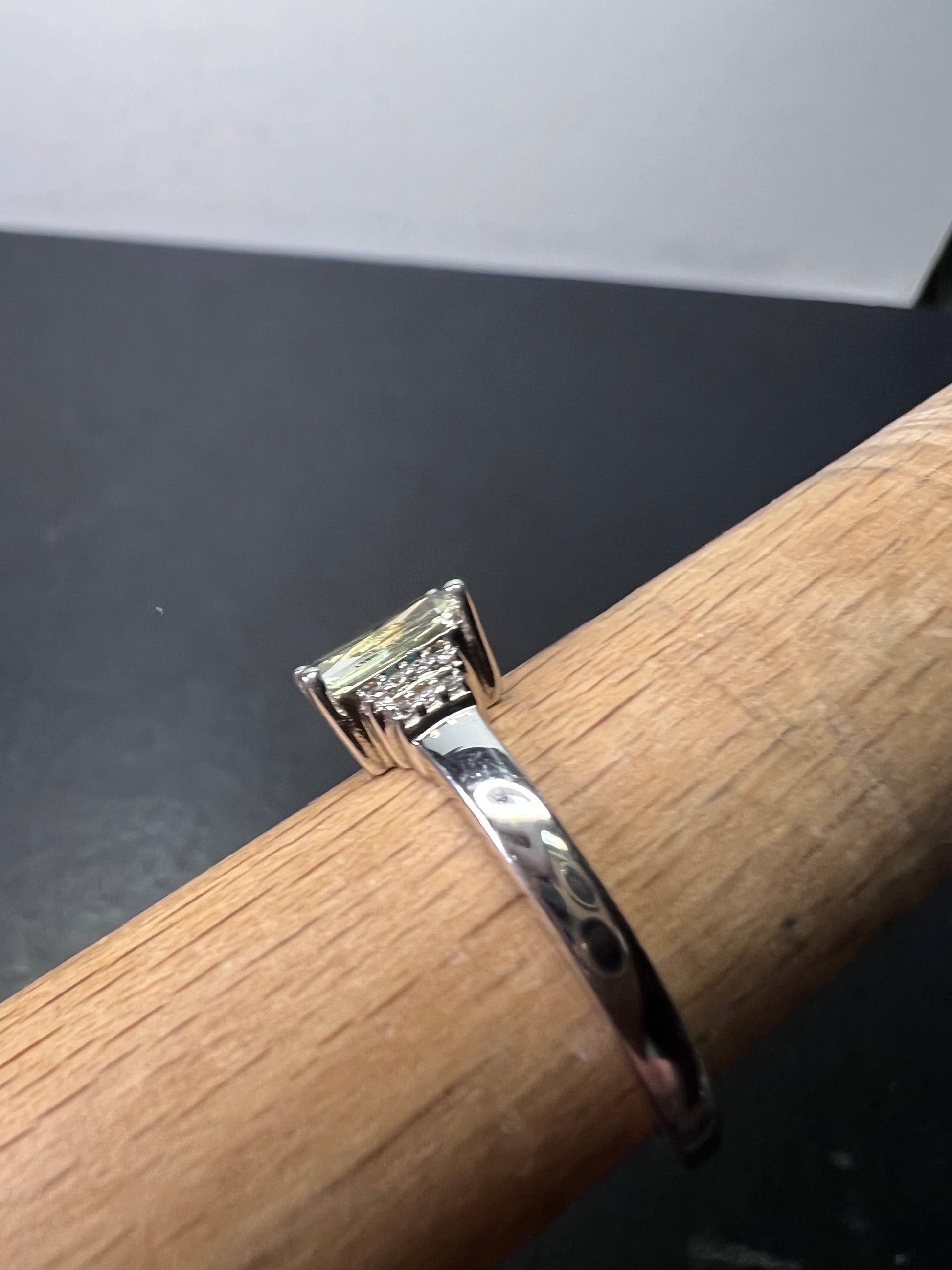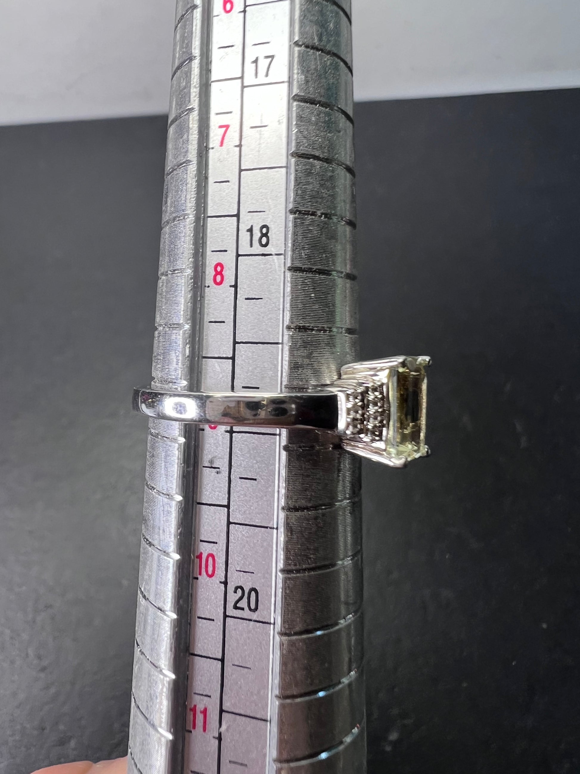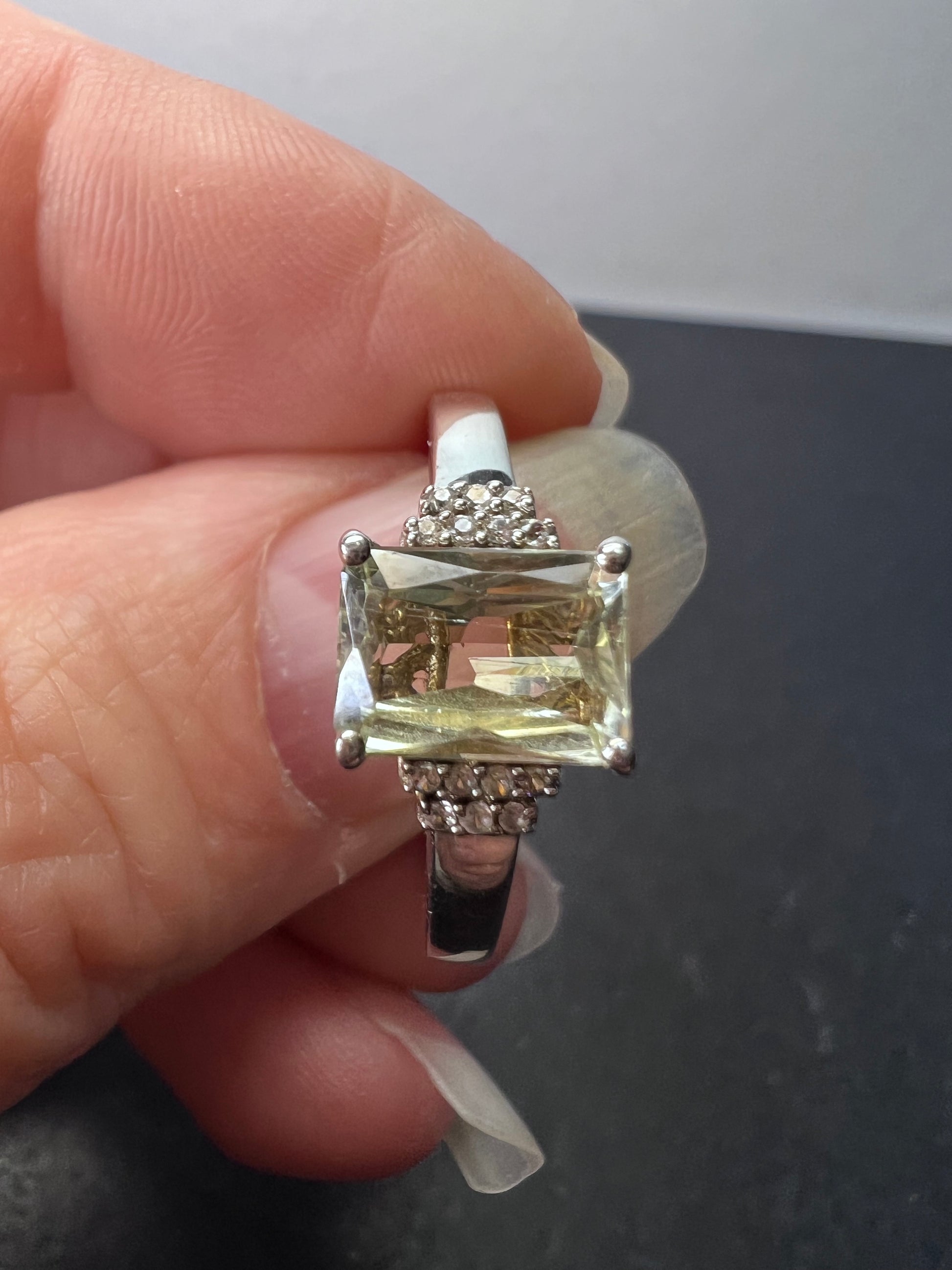 Pale green stone tests as Prasiolite. Tiny white accent stones test as zircon. This is rhodium plated over sterling silver. Size 9 . Prasiolite is sometimes referred to as green amethyst since it’s a green quartz.