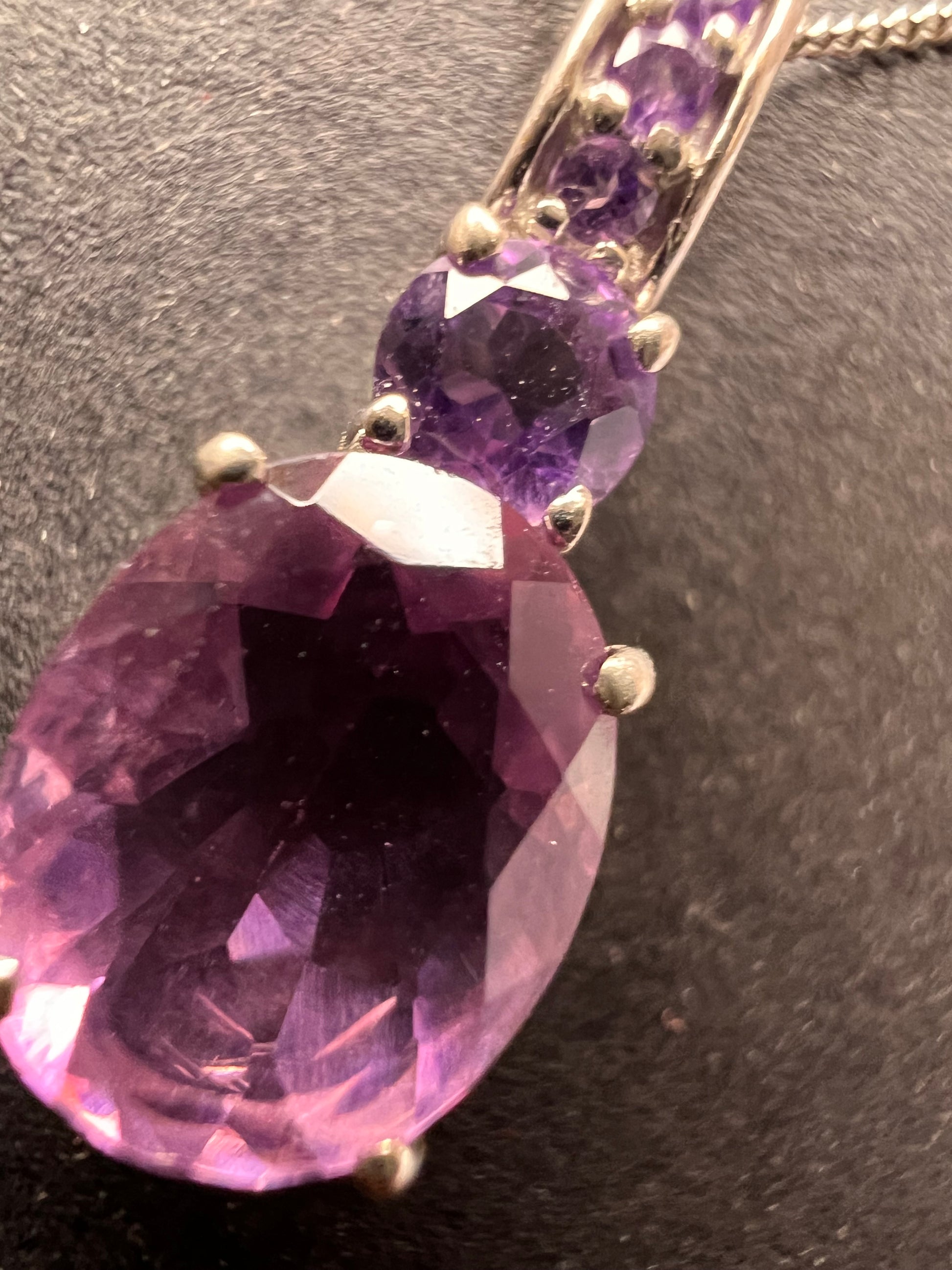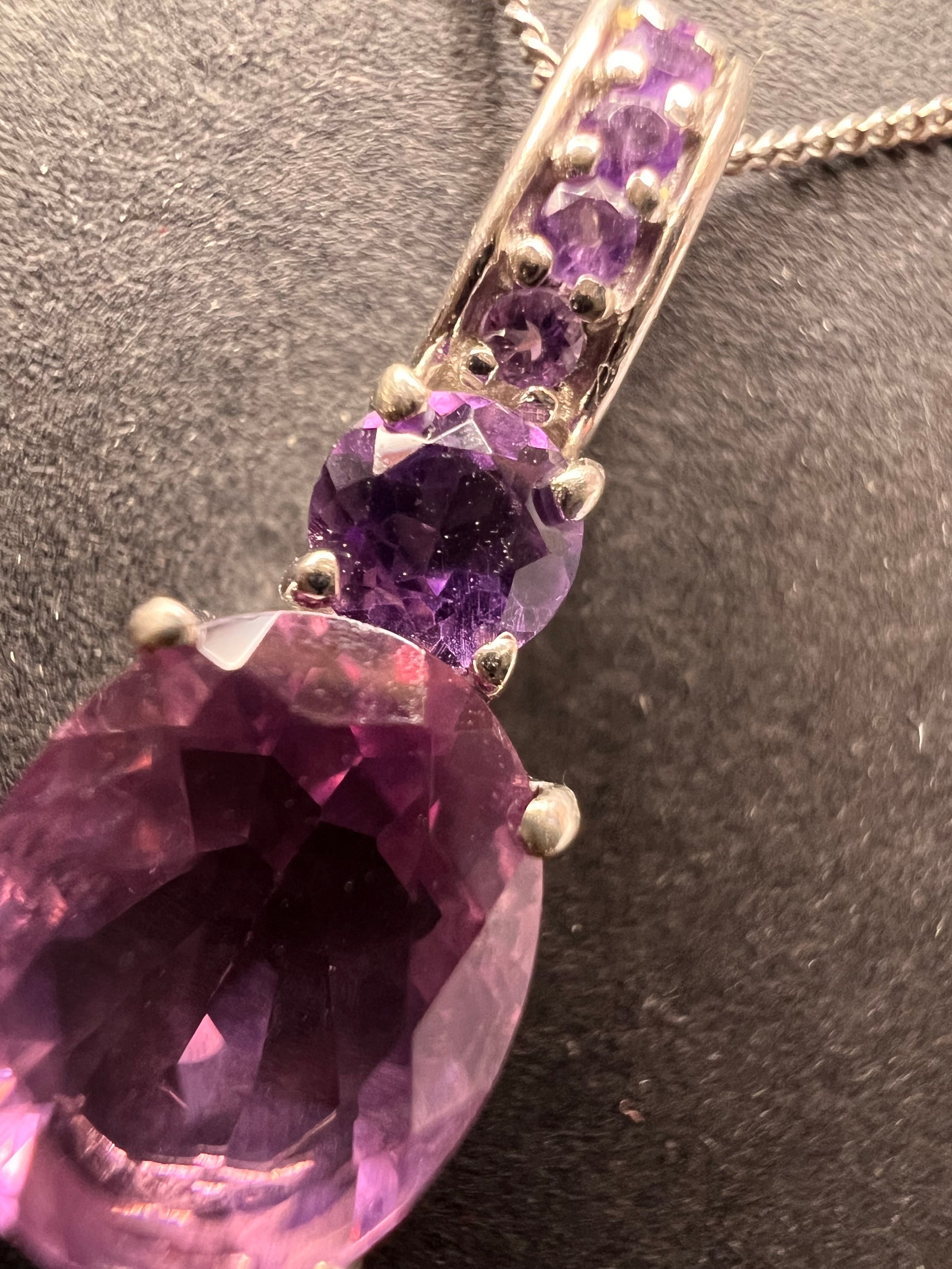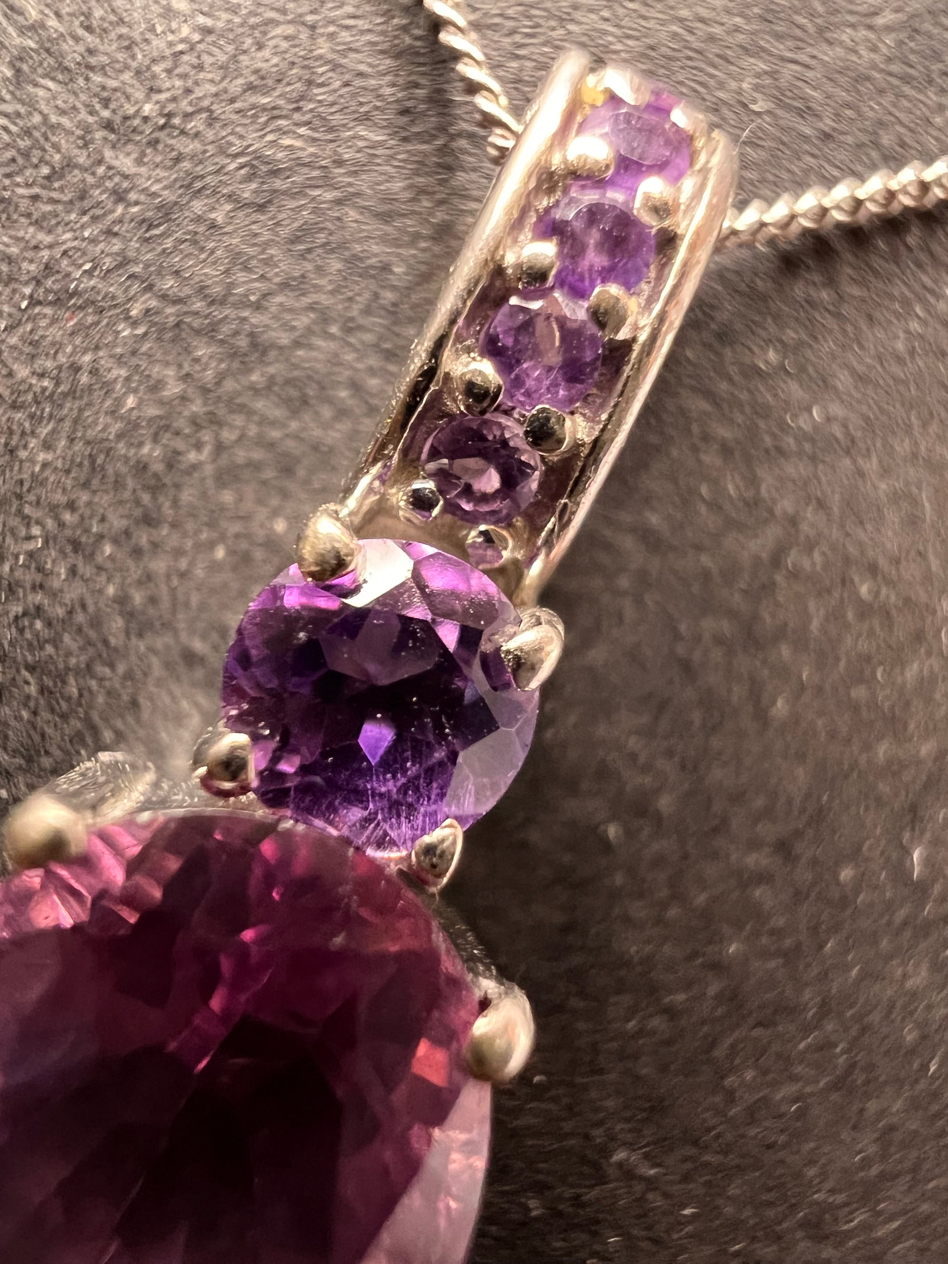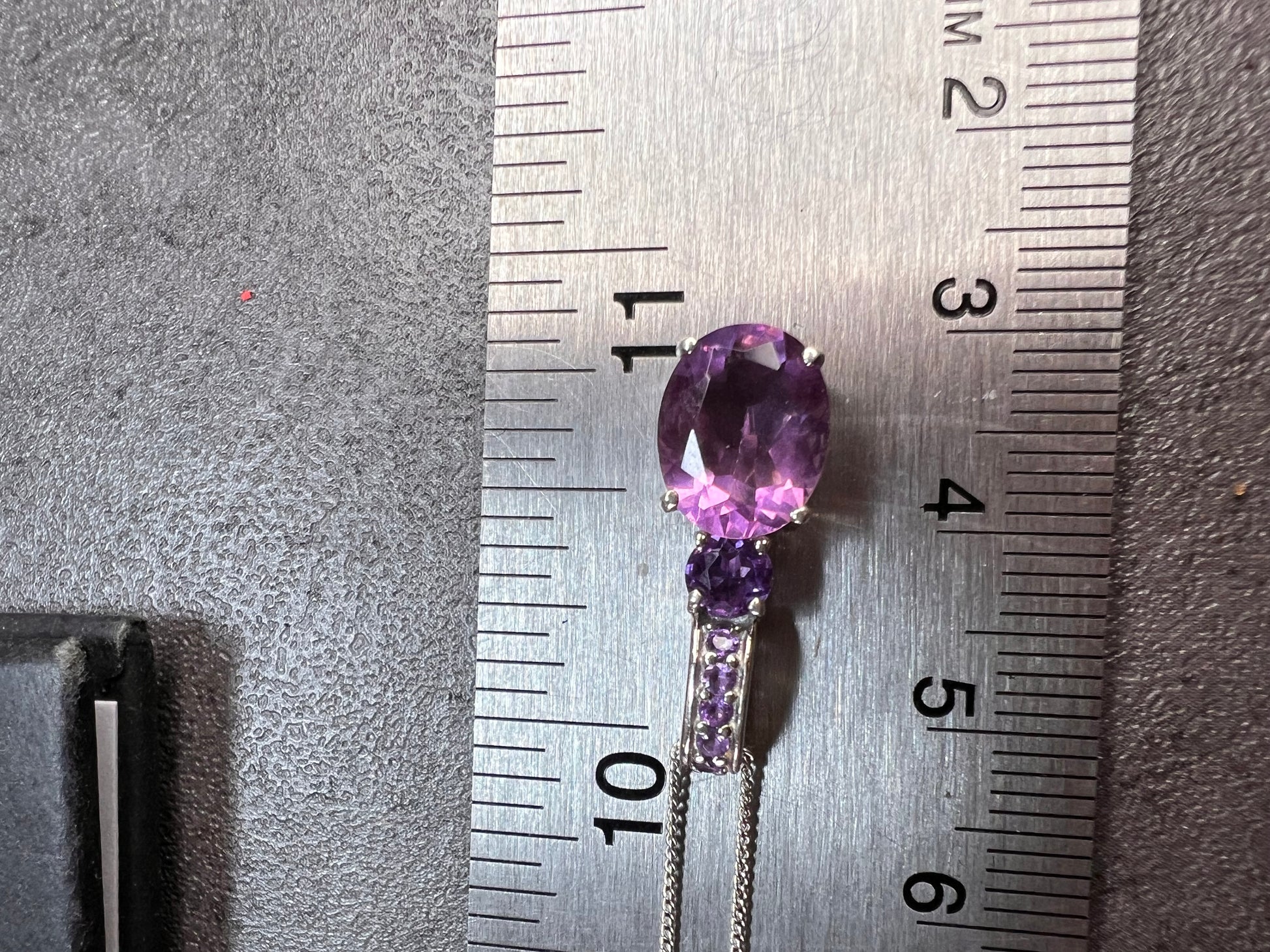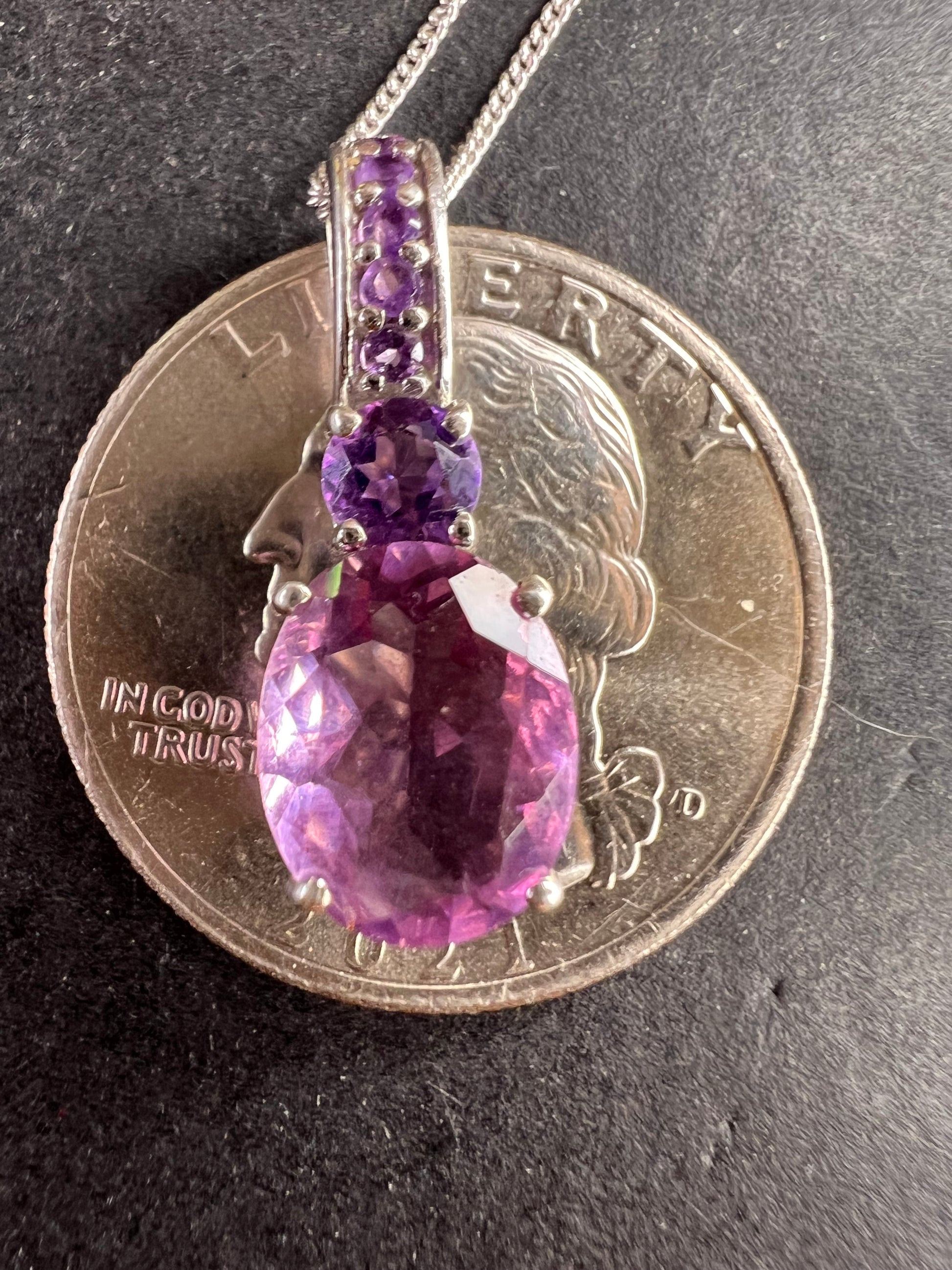 Main larger stone seems to be a treated fluorite. Middle stone tests as amethyst. Small accent stones might be fluorite also. Or maybe something completely different like spinel , or zircon but none whatsoever are glass or CZ. Prong set in authentic 925 sterling silver. STS on back of pendant for Chuck Clemency. Chain is also sterling silver measuring 20 inches.