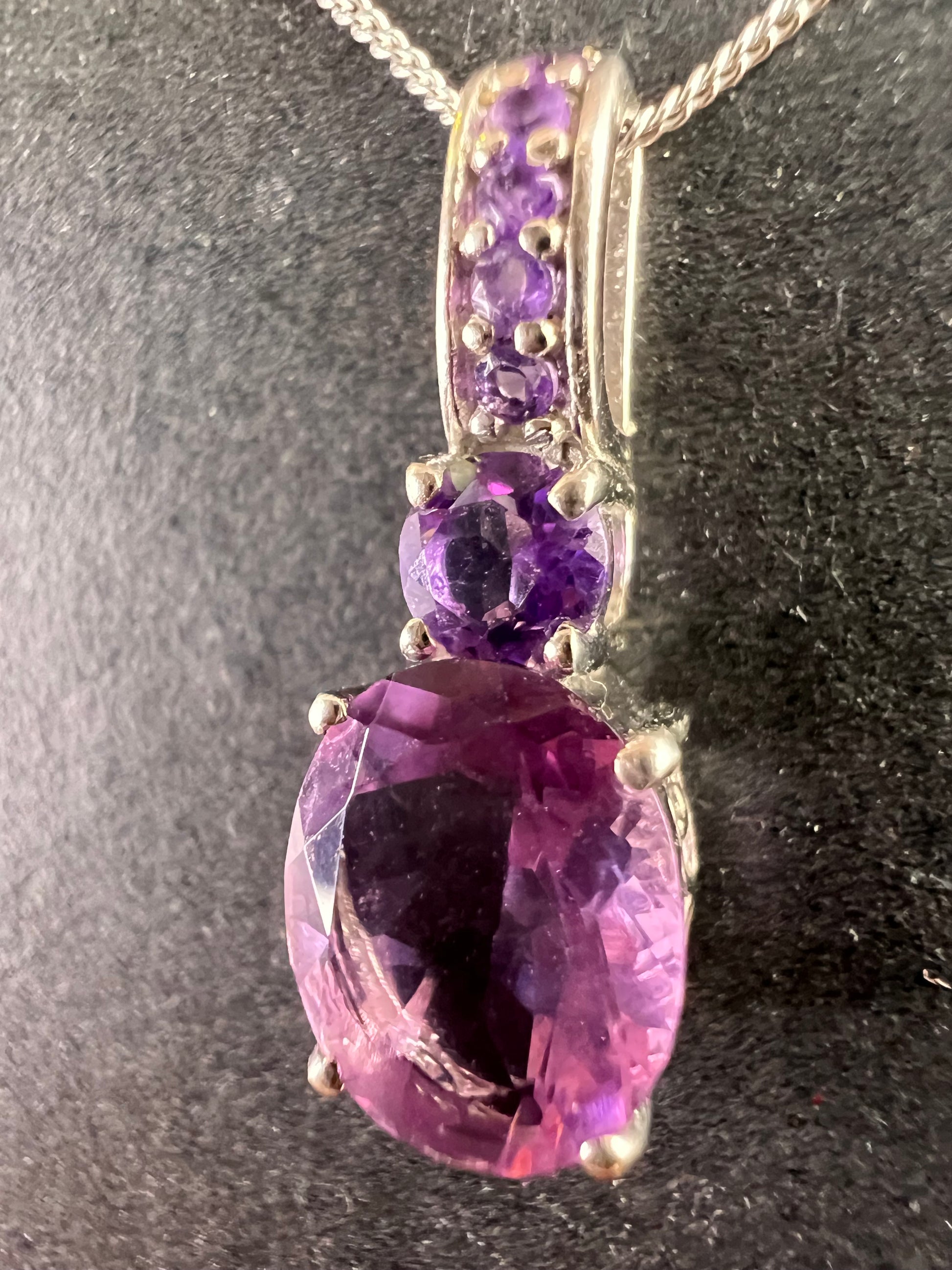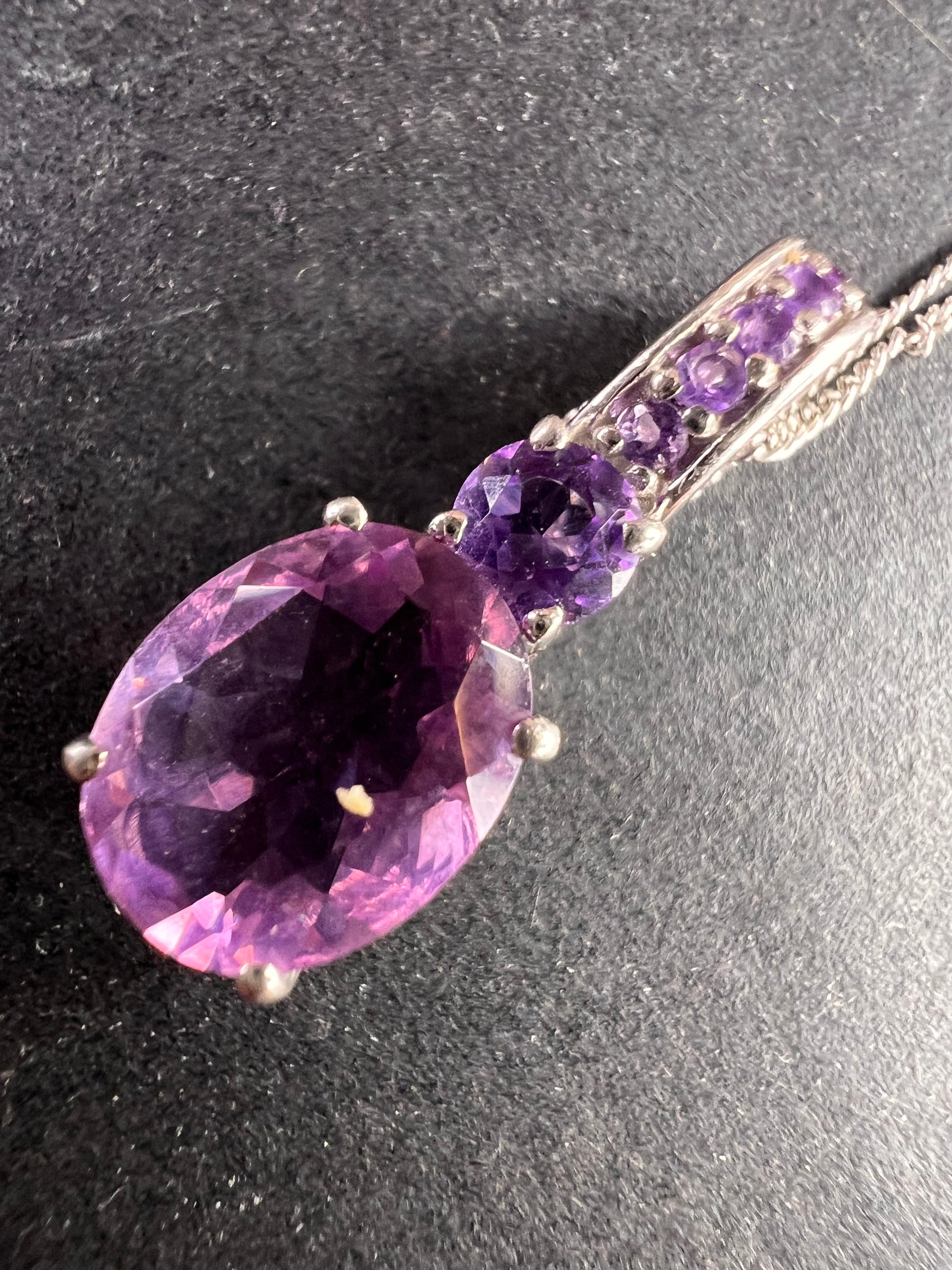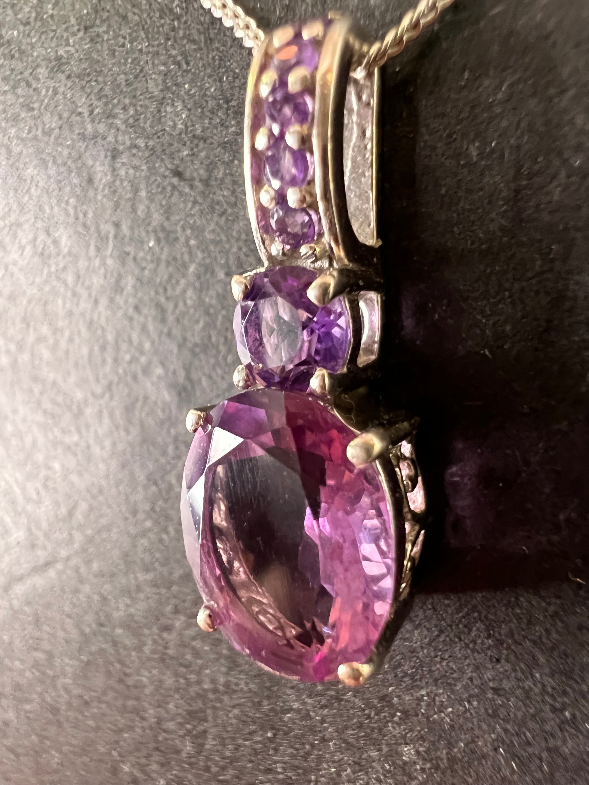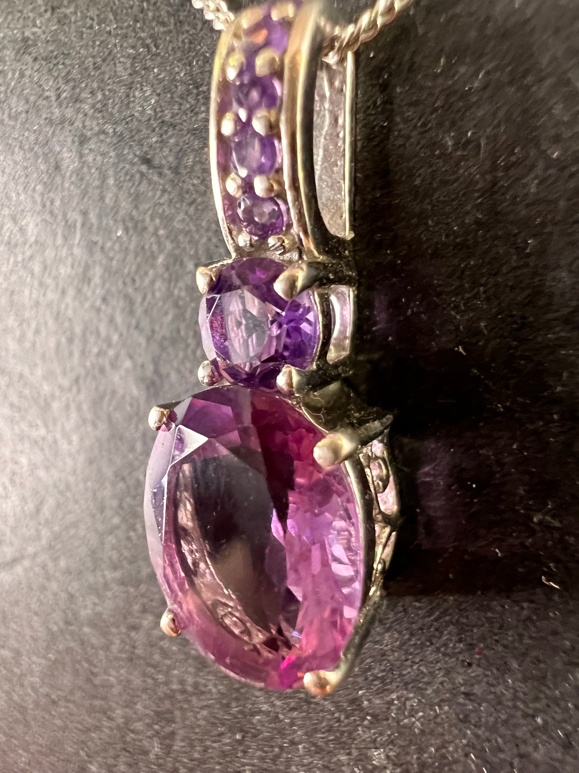 Main larger stone seems to be a treated fluorite. Middle stone tests as amethyst. Small accent stones might be fluorite also. Or maybe something completely different like spinel , or zircon but none whatsoever are glass or CZ. Prong set in authentic 925 sterling silver. STS on back of pendant for Chuck Clemency. Chain is also sterling silver measuring 20 inches.
