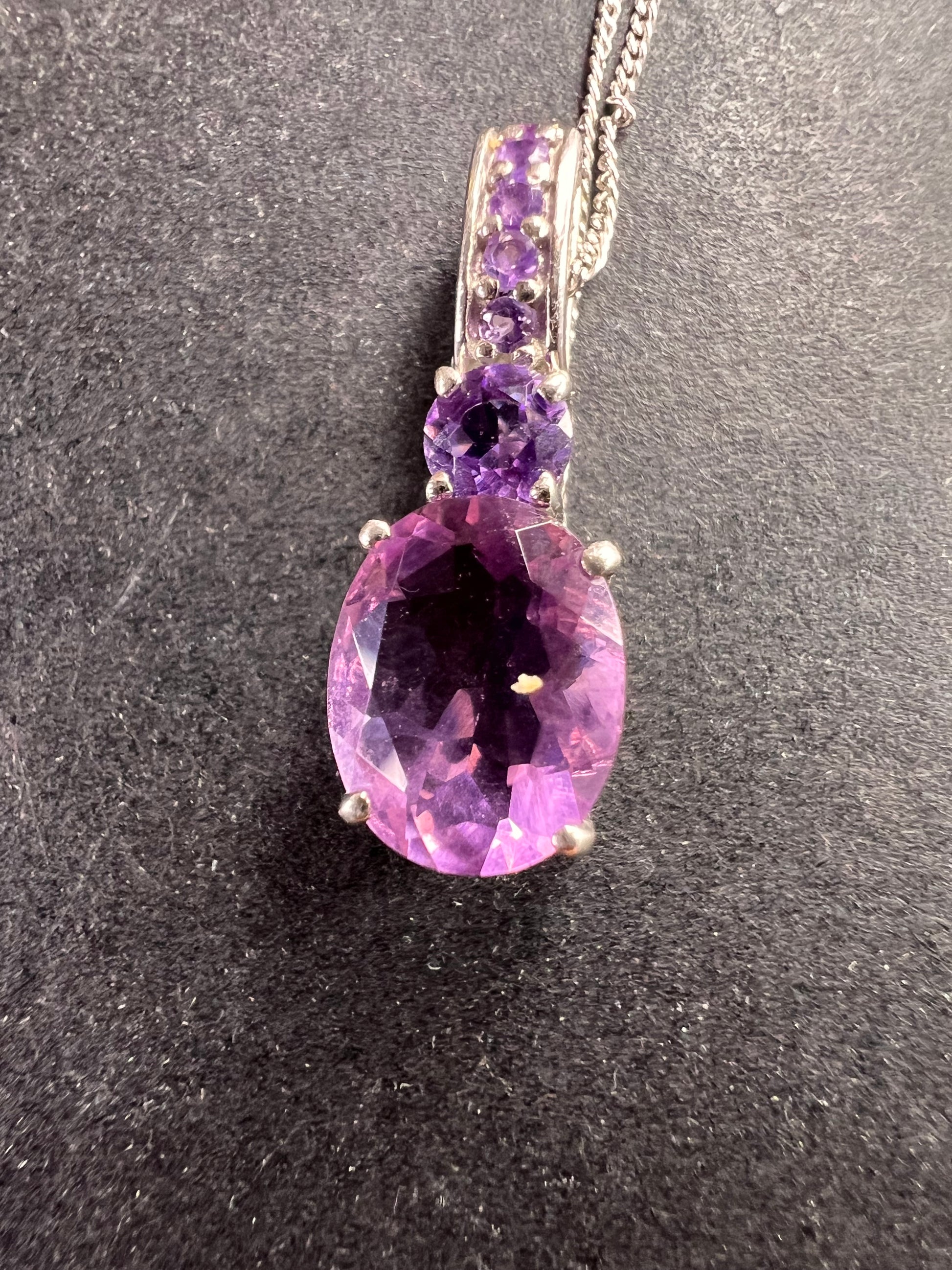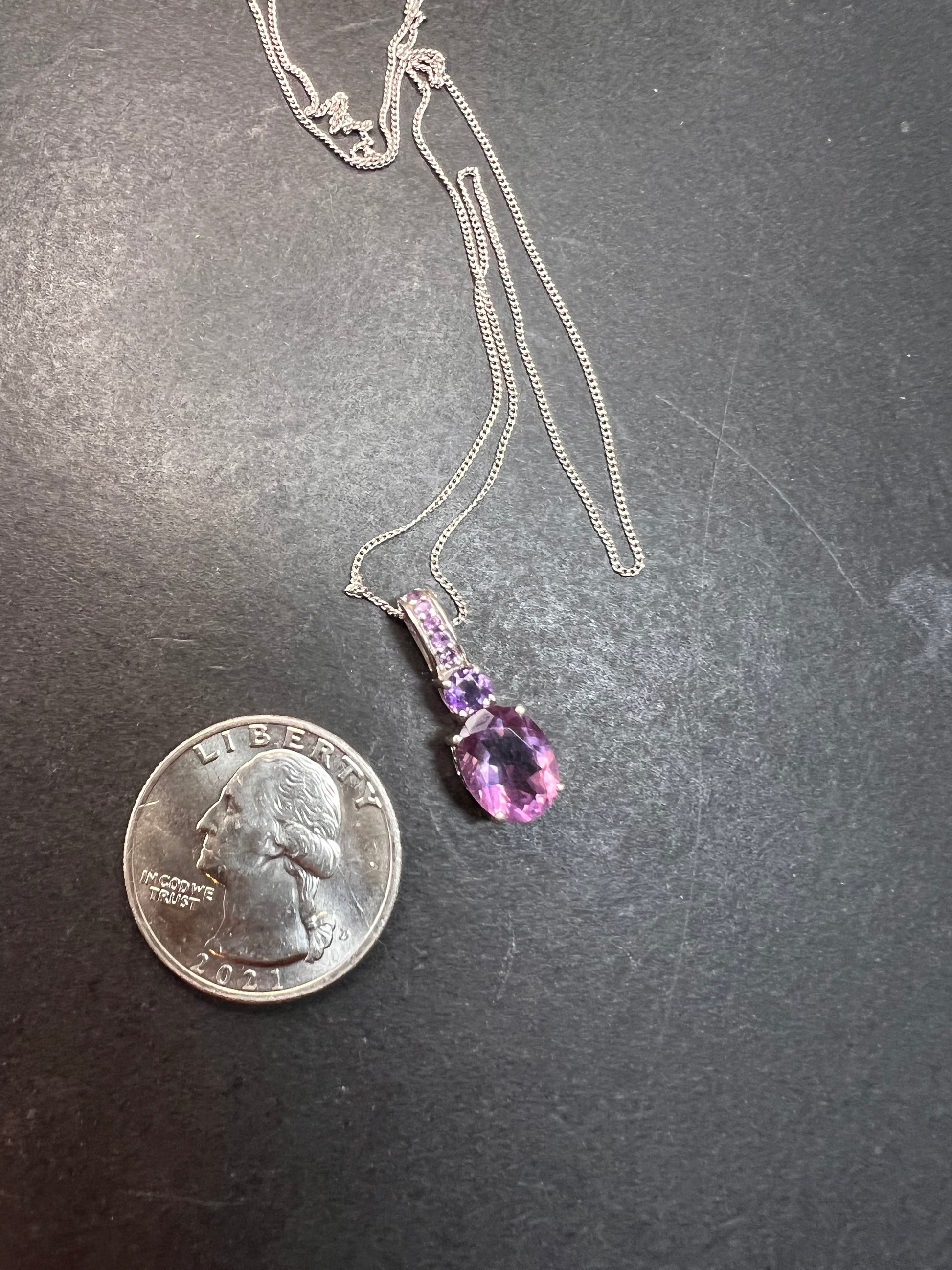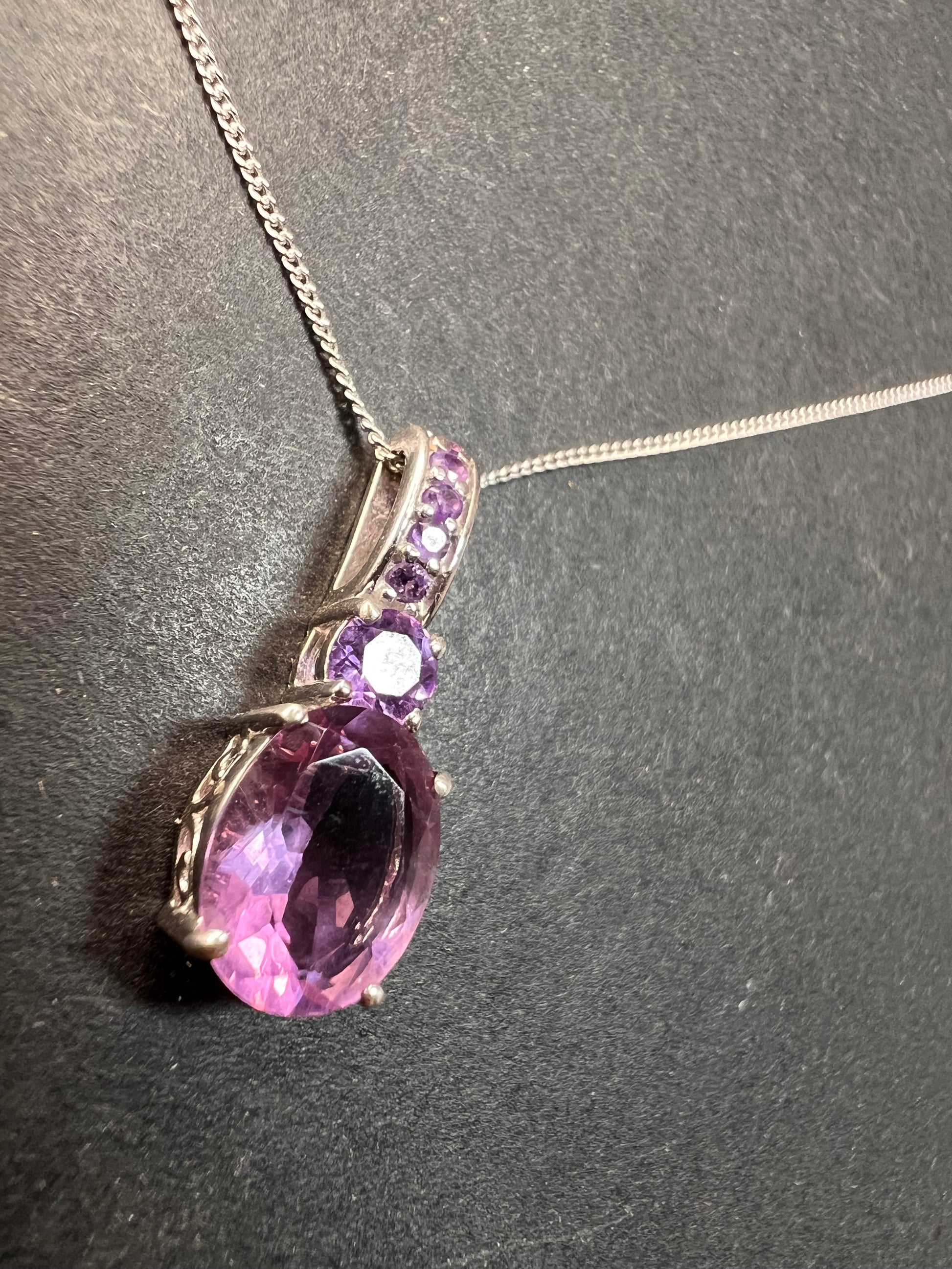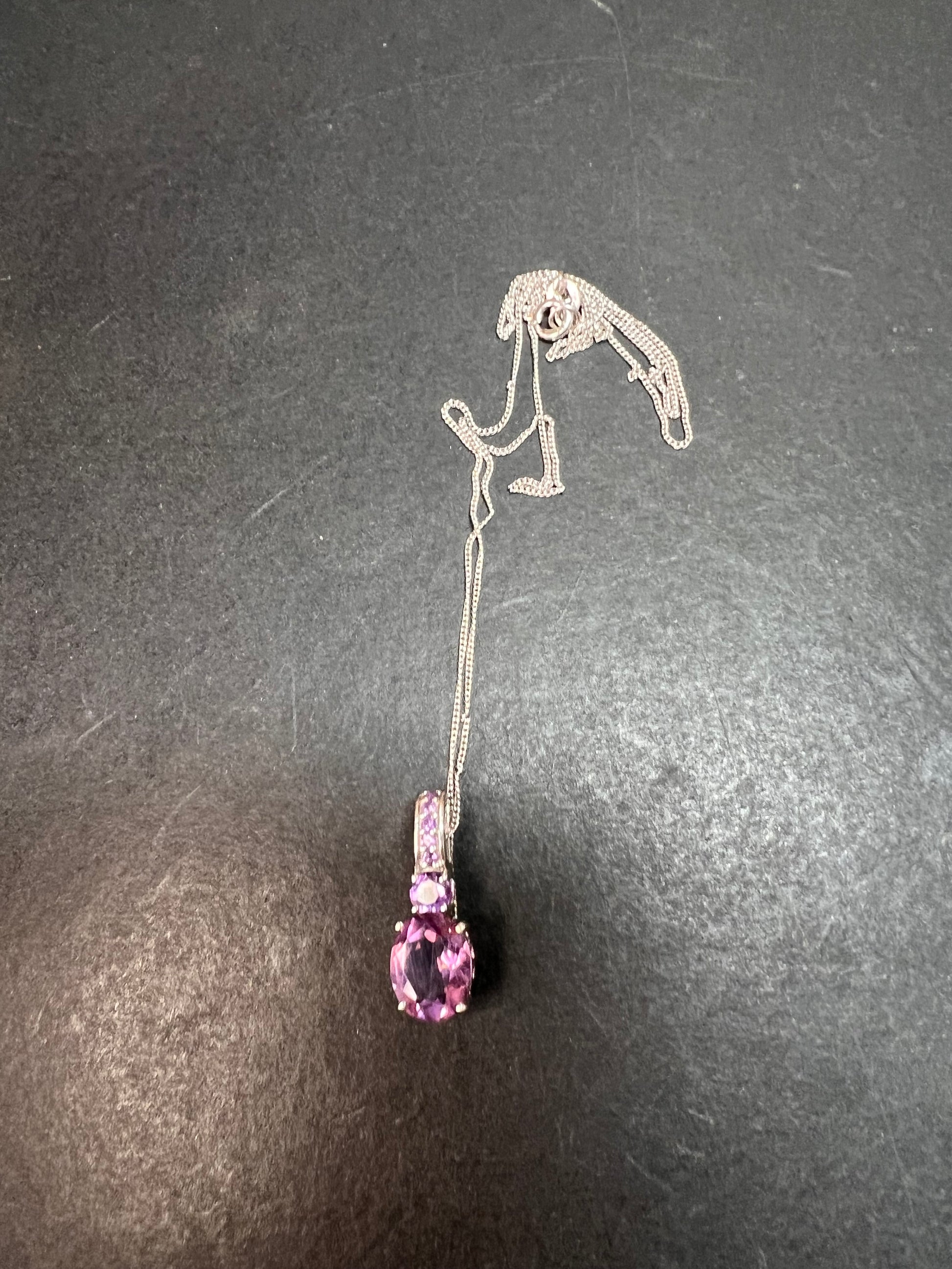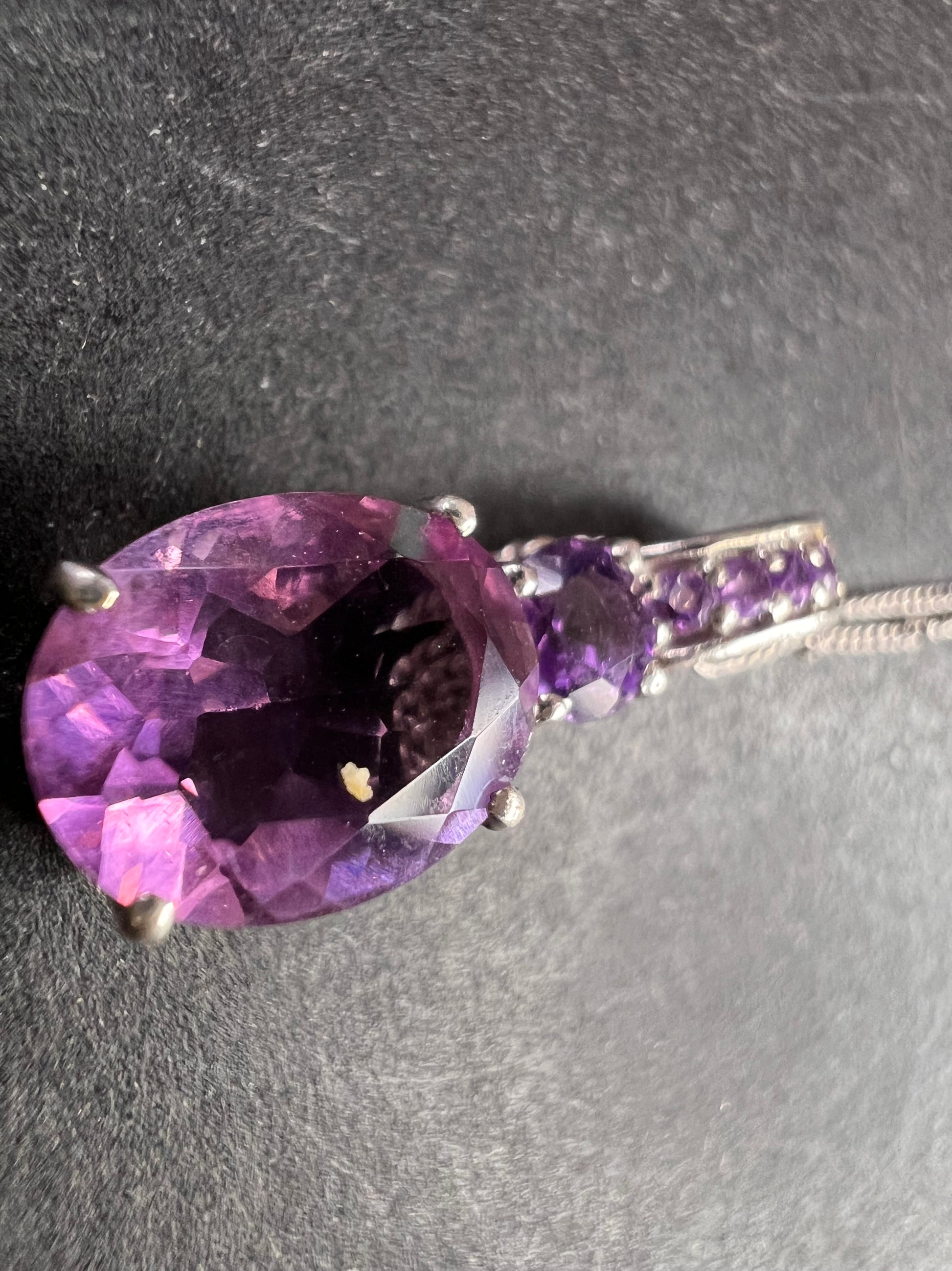 Main larger stone seems to be a treated fluorite. Middle stone tests as amethyst. Small accent stones might be fluorite also. Or maybe something completely different like spinel , or zircon but none whatsoever are glass or CZ. Prong set in authentic 925 sterling silver. STS on back of pendant for Chuck Clemency. Chain is also sterling silver measuring 20 inches.