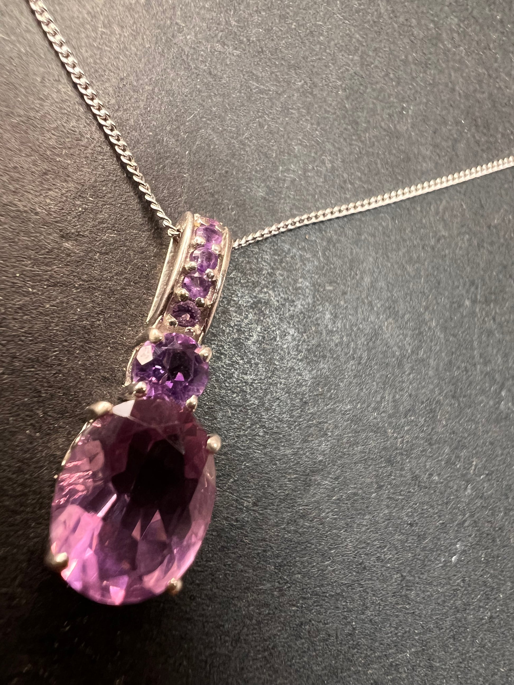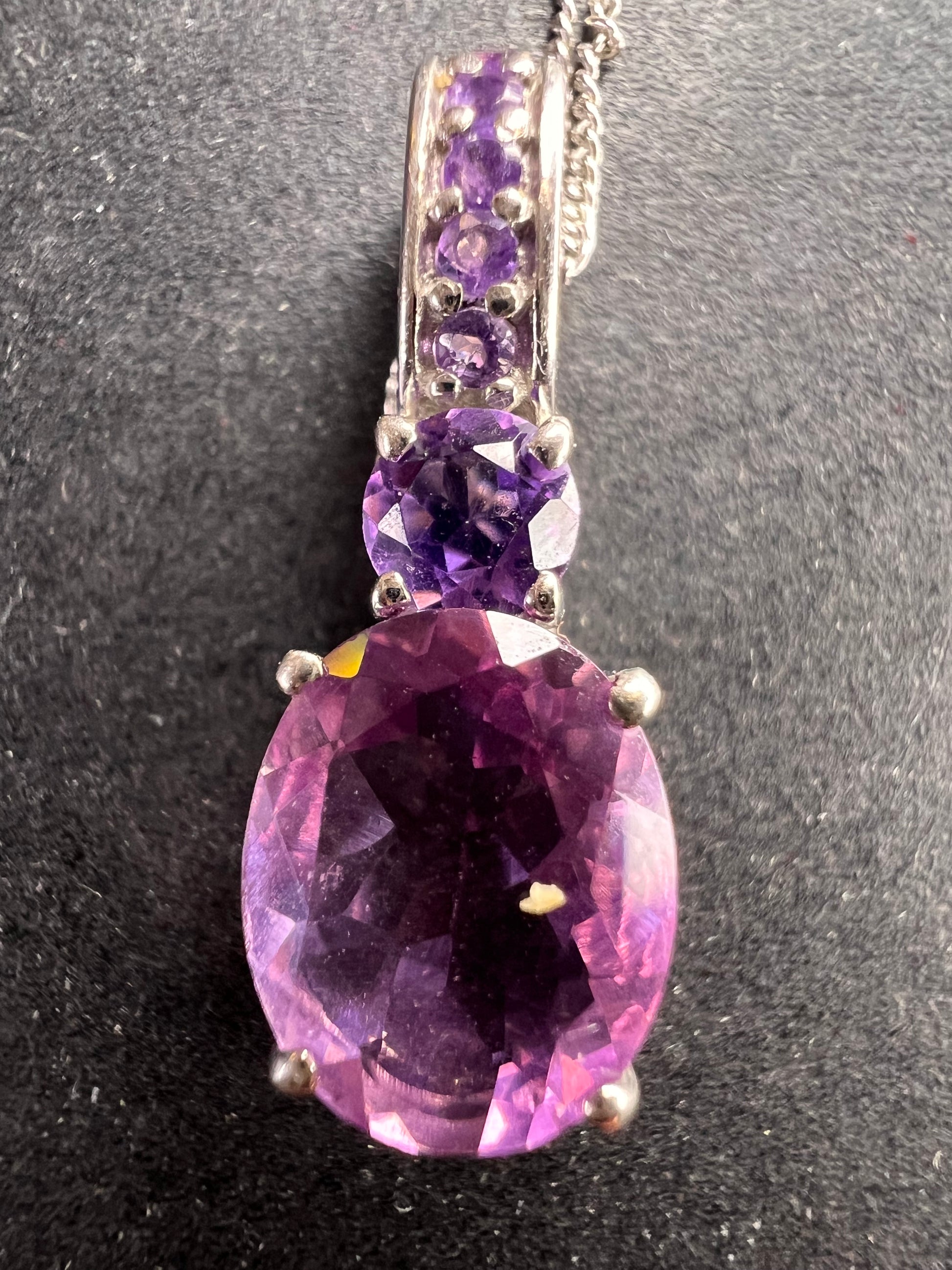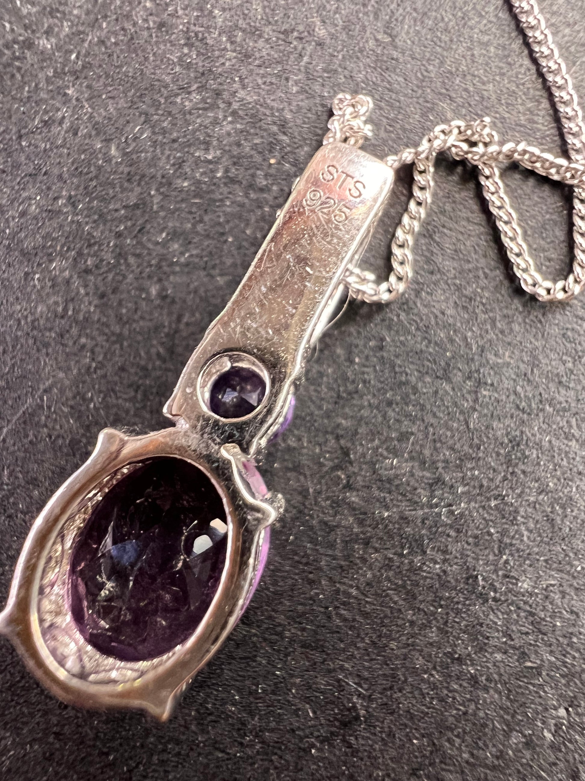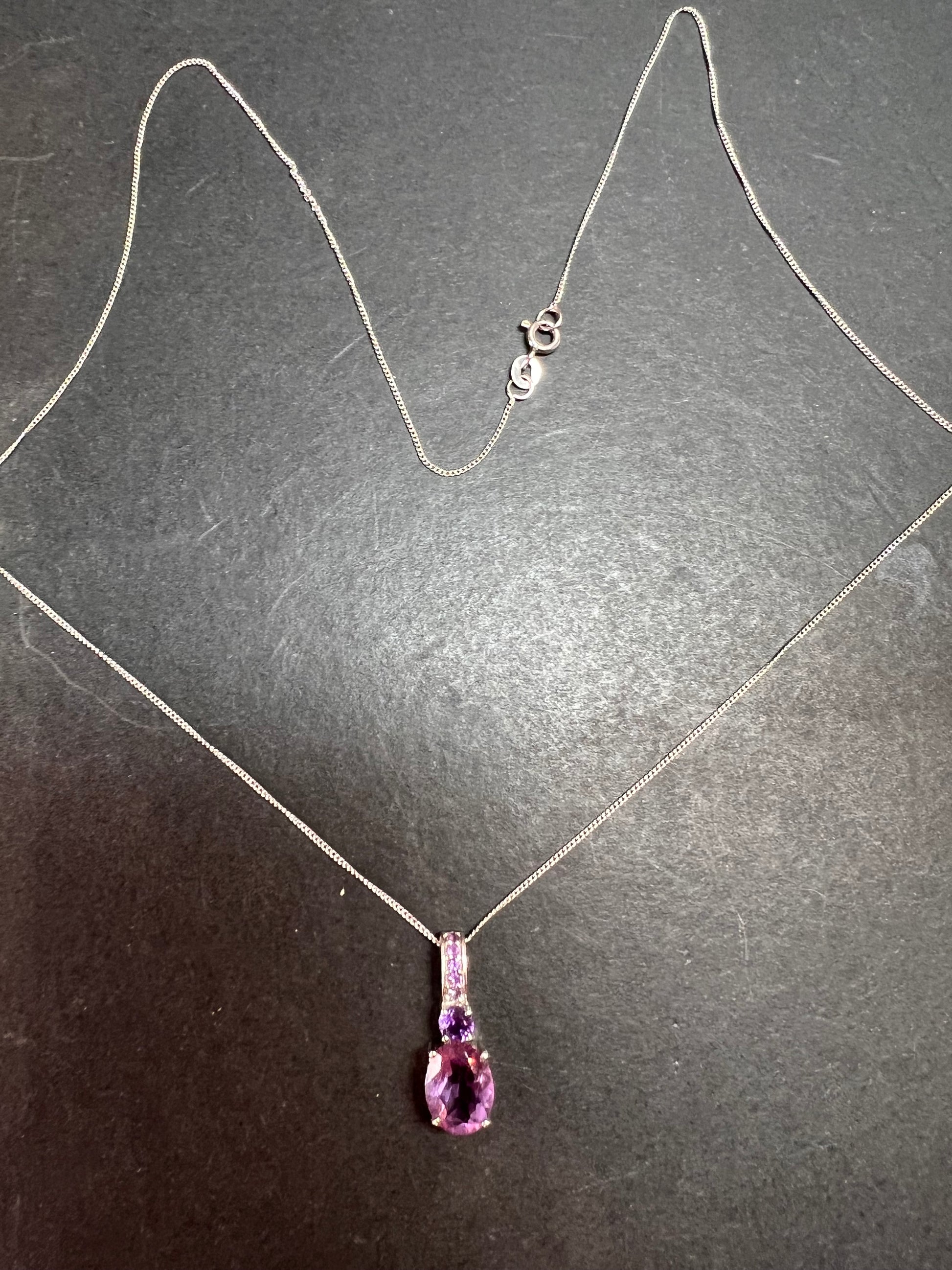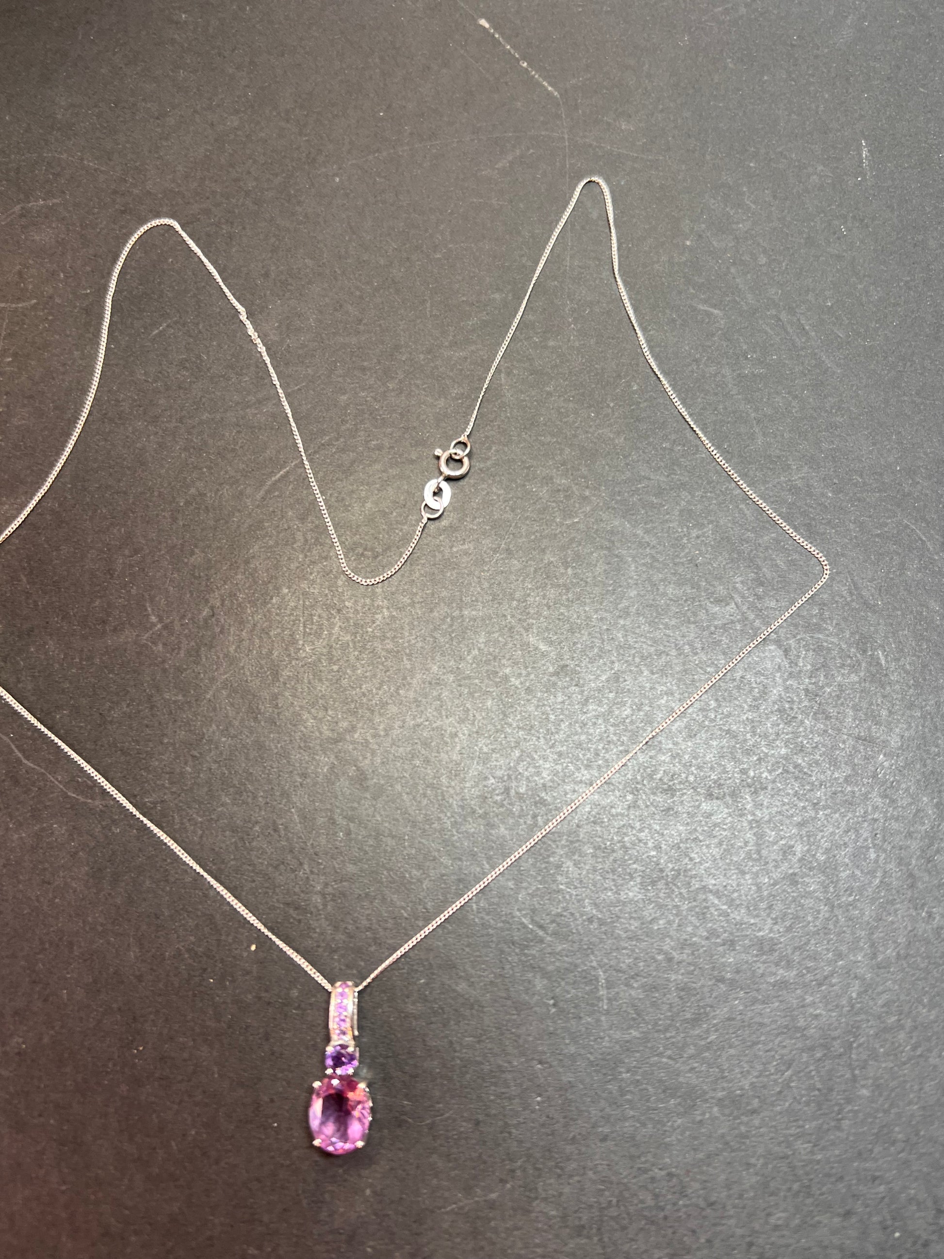 Main larger stone seems to be a treated fluorite. Middle stone tests as amethyst. Small accent stones might be fluorite also. Or maybe something completely different like spinel , or zircon but none whatsoever are glass or CZ. Prong set in authentic 925 sterling silver. STS on back of pendant for Chuck Clemency. Chain is also sterling silver measuring 20 inches.