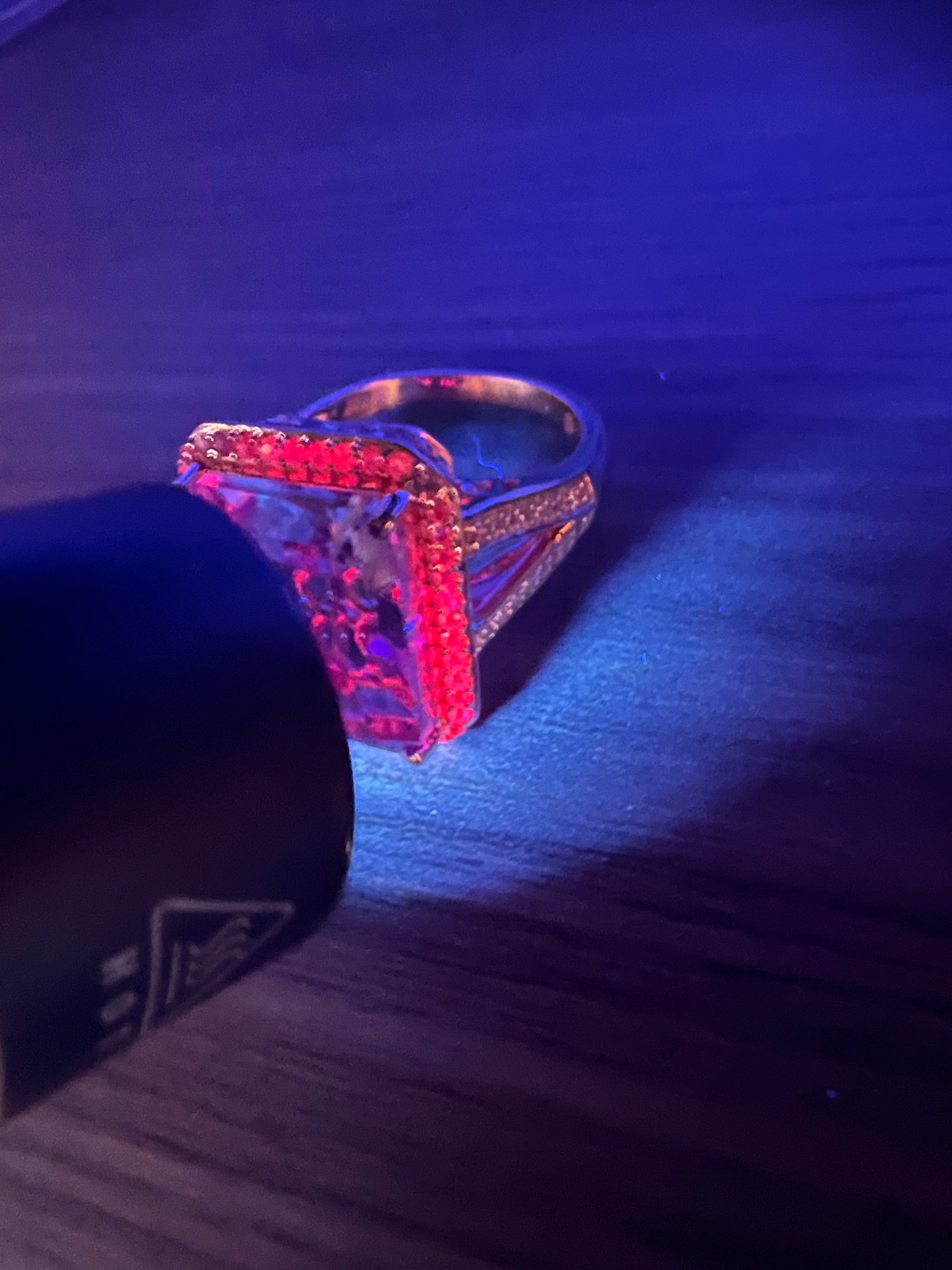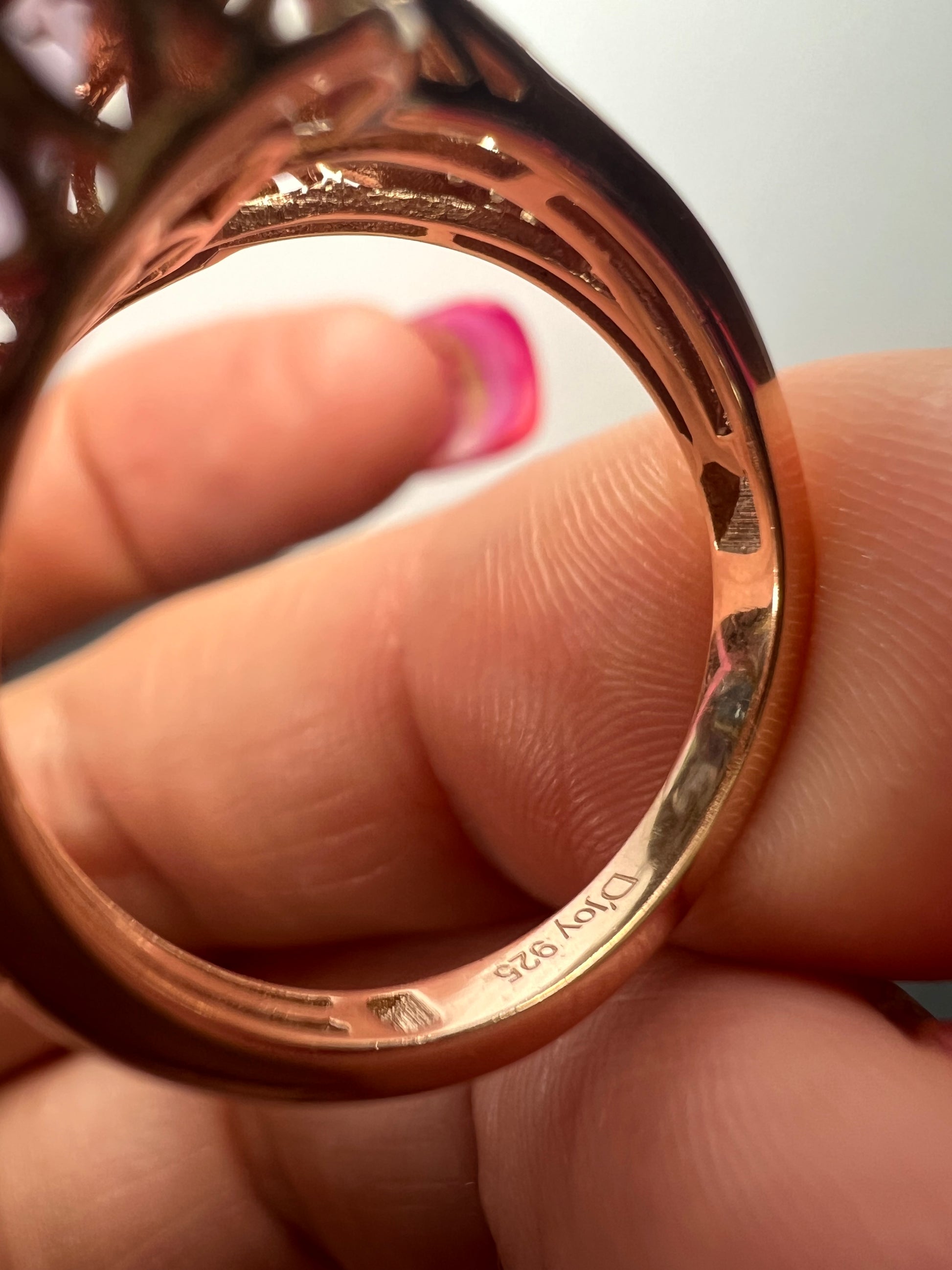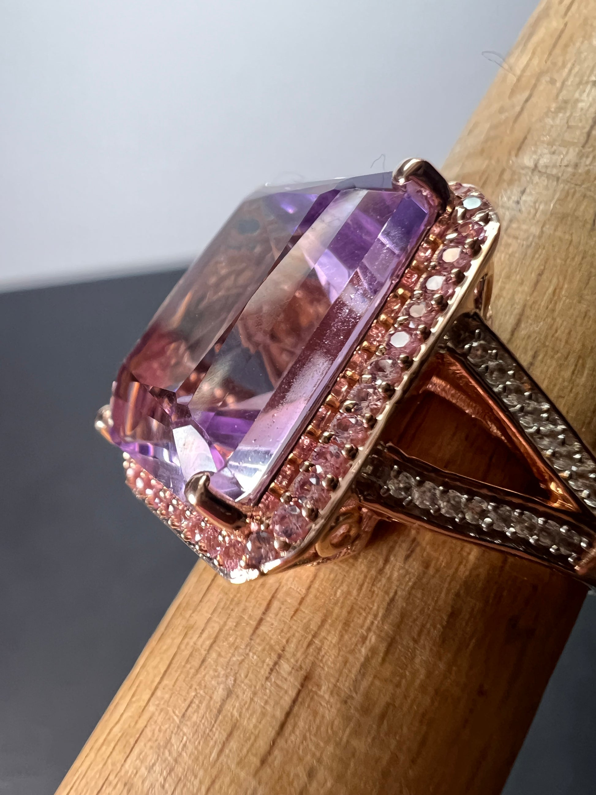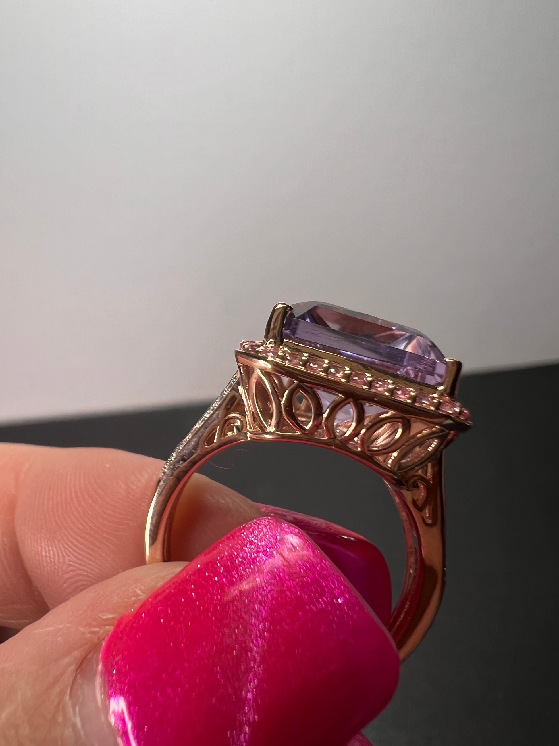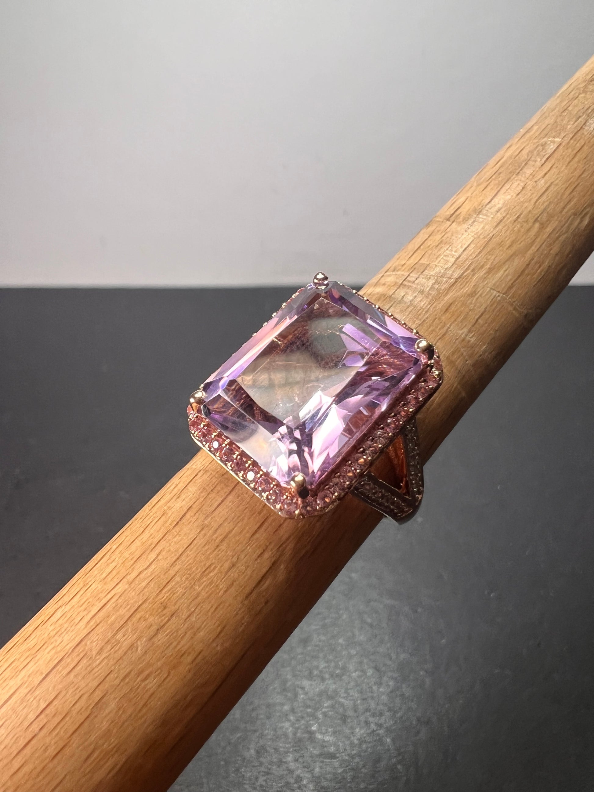 Genuine rose de France amethyst in a radiant cut. Surrounded by pink sapphire accent stones around the halo and white zircon accents on the shank. Set in rose gold vermeil over sterling silver. Size 8. 925 Djoy. 12.35 ctw