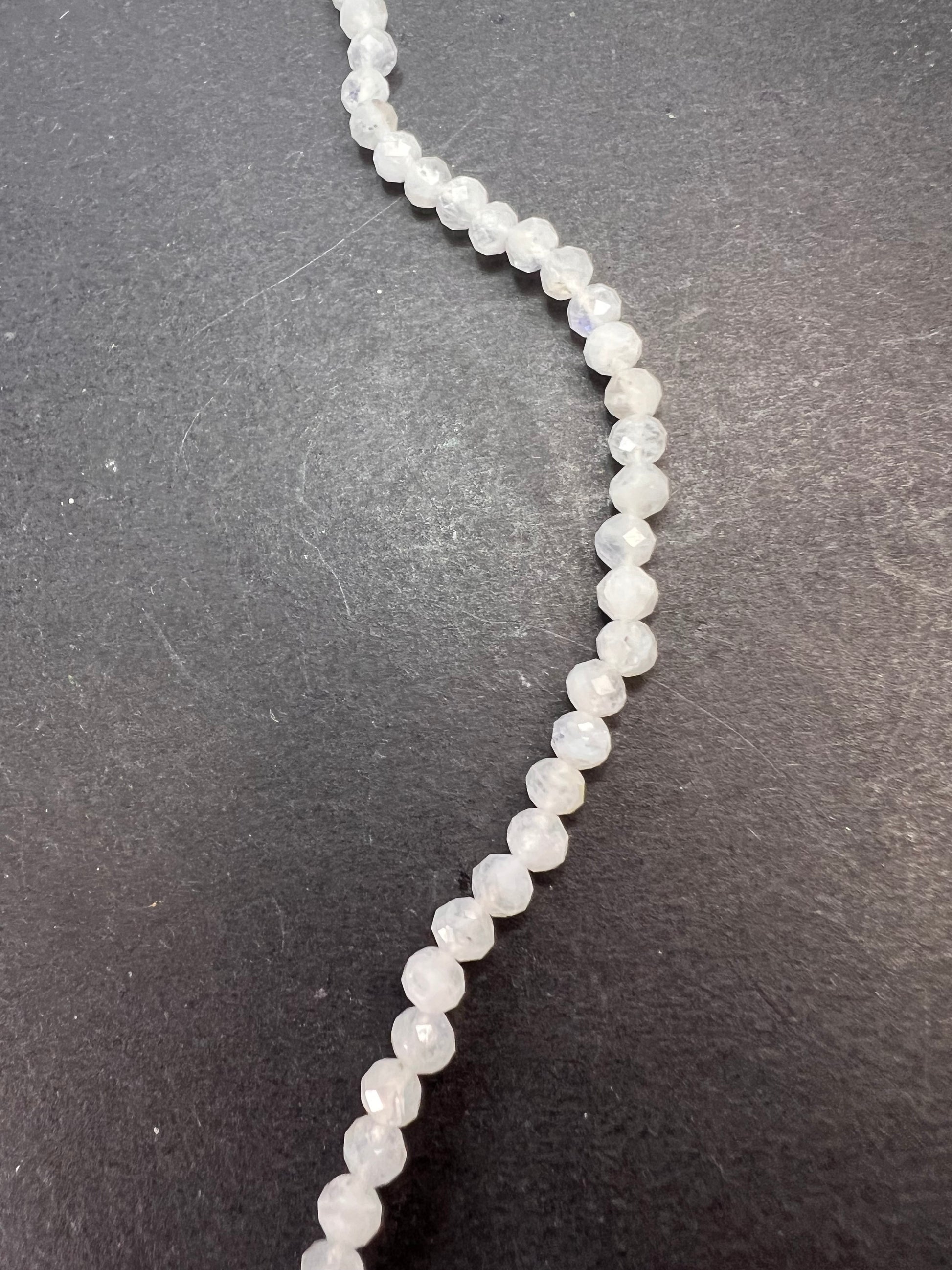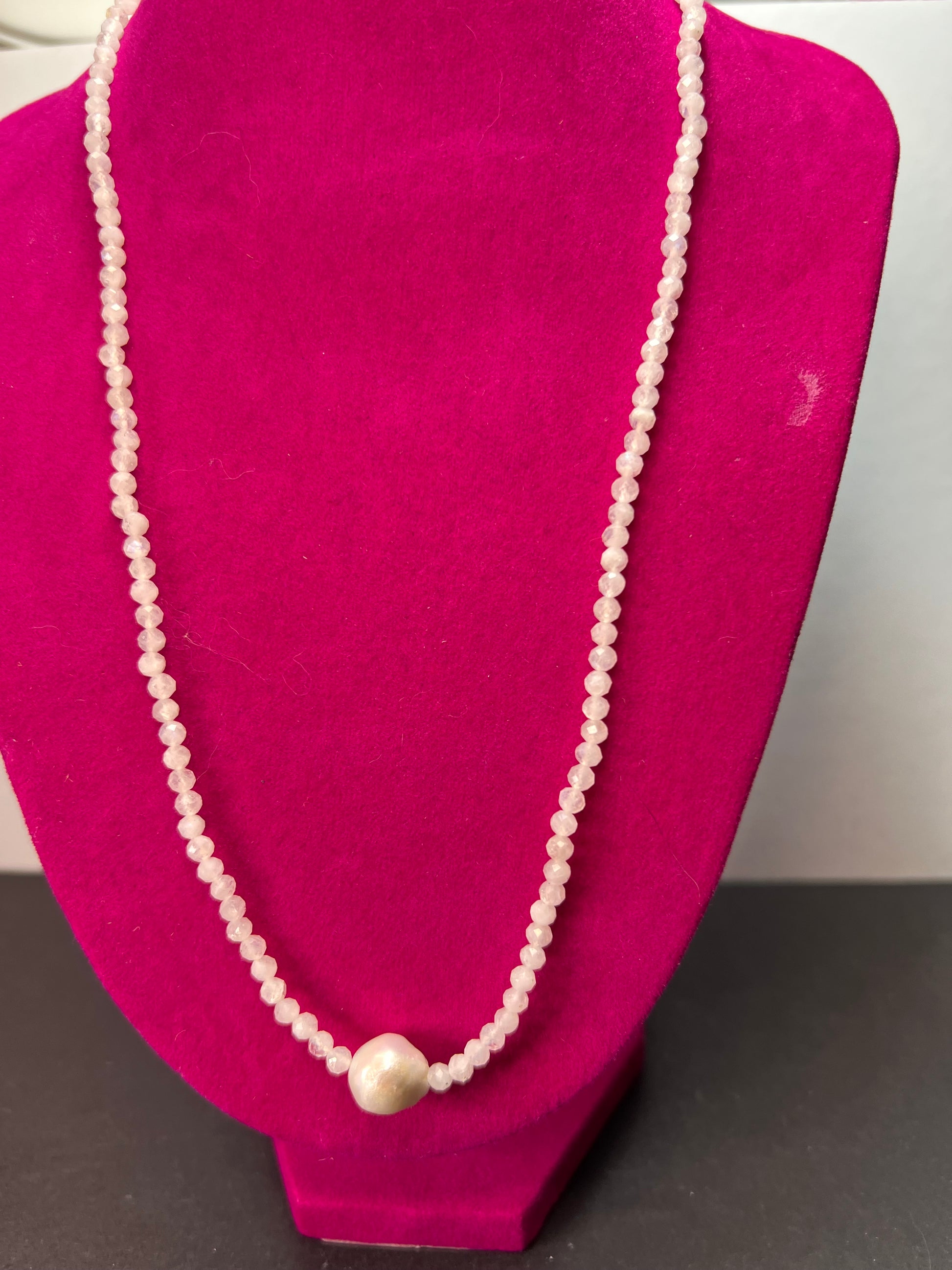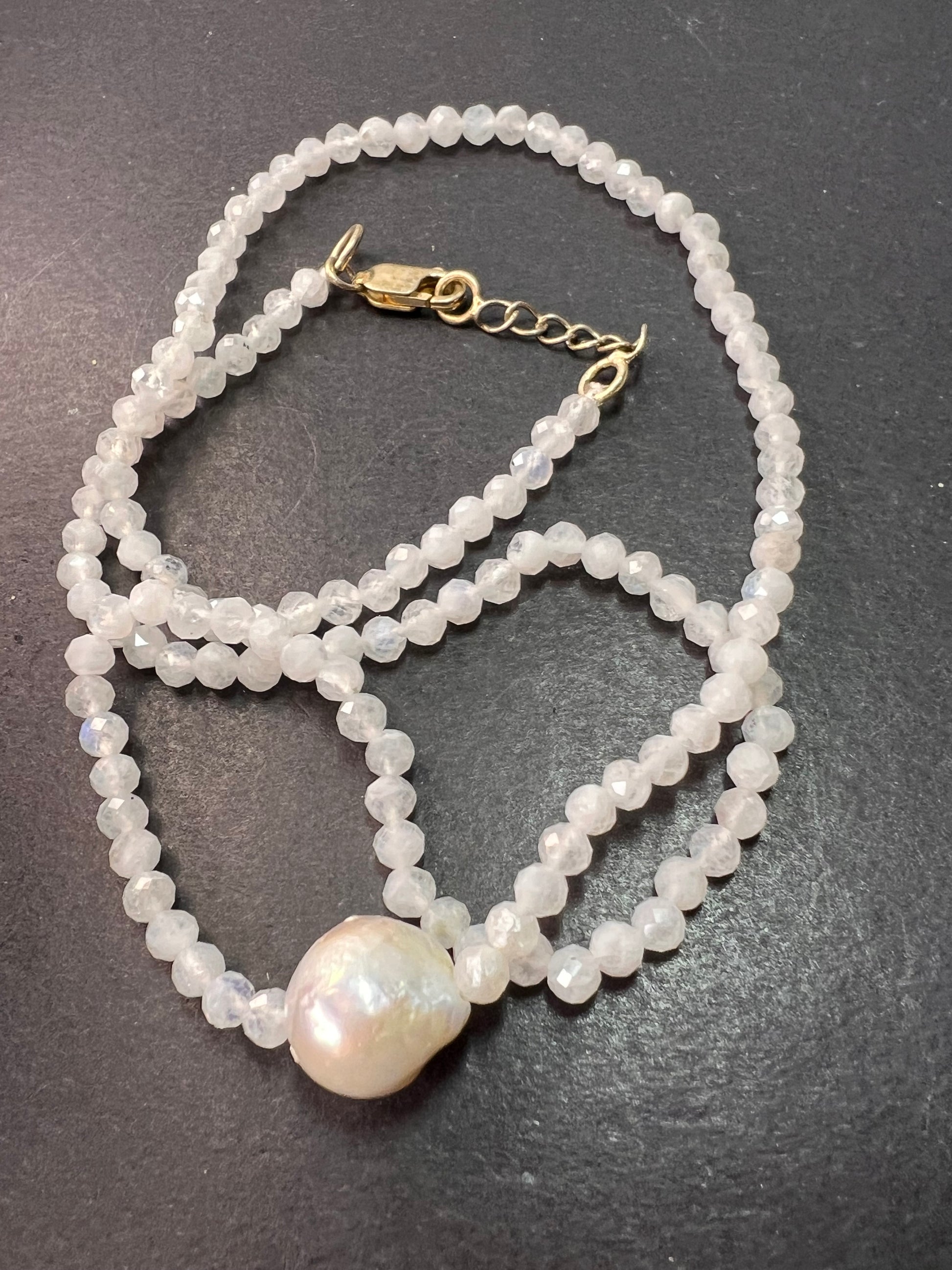 Faceted 2-3mm rainbow moonstone beads with a white baroque cultured pearl in the center. Sterling silver lobster clasp with extender. Measures about 16 inches in length with extender adding another 2 inches if desired.