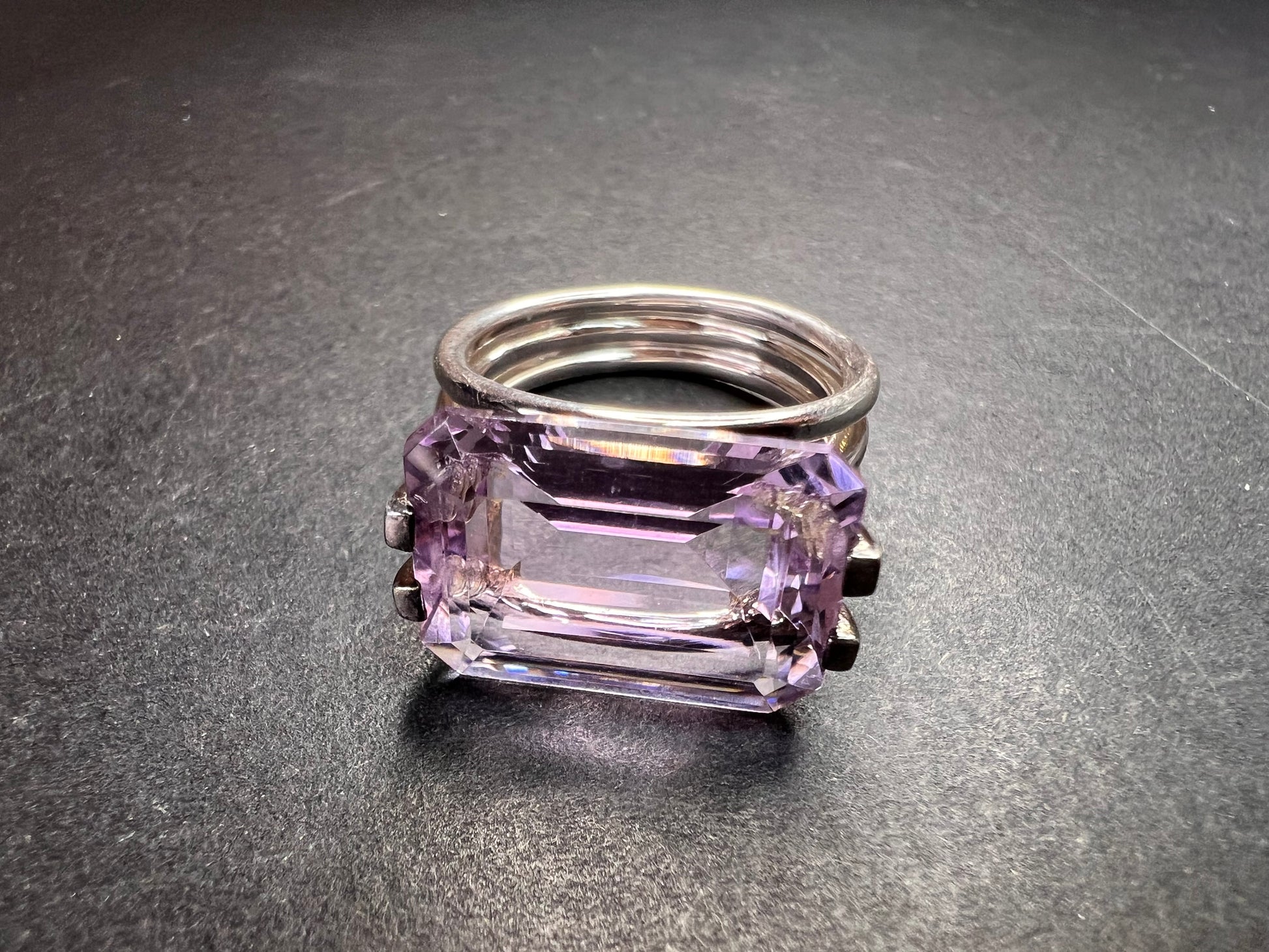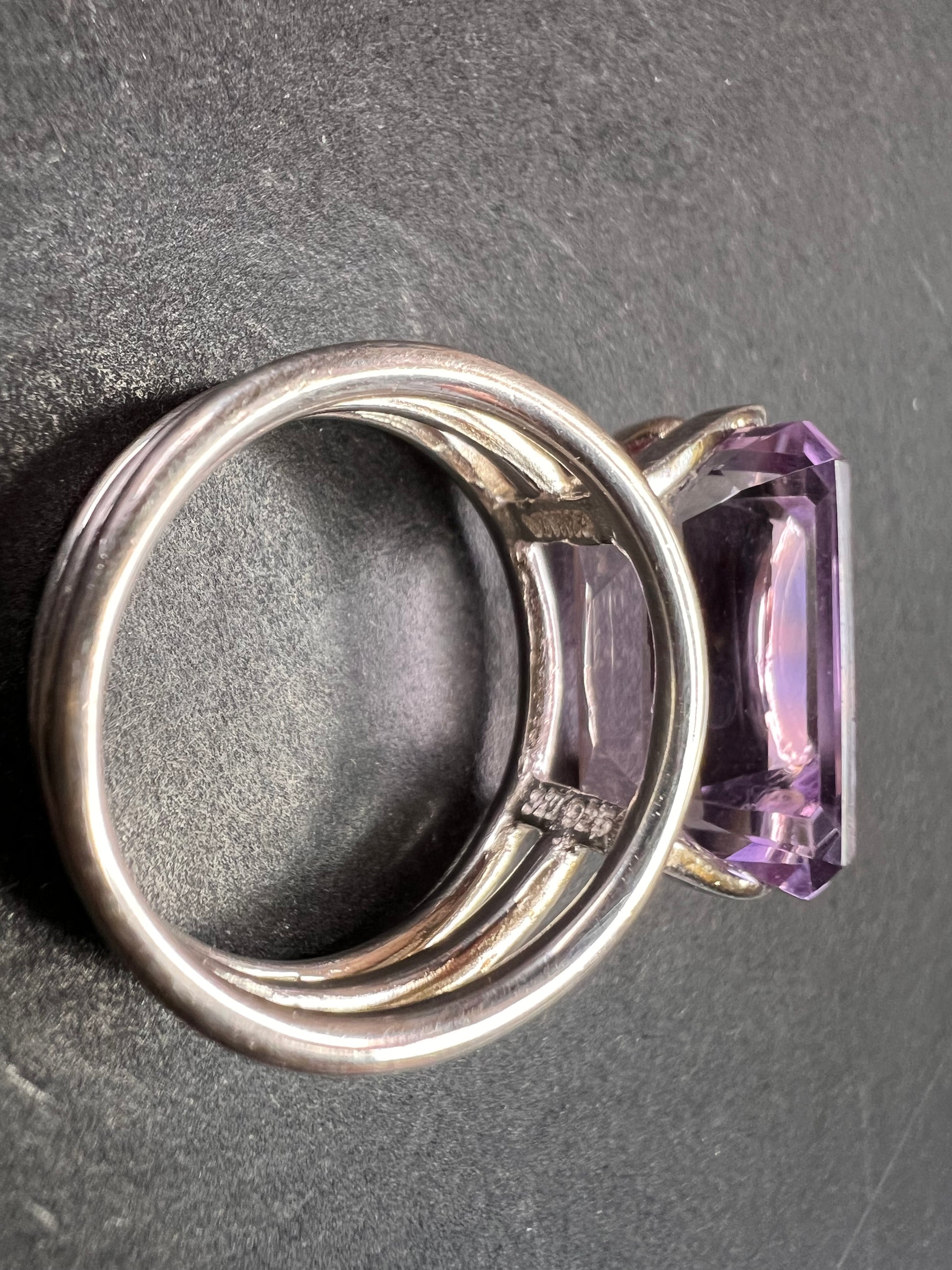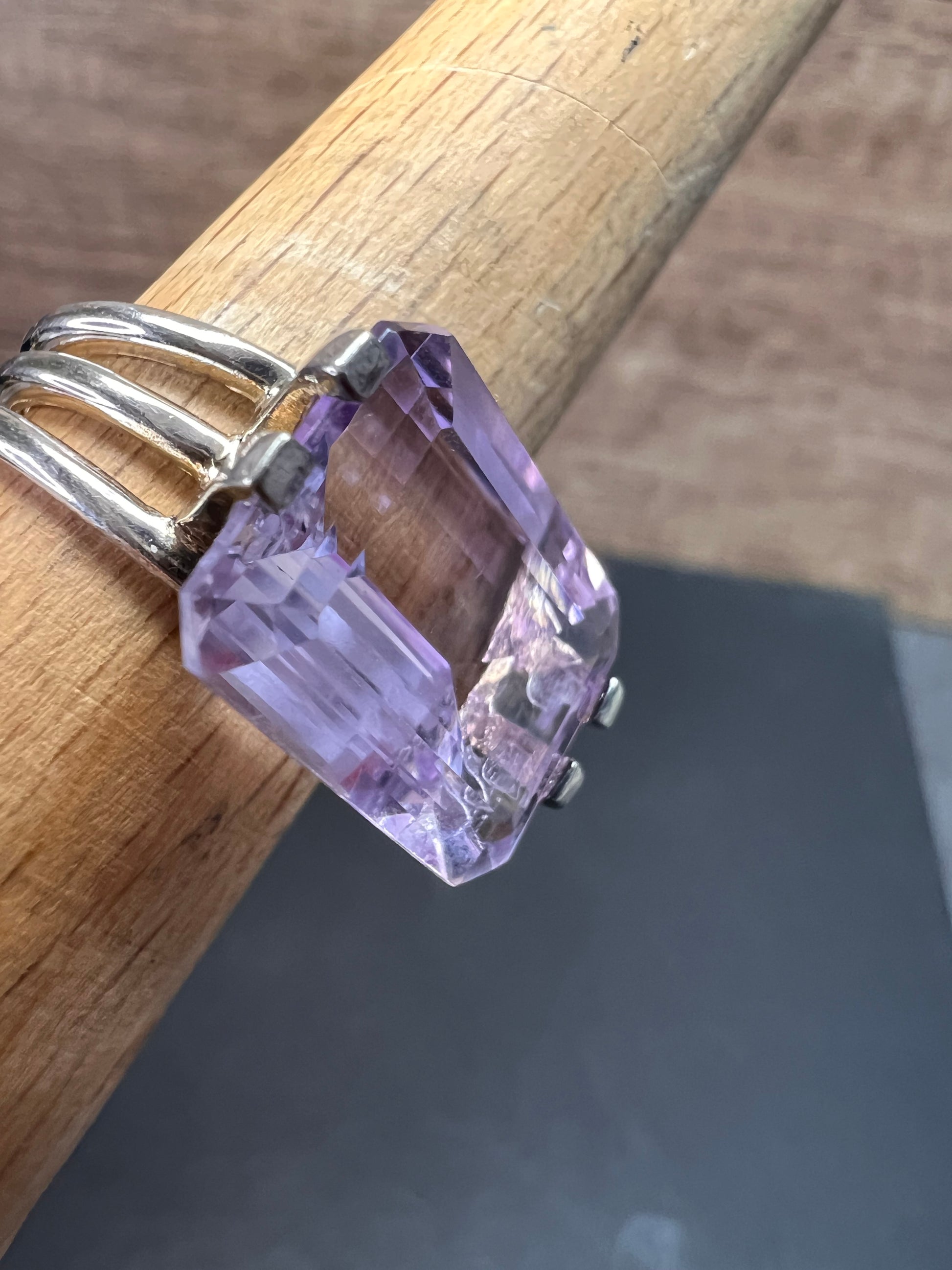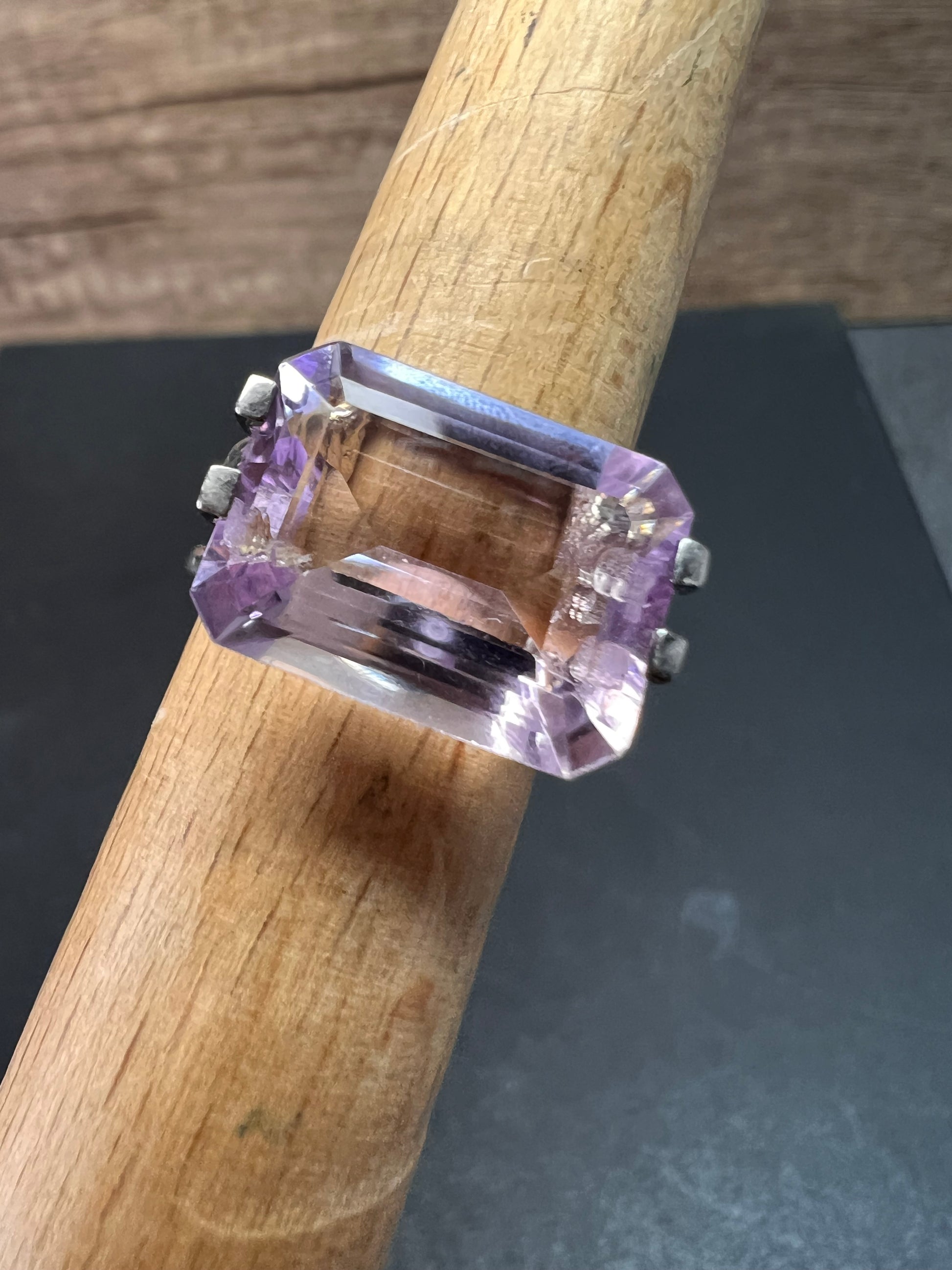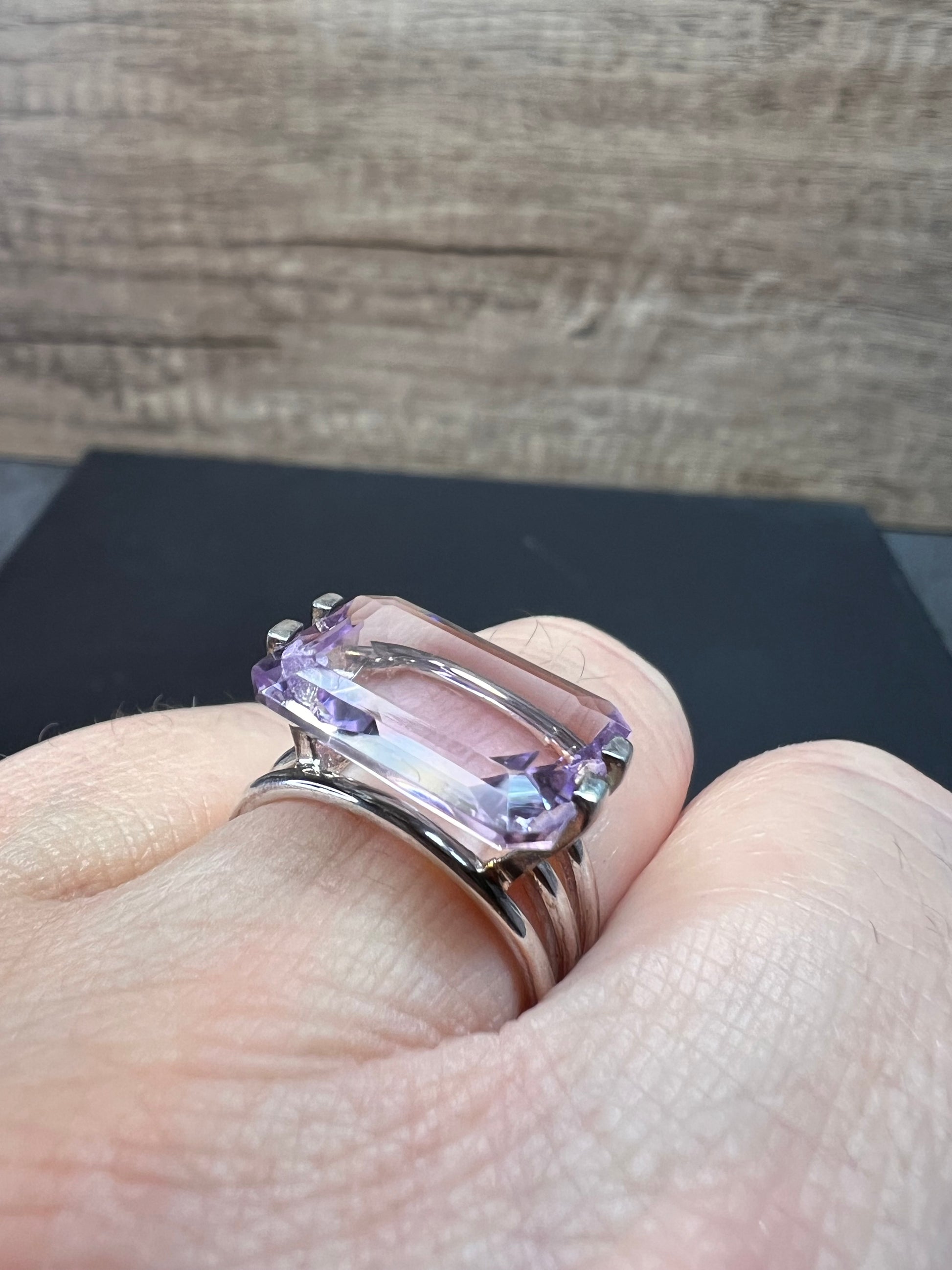 Genuine emerald cut rose de France amethyst gemstone suspended in 4 prongs in an authentic 925 sterling silver setting. Measures a size 7. Total weight is 5.89 grams. HL hallmark 925 China. Sterling silver is likely plated with a rhodium.