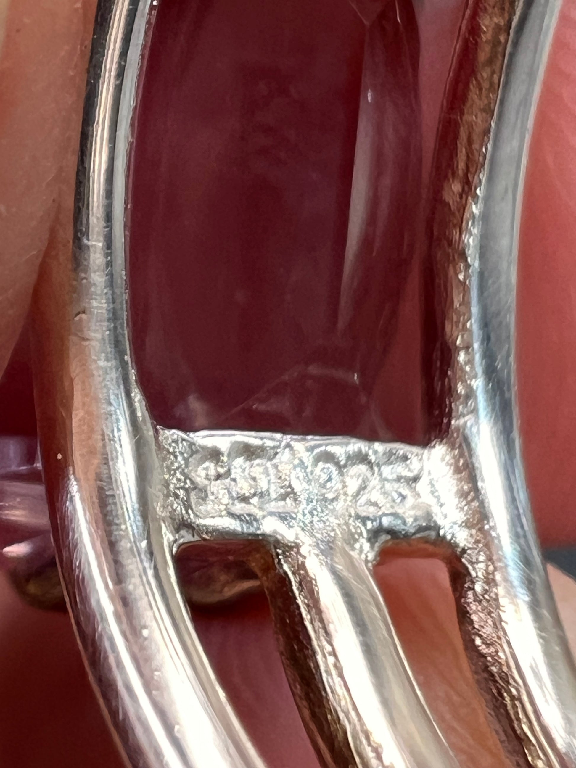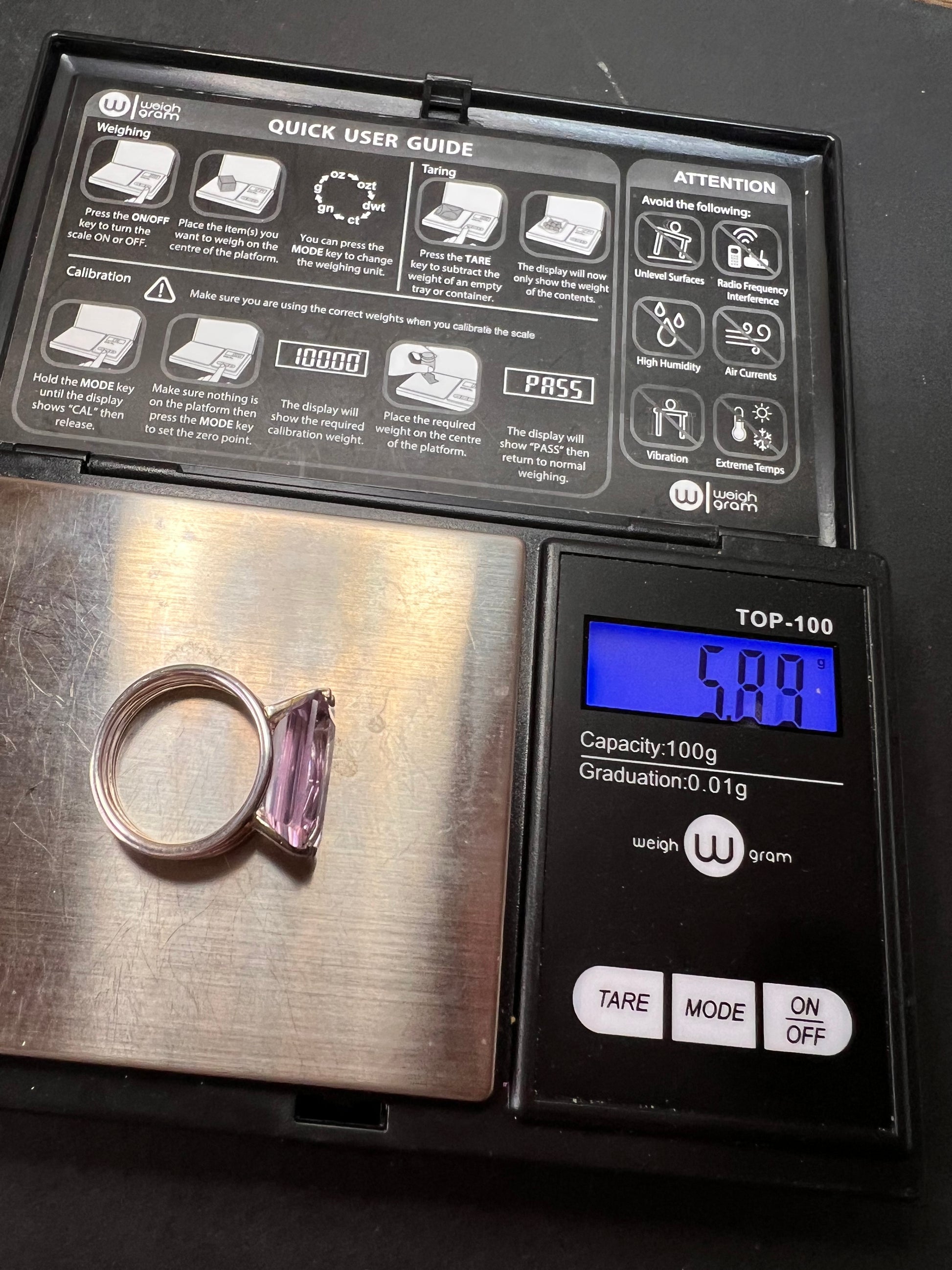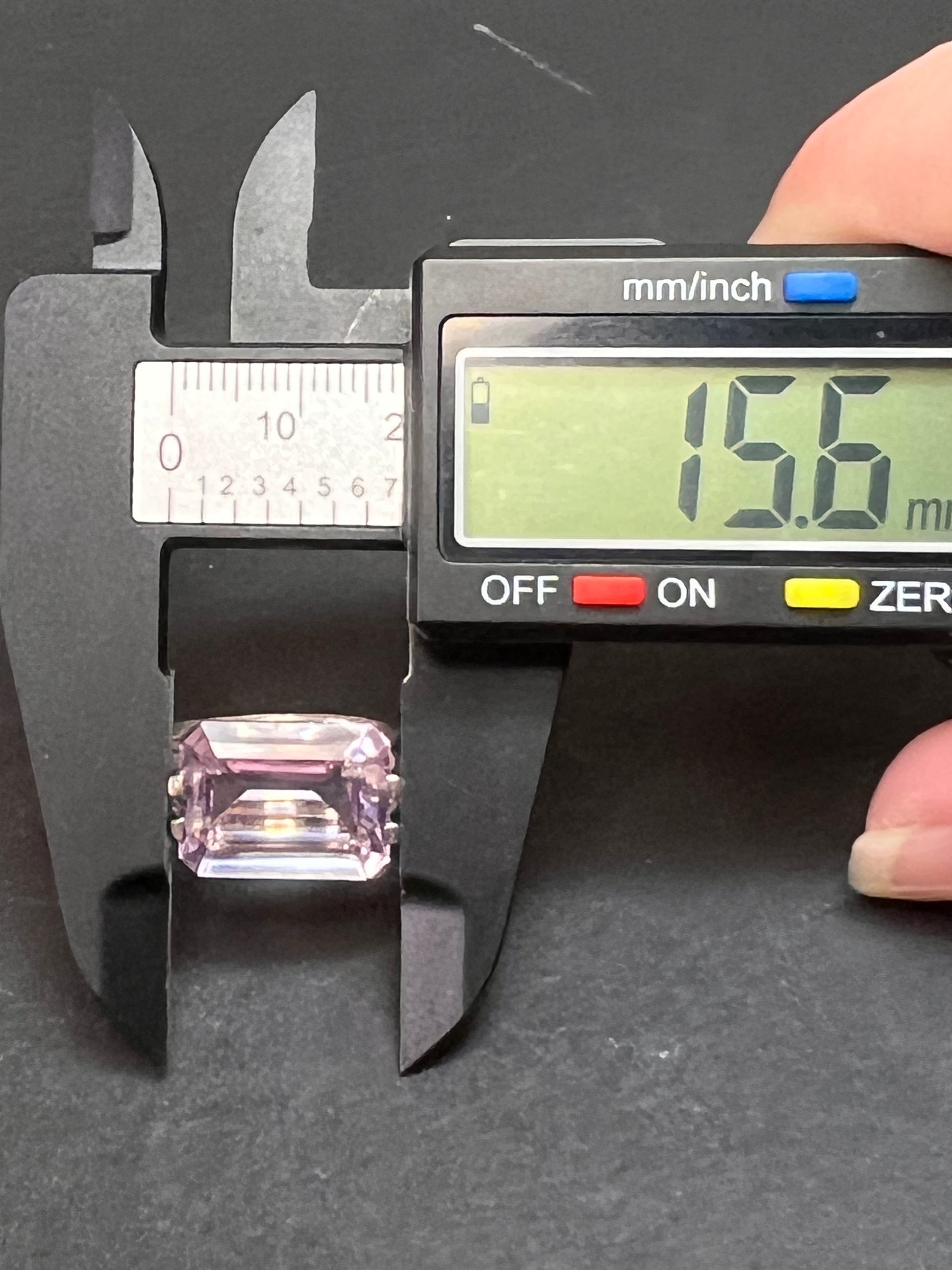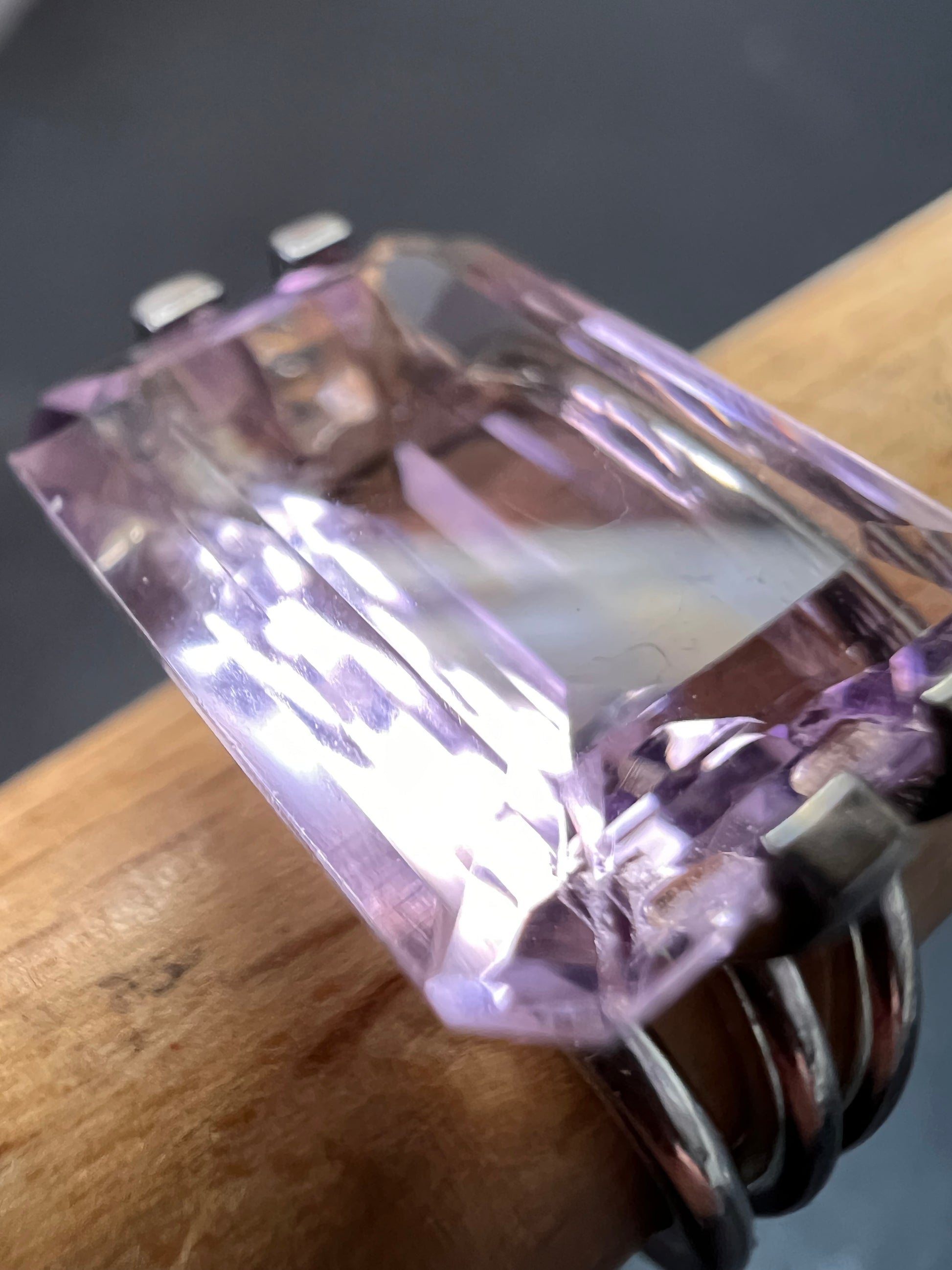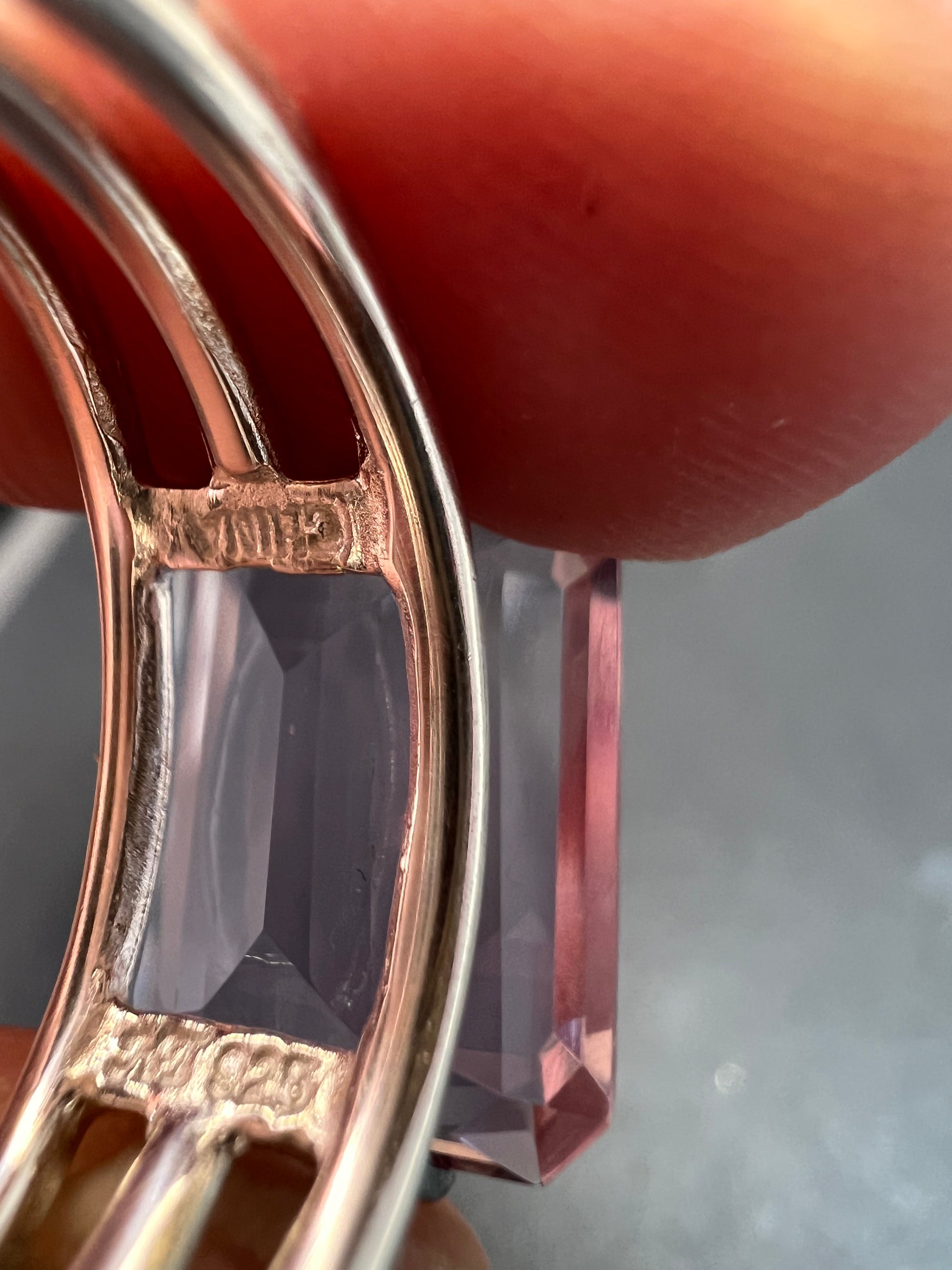 Genuine emerald cut rose de France amethyst gemstone suspended in 4 prongs in an authentic 925 sterling silver setting. Measures a size 7. Total weight is 5.89 grams. HL hallmark 925 China. Sterling silver is likely plated with a rhodium.