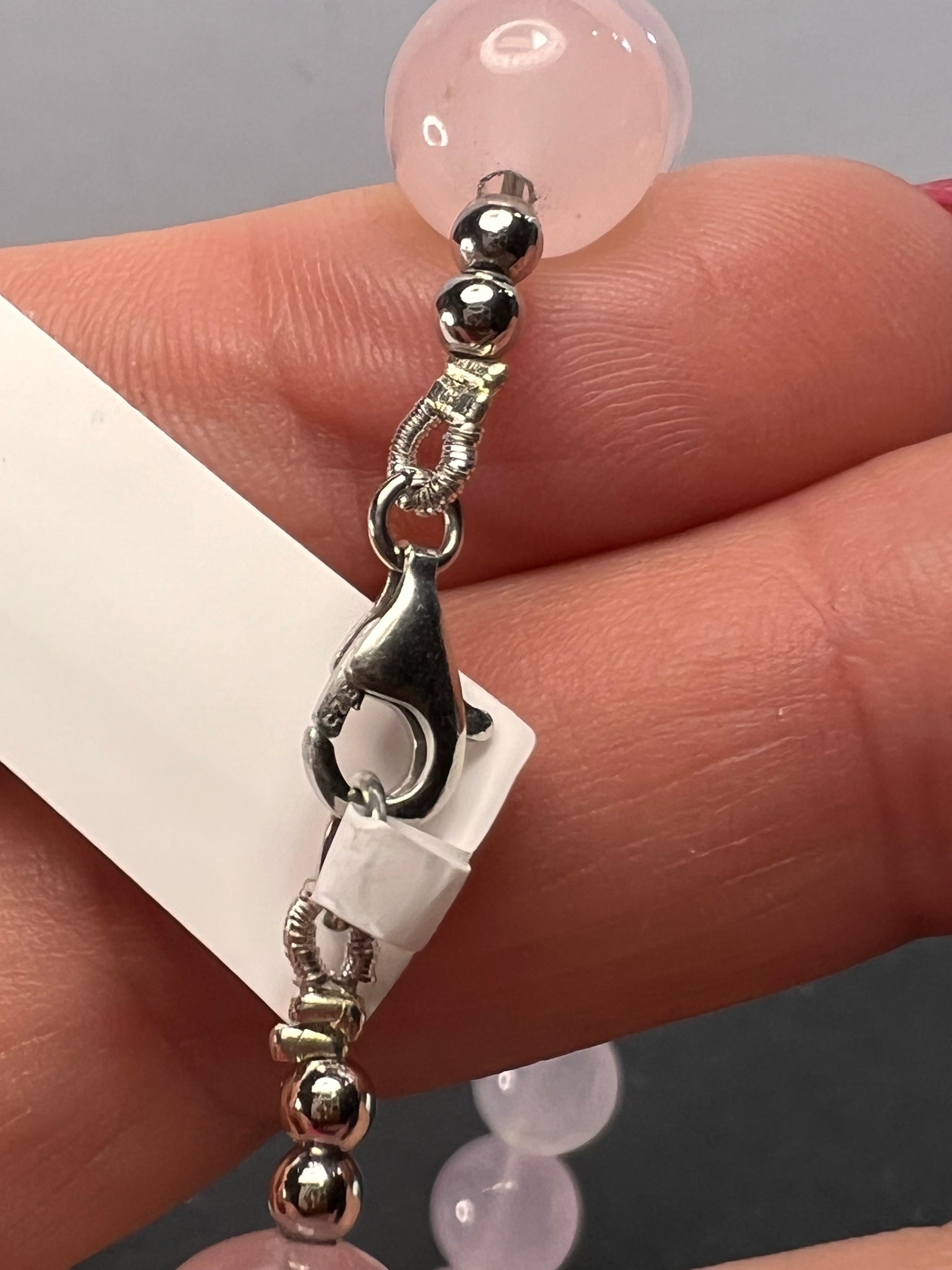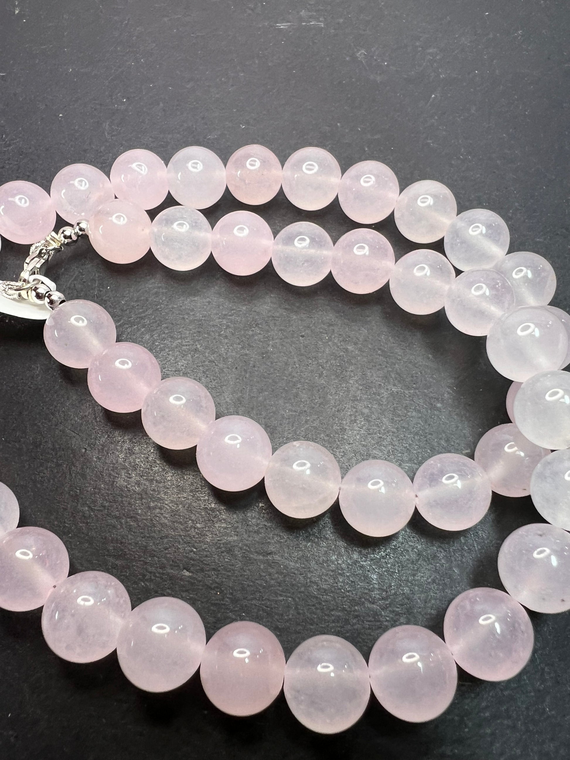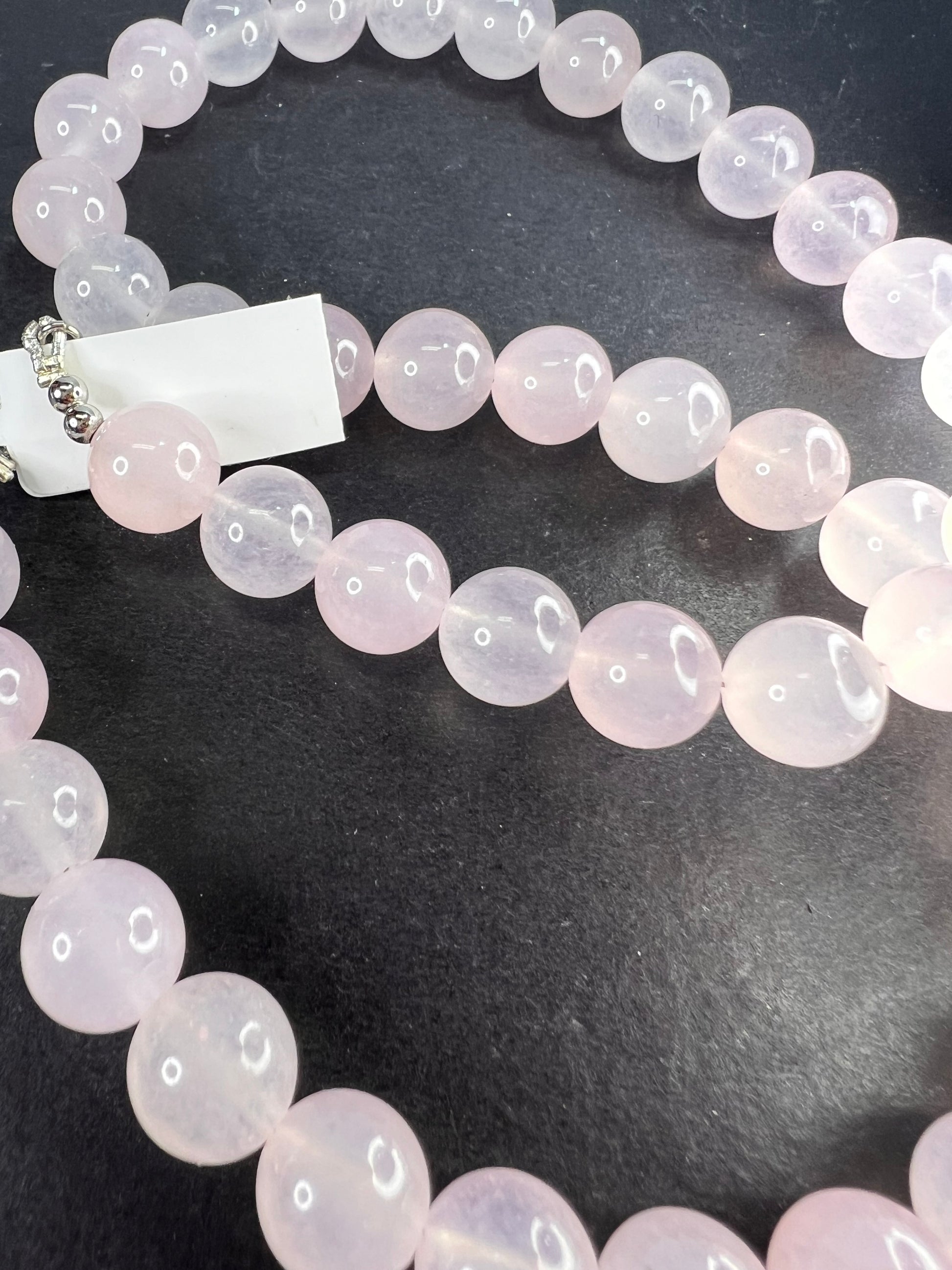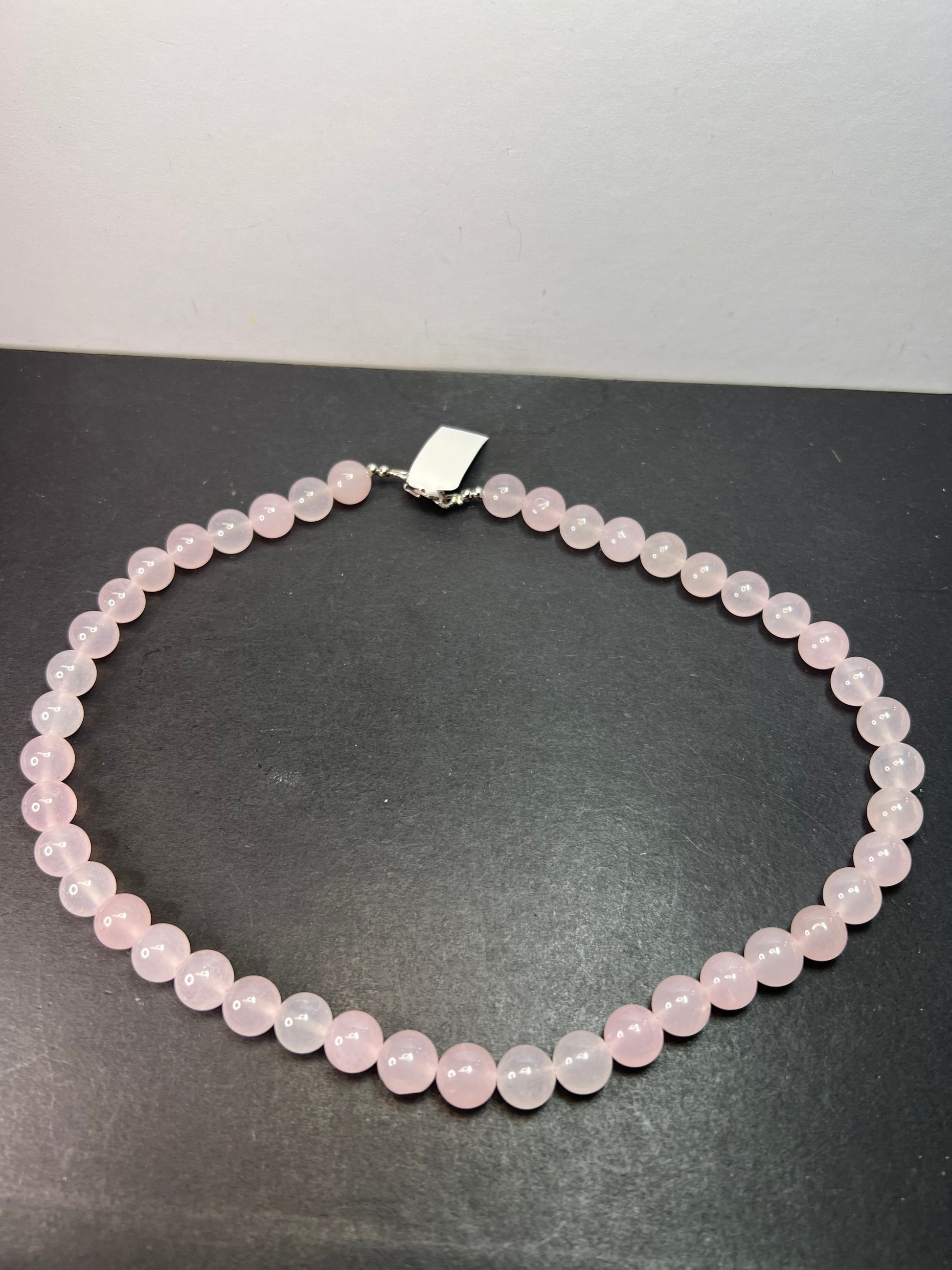 10mm rose quartz beads on an 18 inch strand. Sterling silver lobster claw clasp. 925 Thailand
