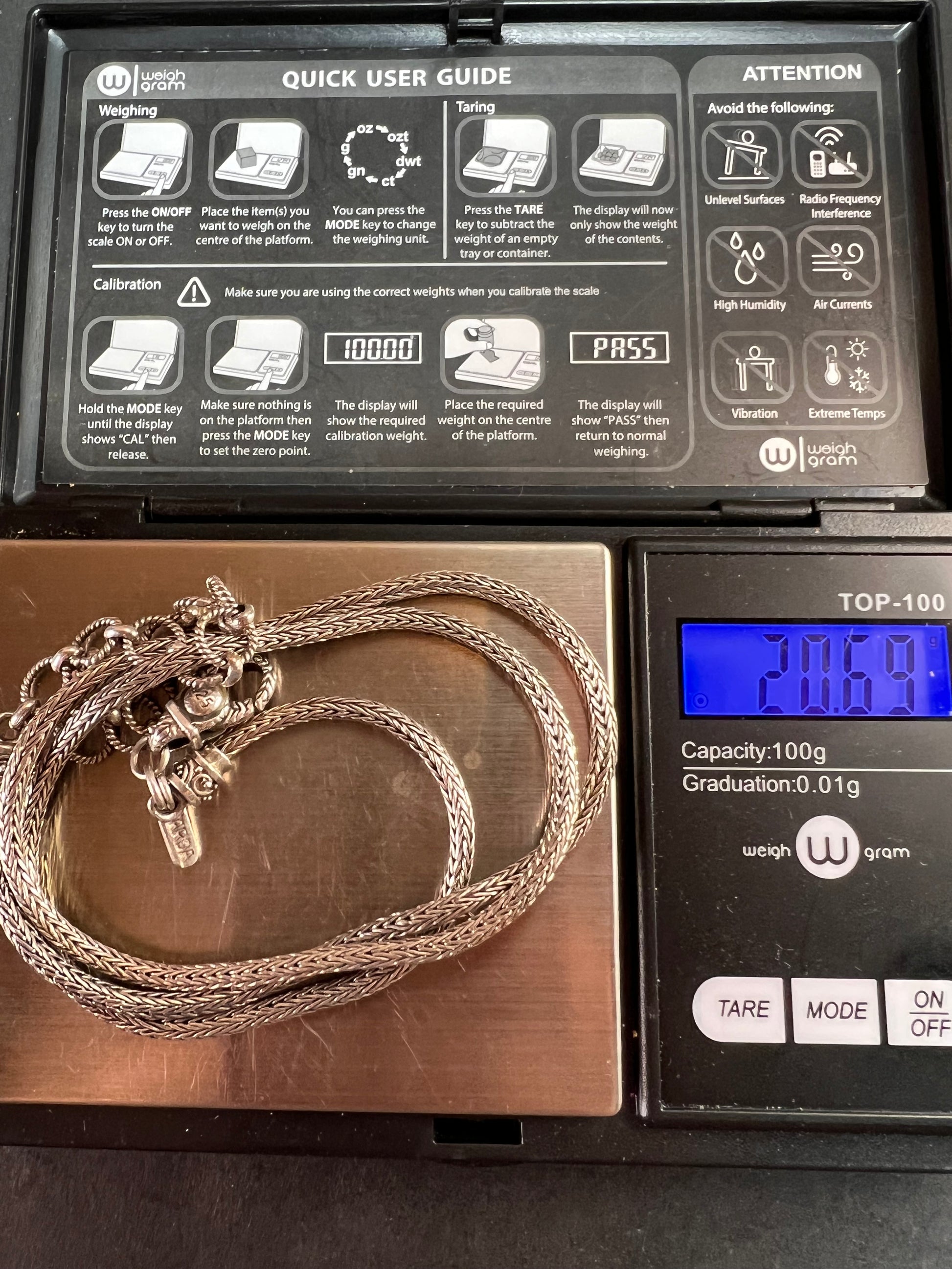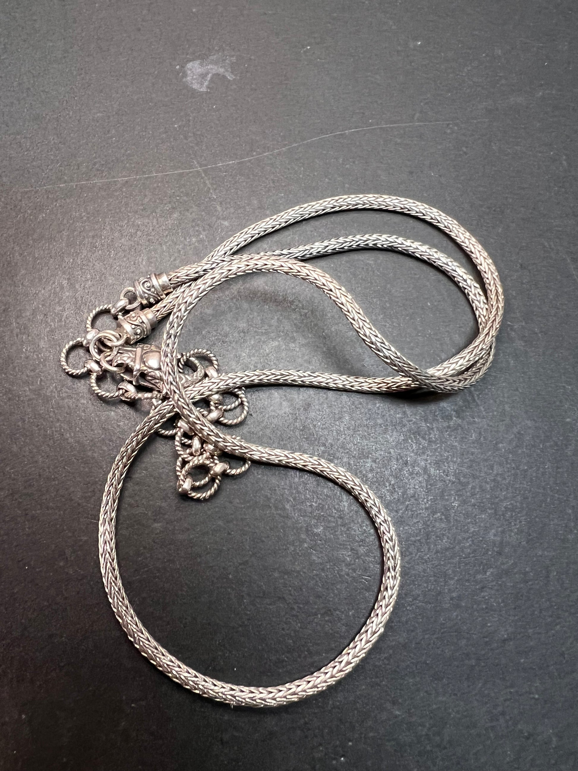 Authentic 925 Bali sterling silver Tulang Naga 24 inch necklace at its longest length, and 20 inches at its shortest length. Lobster clasp. Stamped Sarda 925. Total weight is 20.69 grams.