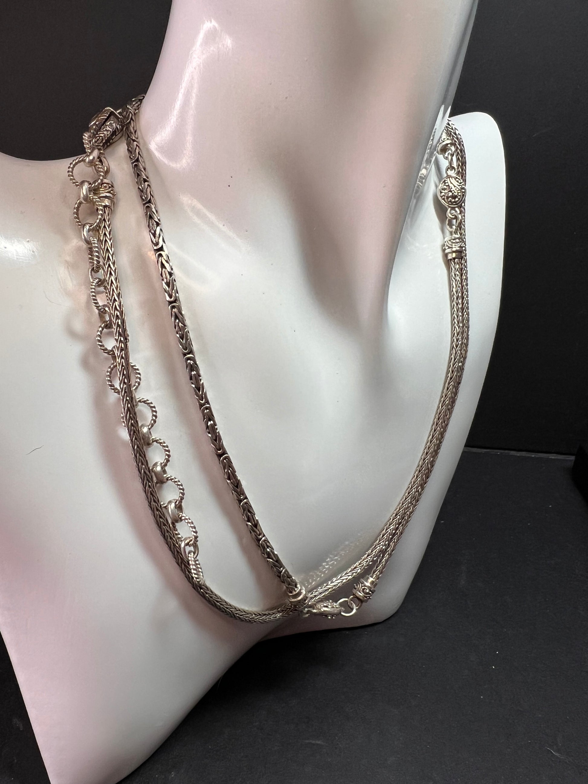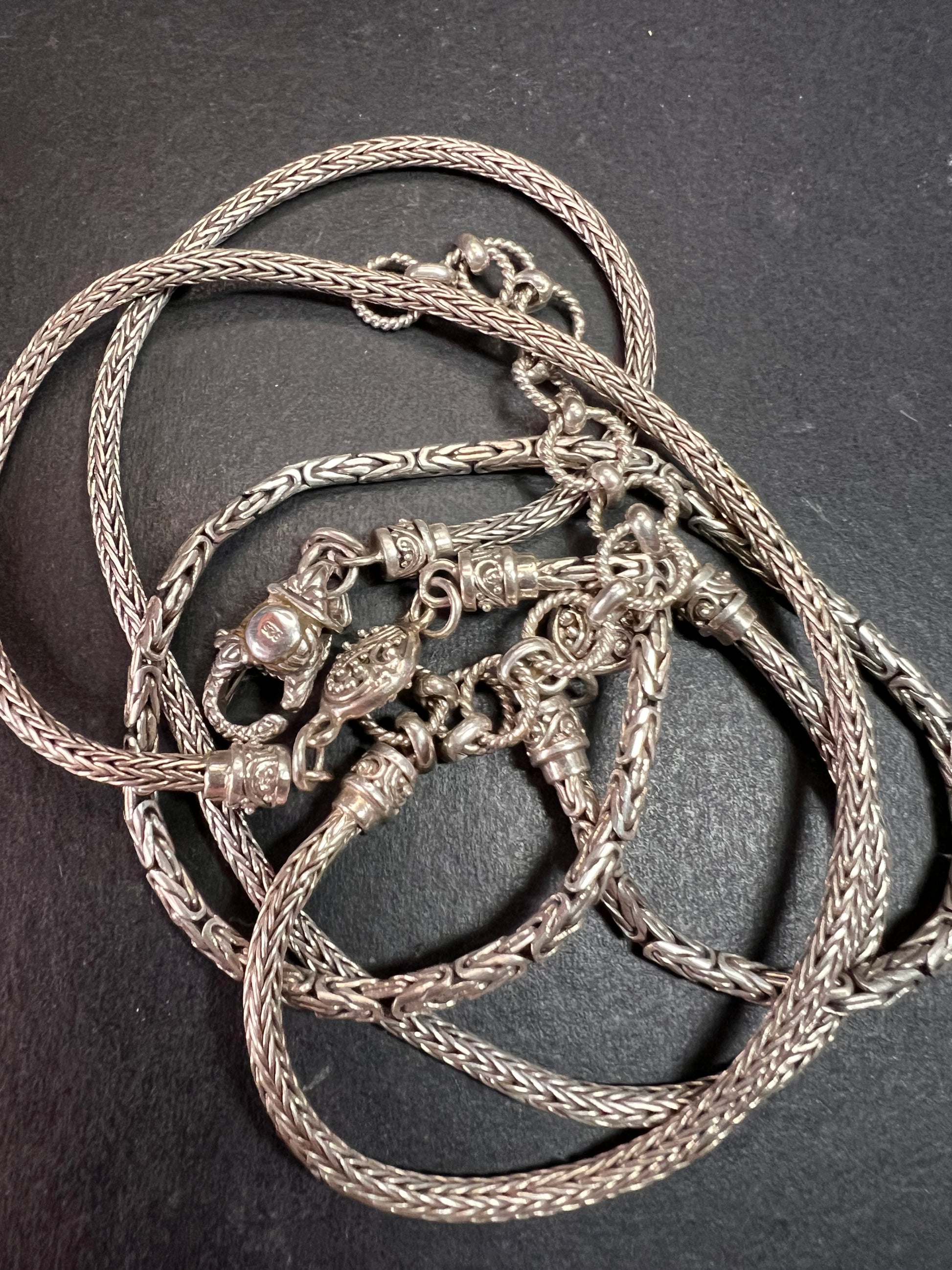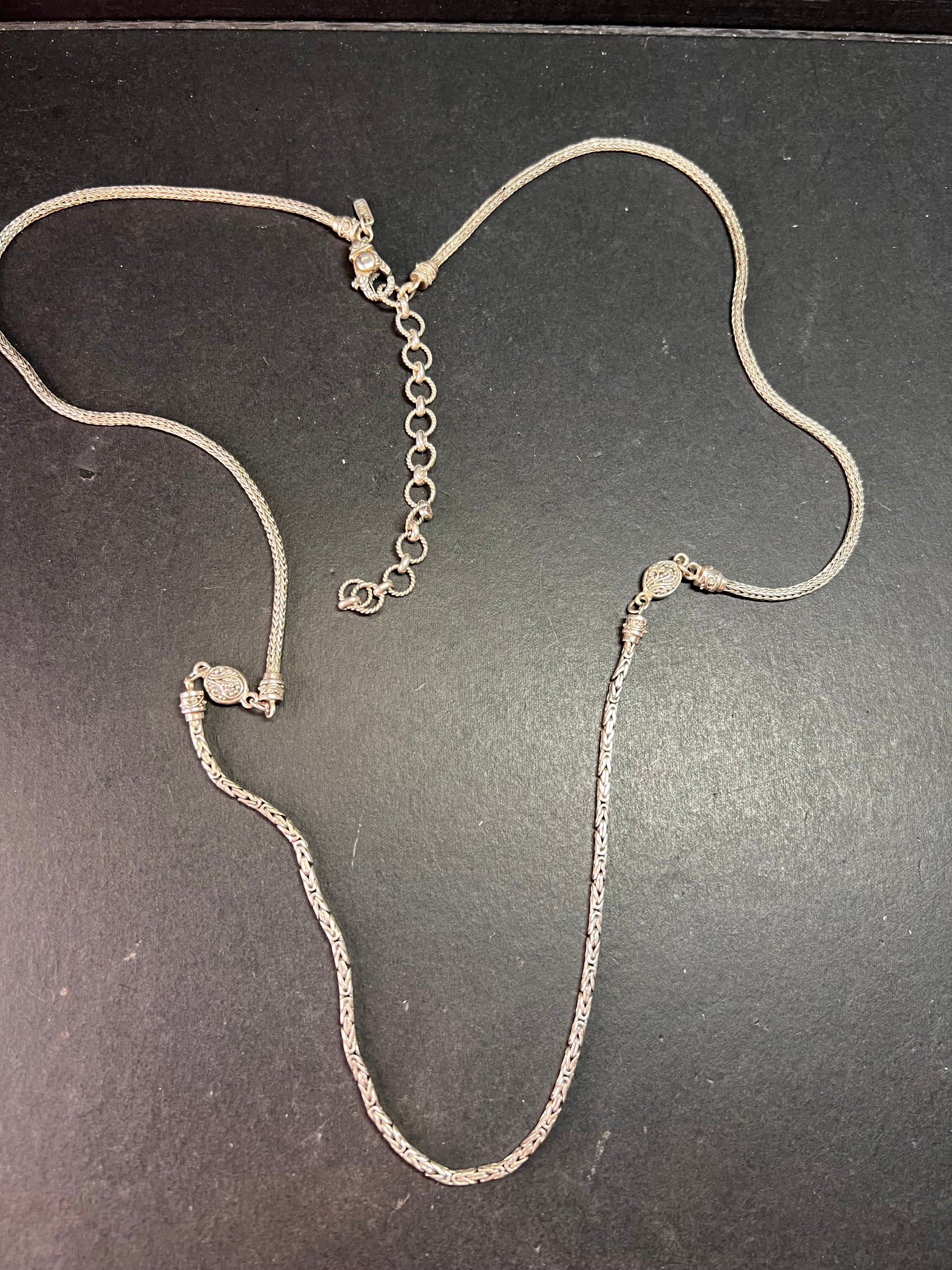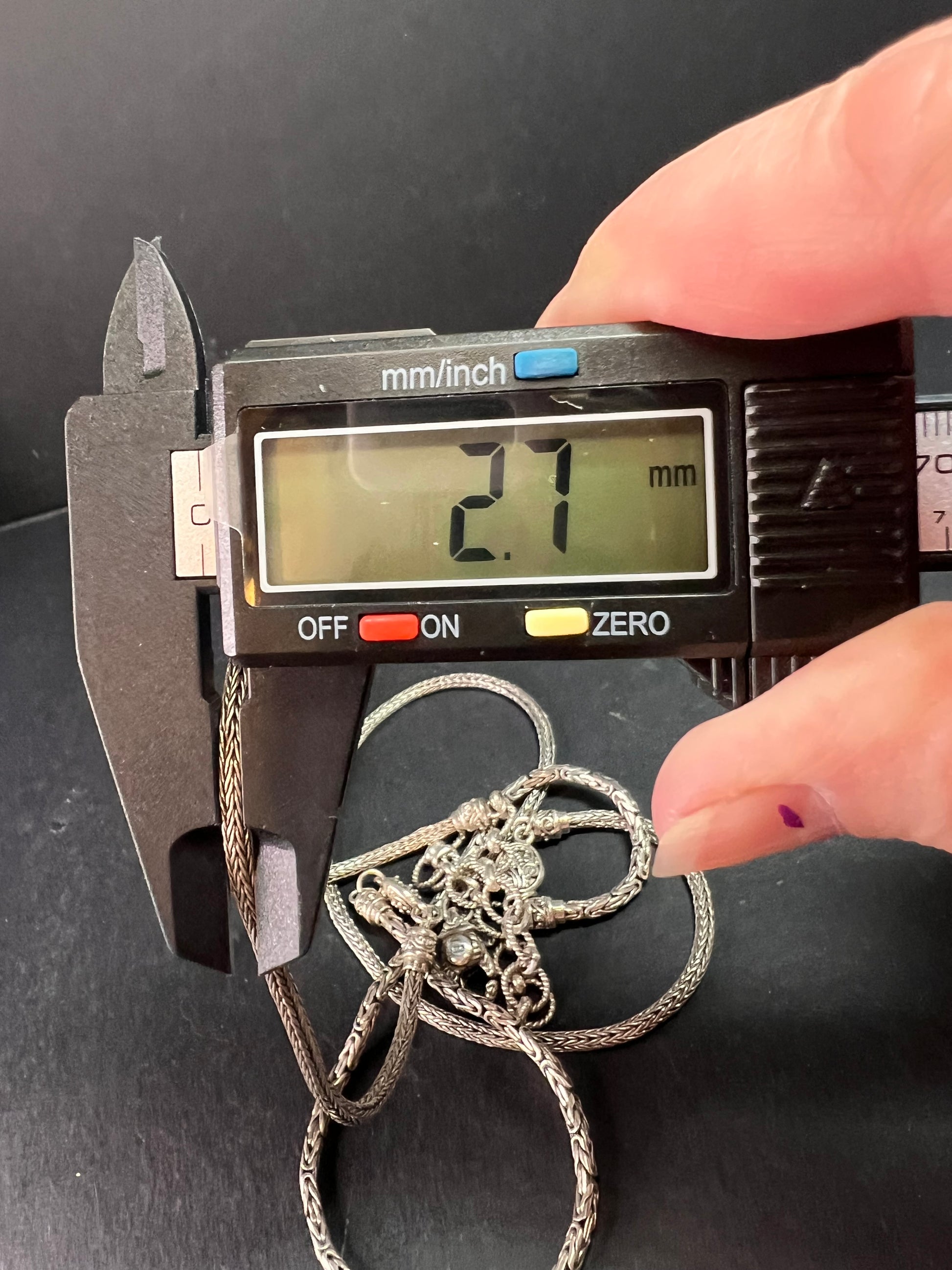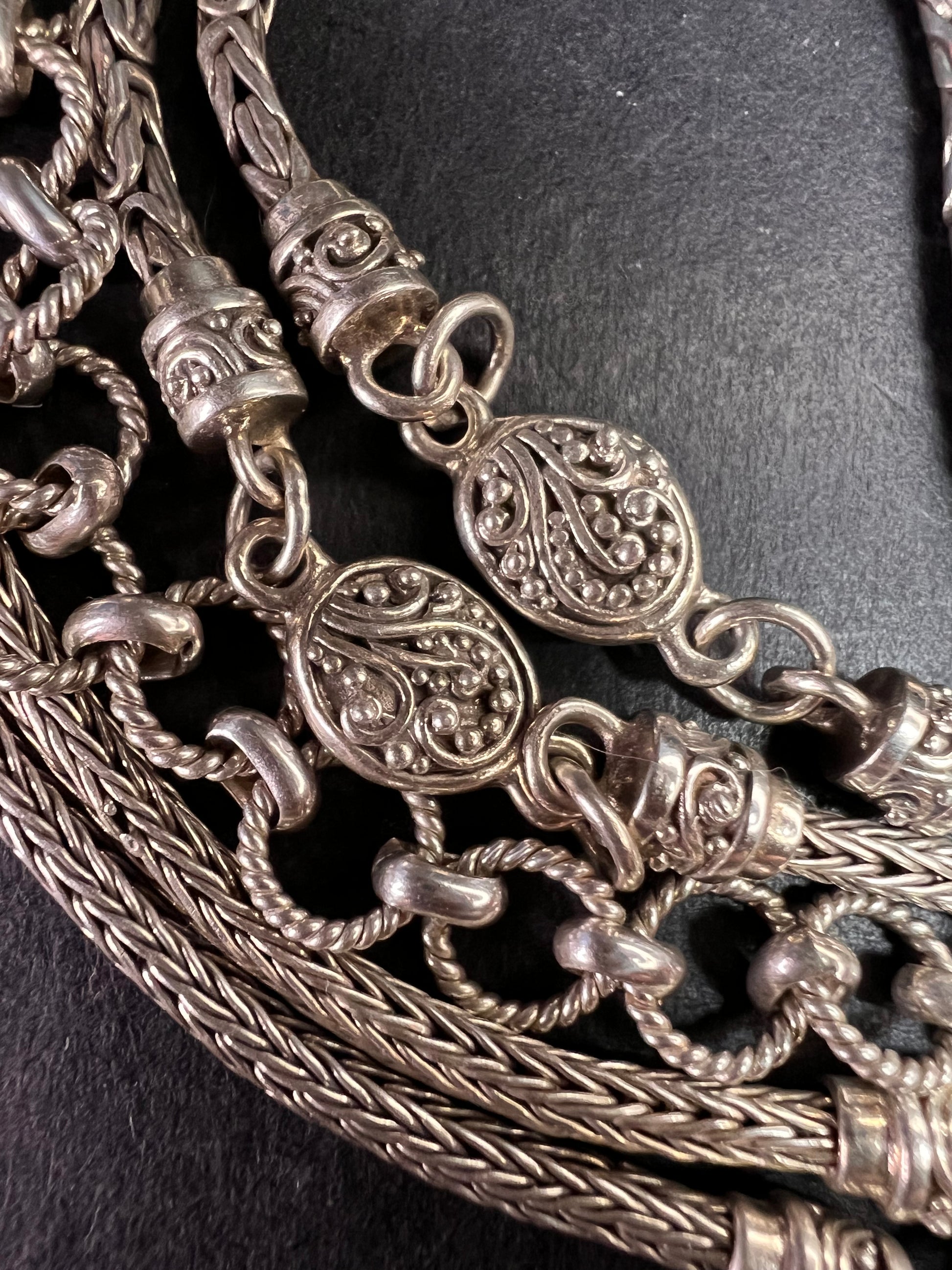 This stunning 36-inch Sarda sterling silver necklace features a beautifully handwoven Balinese foxtail chain accented by ornate scrollwork stations and intricate end caps. Crafted in solid 925 silver and weighing 38.5 grams, it offers a substantial feel and exceptional craftsmanship. Adjustable length with a decorative extender chain and signature Sarda tag. A timeless artisan piece perfect for layering or wearing solo.