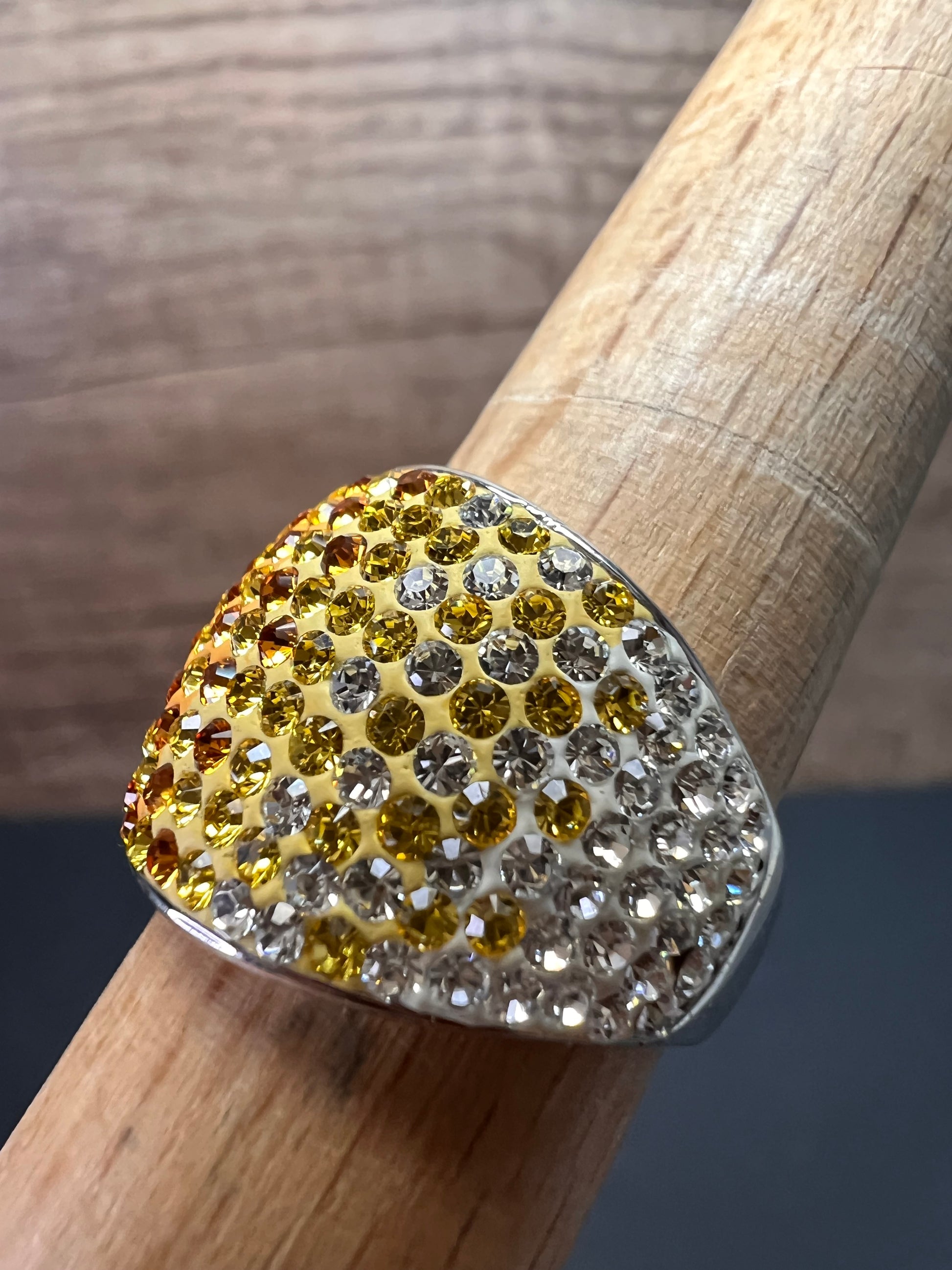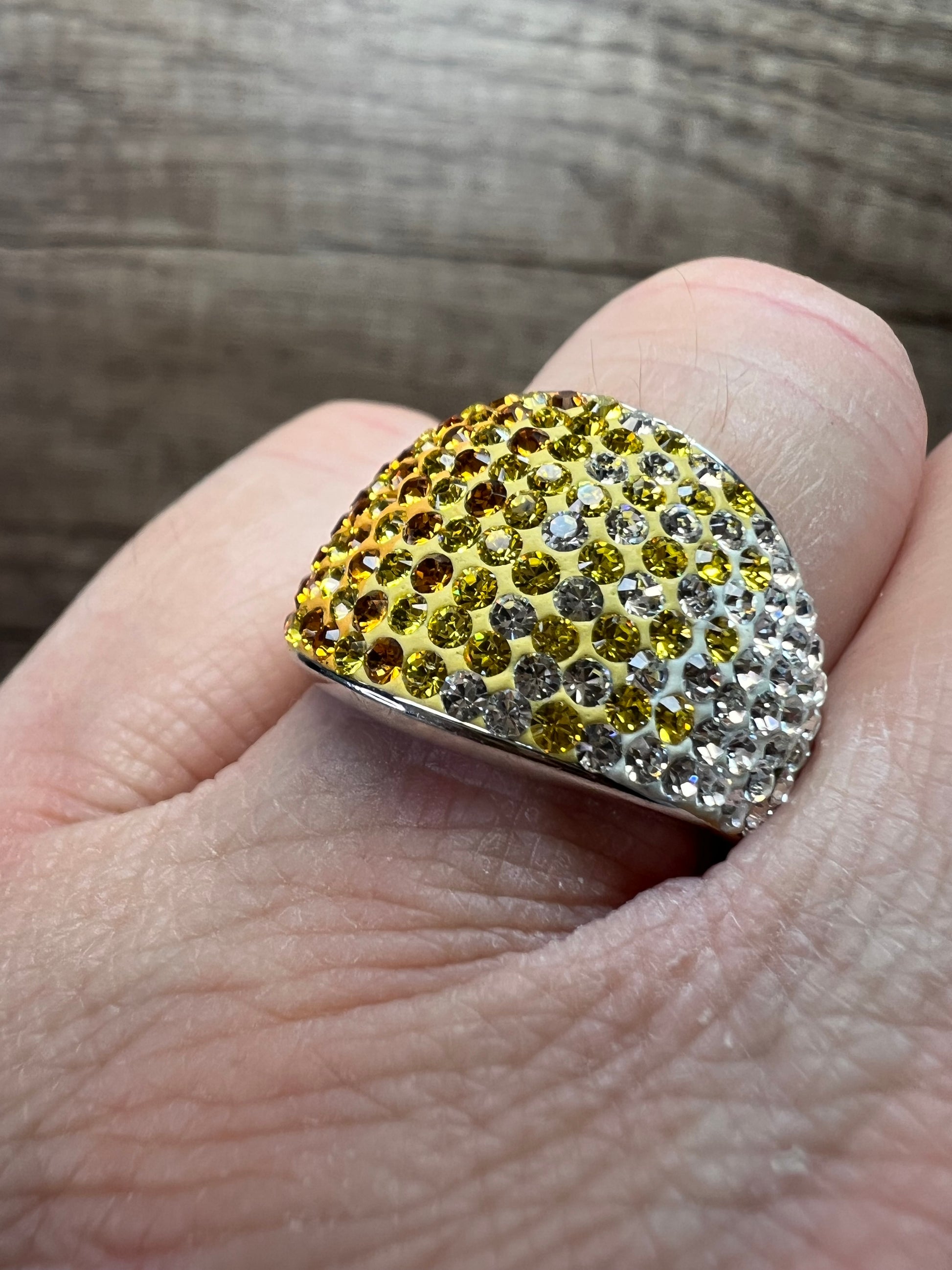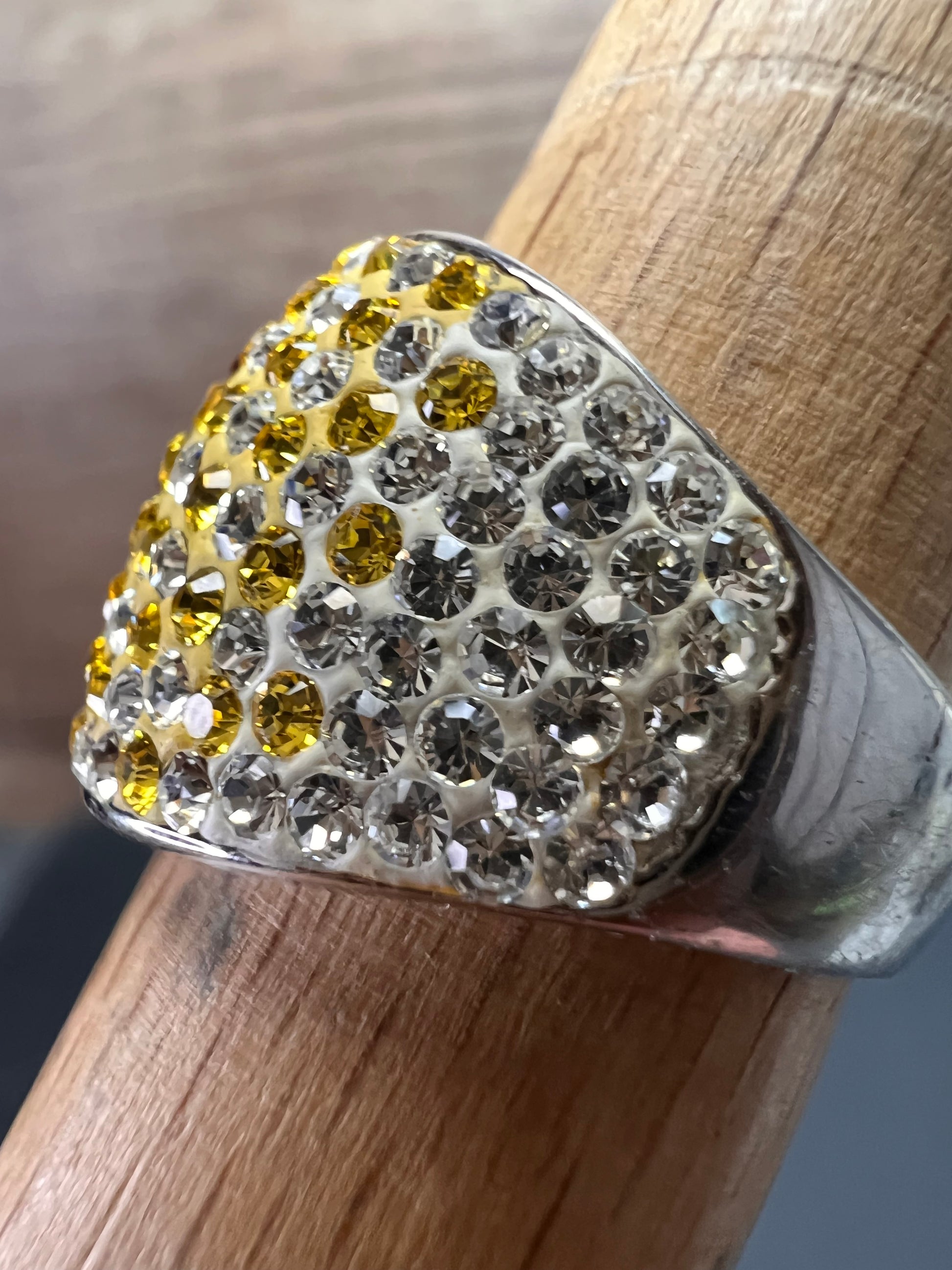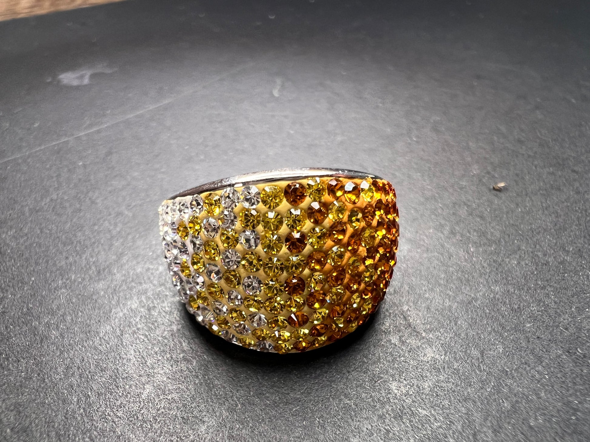 Signed Chelsea Taylor designer sterling silver ring with encrusted yellow ombré rhinestones. Size 8. Made in Thailand. Covered with an e coating to protect finish and stones. 925. Total weight is 7.94 grams. This is a sturdy, well made ring with a nice weight.