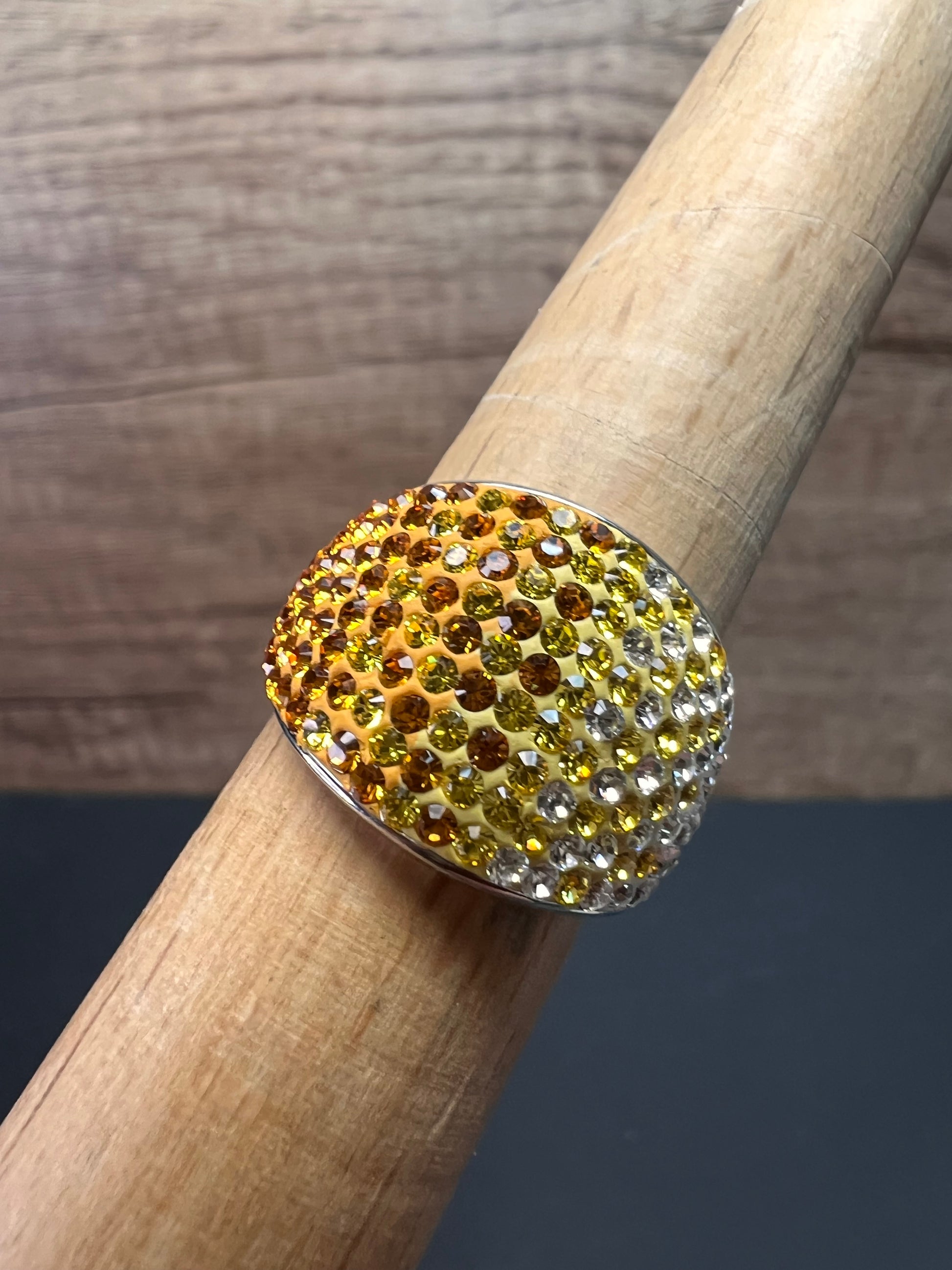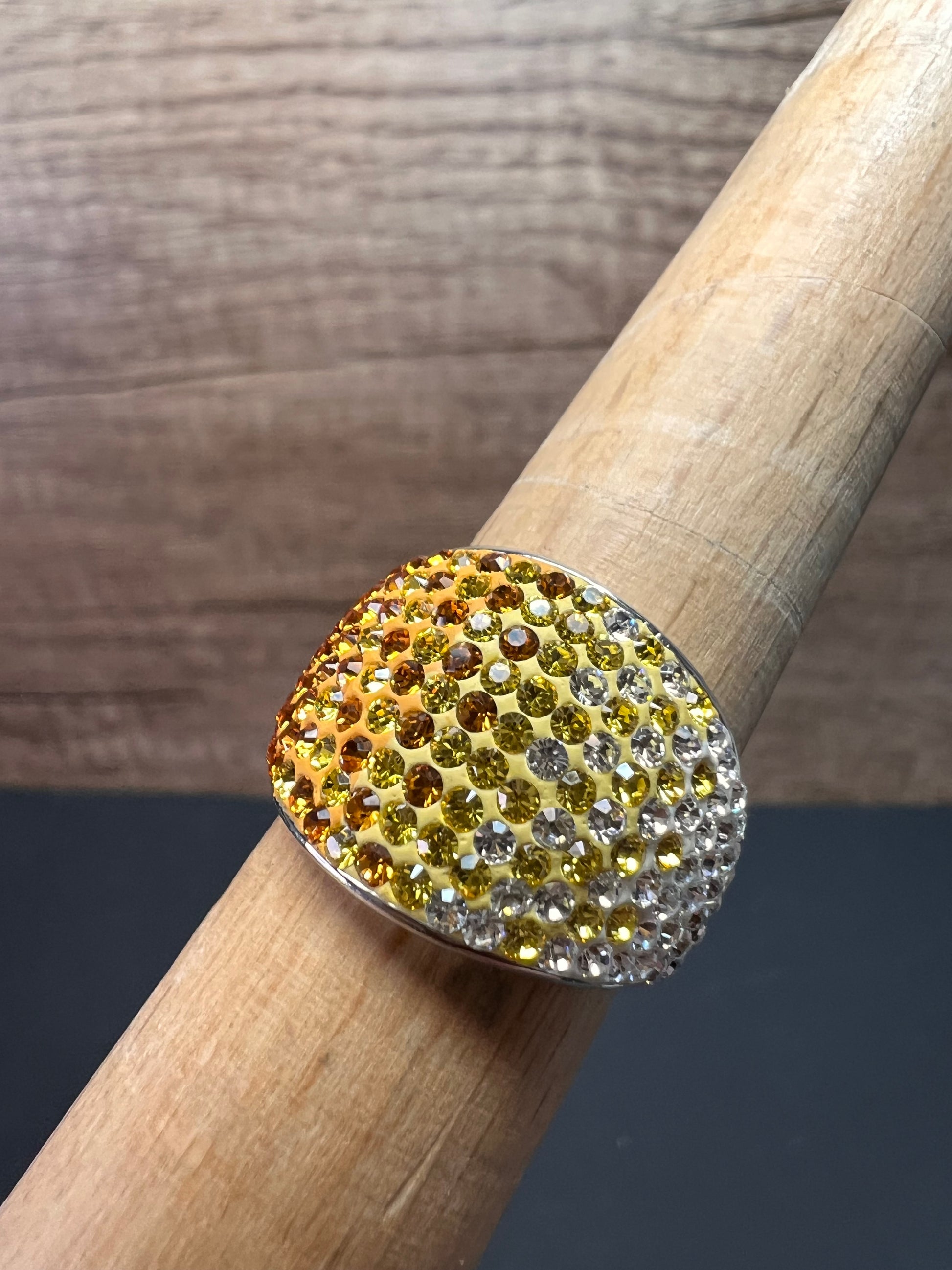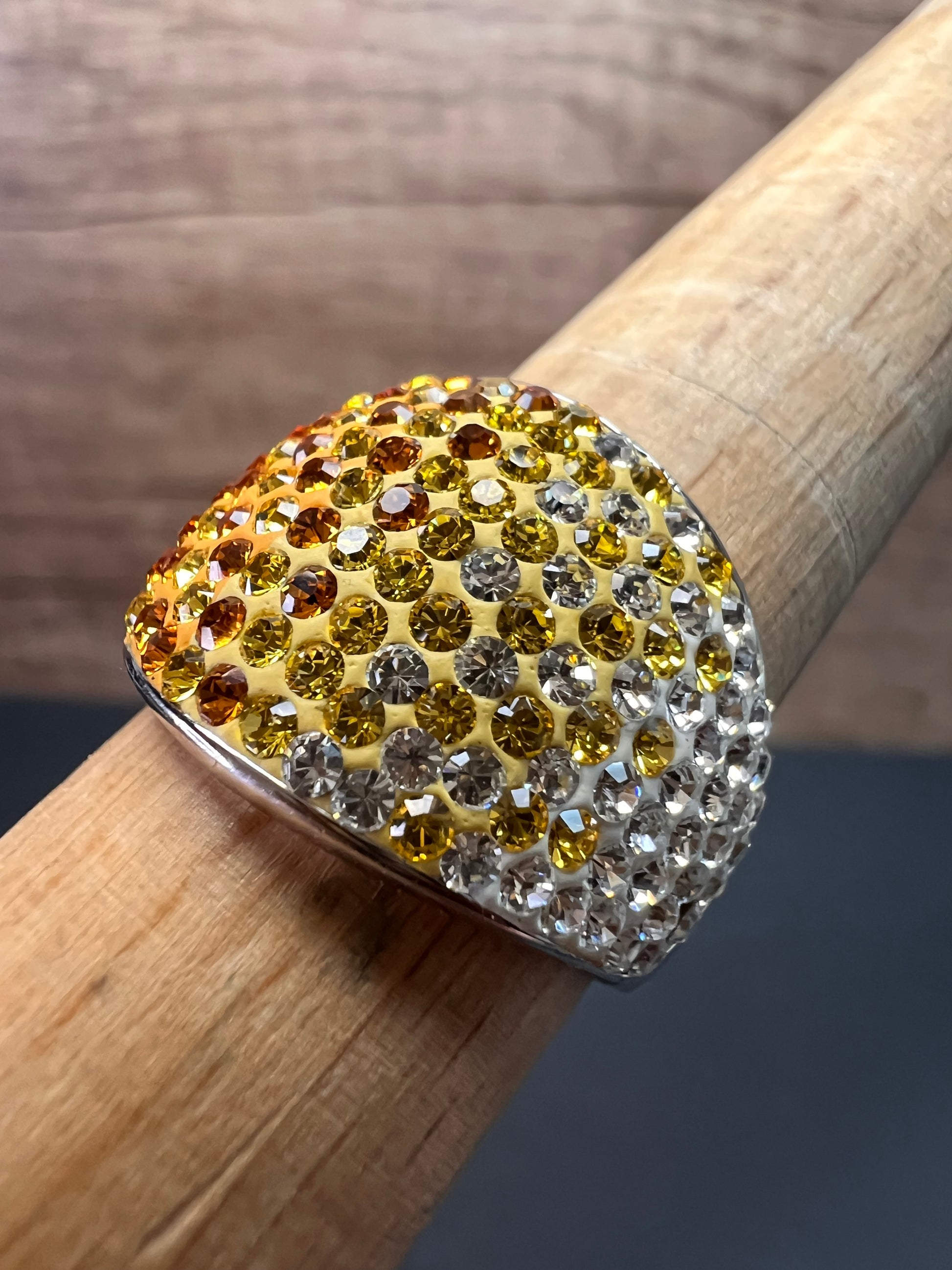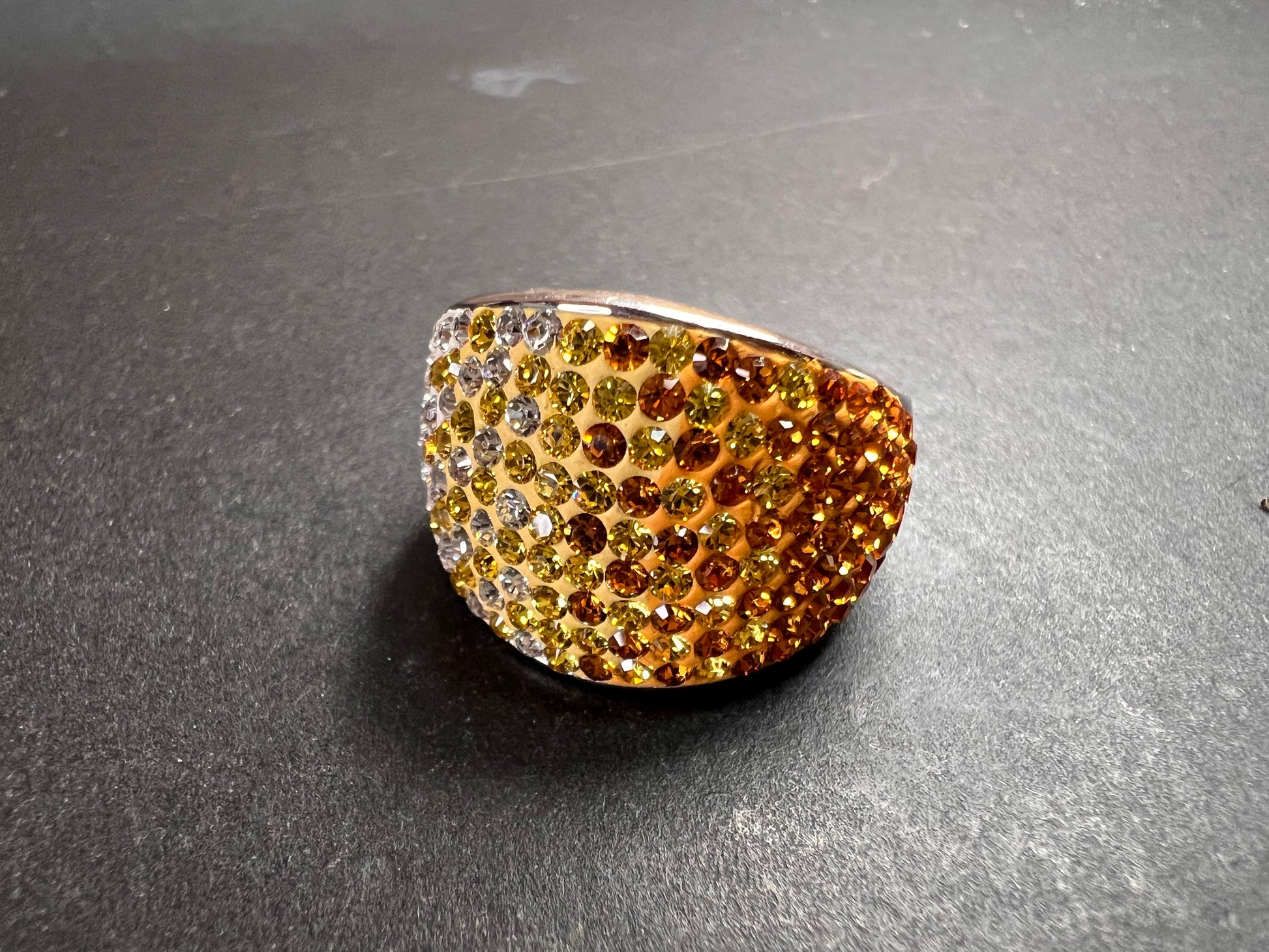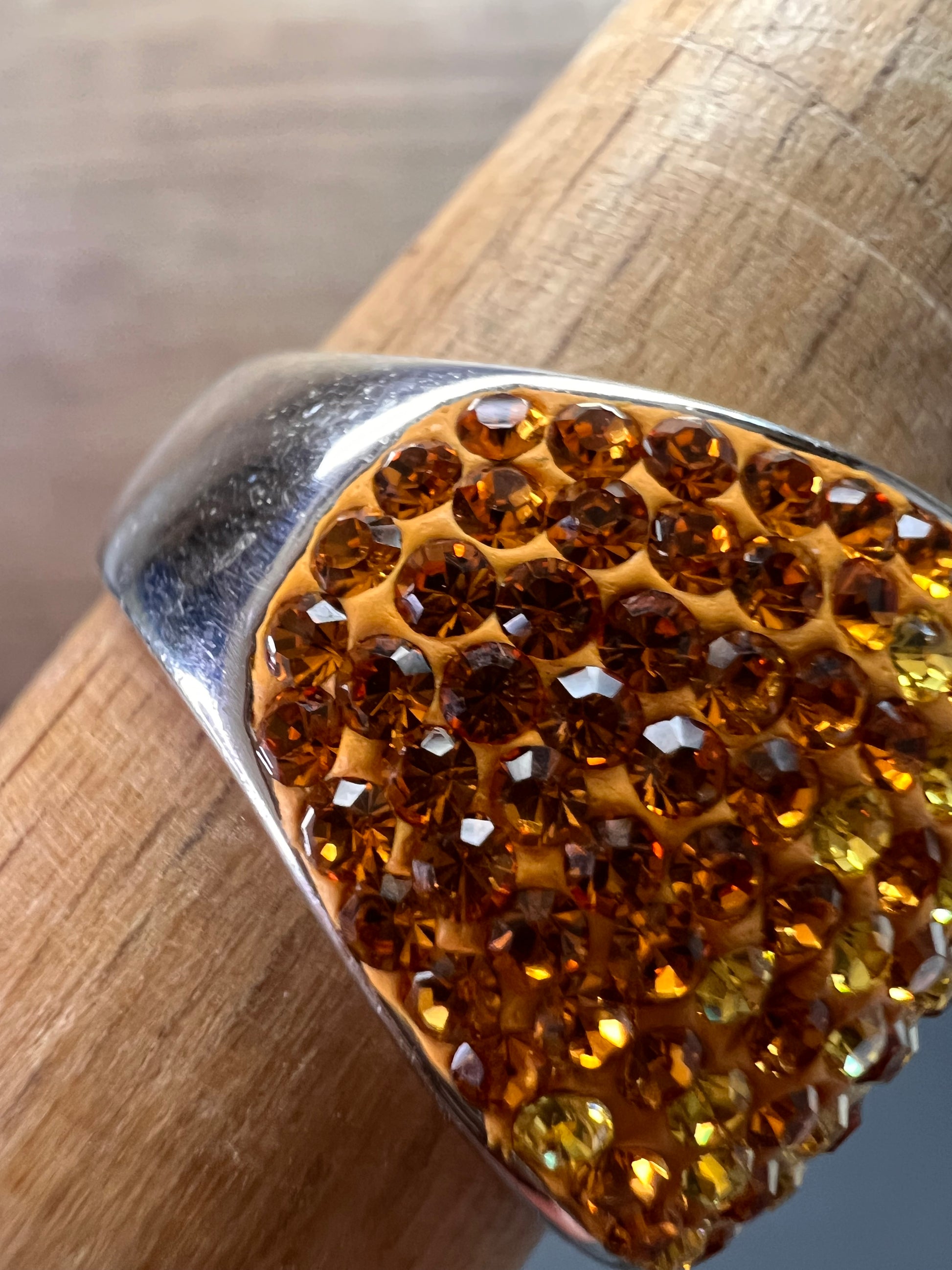 Signed Chelsea Taylor designer sterling silver ring with encrusted yellow ombré rhinestones. Size 8. Made in Thailand. Covered with an e coating to protect finish and stones. 925. Total weight is 7.94 grams. This is a sturdy, well made ring with a nice weight.