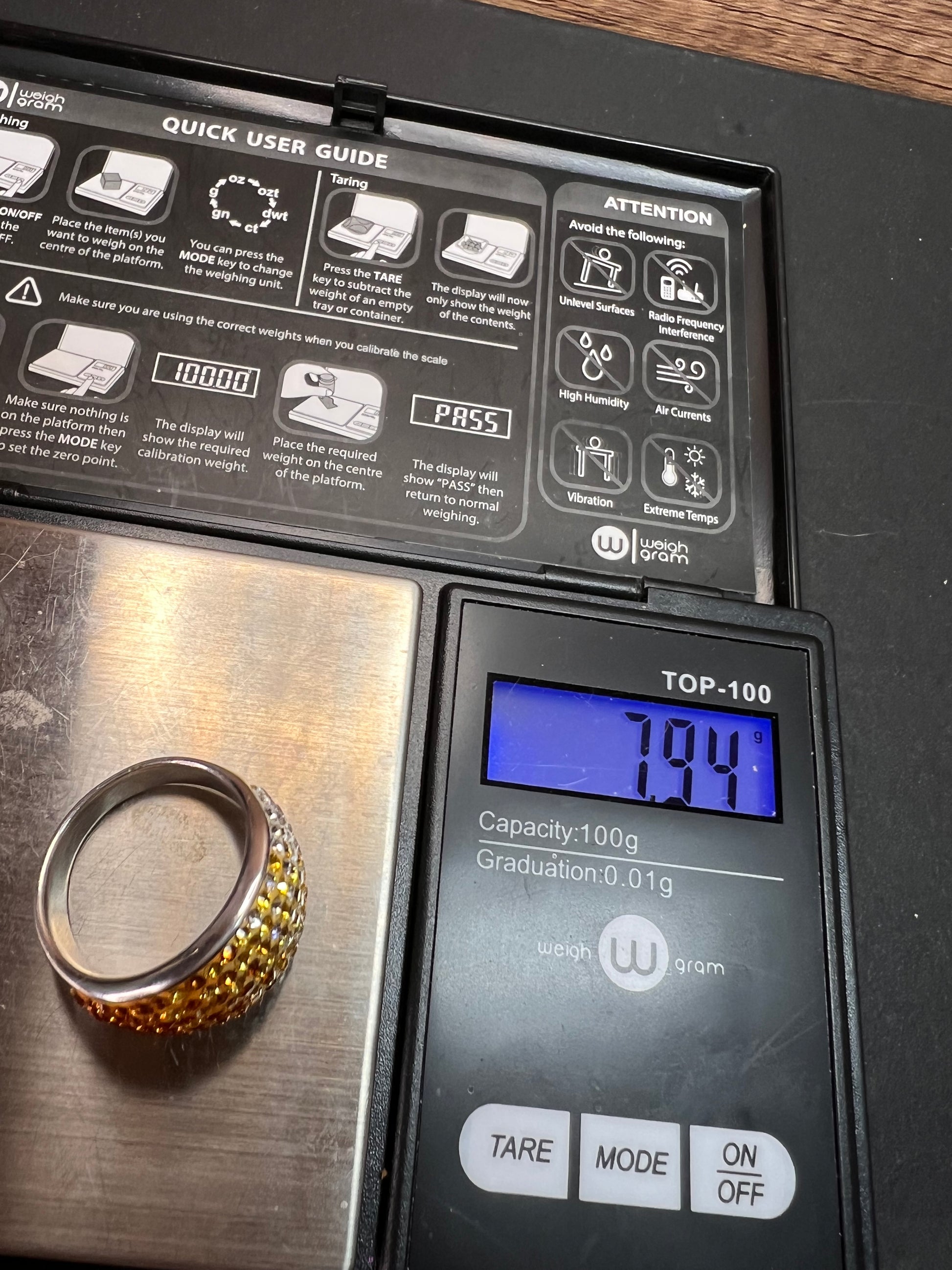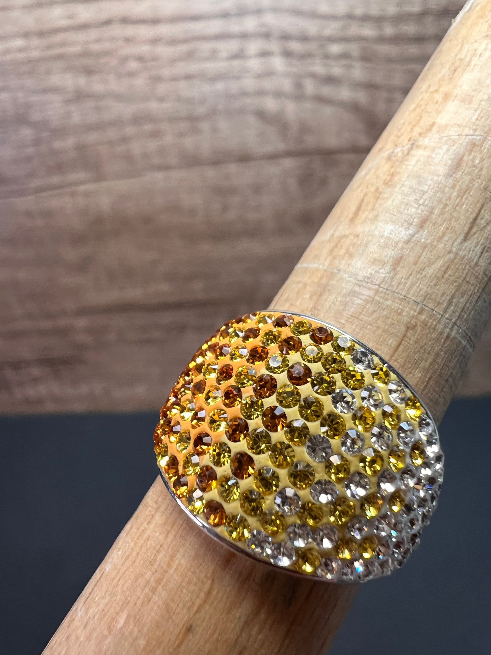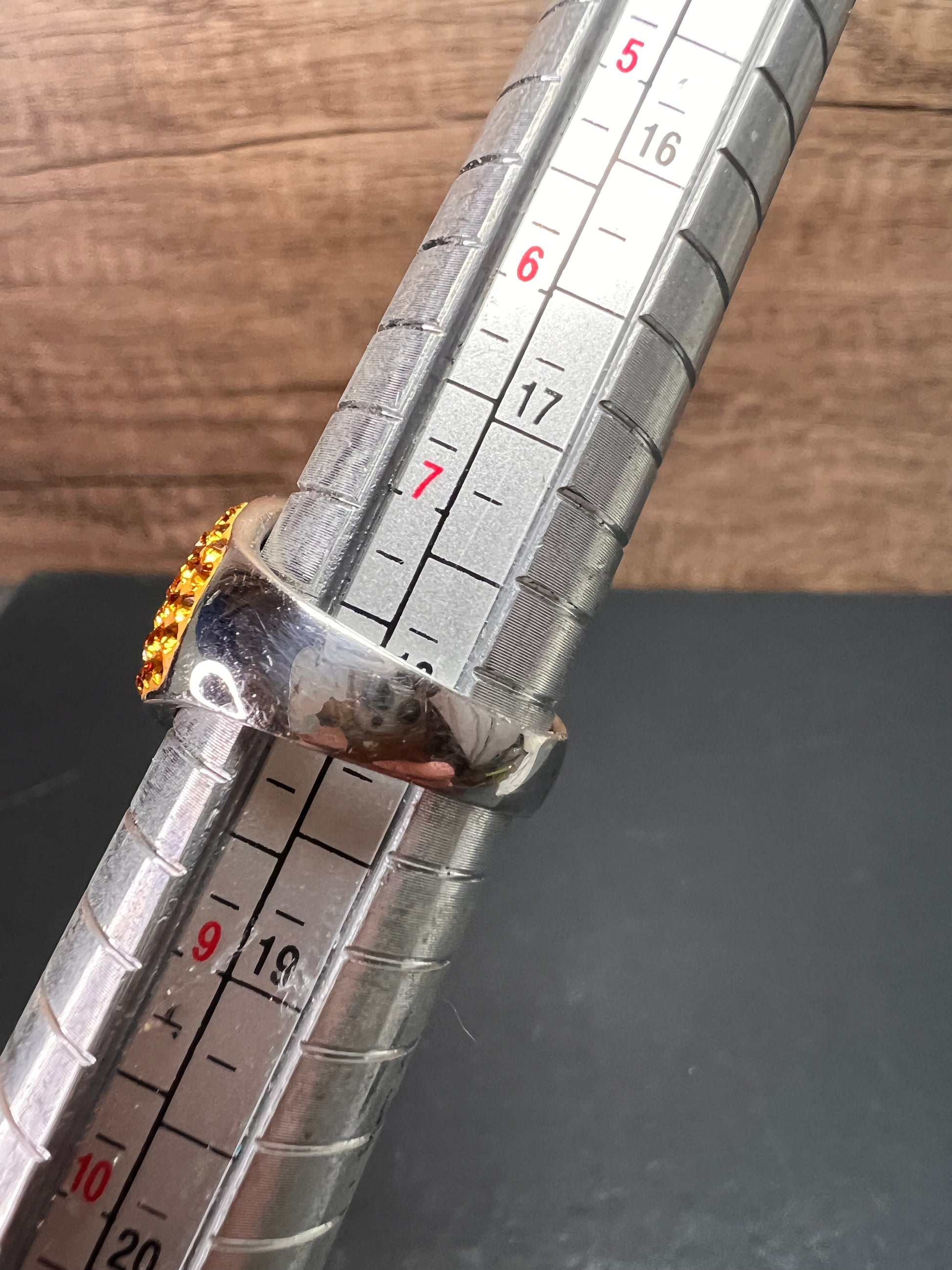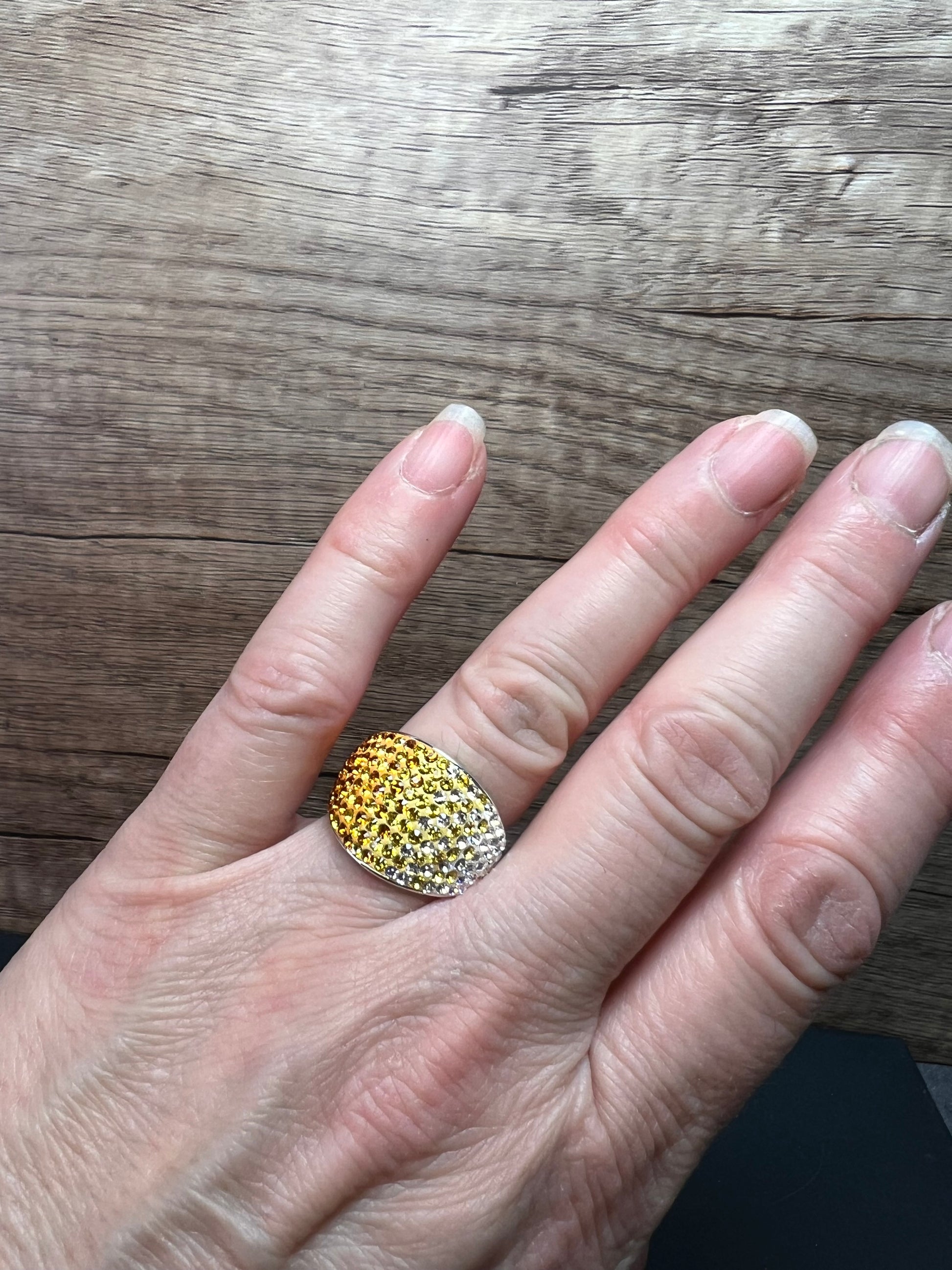 Signed Chelsea Taylor designer sterling silver ring with encrusted yellow ombré rhinestones. Size 8. Made in Thailand. Covered with an e coating to protect finish and stones. 925. Total weight is 7.94 grams. This is a sturdy, well made ring with a nice weight.