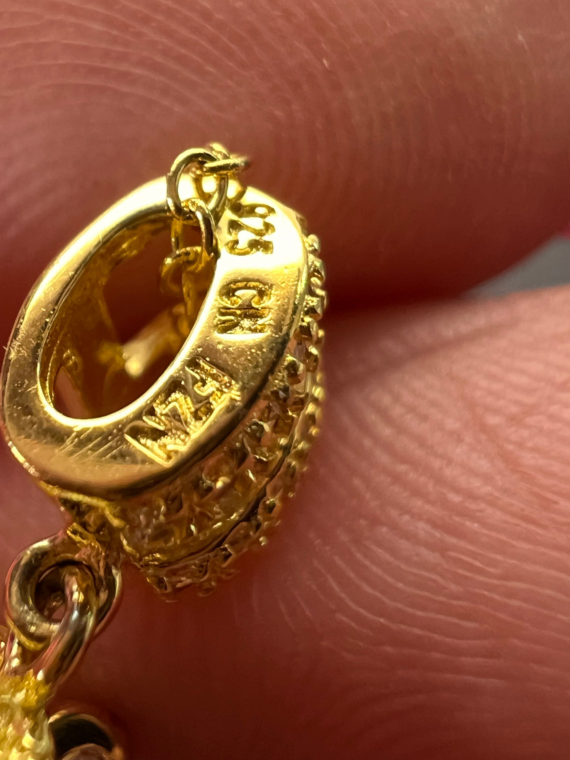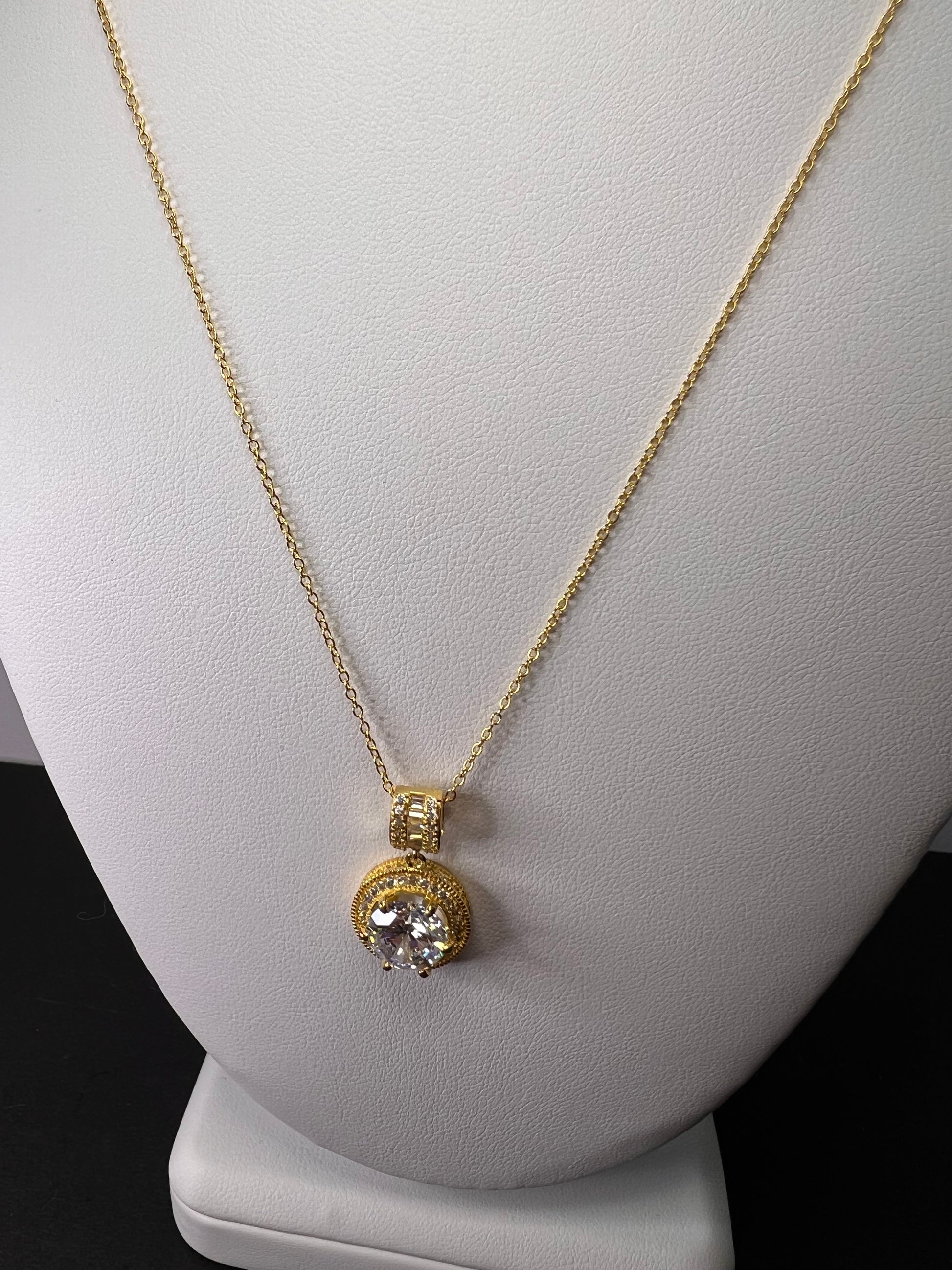 14-18k yellow gold plated over sterling silver. Chain measures 18 inches. White cubic zirconia stones throughout. Stamped FZN 925