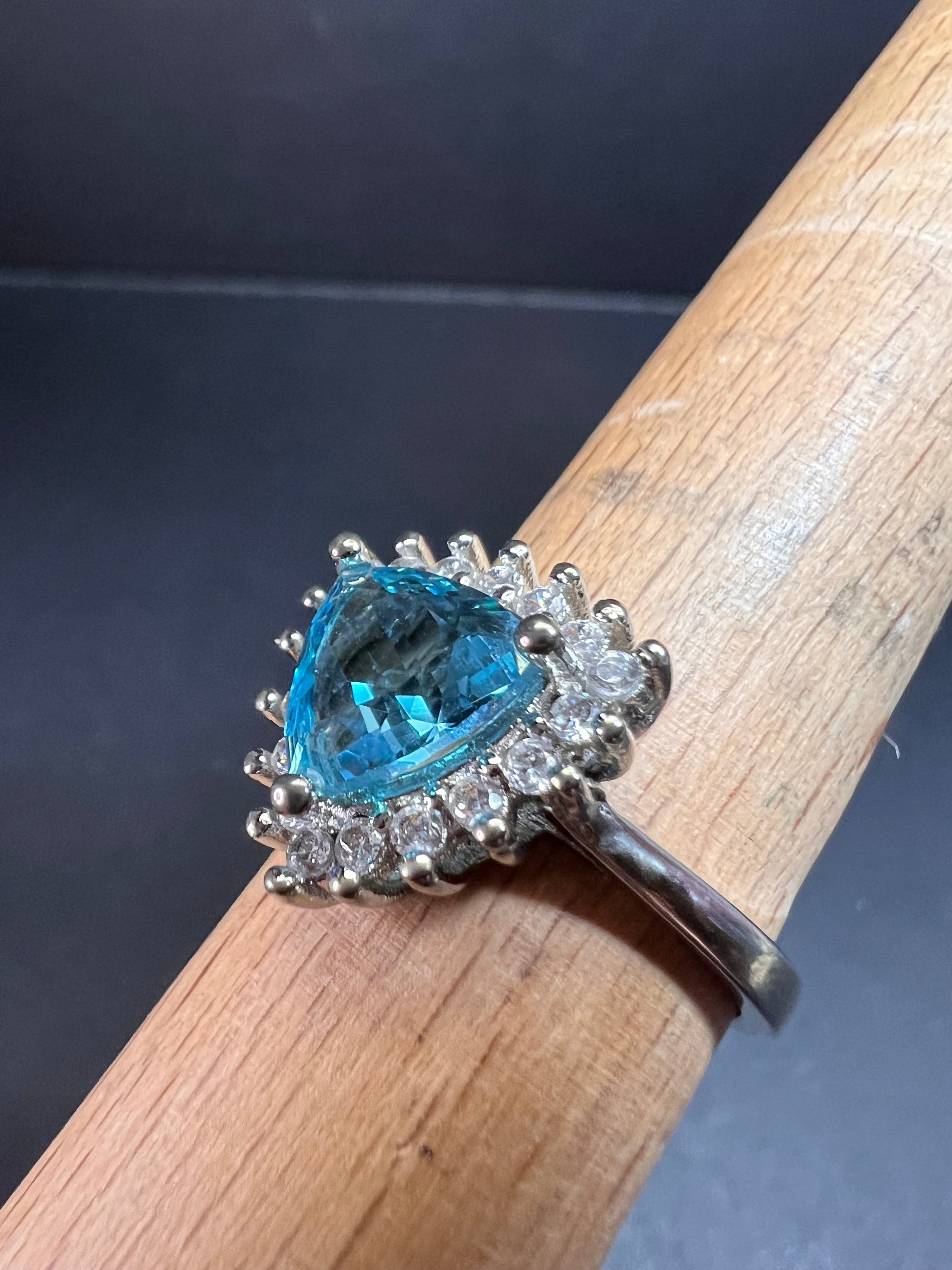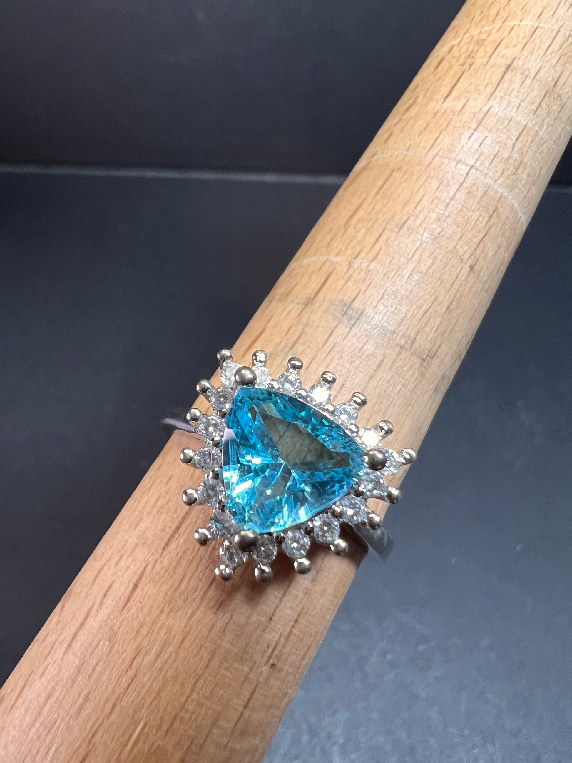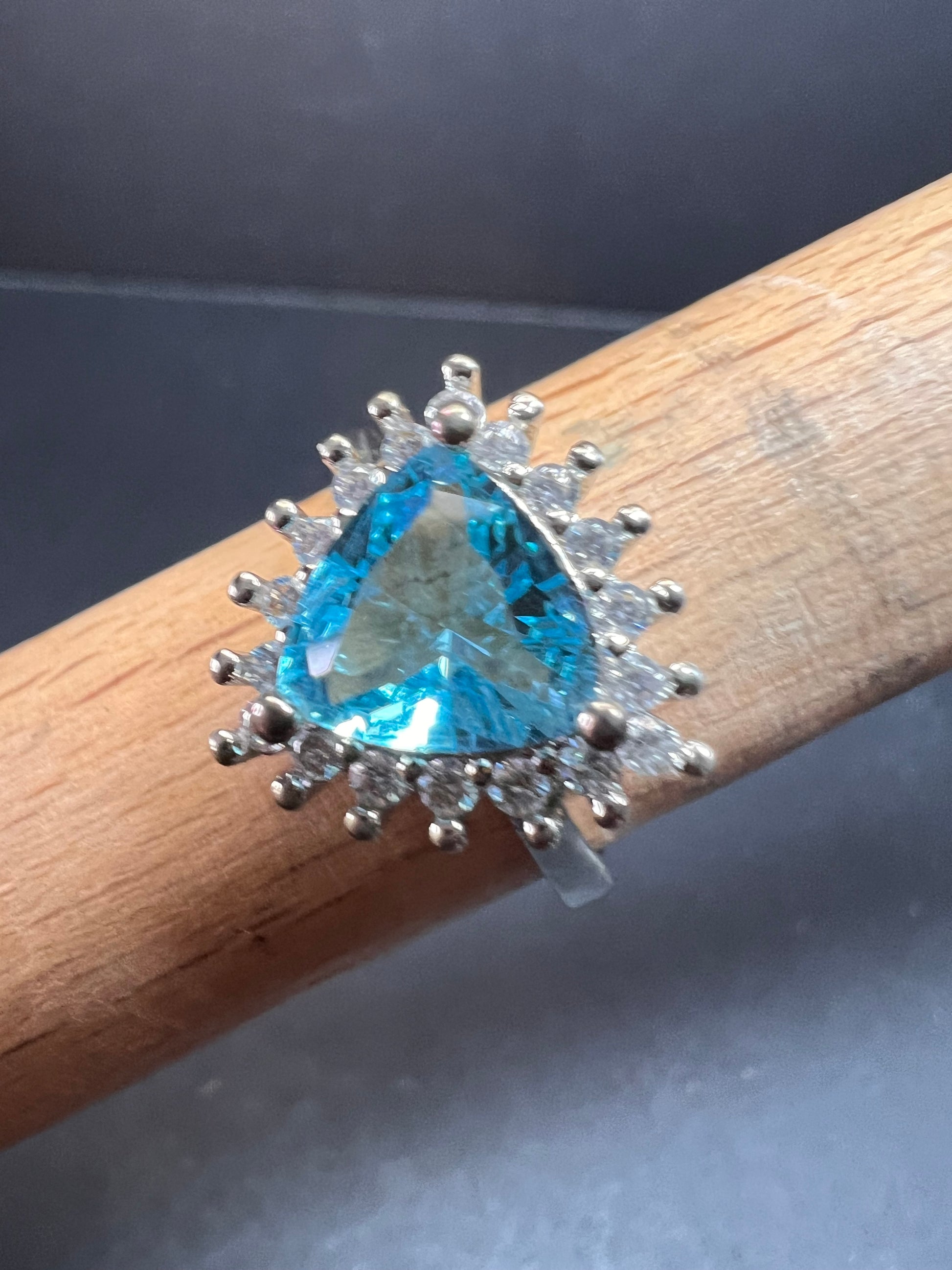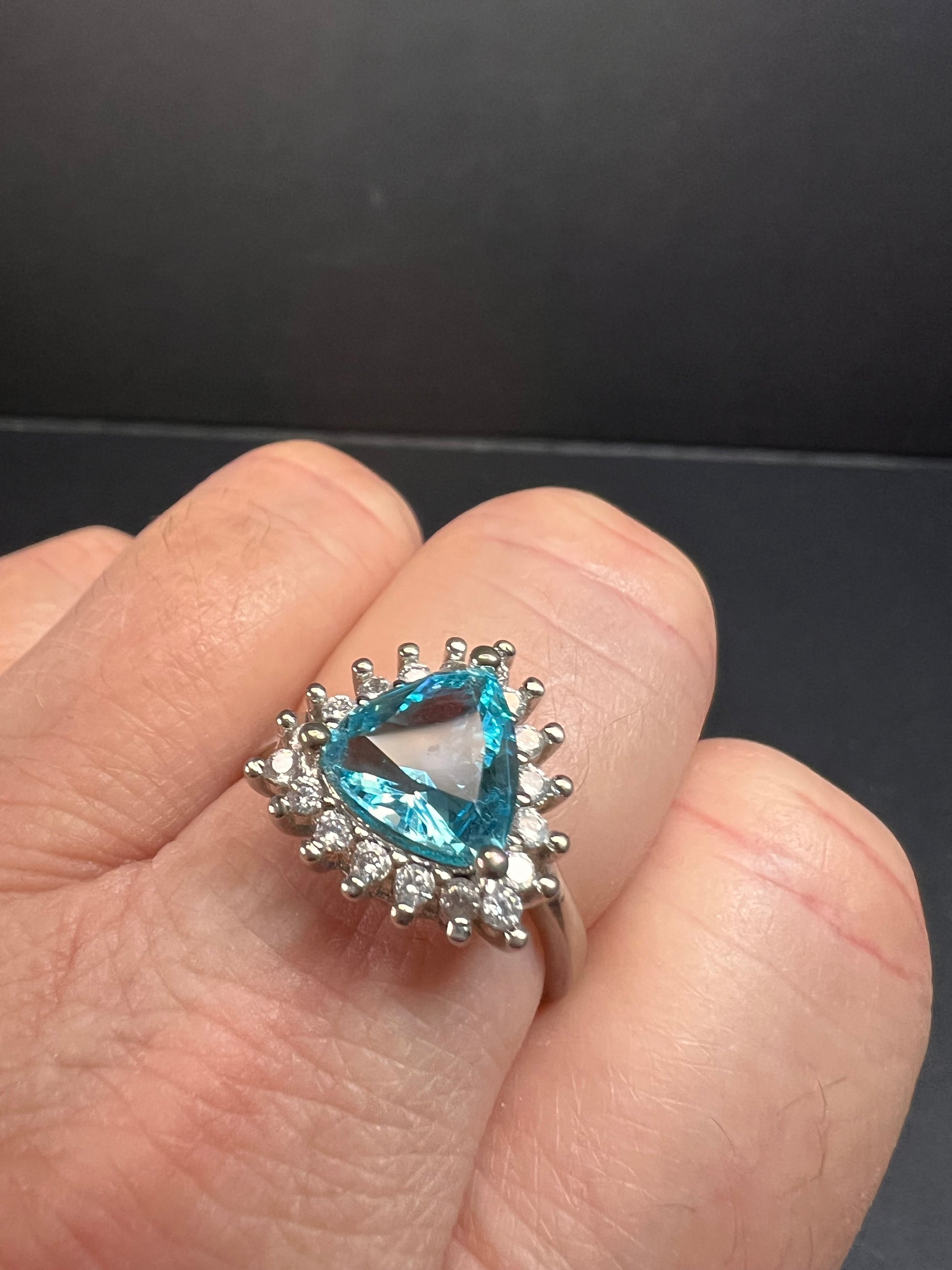 Sky blue trillium cut cubic zirconia gemstone surrounded by white / colorless cubic zirconia stones prong set in authentic 925 sterling silver that most likely has a rhodium plating. Measures a size 9. Blue stone flows green under UV light.