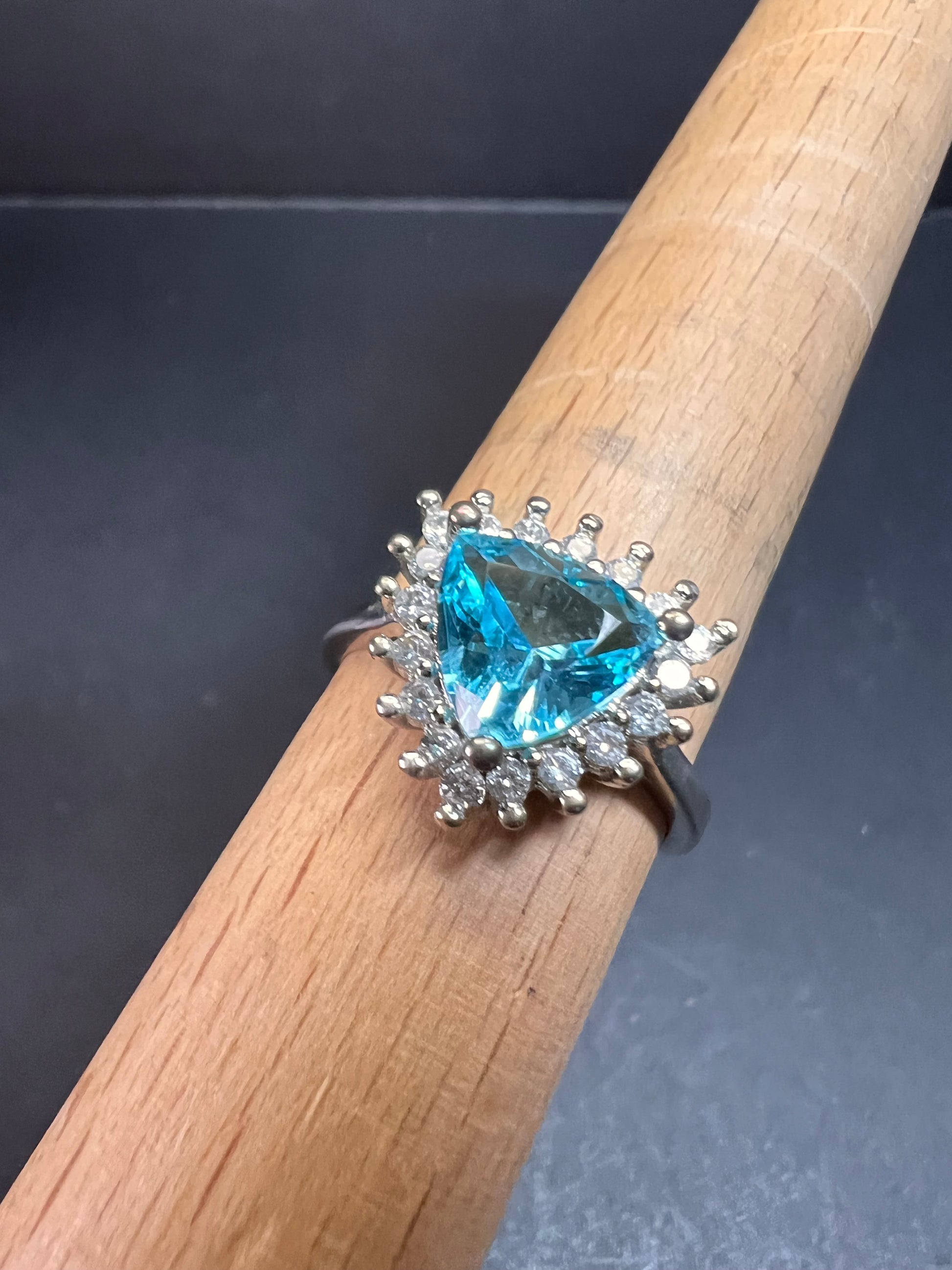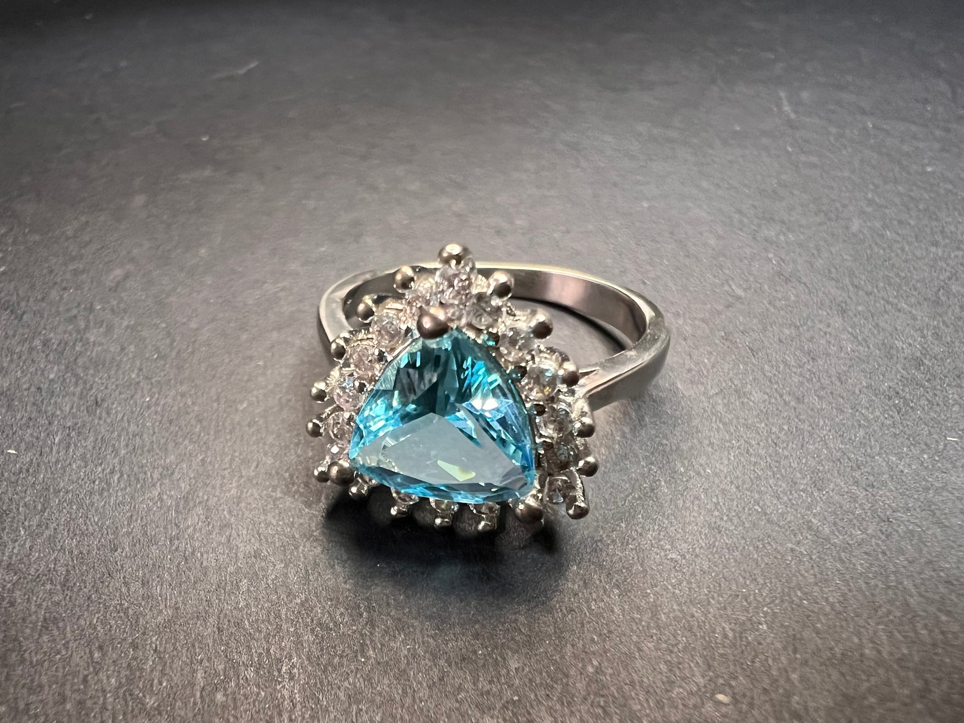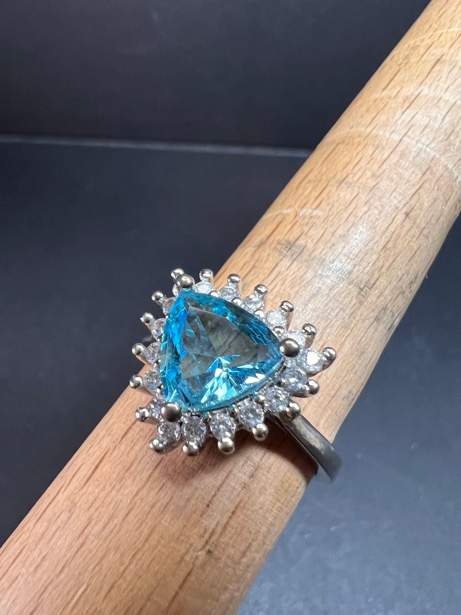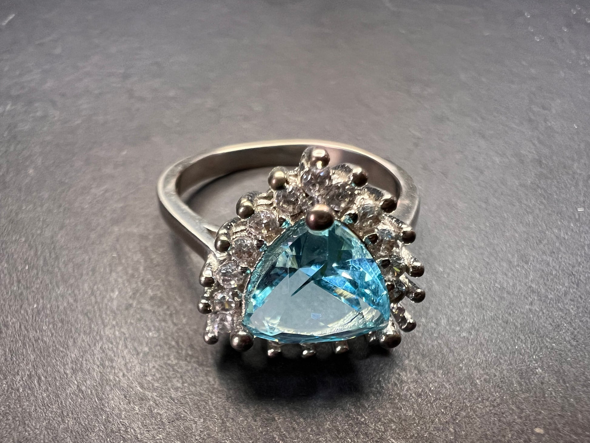 Sky blue trillium cut cubic zirconia gemstone surrounded by white / colorless cubic zirconia stones prong set in authentic 925 sterling silver that most likely has a rhodium plating. Measures a size 9. Blue stone flows green under UV light.