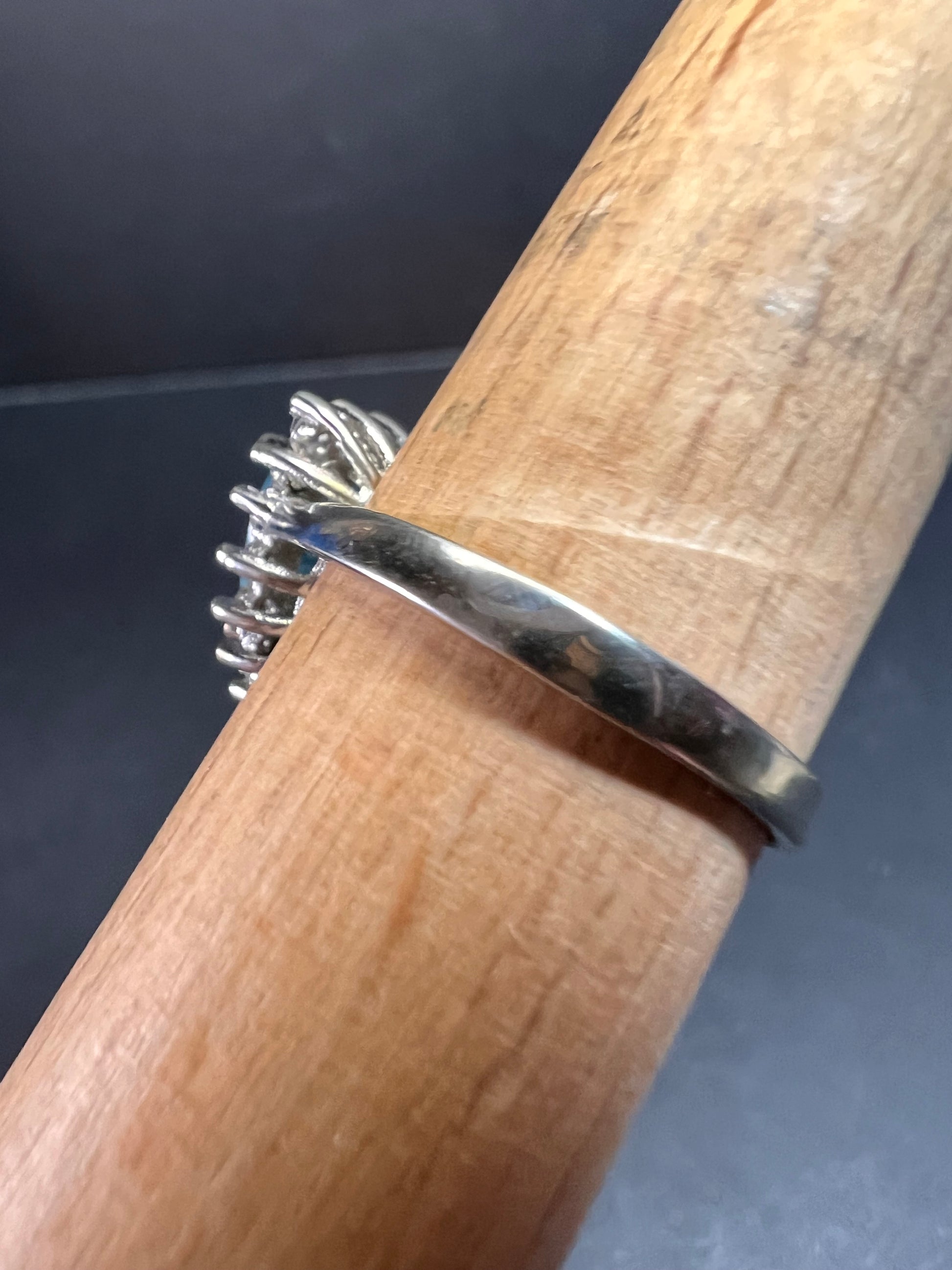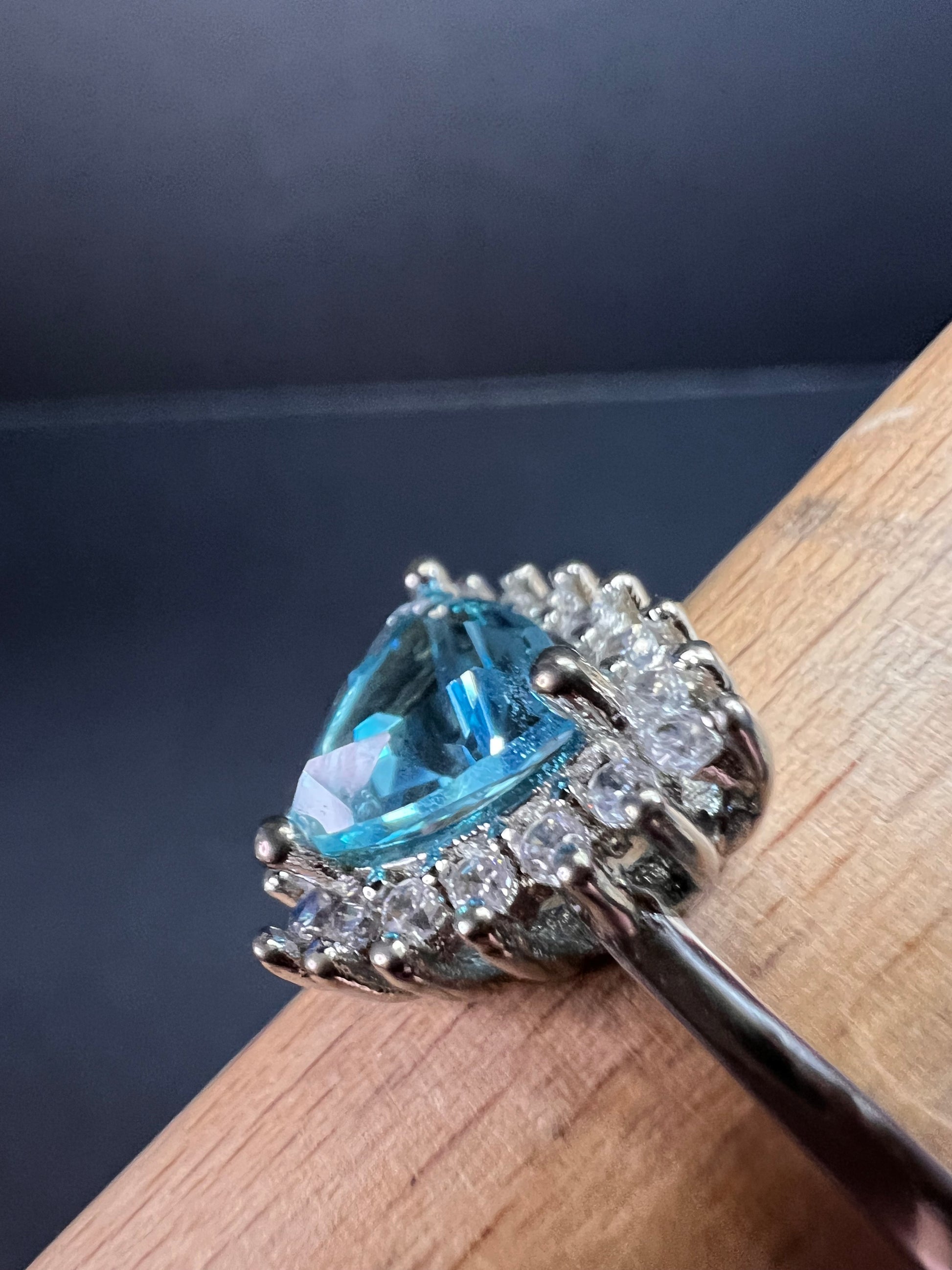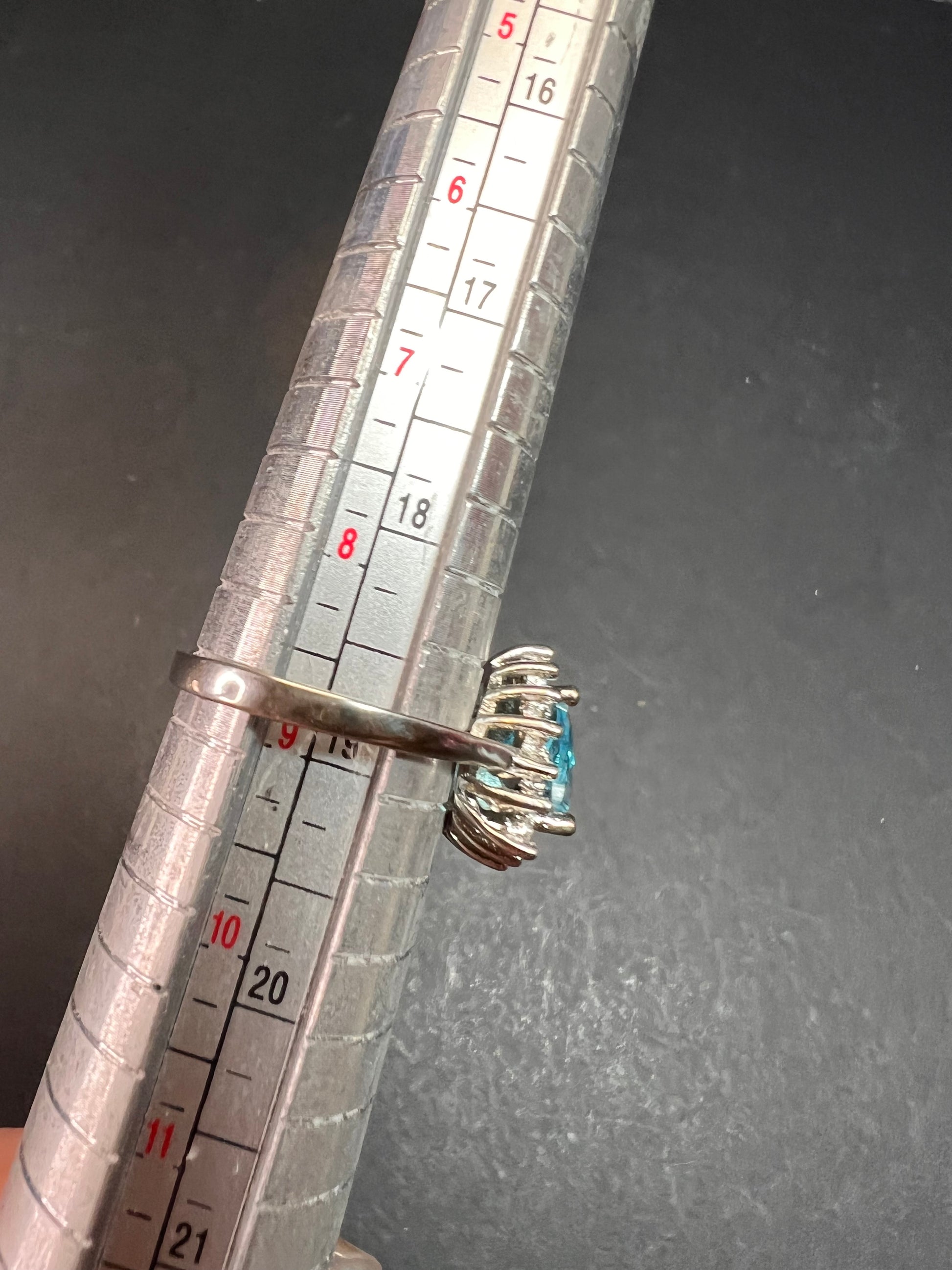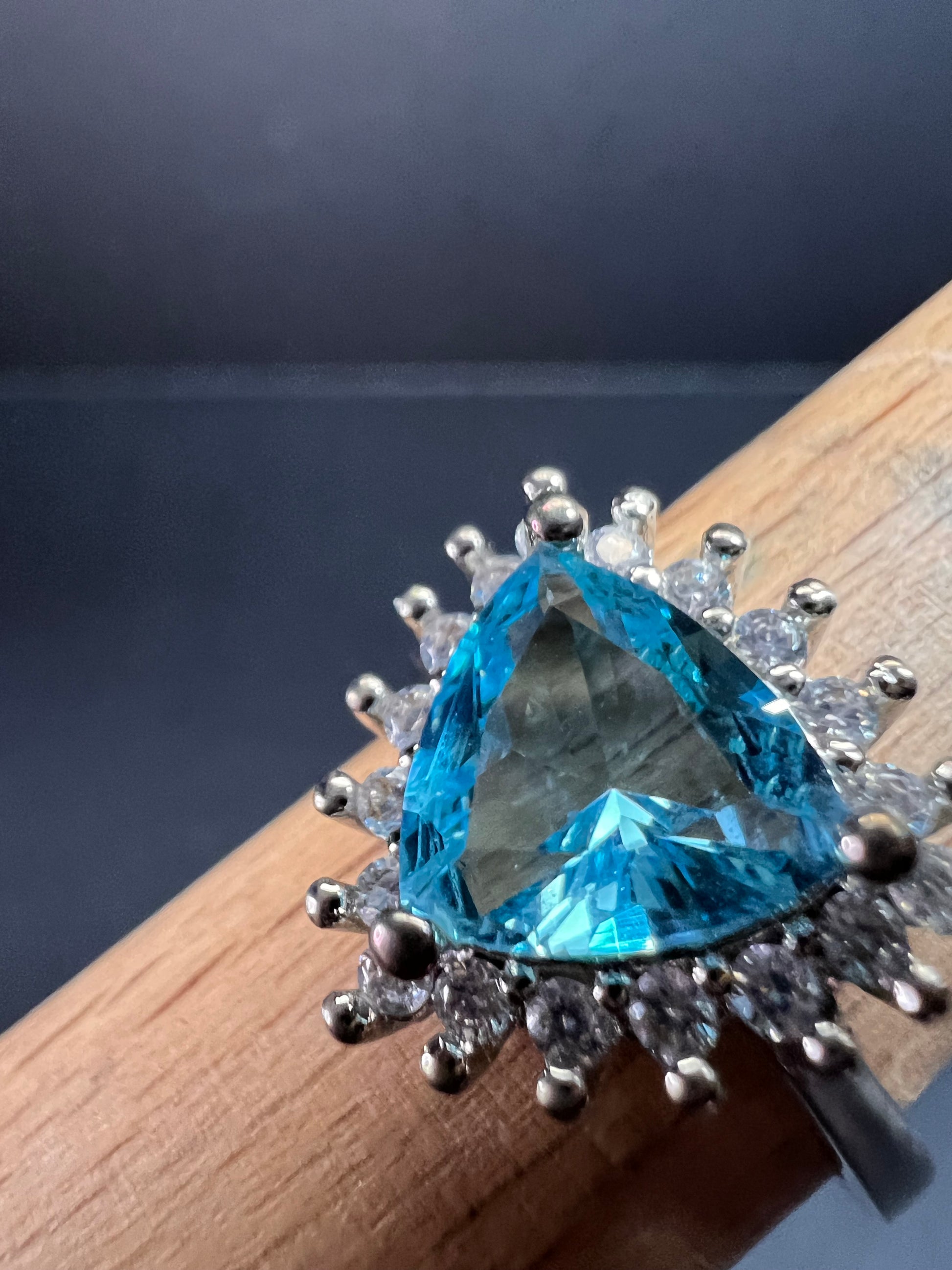 Sky blue trillium cut cubic zirconia gemstone surrounded by white / colorless cubic zirconia stones prong set in authentic 925 sterling silver that most likely has a rhodium plating. Measures a size 9. Blue stone flows green under UV light.