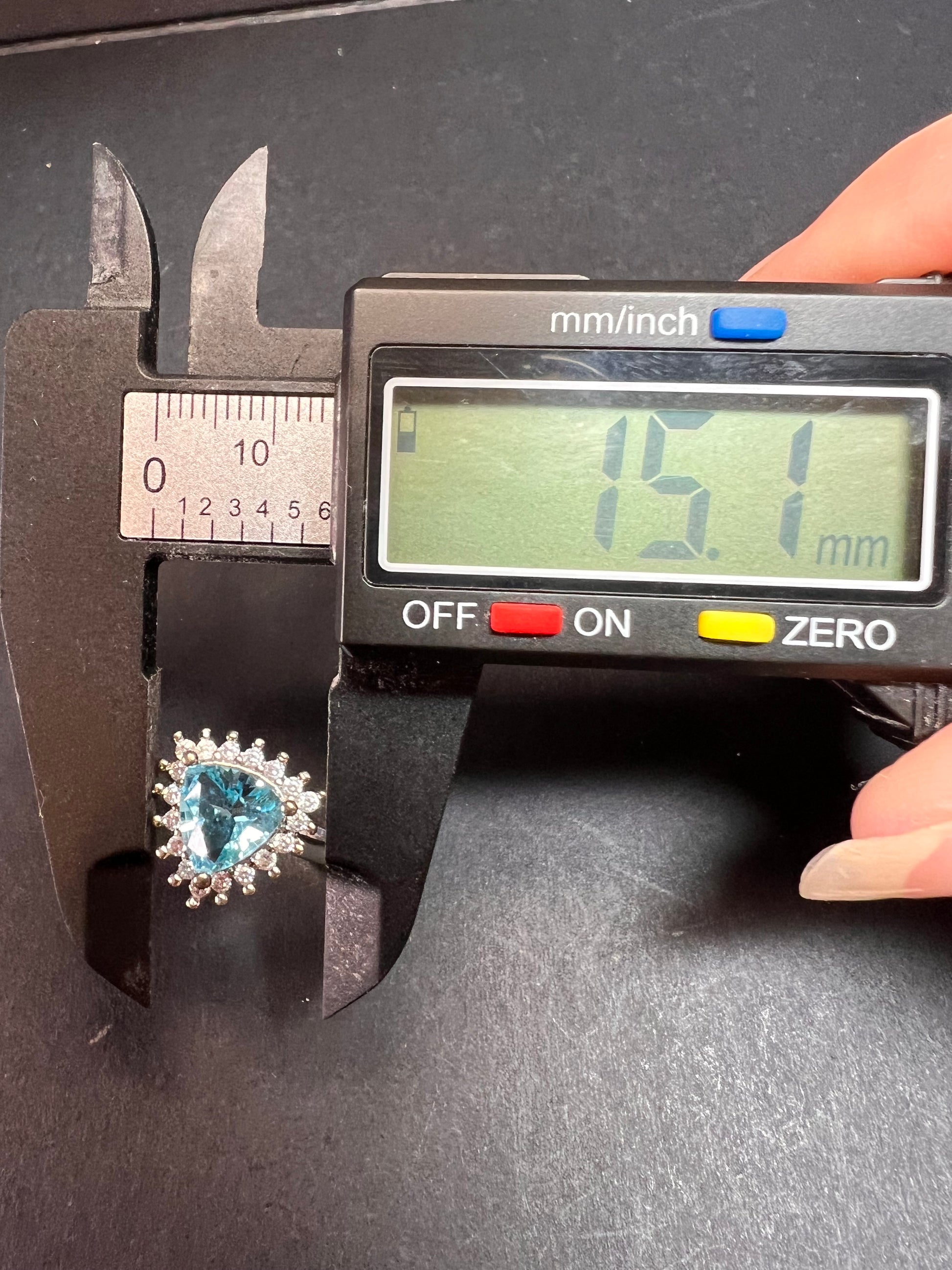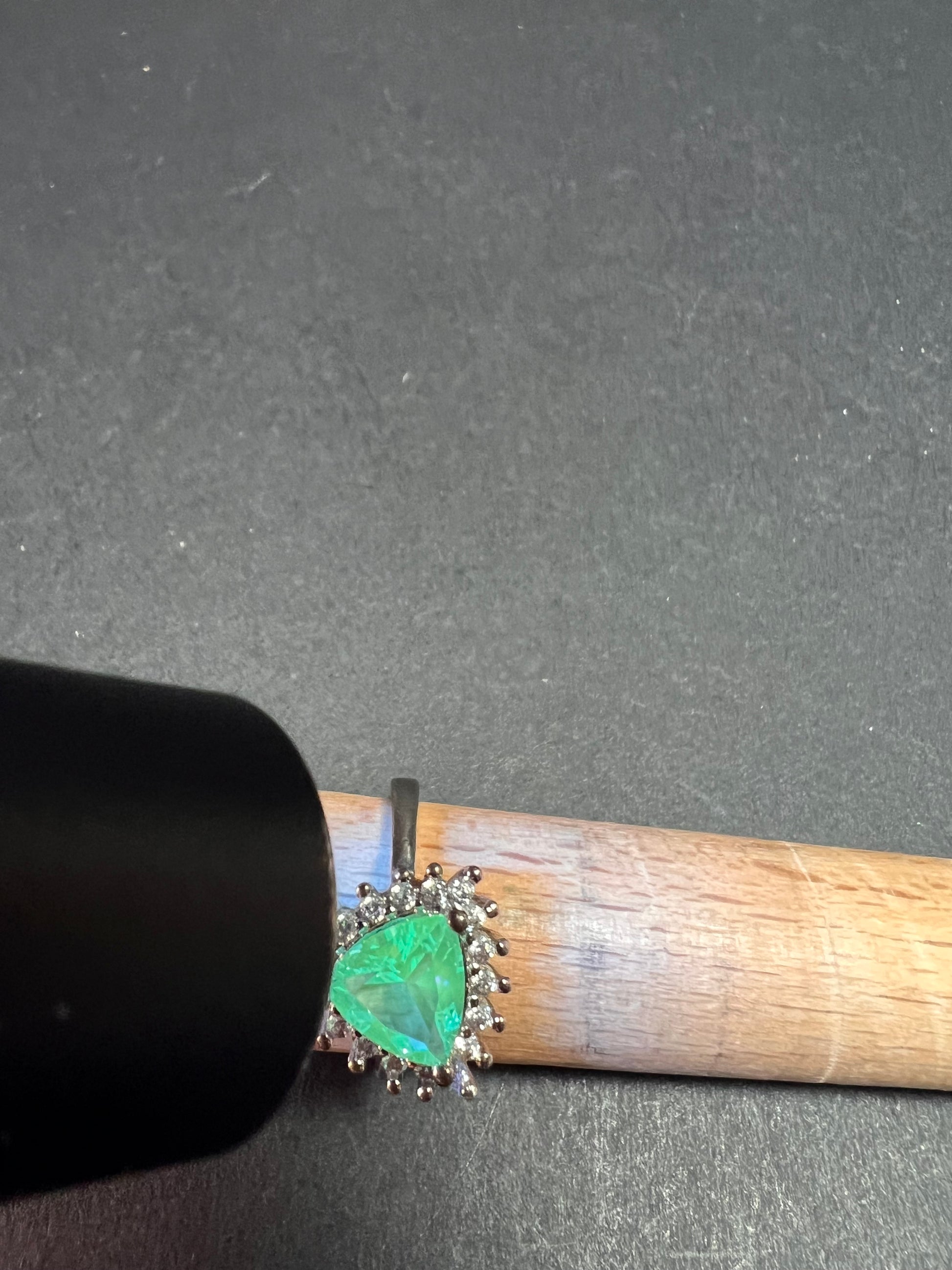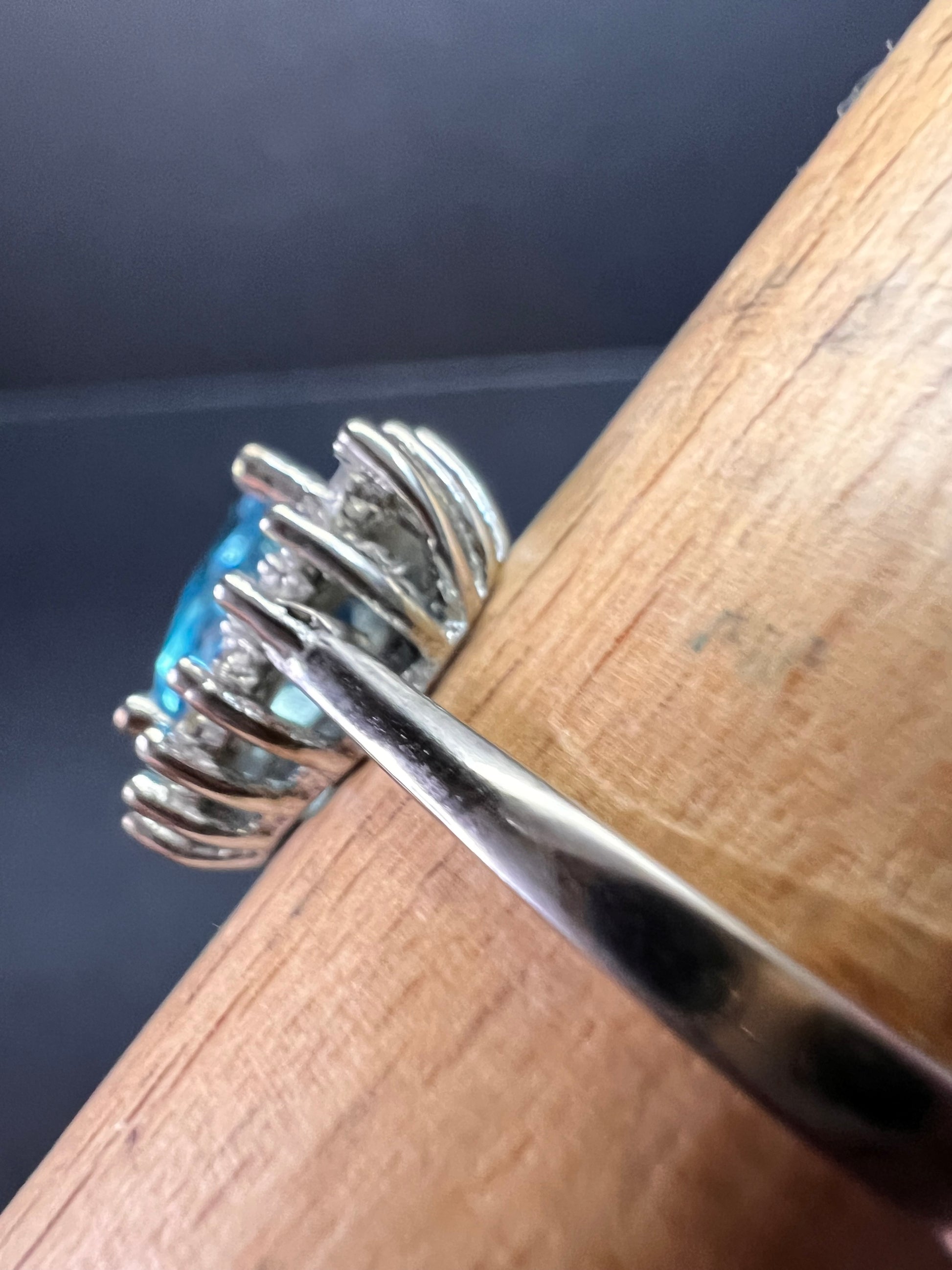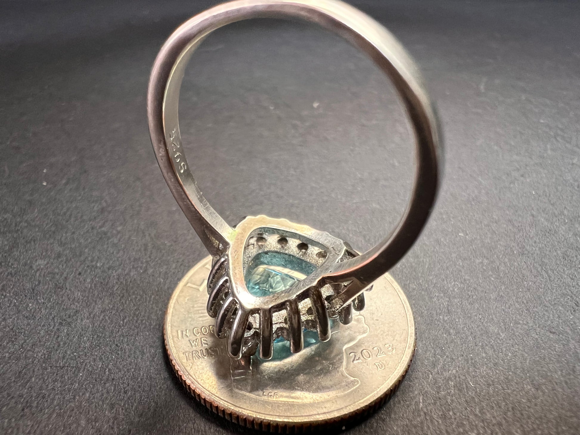 Sky blue trillium cut cubic zirconia gemstone surrounded by white / colorless cubic zirconia stones prong set in authentic 925 sterling silver that most likely has a rhodium plating. Measures a size 9. Blue stone flows green under UV light.
