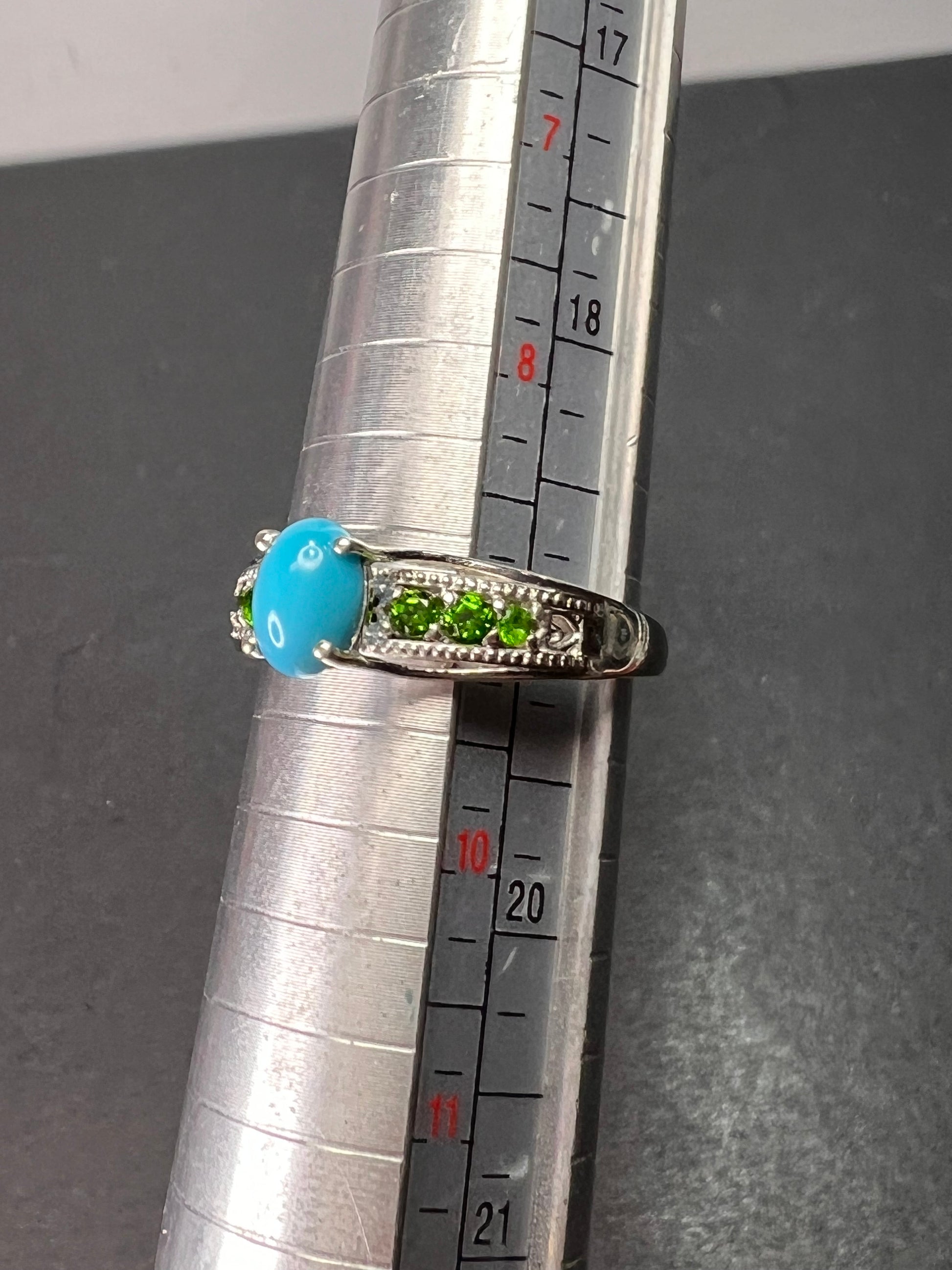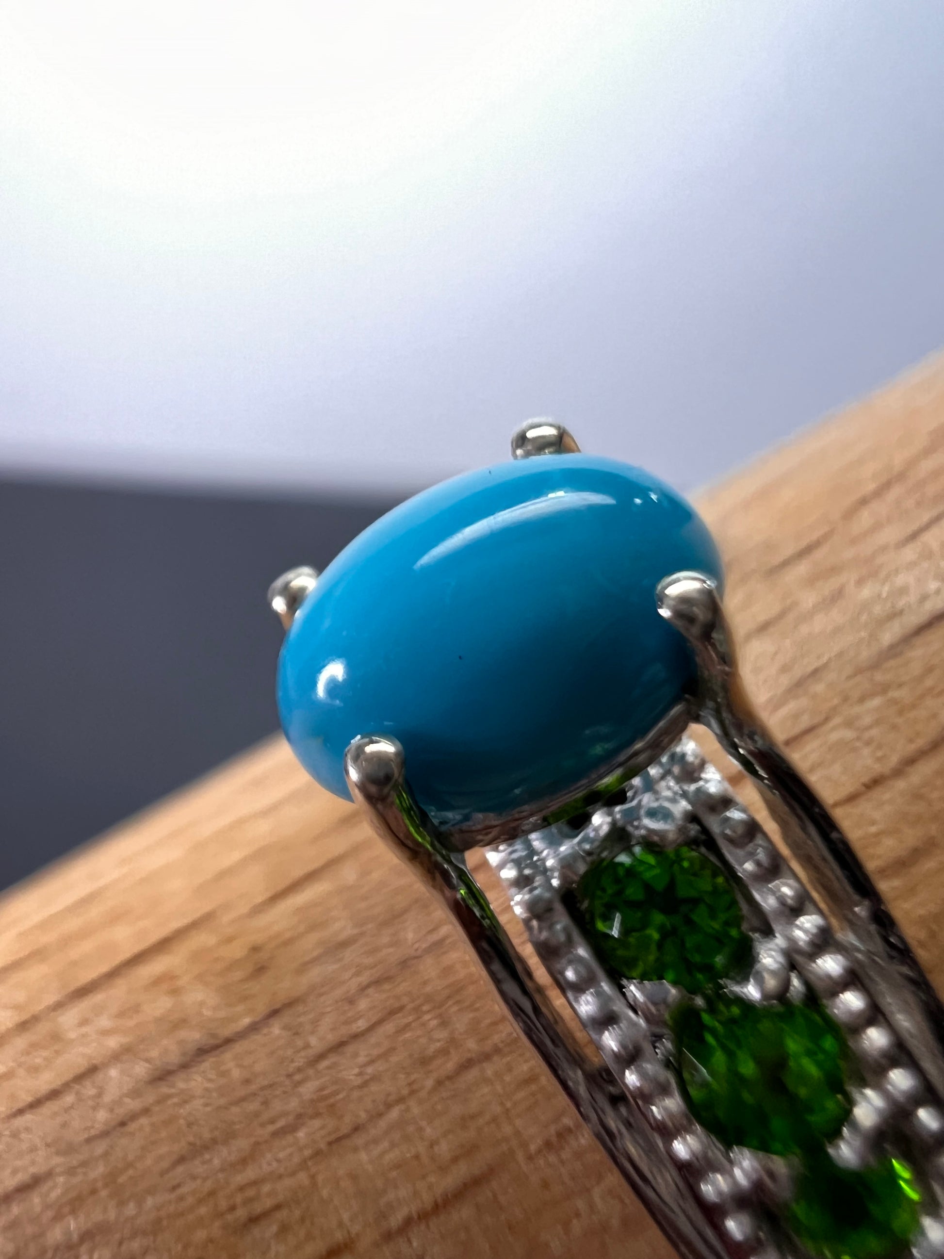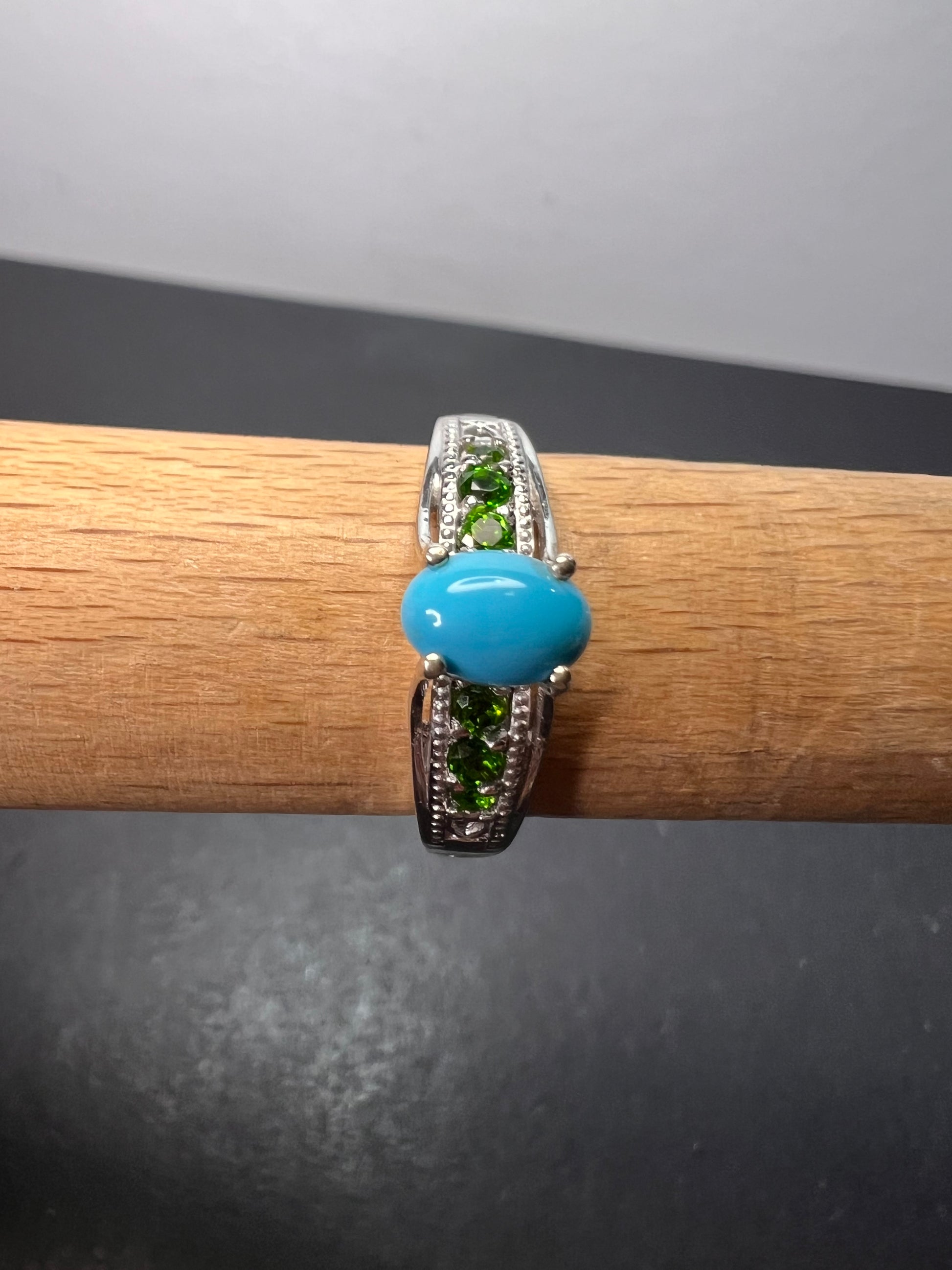 Genuine sleeping beauty turquoise and green Russian chrome diopside gemstones set in a rhodium plated over sterling silver prong setting. Turquoise has been stabilized and treated for color. Size 9