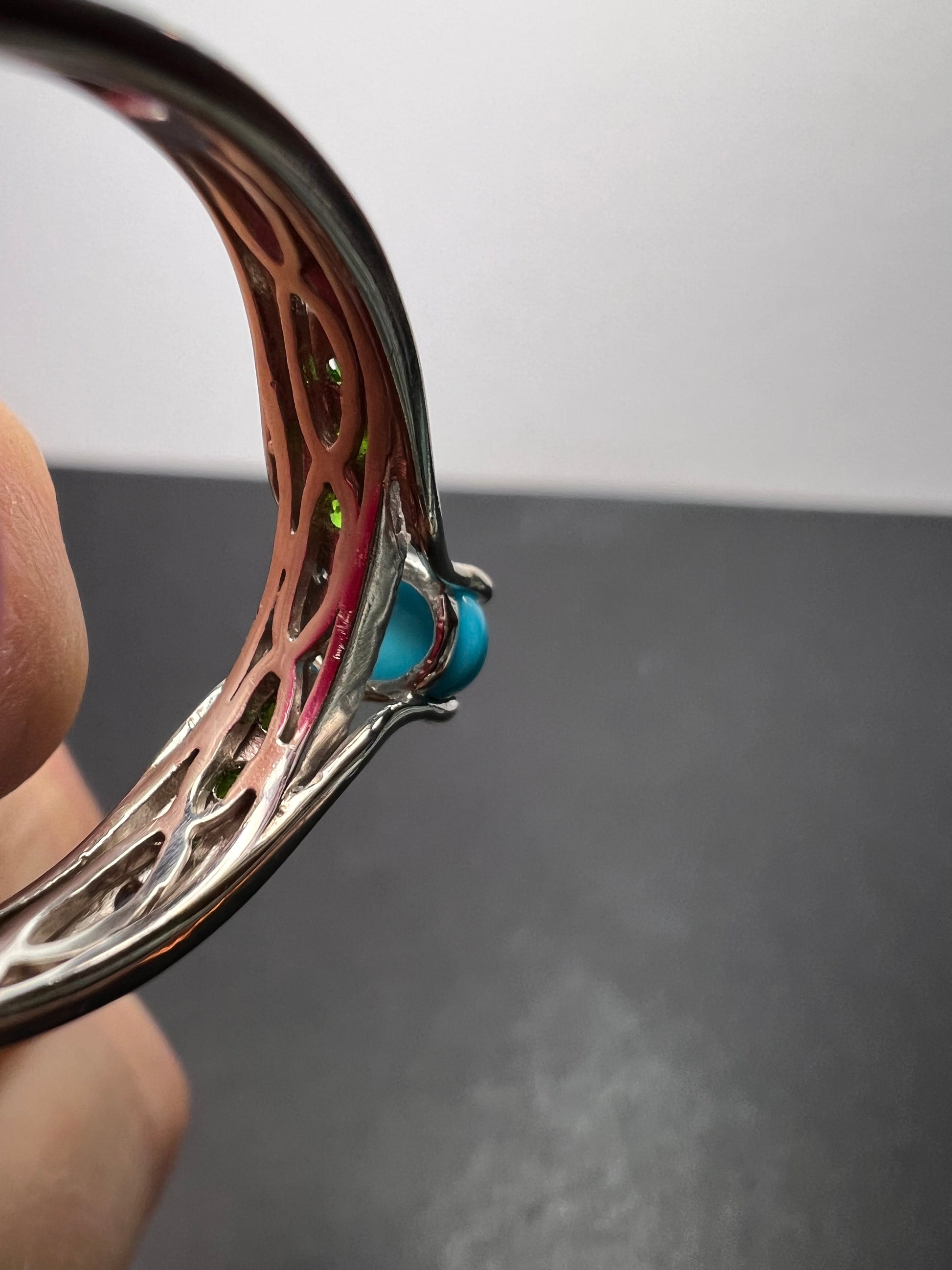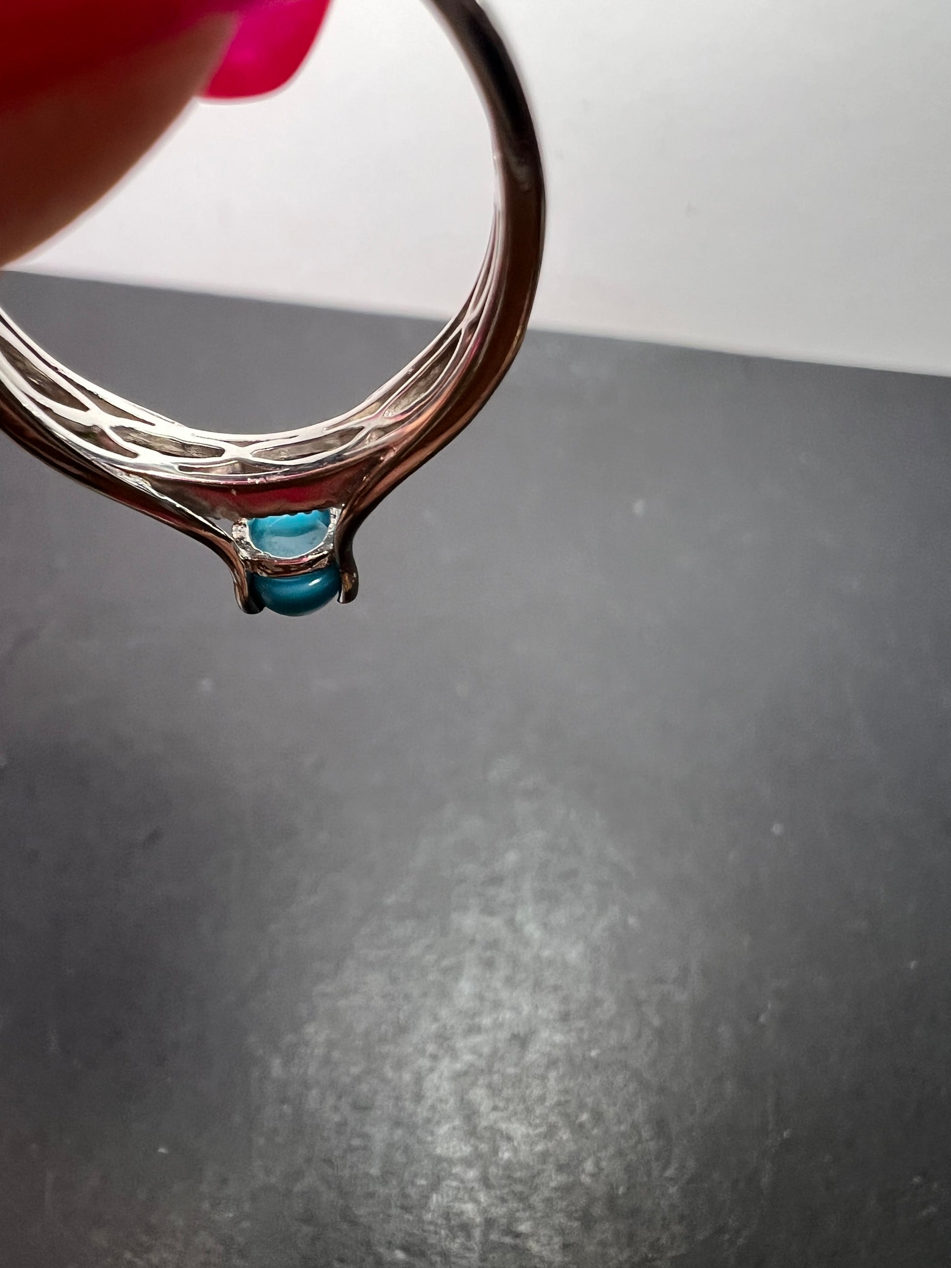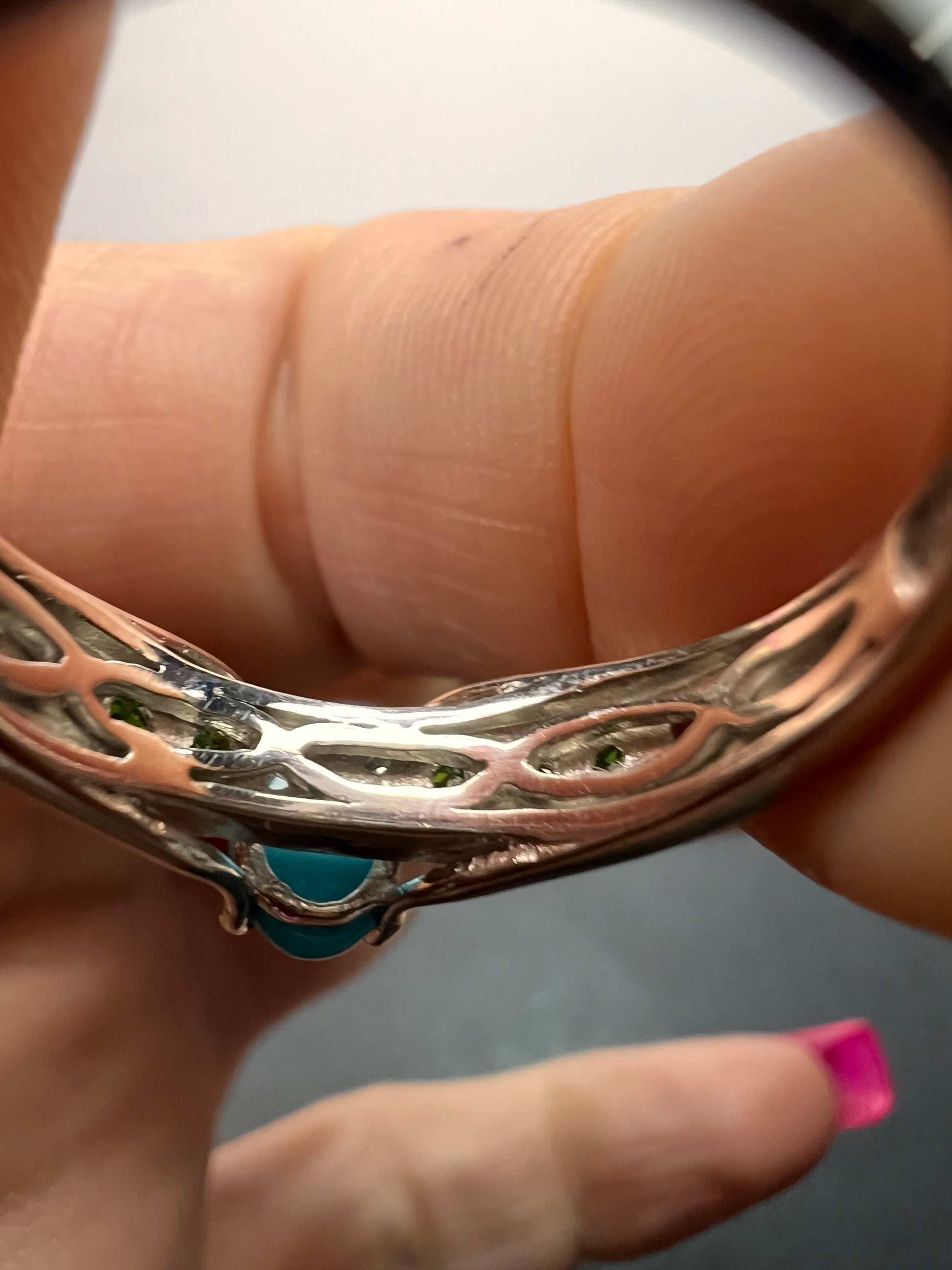 Genuine sleeping beauty turquoise and green Russian chrome diopside gemstones set in a rhodium plated over sterling silver prong setting. Turquoise has been stabilized and treated for color. Size 9