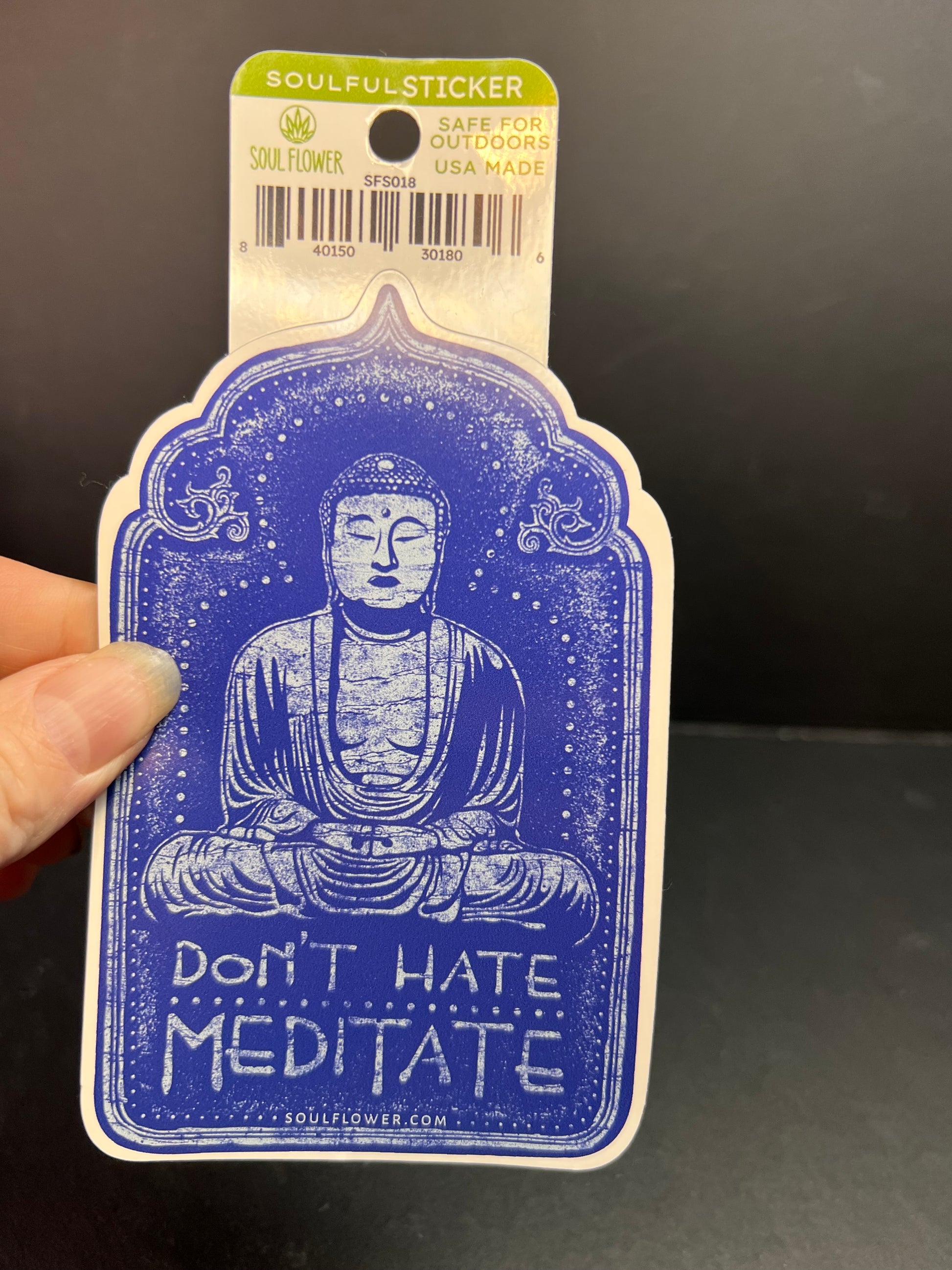 Soul Flower “Don’t Hate Meditate” vinyl sticker featuring a peaceful Buddha design in a deep indigo blue. Perfect for laptops, water bottles, journals, or car windows. Safe for outdoor use and made in the USA. Rounded top shape with a soft matte feel. Measures approx. 5 inches tall at the largest point. A quarter is shown on top of the sticker in photos for scale.