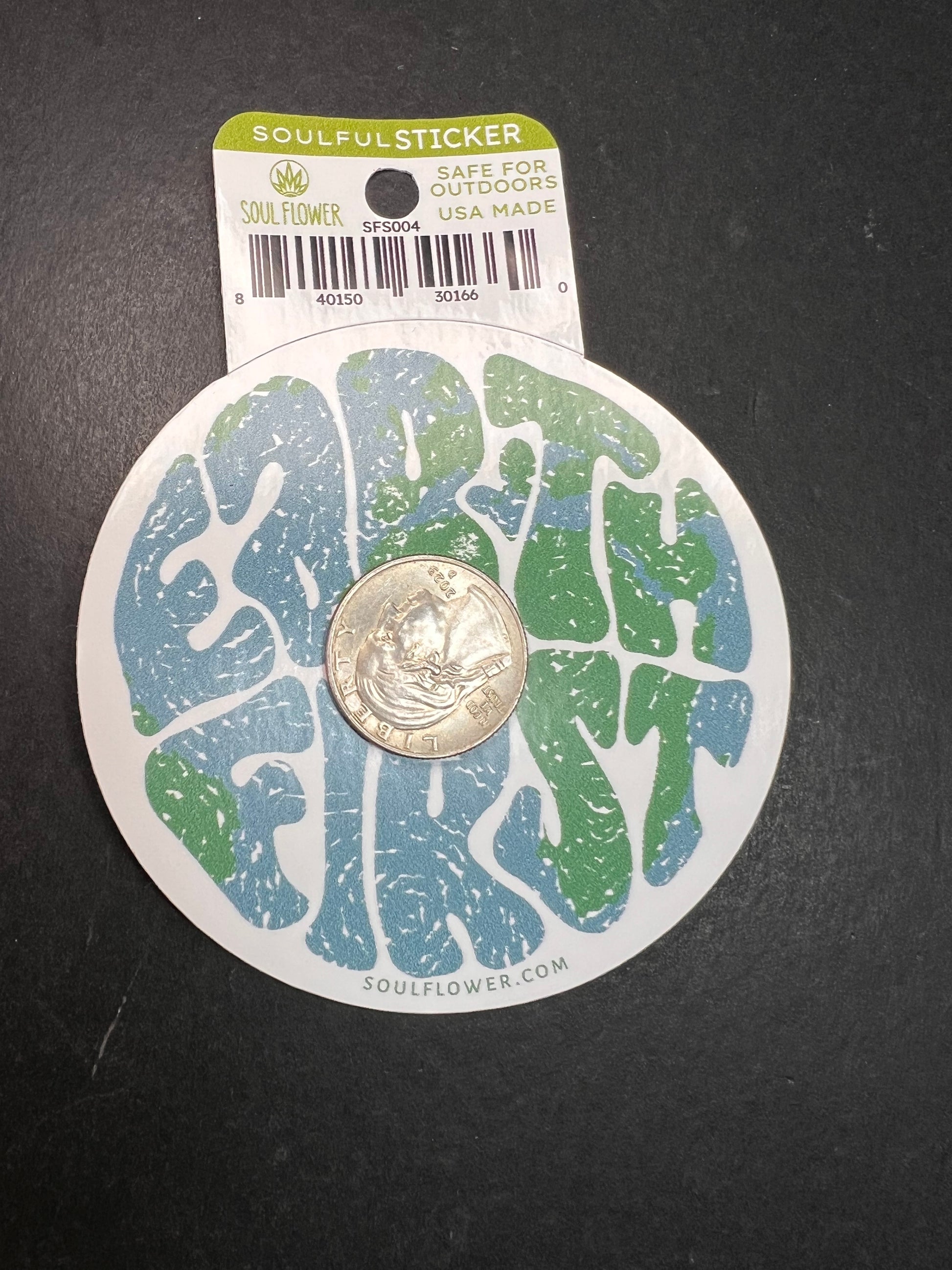 Earth First round Soul Flower sticker featuring a retro blue-and-green earth-pattern typography design. Printed on durable outdoor-safe vinyl with a smooth, soft-touch finish. Measures approx. 4 inches across. Shown with a quarter placed on top for scale. Great for water bottles, laptops, notebooks, car windows, and more.