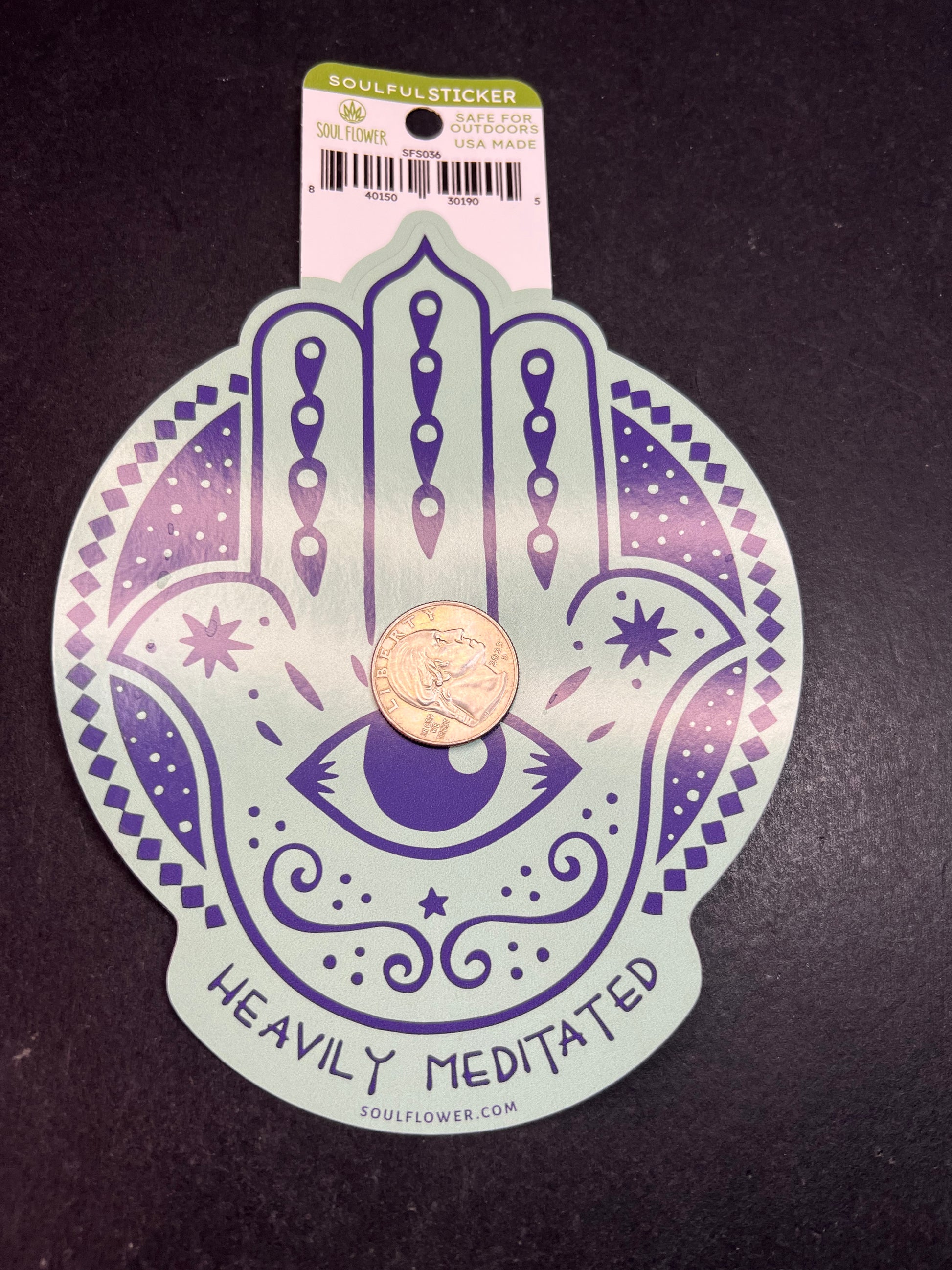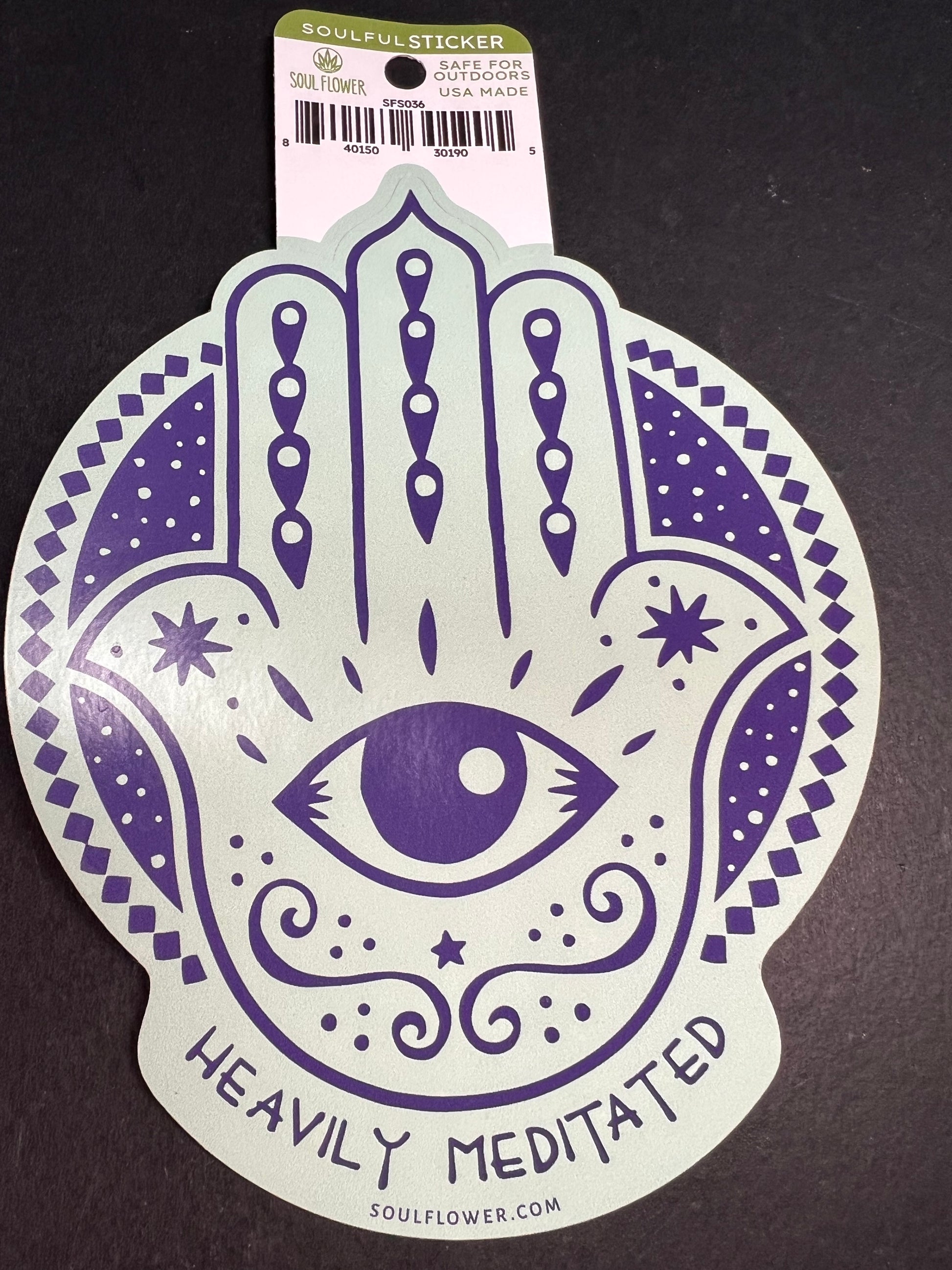 Heavily Meditated Soul Flower sticker featuring a bold purple hamsa hand design with an all-seeing eye and detailed celestial accents. Printed on durable, weather-resistant vinyl that’s safe for outdoor use and made in the USA. This is one of the larger Soul Flower decals — great for water bottles, laptops, notebooks, car windows, yoga gear, or any surface that needs a spiritual touch.