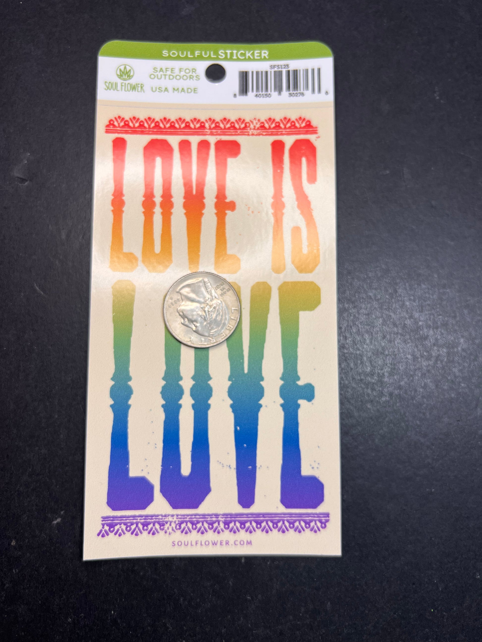 New Soul Flower “Love Is Love” vinyl sticker. Features a tall rainbow gradient design with bold lettering and decorative borders. Outdoor-safe vinyl and USA made. Measures about 7 x 3 inches (a quarter is shown on top of the sticker for size reference). Great for water bottles, laptops, notebooks, cars, and pride gifting. Sticker only.