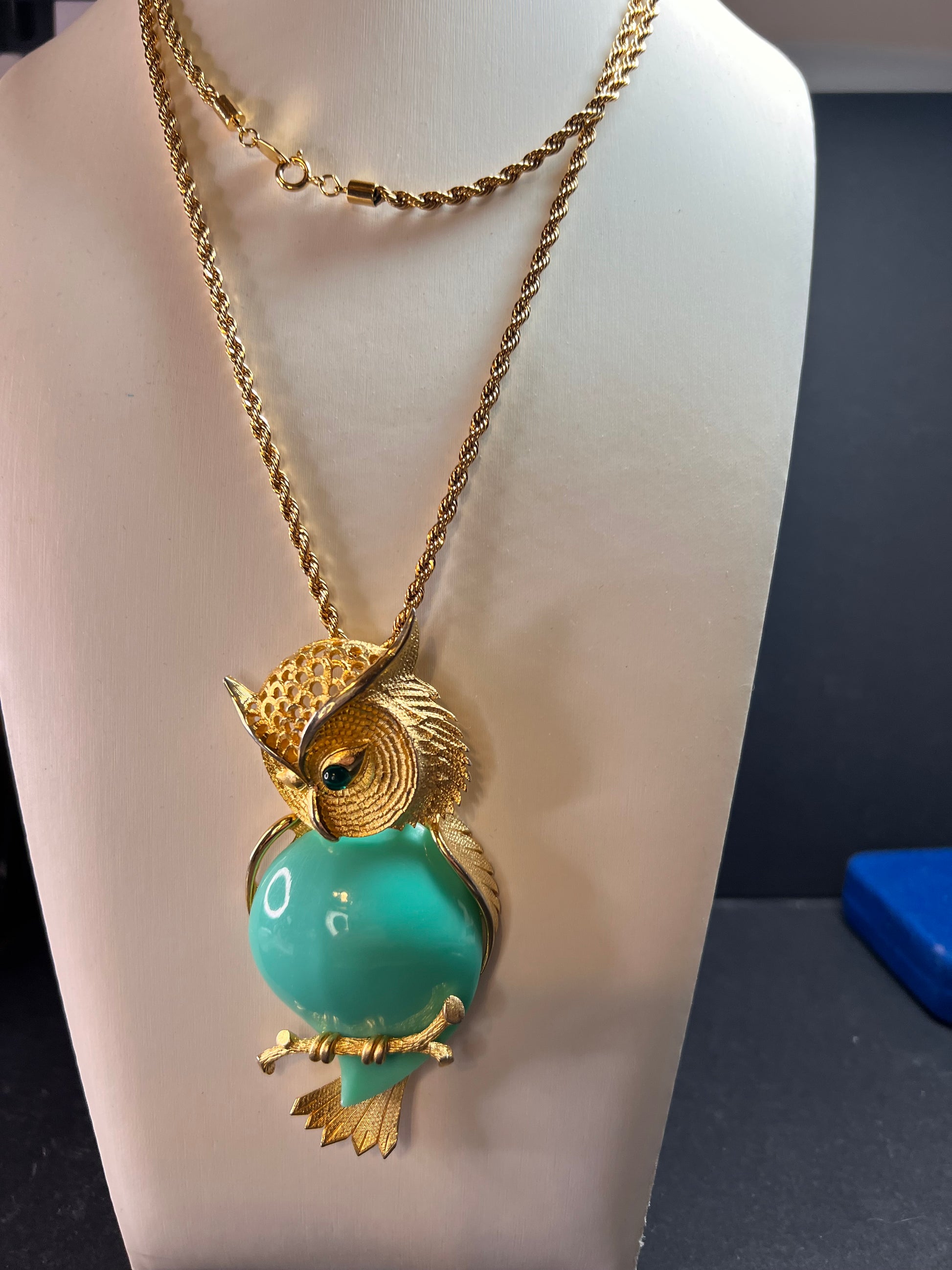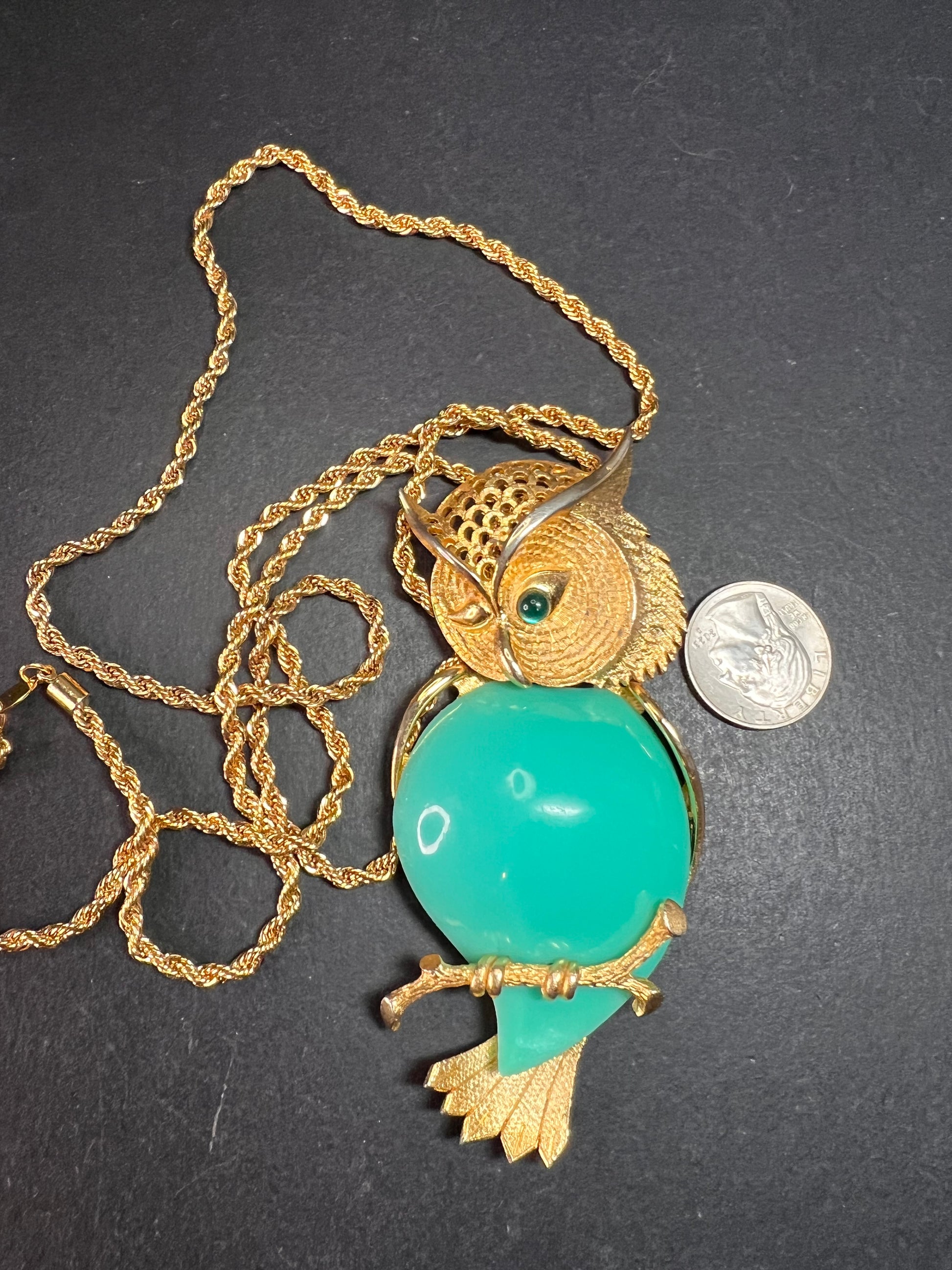 This spectacular vintage statement necklace features a delightful owl pendant, showcasing the best of late 1960s/early 1970s costume jewelry design. The highly detailed gold-tone metal pendant features a large, striking domed turquoise/aqua Lucite cabochon body, with the owl perched on a textured branch.