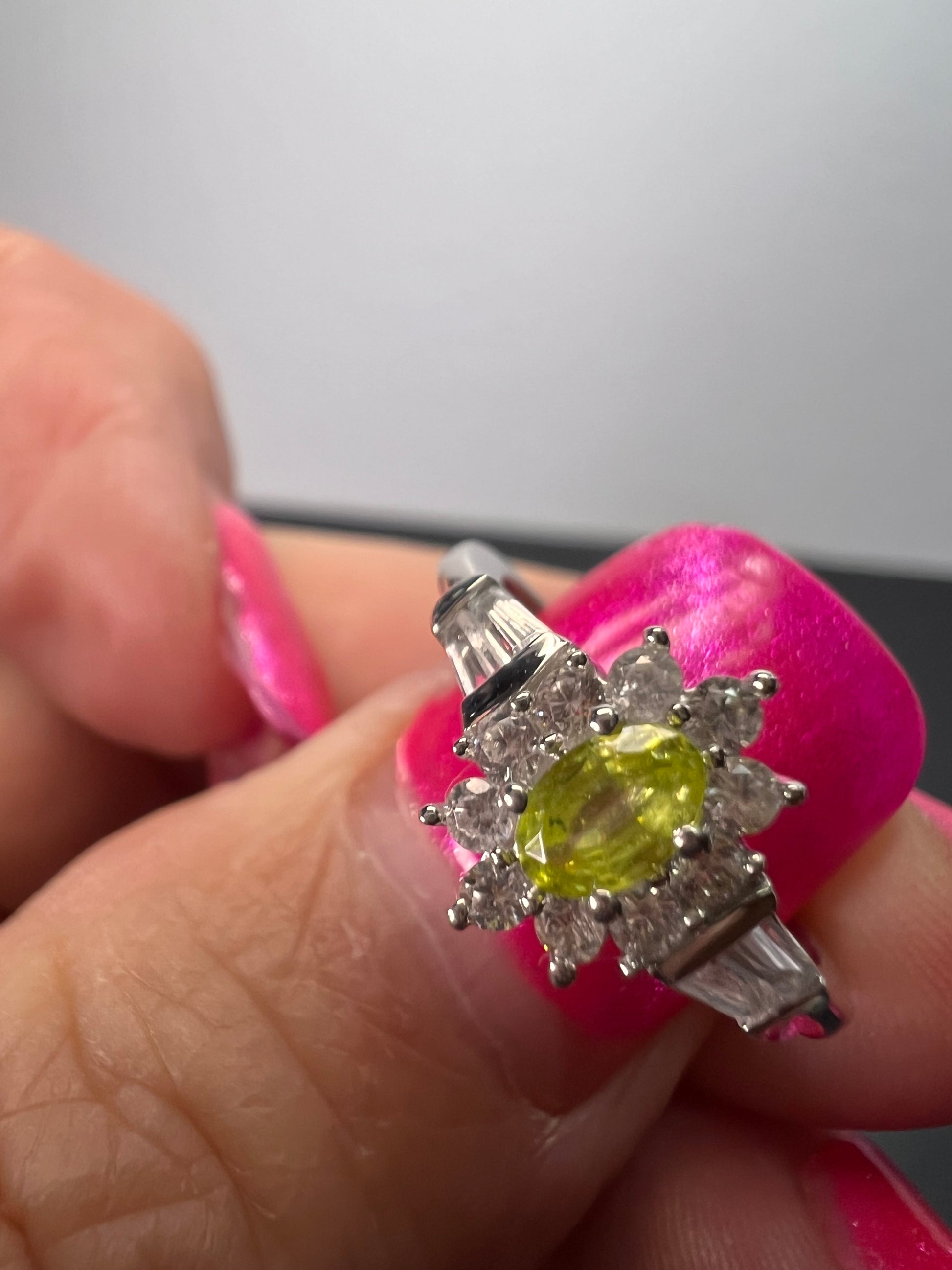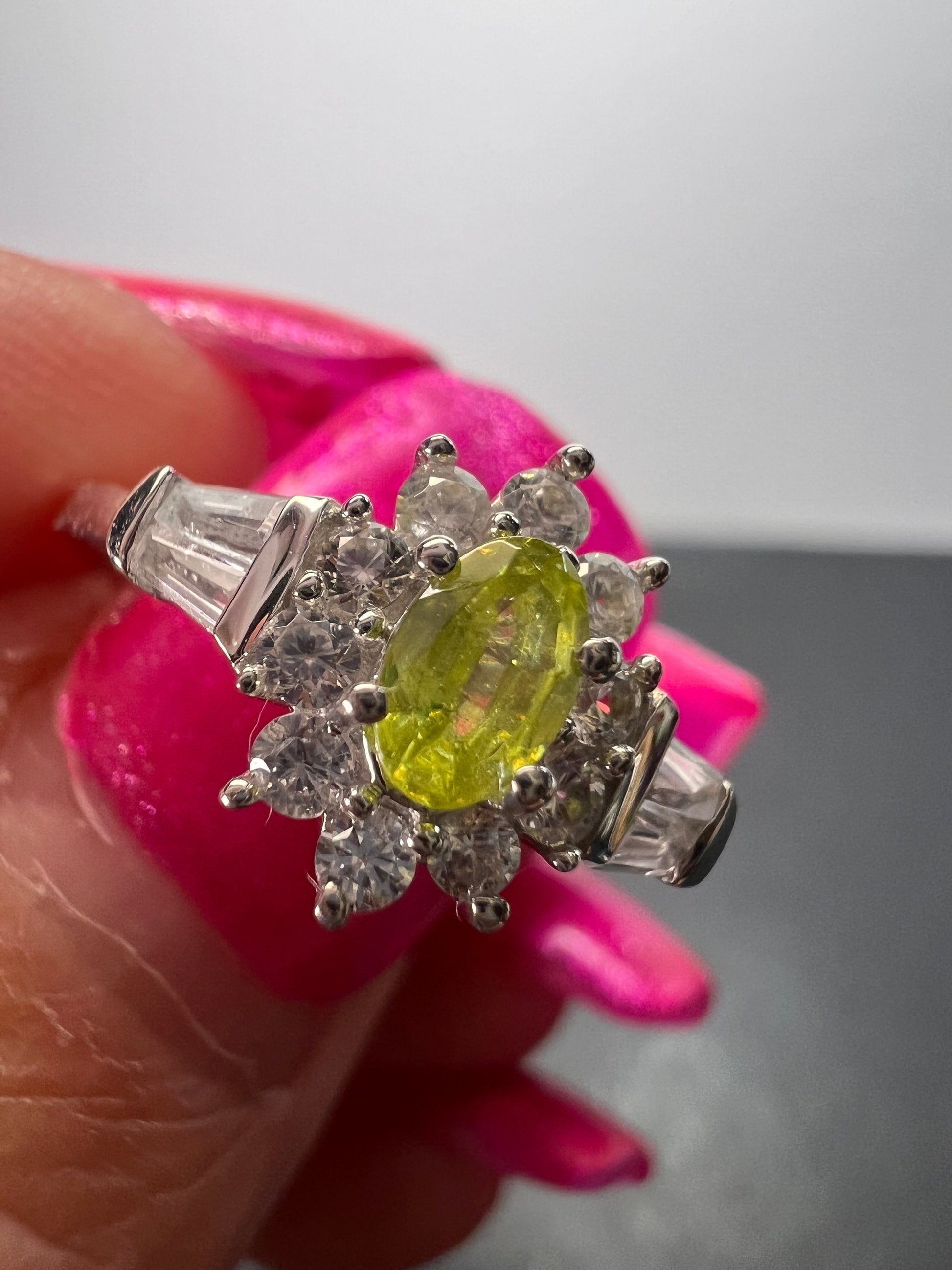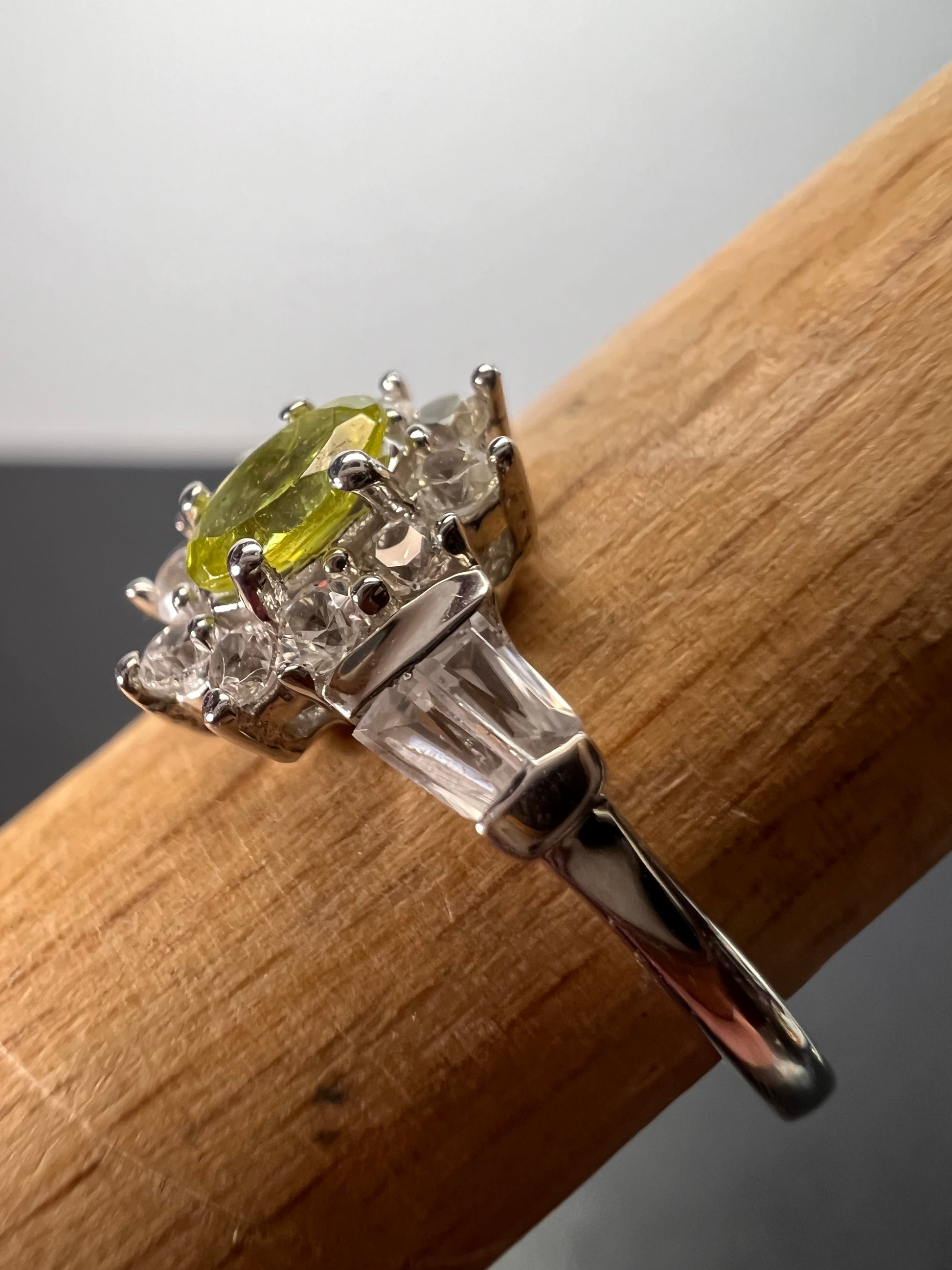 Rhodium plated over sterling silver. Premium sphene lemon green gemstone. White zircon accent stones. Total ctw 1.0 . Size 5. 925 Djoy