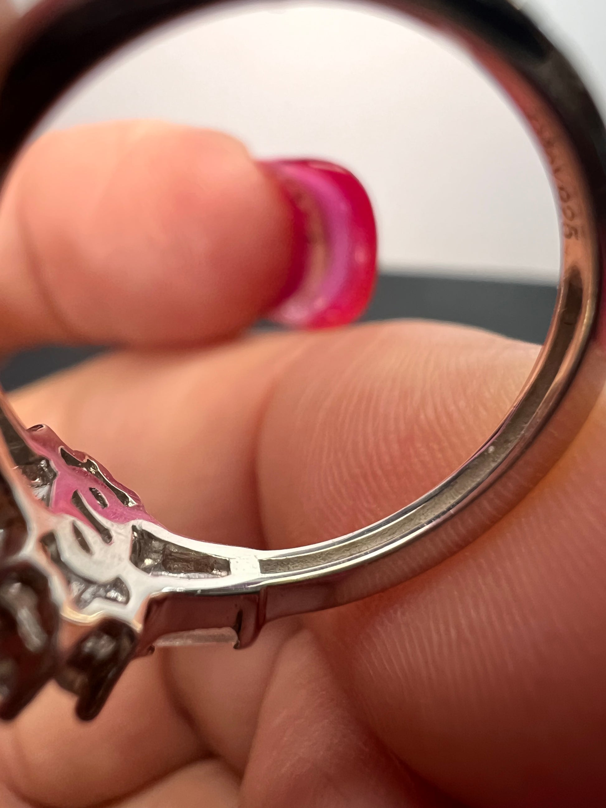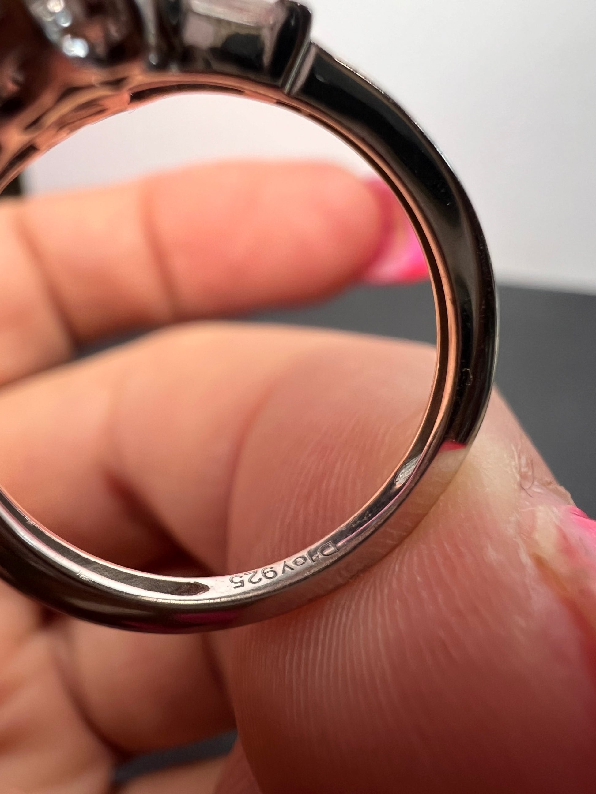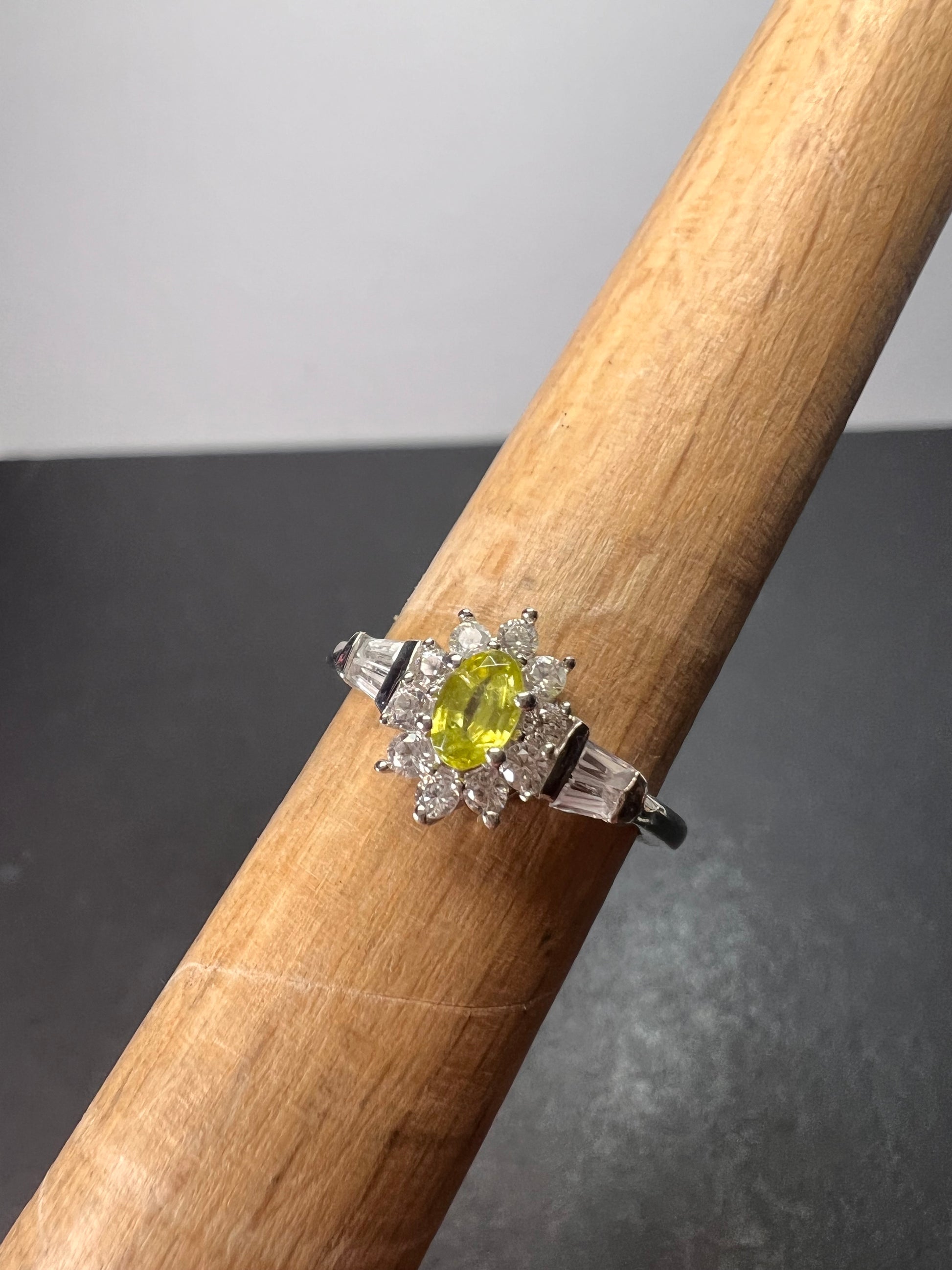 Rhodium plated over sterling silver. Premium sphene lemon green gemstone. White zircon accent stones. Total ctw 1.0 . Size 5. 925 Djoy
