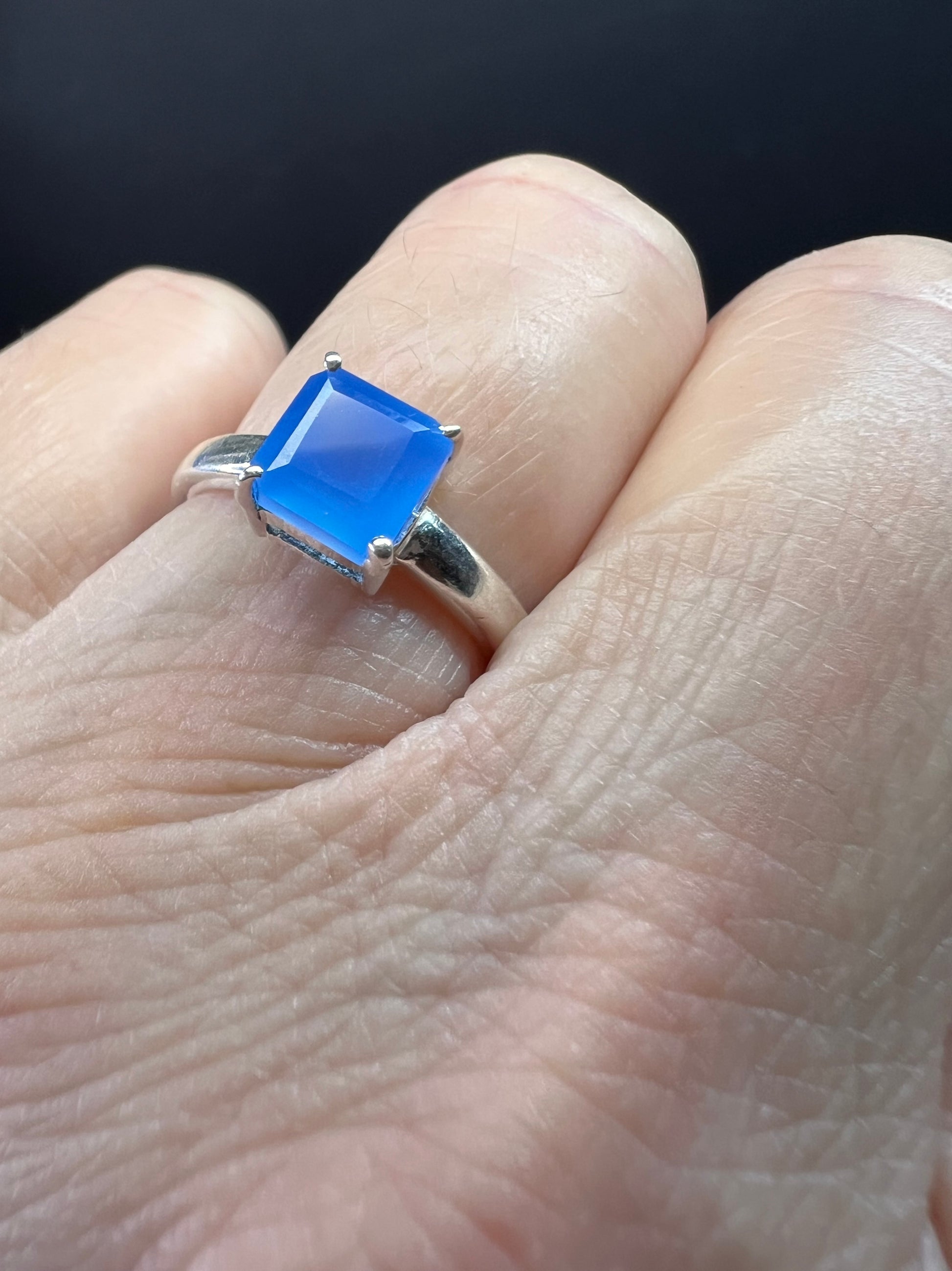 Blue chalcedony square cut gemstone measuring about 7mm prong set in authentic 925 sterling silver. Size 6. Weighs 2.52 grams. Stone is likely treated for color enhancement.