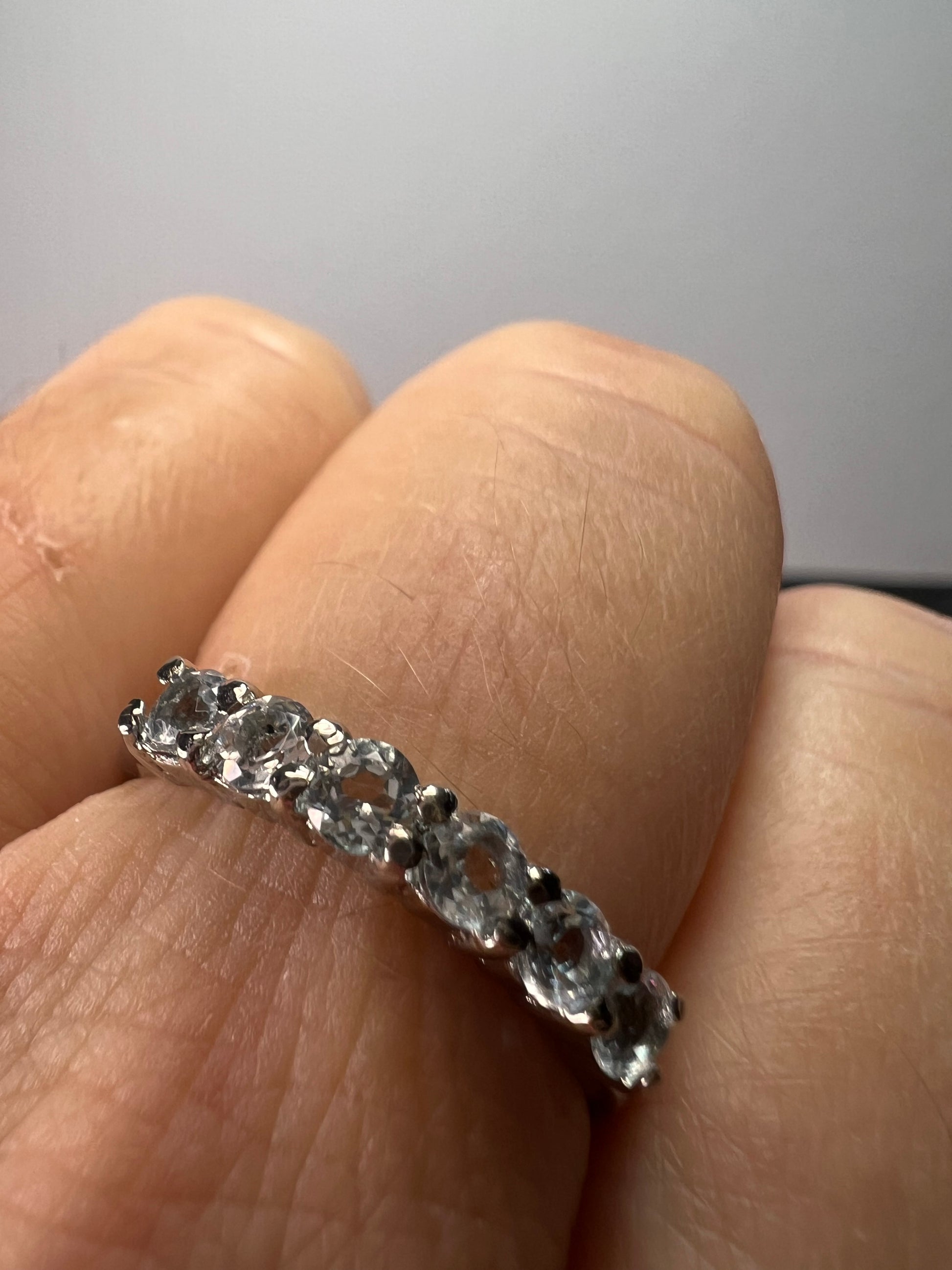 Stones tests as blue topaz. Set in stainless steel. Size 9