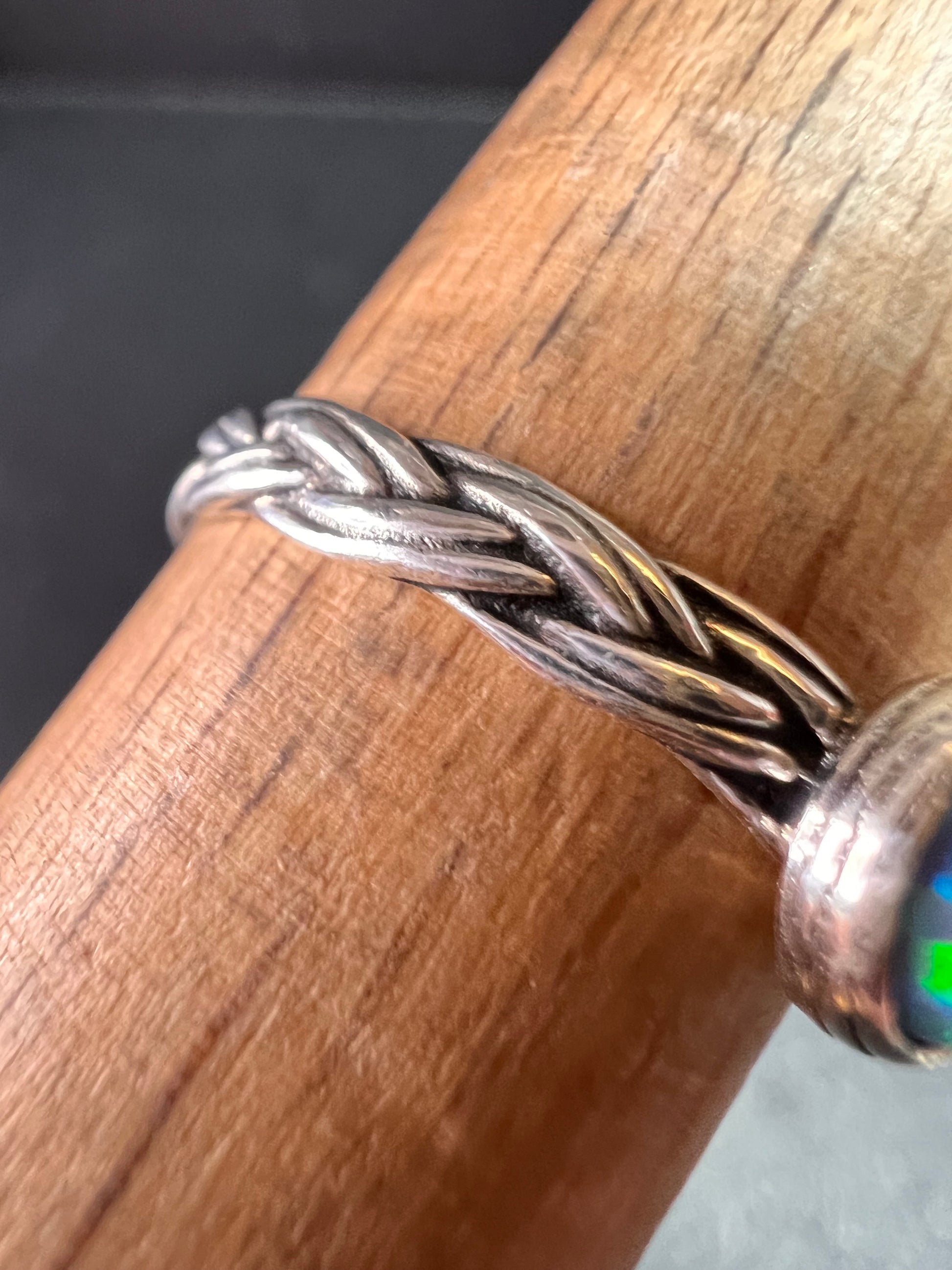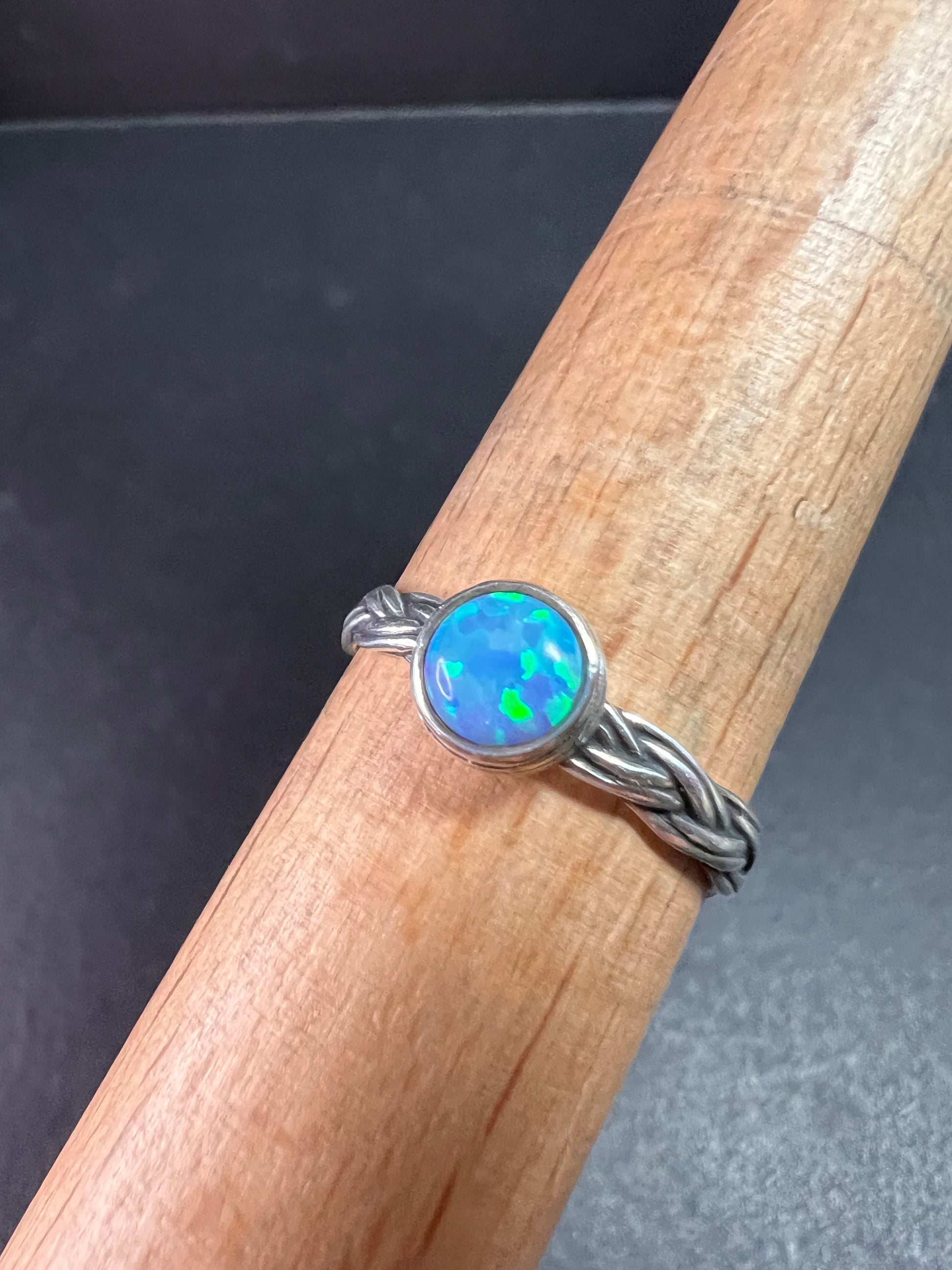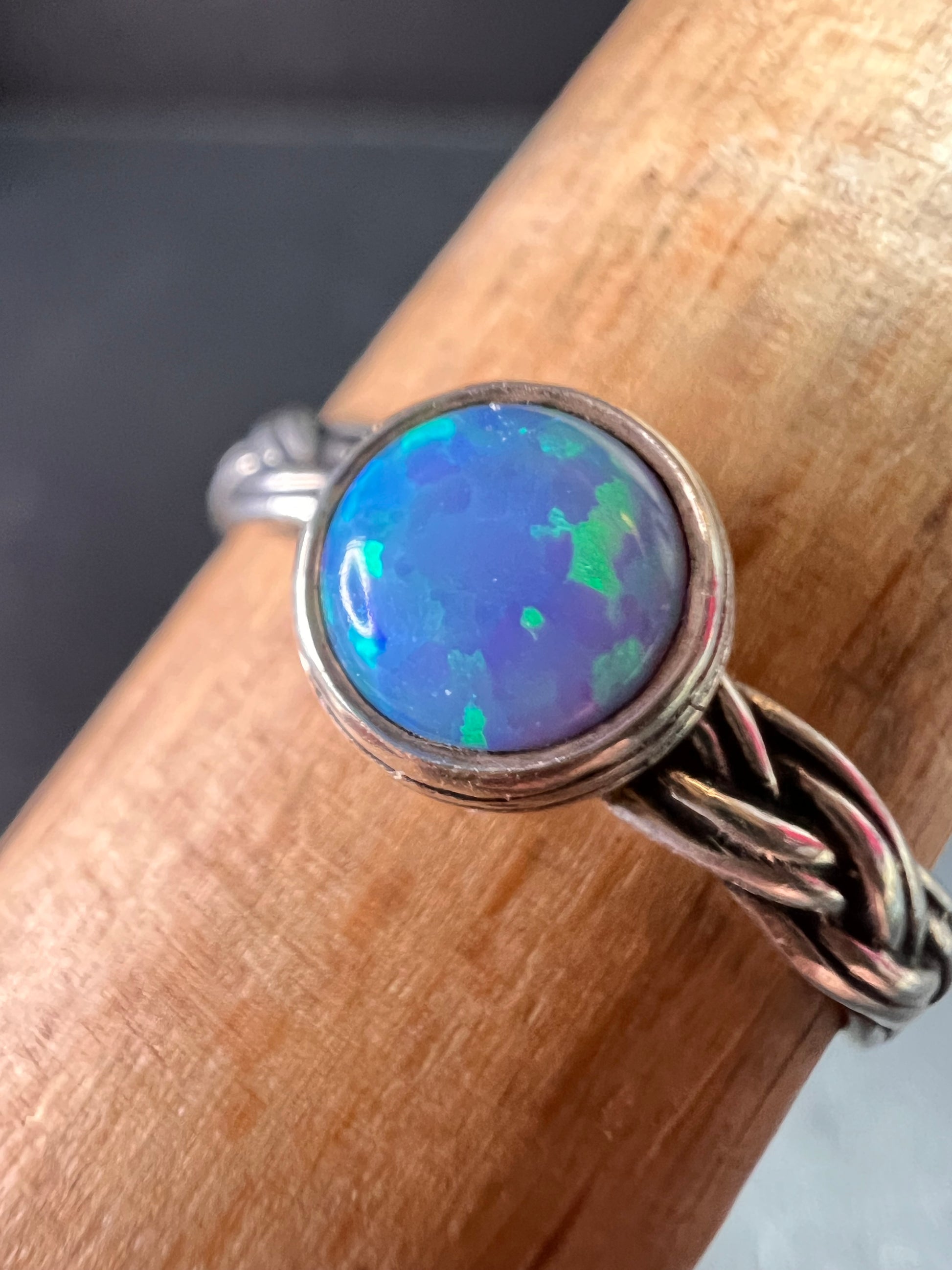 Sterling Silver Braided Band Ring with Lab Opal – Size 9