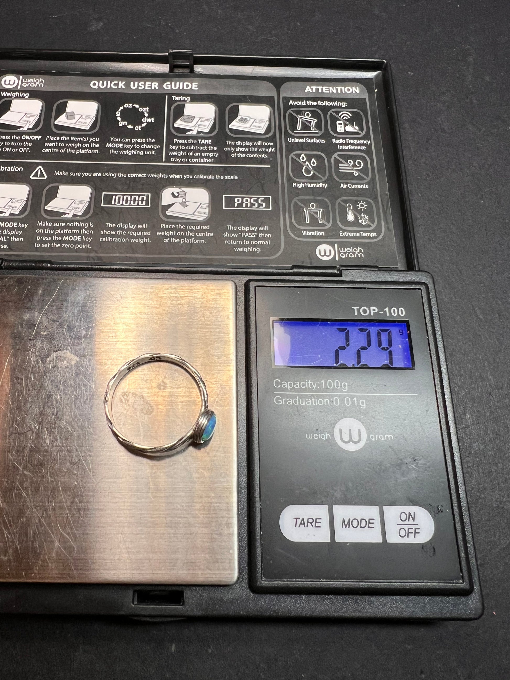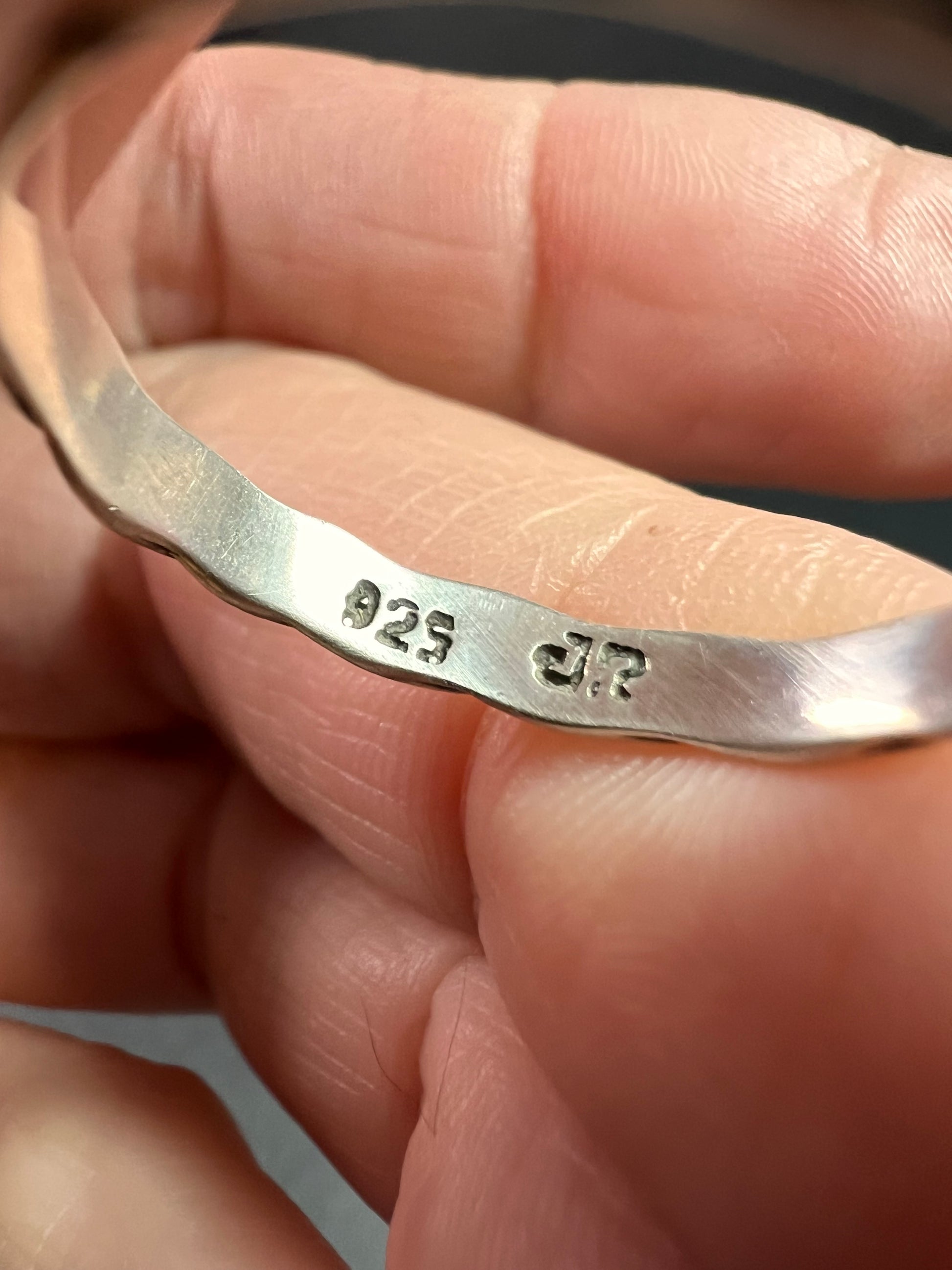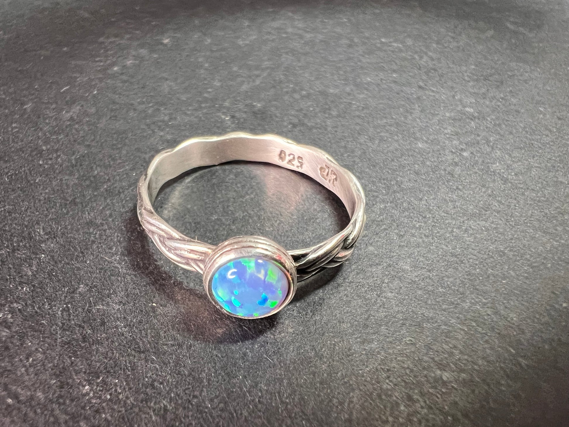 Pre-owned and in very good condition with only light surface wear. This sterling silver ring features a bright round lab-created opal set in a smooth bezel, showing vivid flashes of blue, green, and hints of violet. The band is a hand-textured braided design that gives the ring a unique artisan look. Inside the band is stamped 925 along with the maker’s mark “JR.” Ring size is 9 and the stone measures approximately 7.1 mm. A beautiful everyday piece with a colorful glow.
