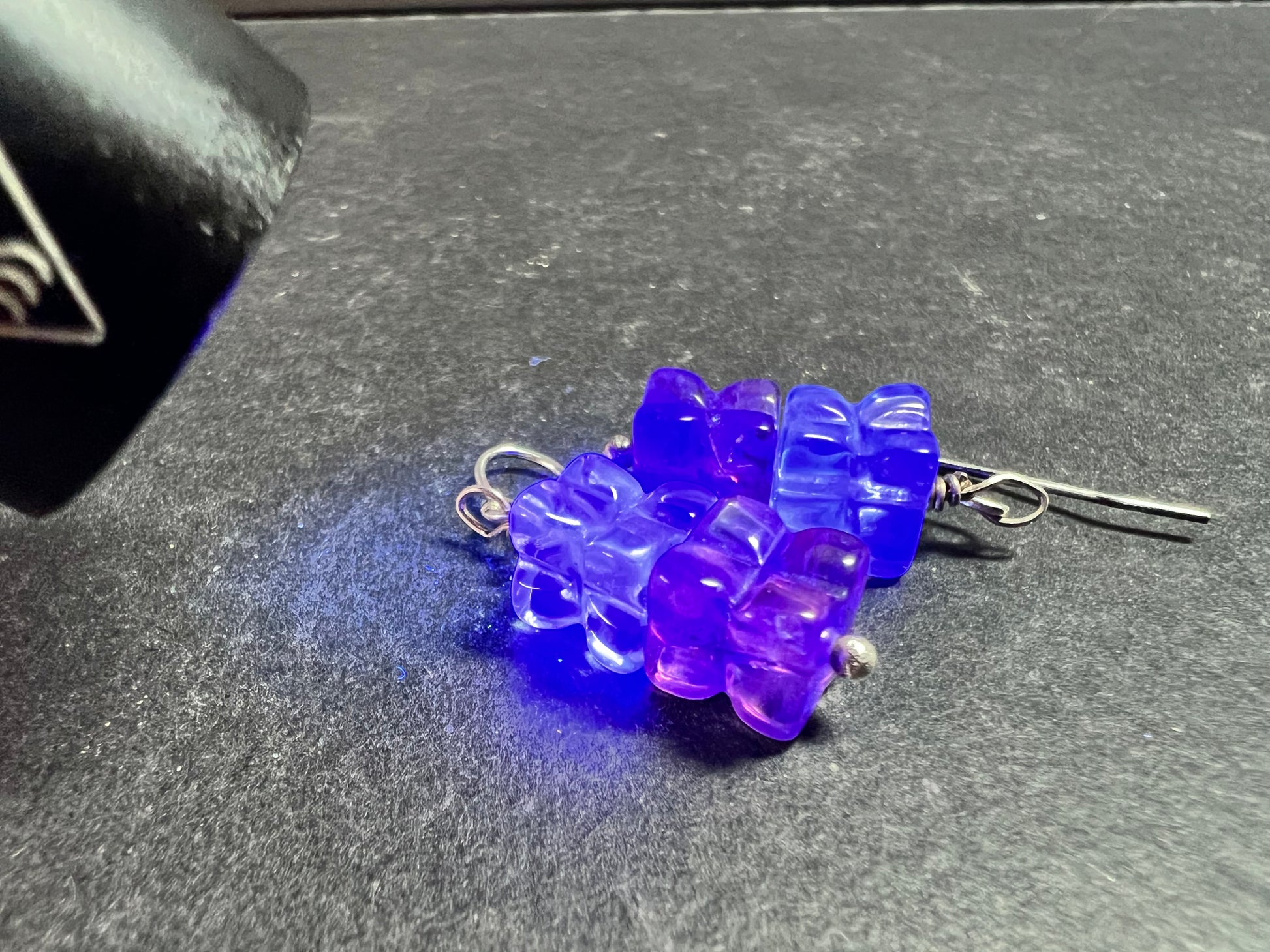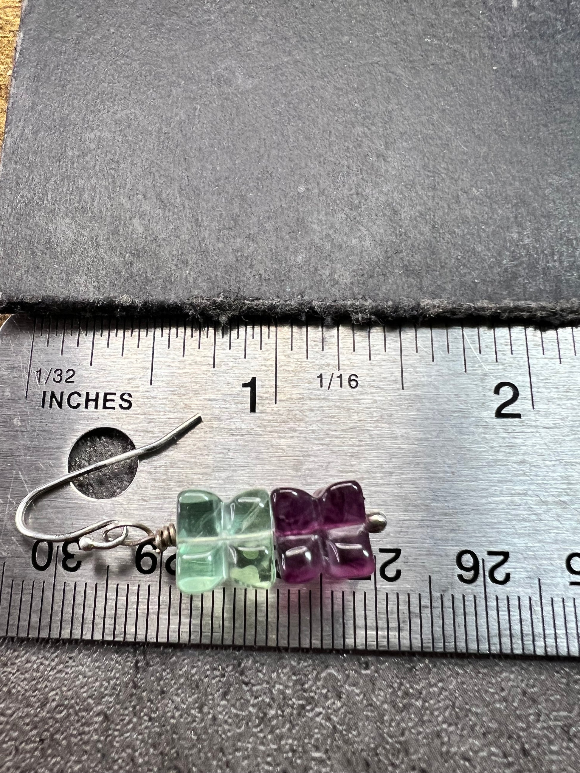 Pre owned sterling silver drop earrings featuring stacked carved fluorite beads in a four-petal flower/clover design. Soft green and purple fluorite with natural color zoning and internal inclusions typical of genuine stone (not damage). Very good pre owned condition with minor surface wear consistent with light use; no cracks or major chips observed. The 925 stamp is not visible in photos, but the silver has been acid tested for purity verification. Total weight 5.53 grams. Approximate drop length 1.25 inches. Classic shepherd hook ear wires.