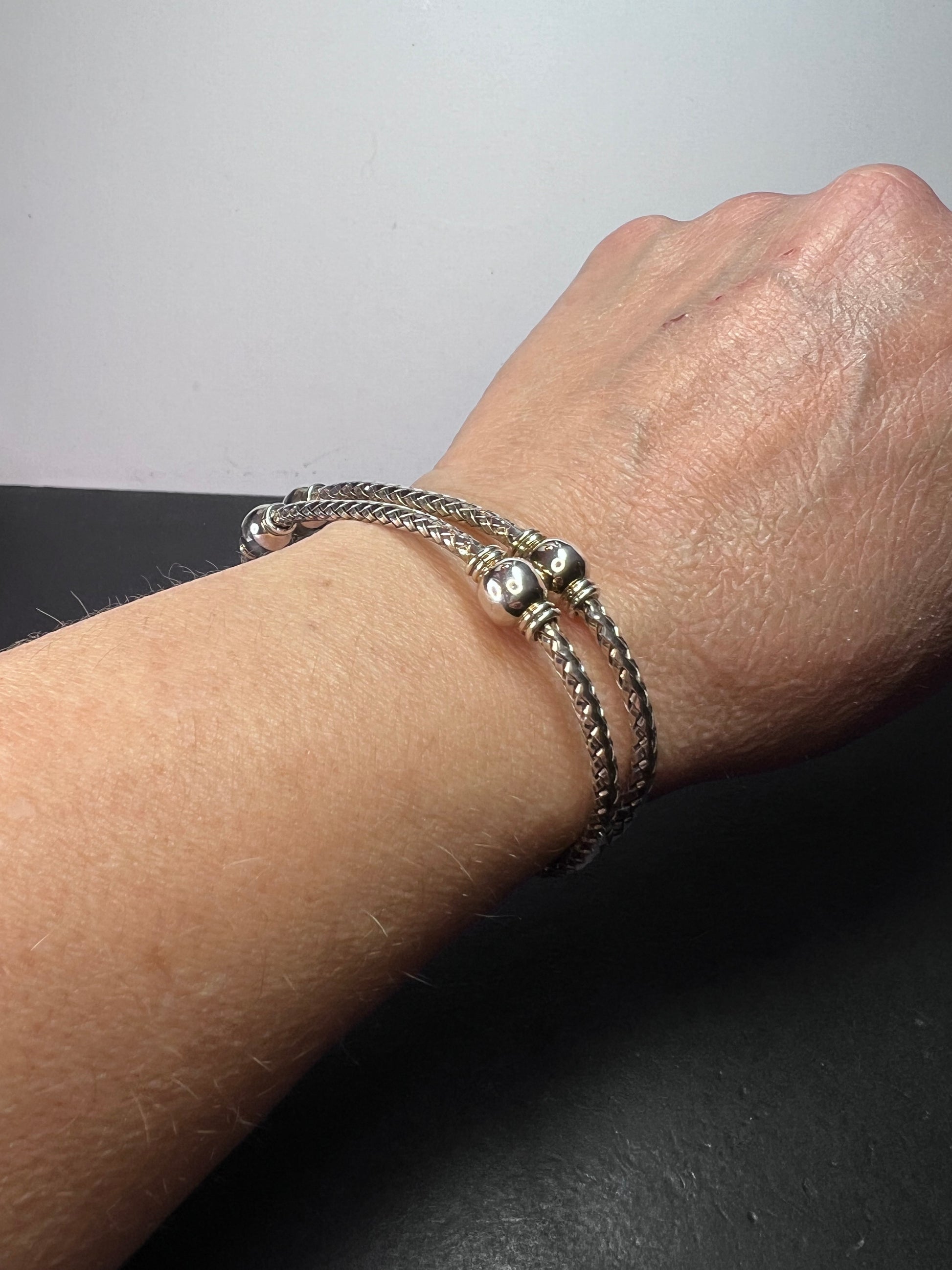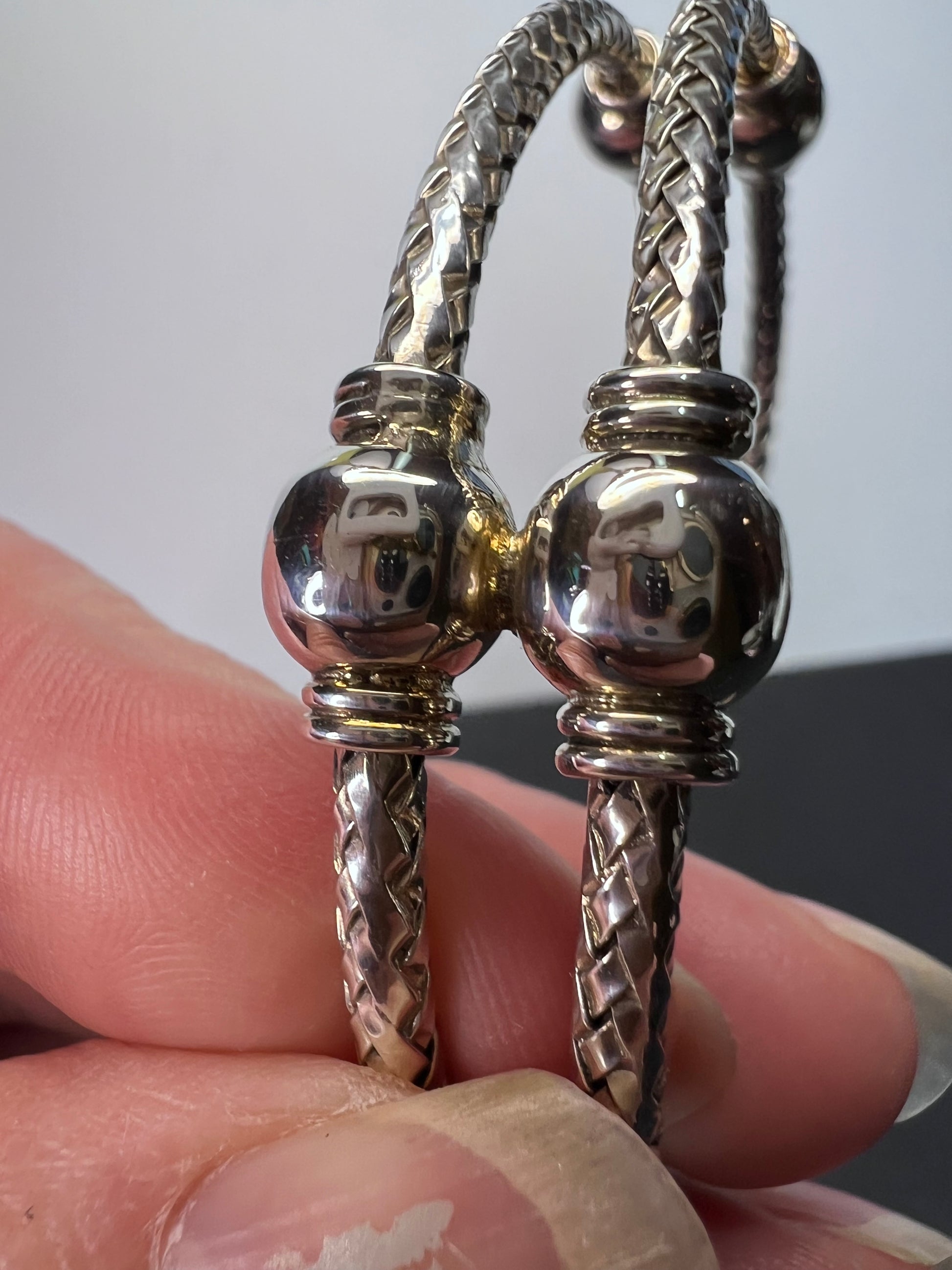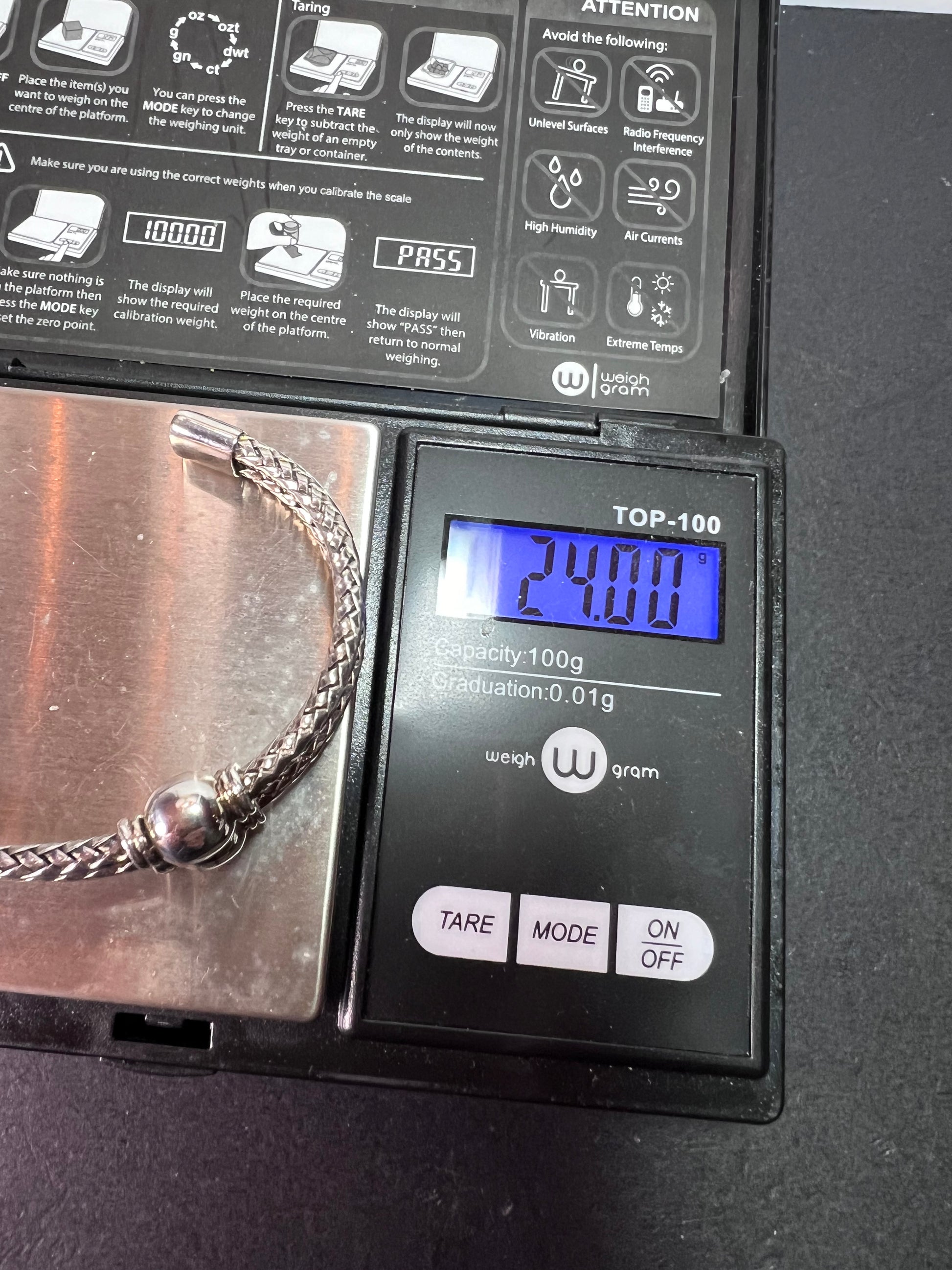 This is sterling silver throughout. It’s flexible so you can squeeze it tighter around your wrist or bend it back to remove. Would fit for different size wrists. Total weight is 24.04 grams