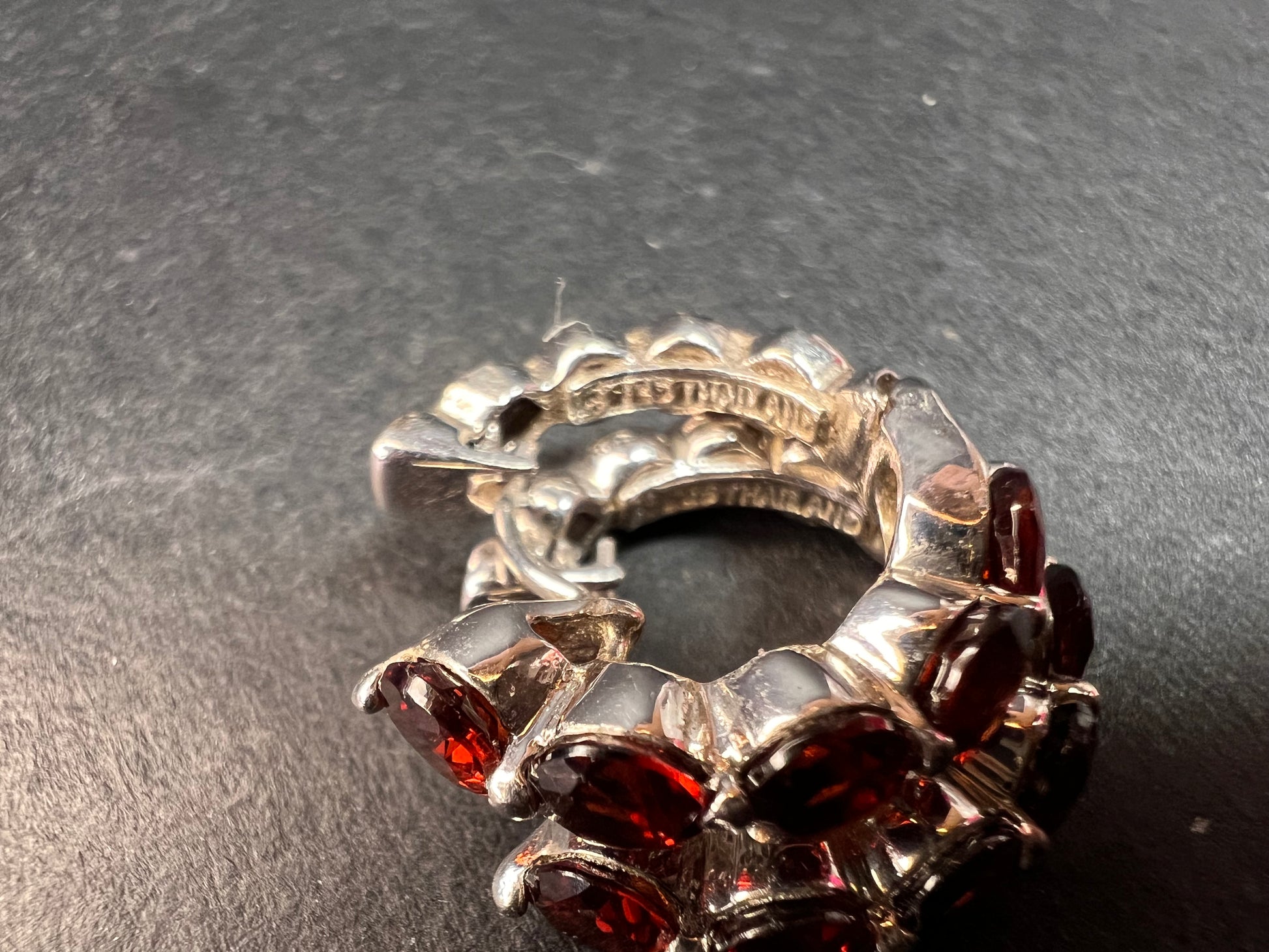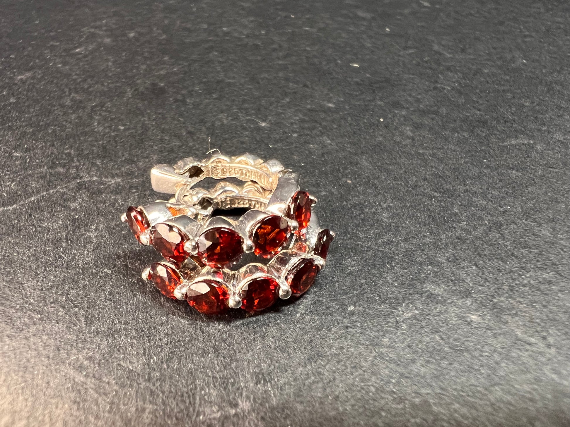 Pre-owned pair in excellent condition with no missing stones and secure snap-top closures. These sterling silver inside-out hoops feature vivid deep-red oval garnets that catch the light beautifully from every angle. Crafted in Thailand and stamped 925, they offer that classic early-2000s gemstone hoop style with a smooth, comfortable fit. Perfect for adding a rich pop of color to everyday wear or dressing up an evening look. Lightweight at 4.36 grams and about the size of a quarter, they’re easy to wear while still making a statement. Cleaned and ready to wear.