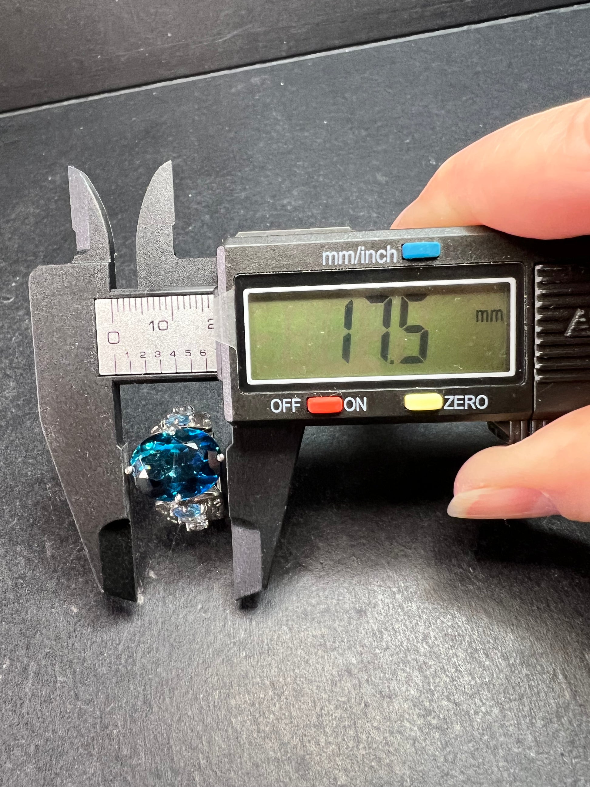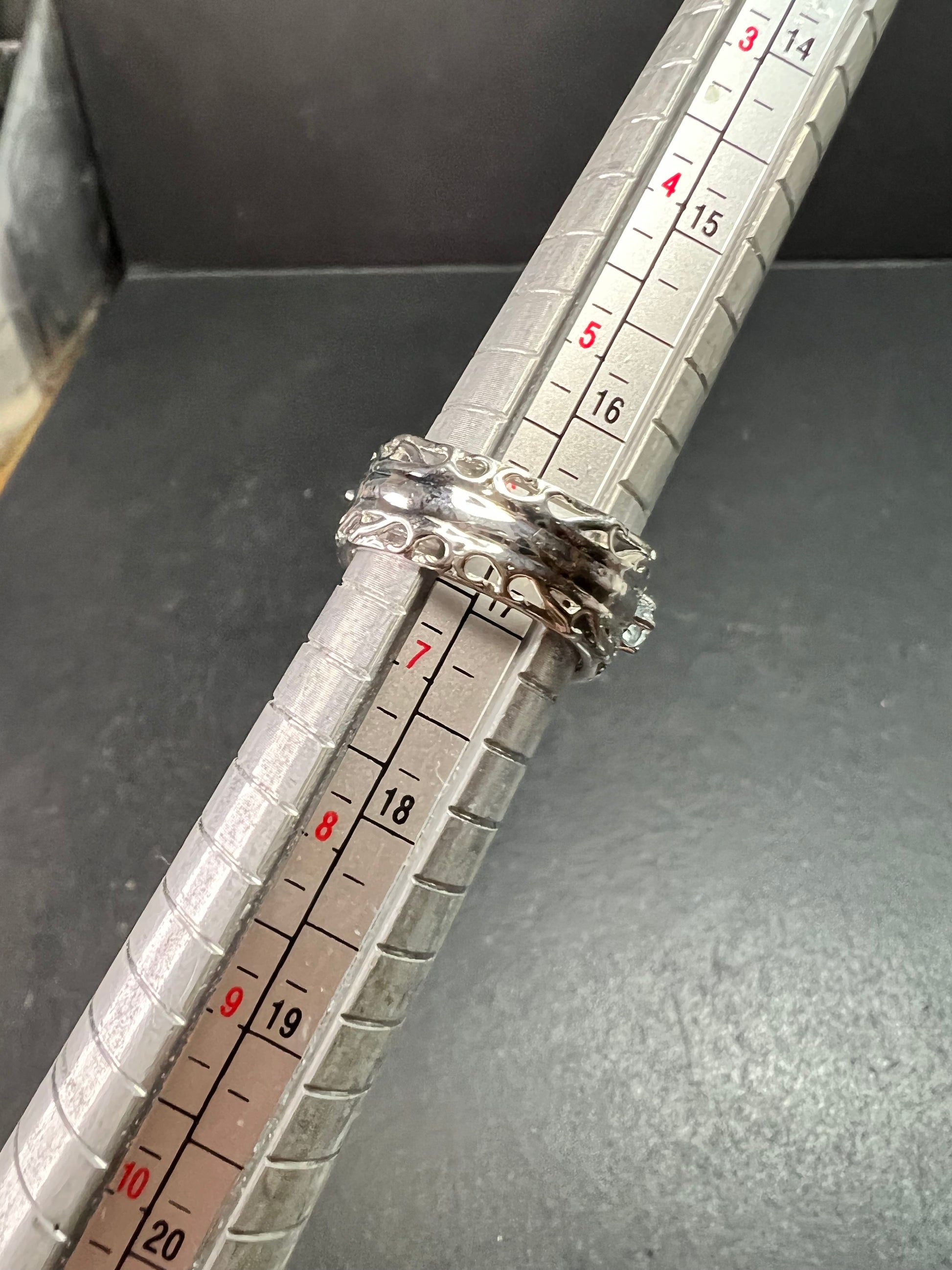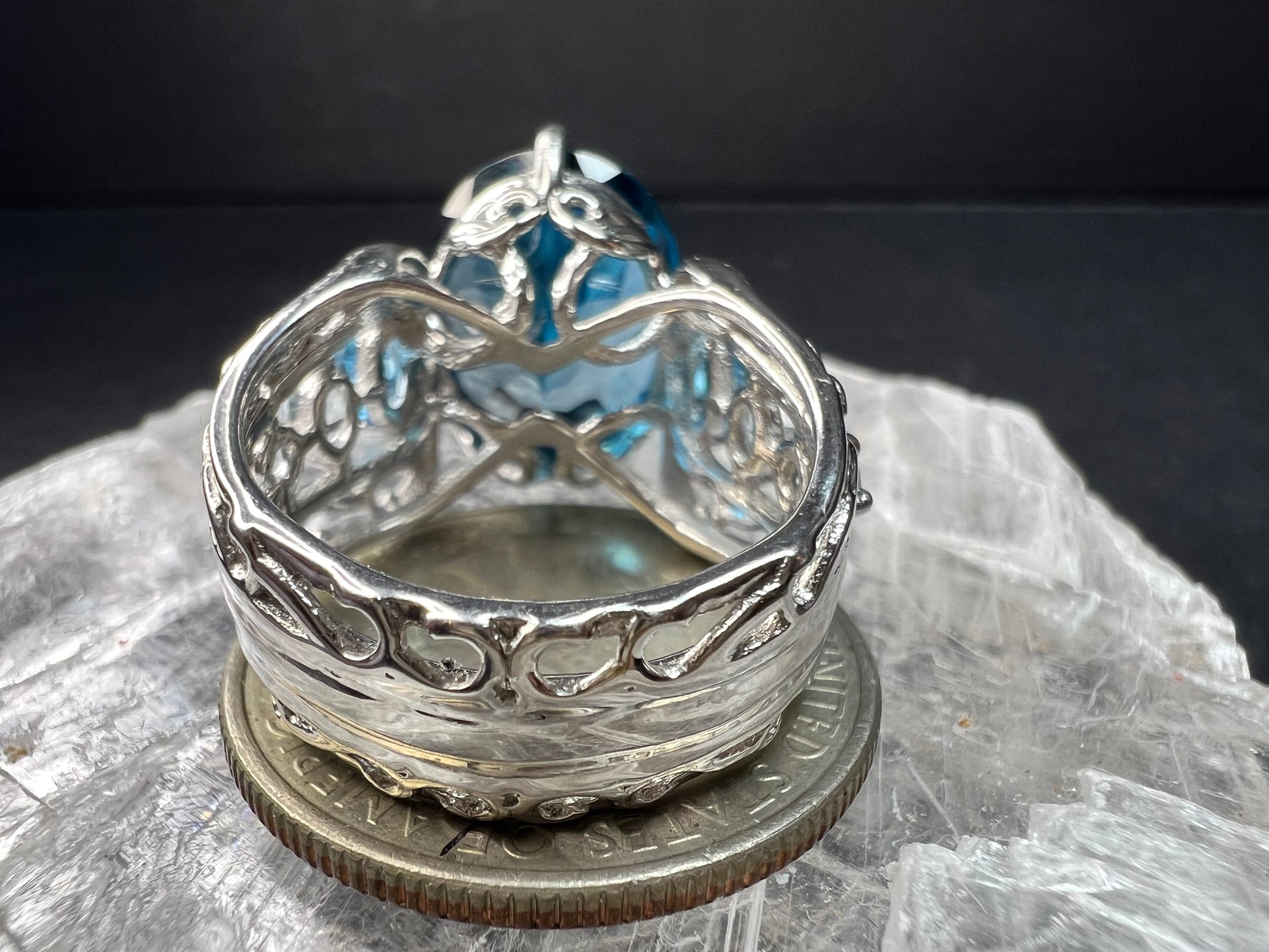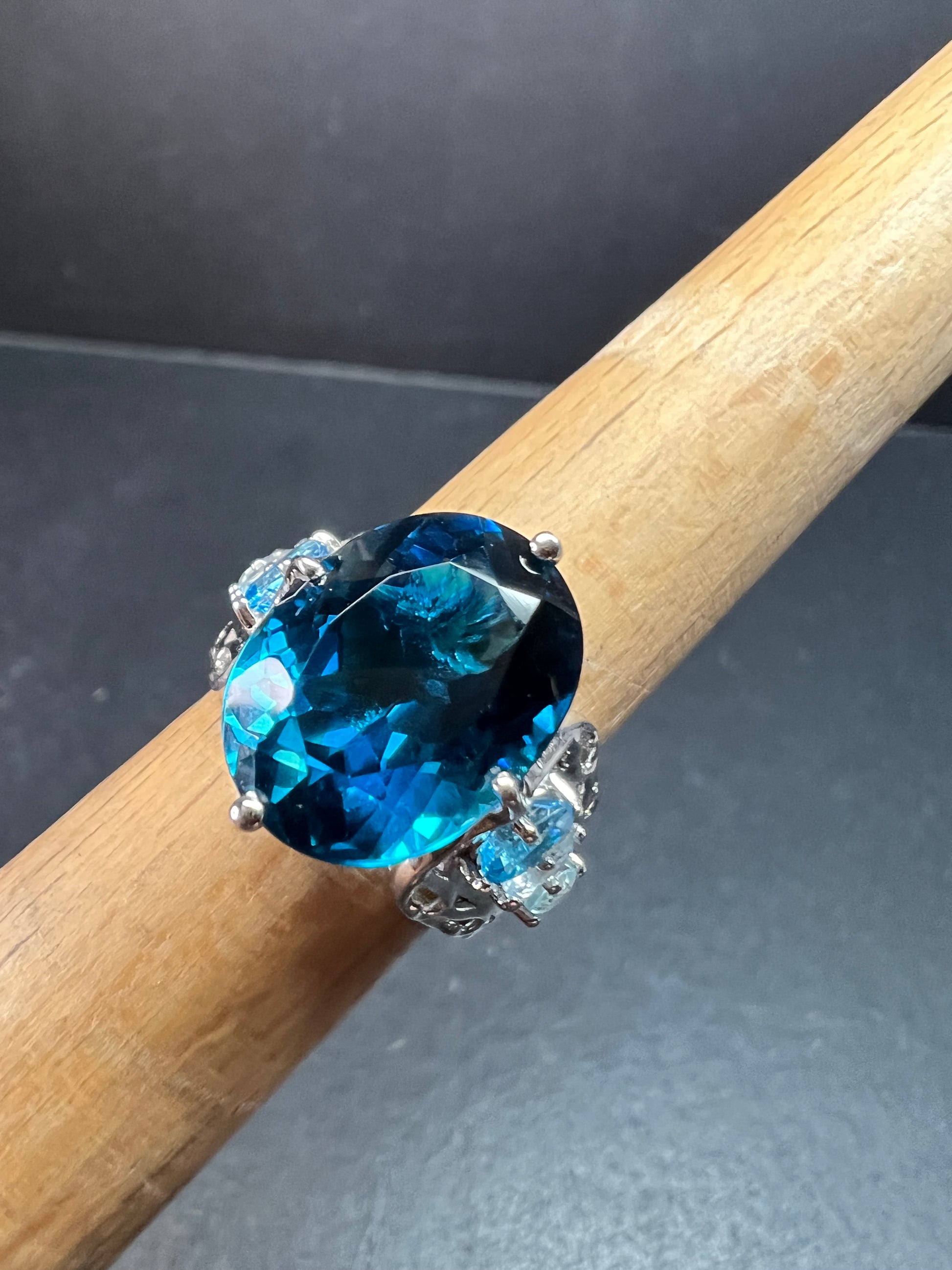 Gently pre owned sterling silver statement ring featuring a large oval cut London blue topaz measuring approximately 13 x 11.5 mm, accented with vibrant sky blue and Swiss blue topaz gemstones on each side. The layered blue tones create beautiful depth and brilliance in any lighting. Stamped 925 inside the band. Measures a true size 6.5 on mandrel. Substantial openwork gallery and wide band design give this piece bold presence while remaining comfortable to wear. Excellent pre owned condition with minor expected wear. Estimated total gemstone weight approximately 12–15 carats combined.
