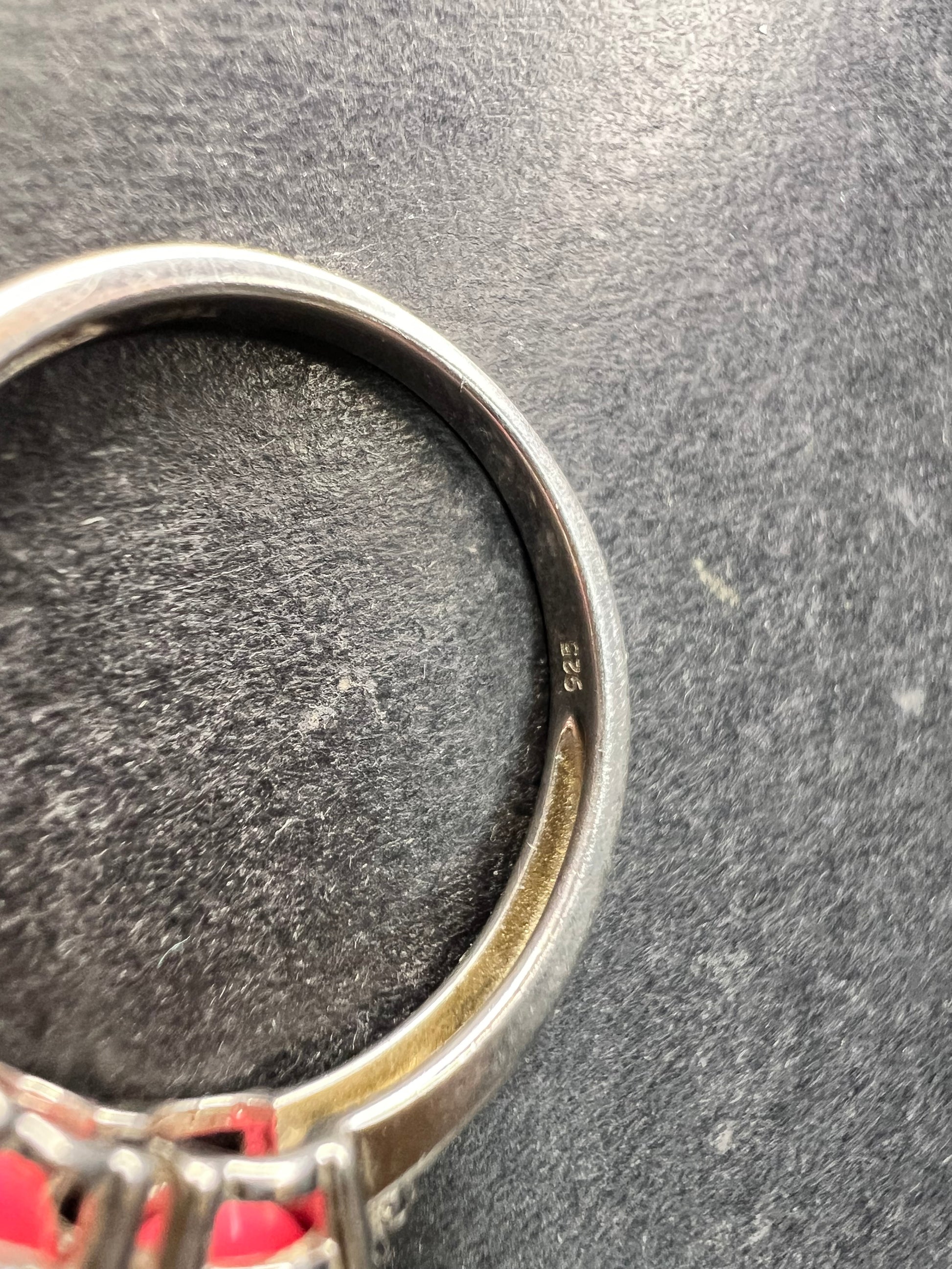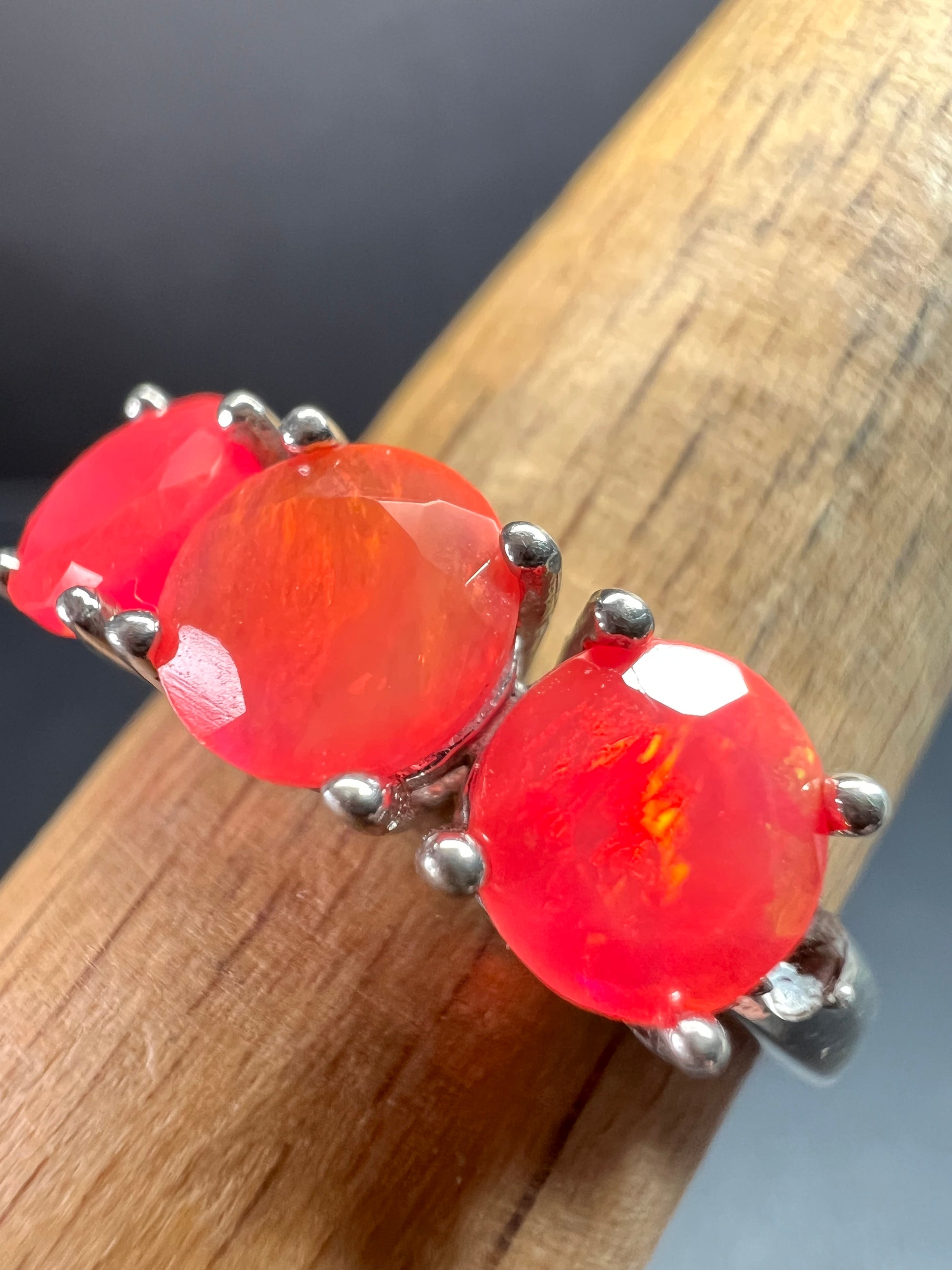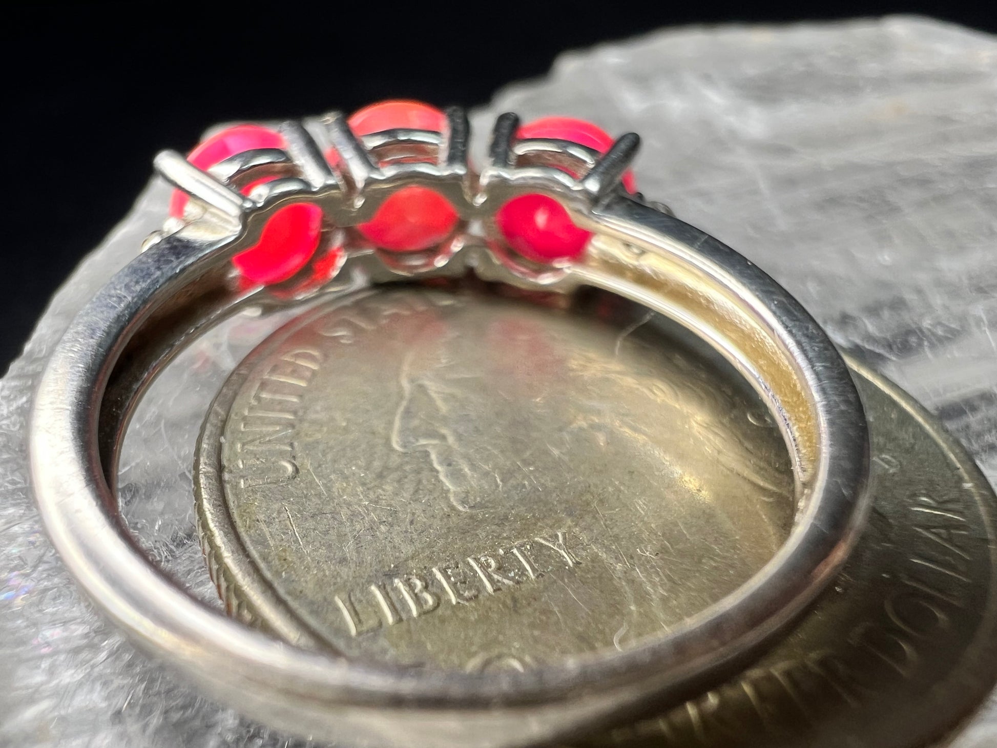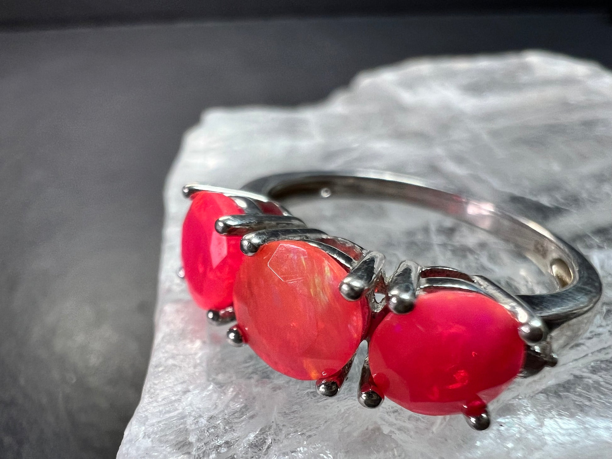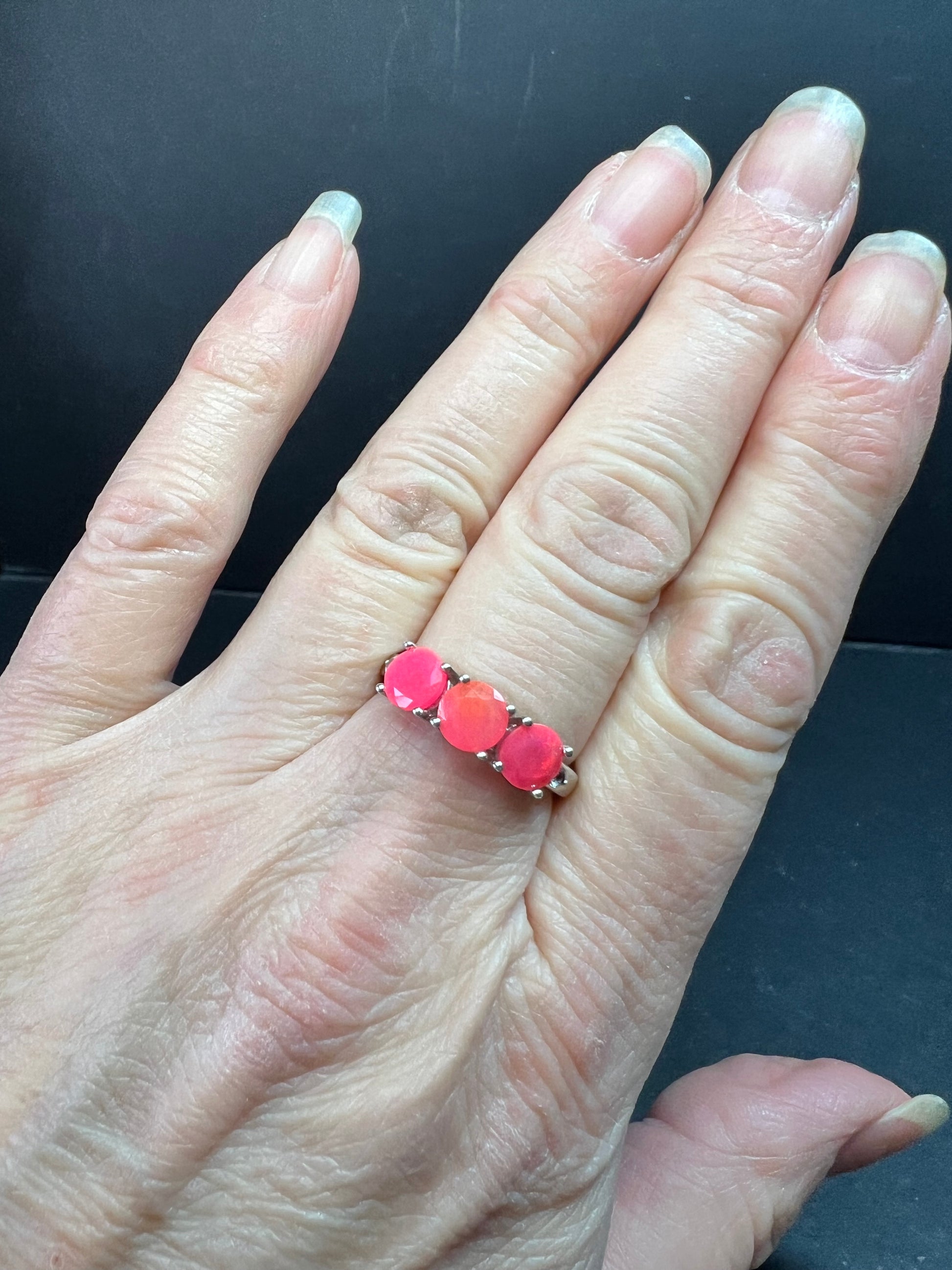Gently pre-owned sterling silver ring featuring three vivid neon pink Ethiopian opals with internal flashes of fire. The opals are not naturally neon in color and have been treated or dyed to achieve their intense pink body tone. White accent stones on the sides test as genuine topaz. Stamped 925 and purity verified. Size 9 and weighs 2.81 grams. Contemporary 2000s–present design with bold, glowing color that makes a strong statement. Pre-owned condition with light surface wear consistent with age. Avoid prolonged water exposure due to the hydrophane nature of Ethiopian opals.