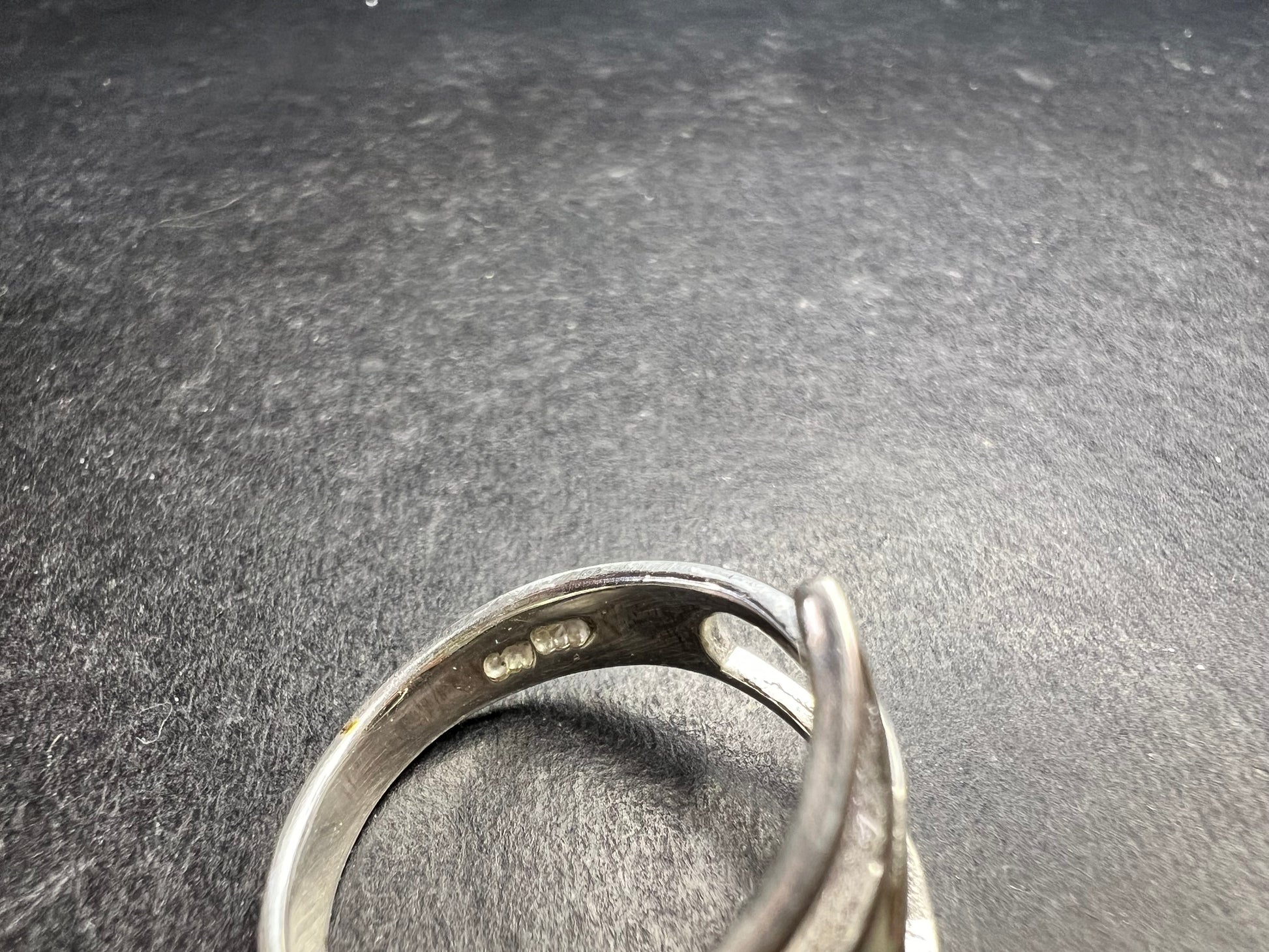 This sterling silver ring features a sleek modernist open-loop design with fluid, sculptural lines and a comfortable low profile. The minimalist negative-space style gives it a contemporary, artisan look that pairs easily with both casual and elevated outfits. The ring appears to measure approximately a size 7.5 and weighs 2.86 grams. Crafted in solid sterling silver with a smooth polished finish, it shows light, typical wear consistent with gentle pre-owned condition and no structural issues noted. A versatile statement ring with a timeless modern aesthetic.