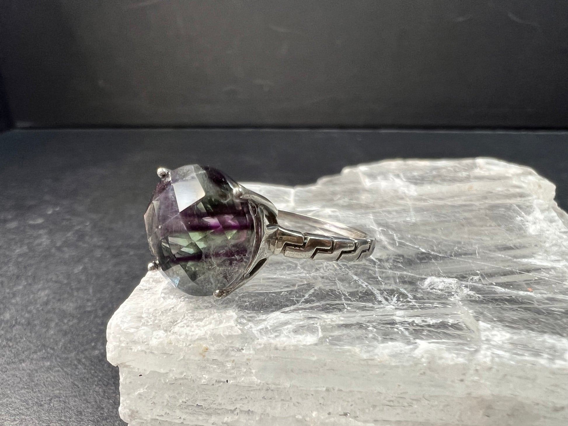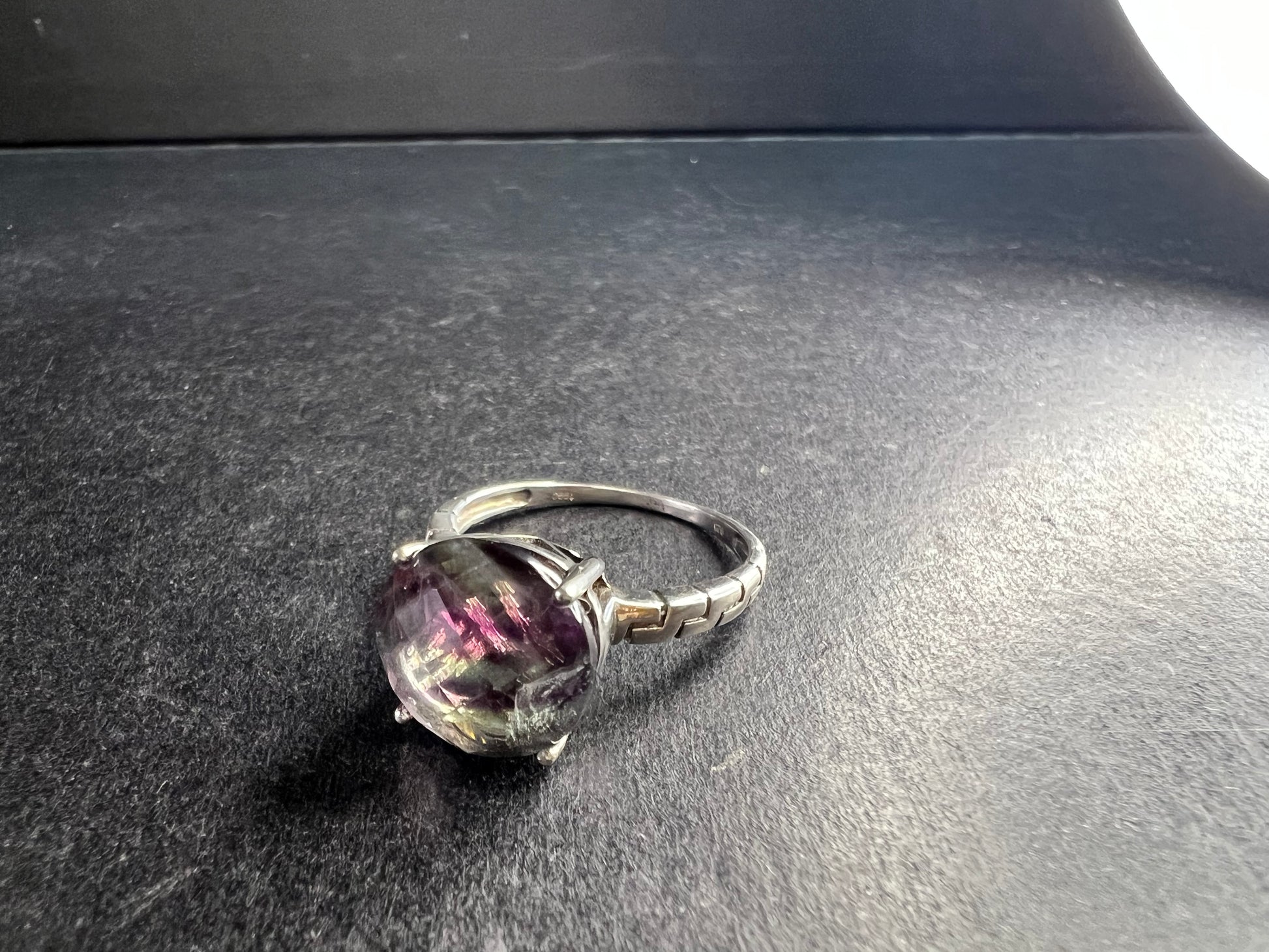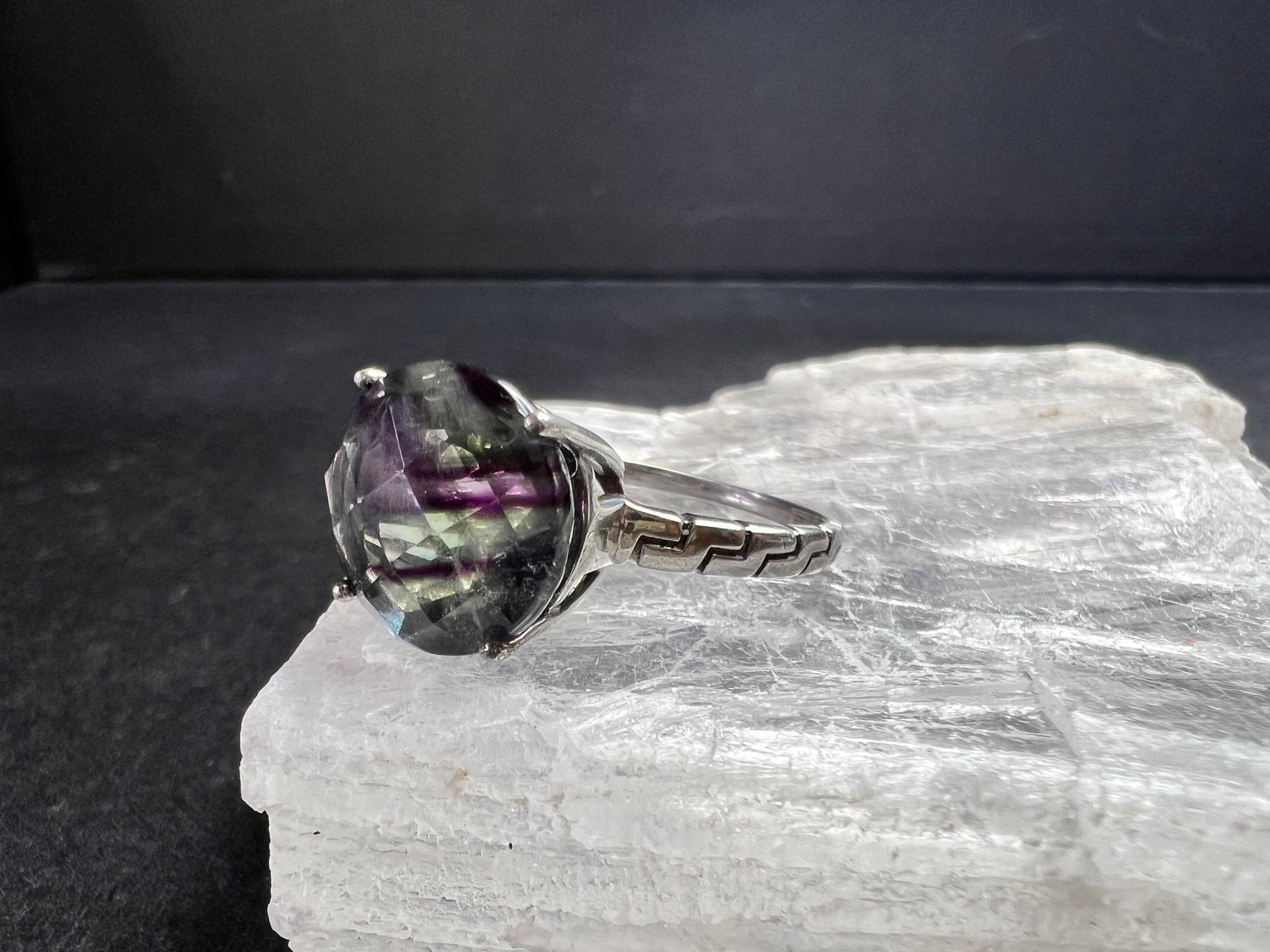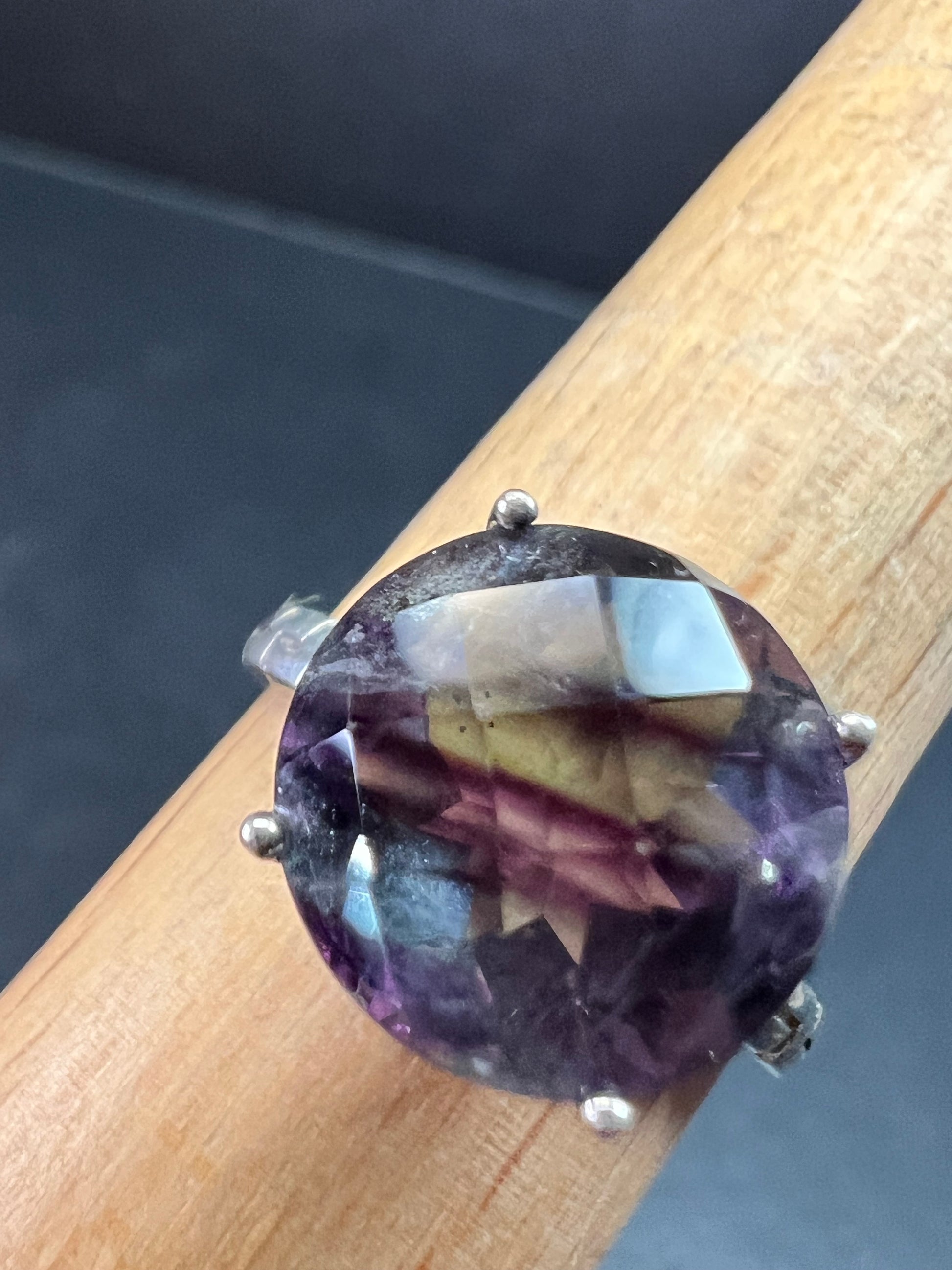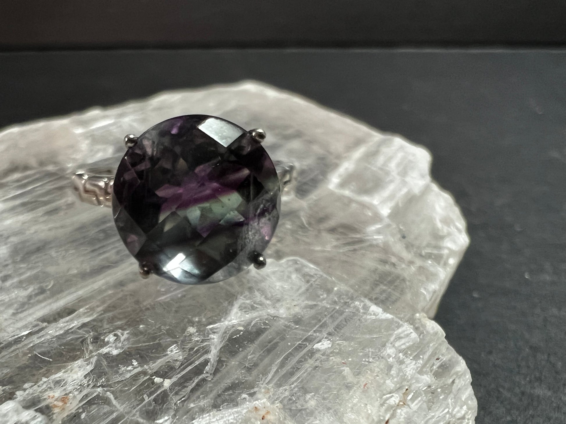 Vintage sterling silver ring stamped 925 TGGC featuring a large round faceted rainbow fluorite with beautiful natural purple and green zoning that shifts in different lighting. The stone is translucent and displays natural internal veils, growth lines, and feather-like inclusions typical of fluorite formation. These are internal characteristics and not surface damage. The surface of the stone appears smooth with no visible chips observed. Ring is size 9 and weighs 4.07 grams. Classic four-prong setting with a clean geometric style band. Gently pre-owned with light wear consistent with age.