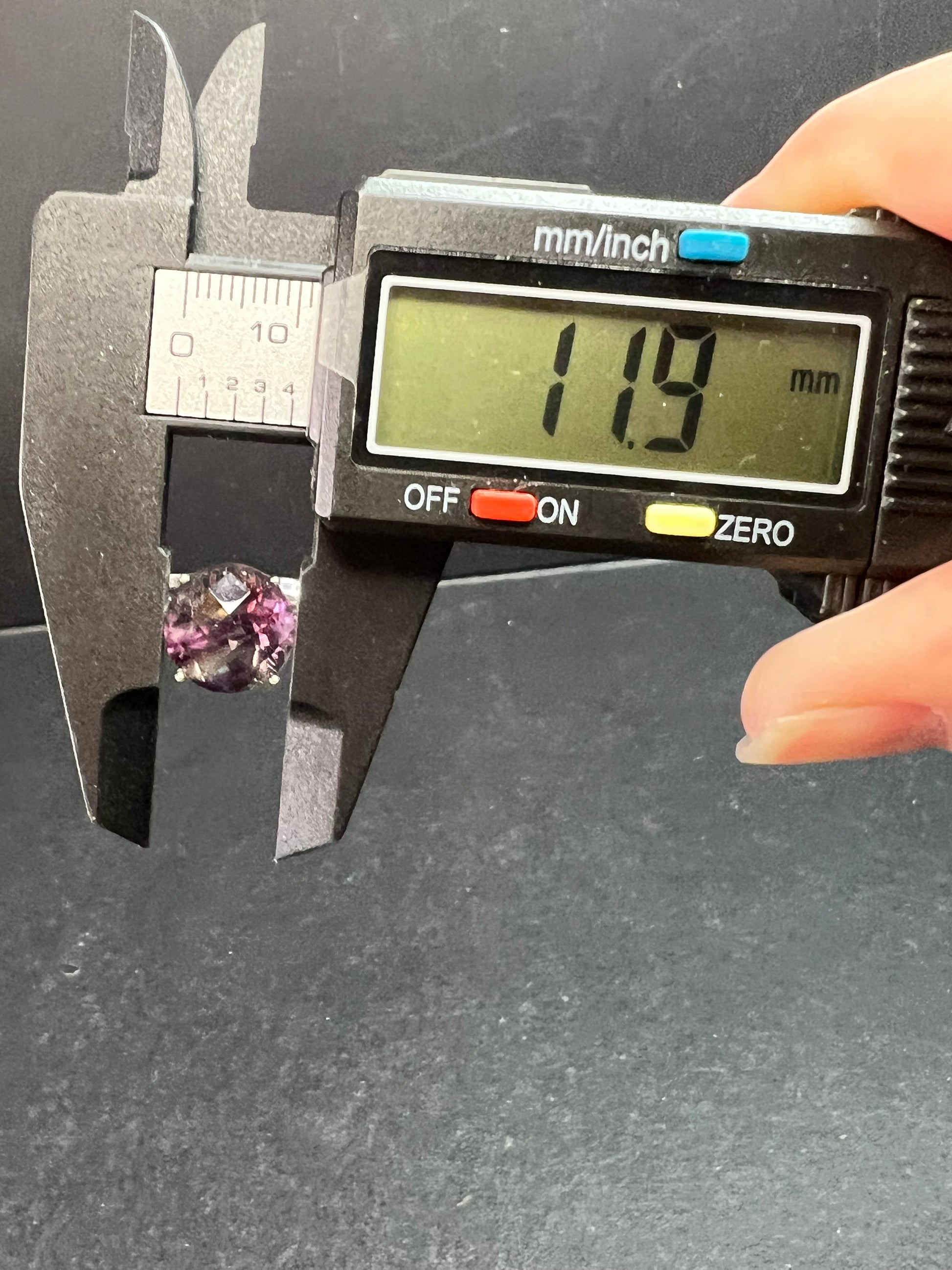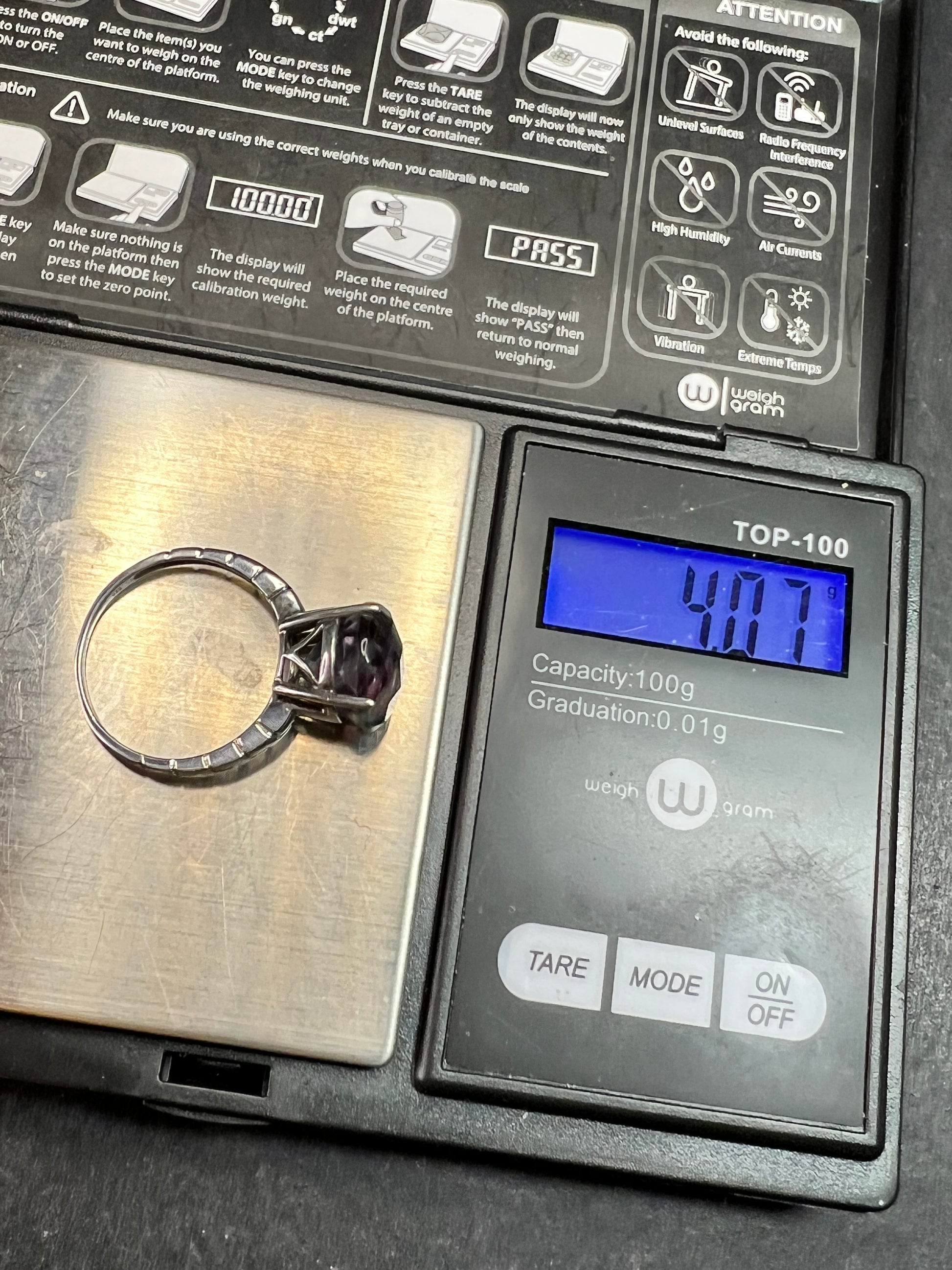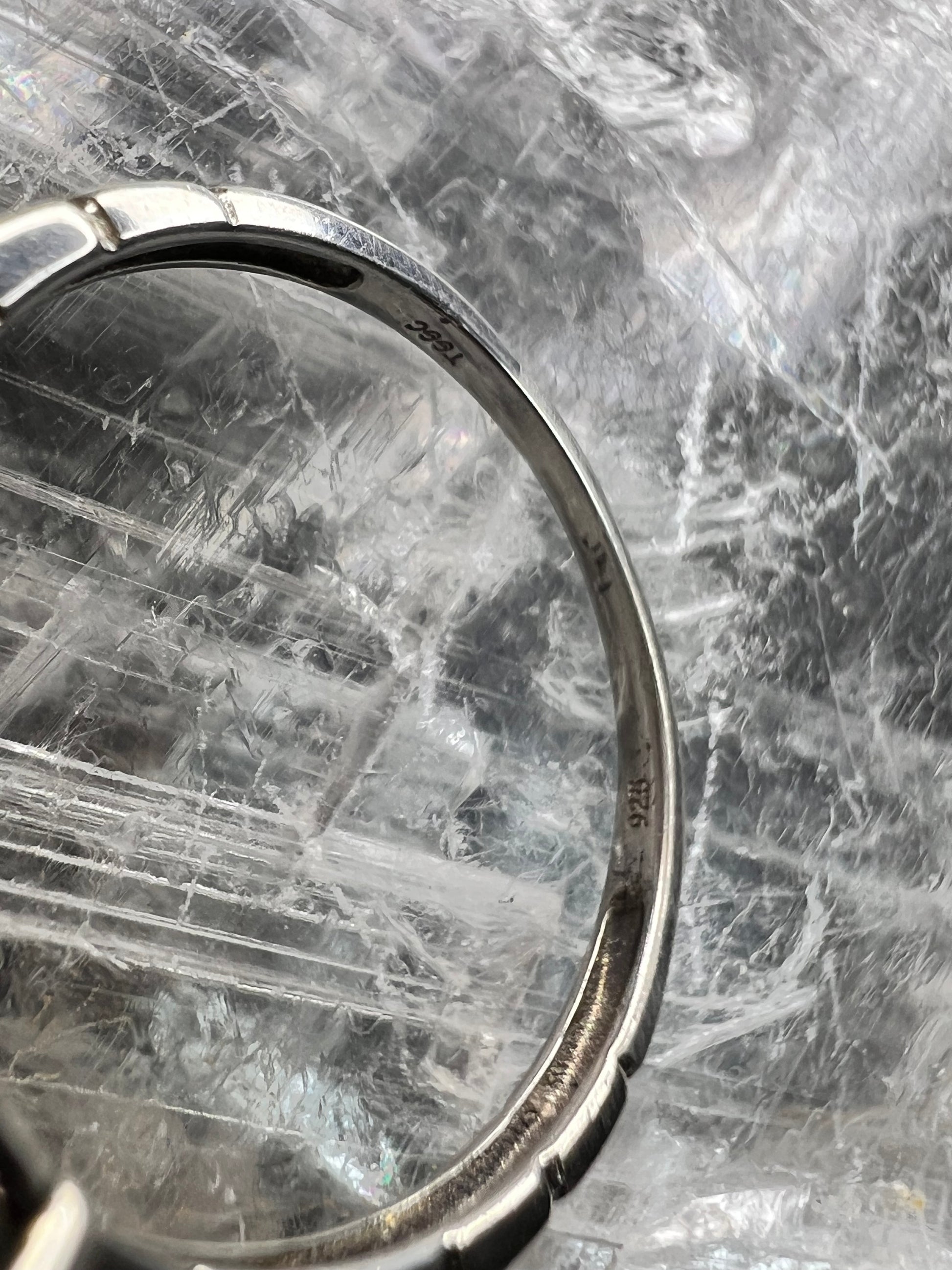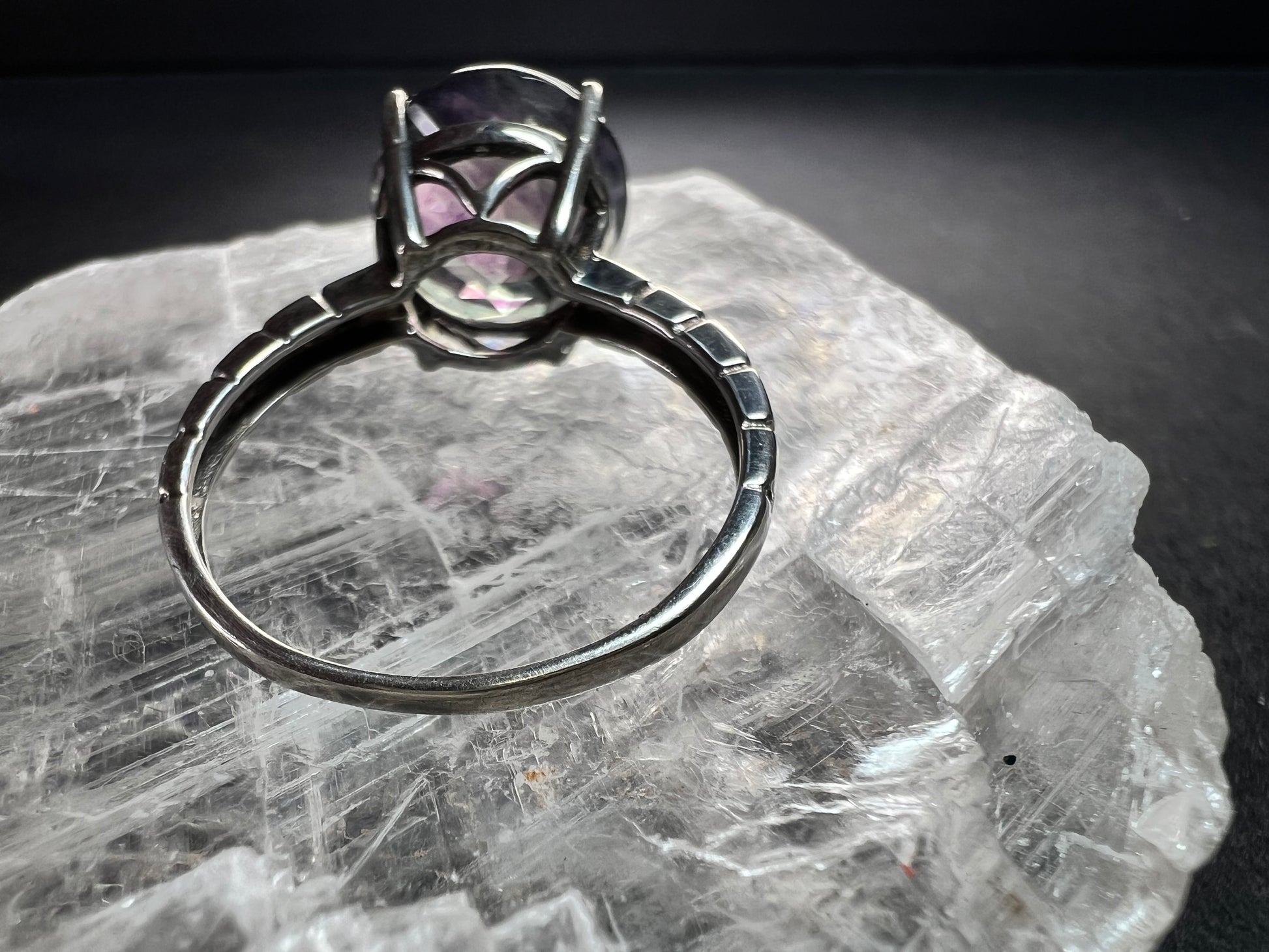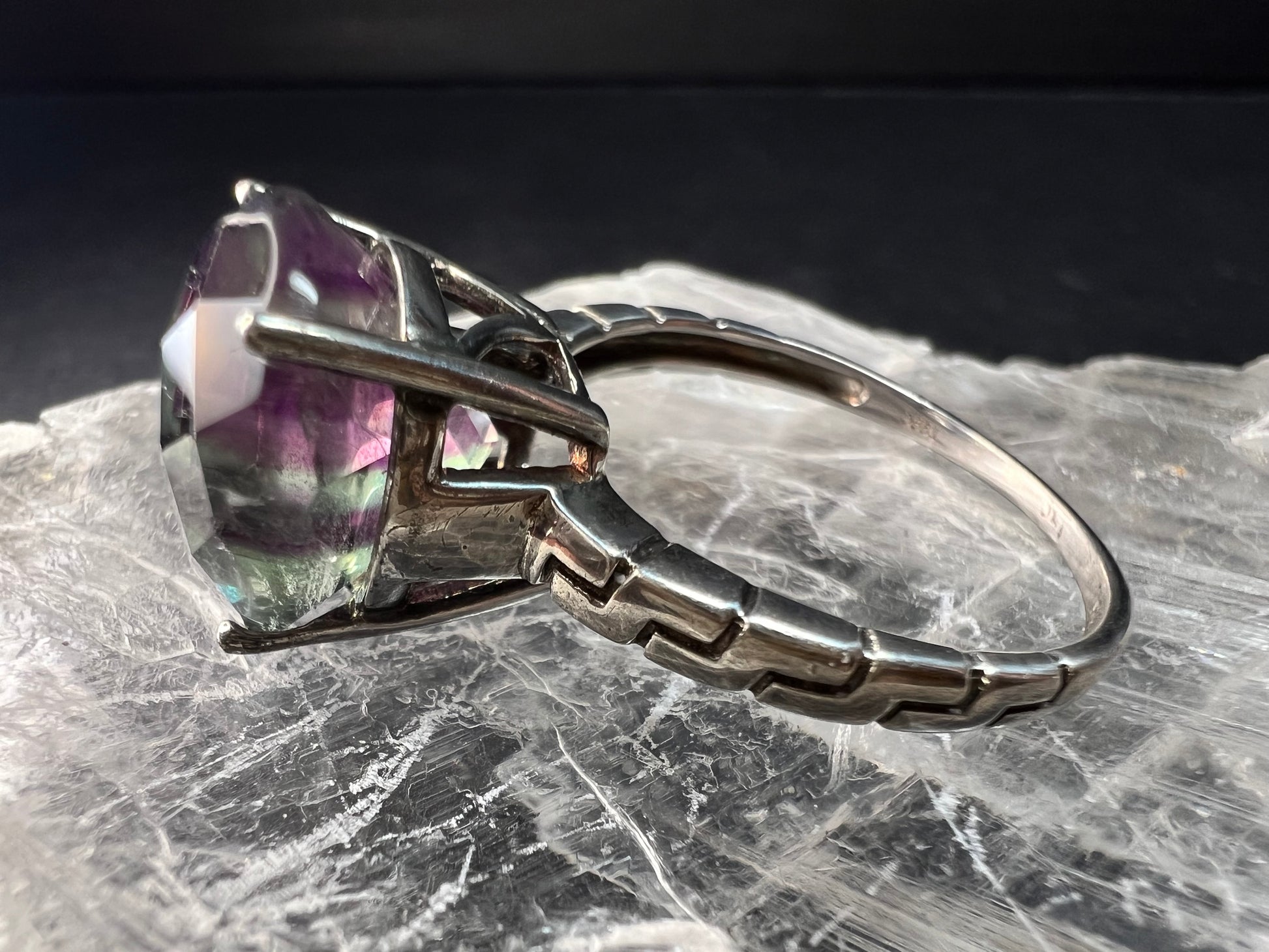 Vintage sterling silver ring stamped 925 TGGC featuring a large round faceted rainbow fluorite with beautiful natural purple and green zoning that shifts in different lighting. The stone is translucent and displays natural internal veils, growth lines, and feather-like inclusions typical of fluorite formation. These are internal characteristics and not surface damage. The surface of the stone appears smooth with no visible chips observed. Ring is size 9 and weighs 4.07 grams. Classic four-prong setting with a clean geometric style band. Gently pre-owned with light wear consistent with age.