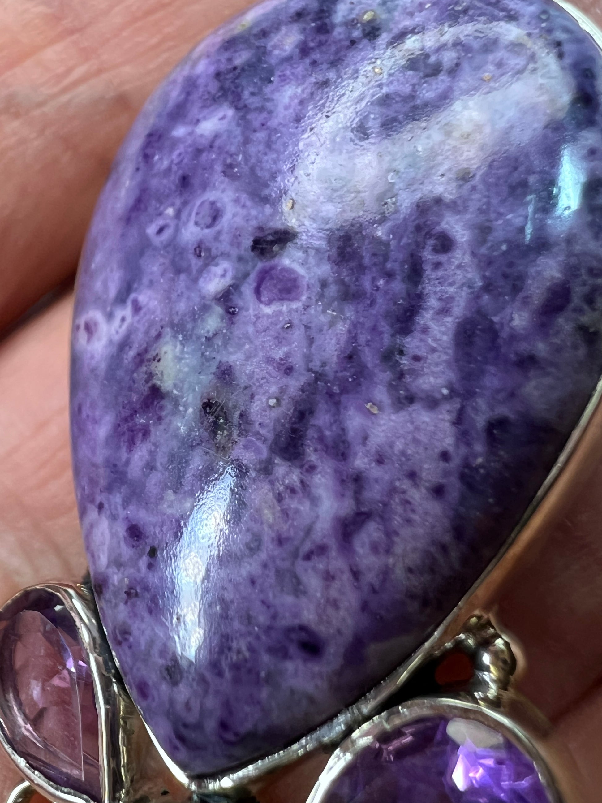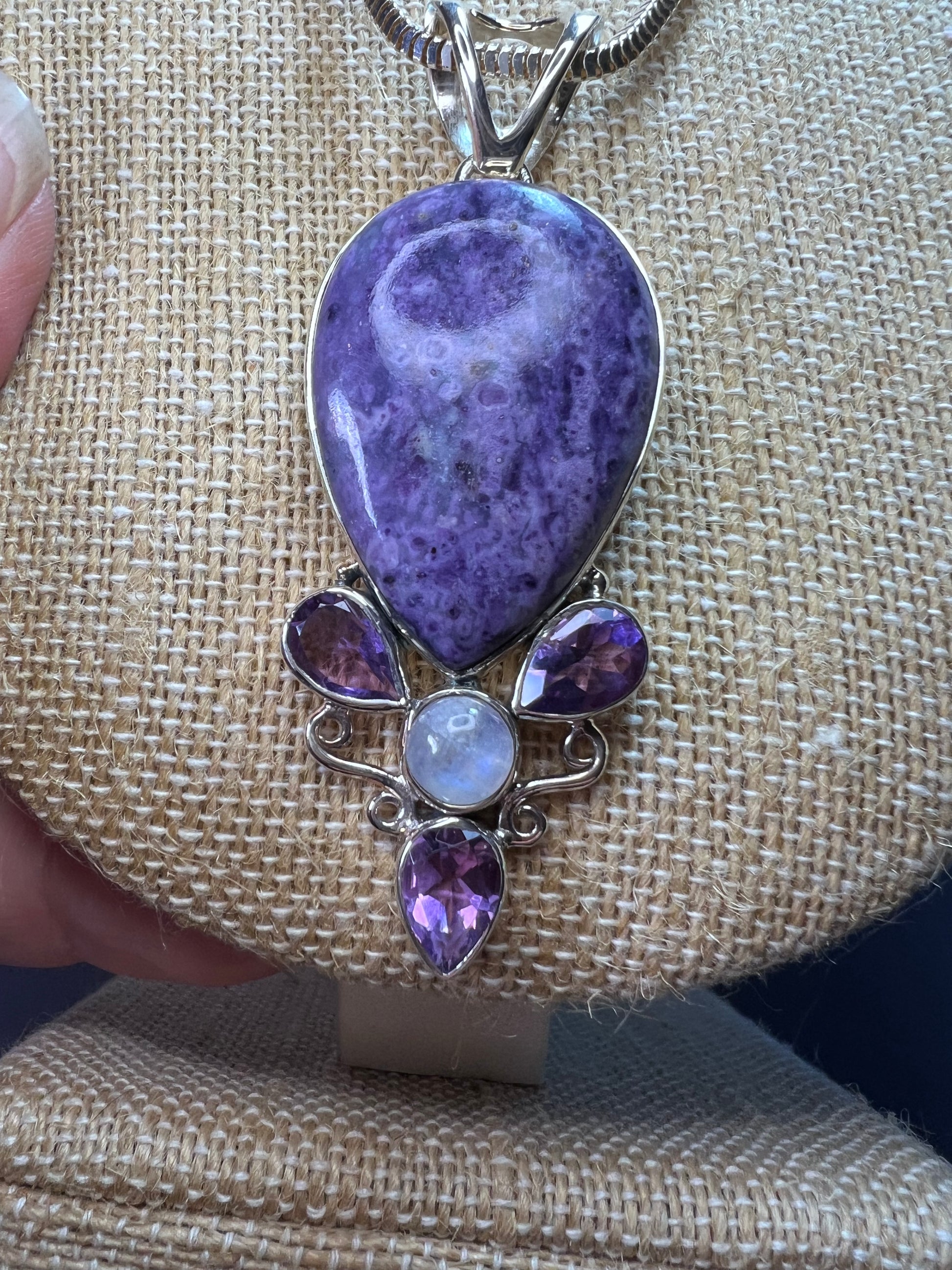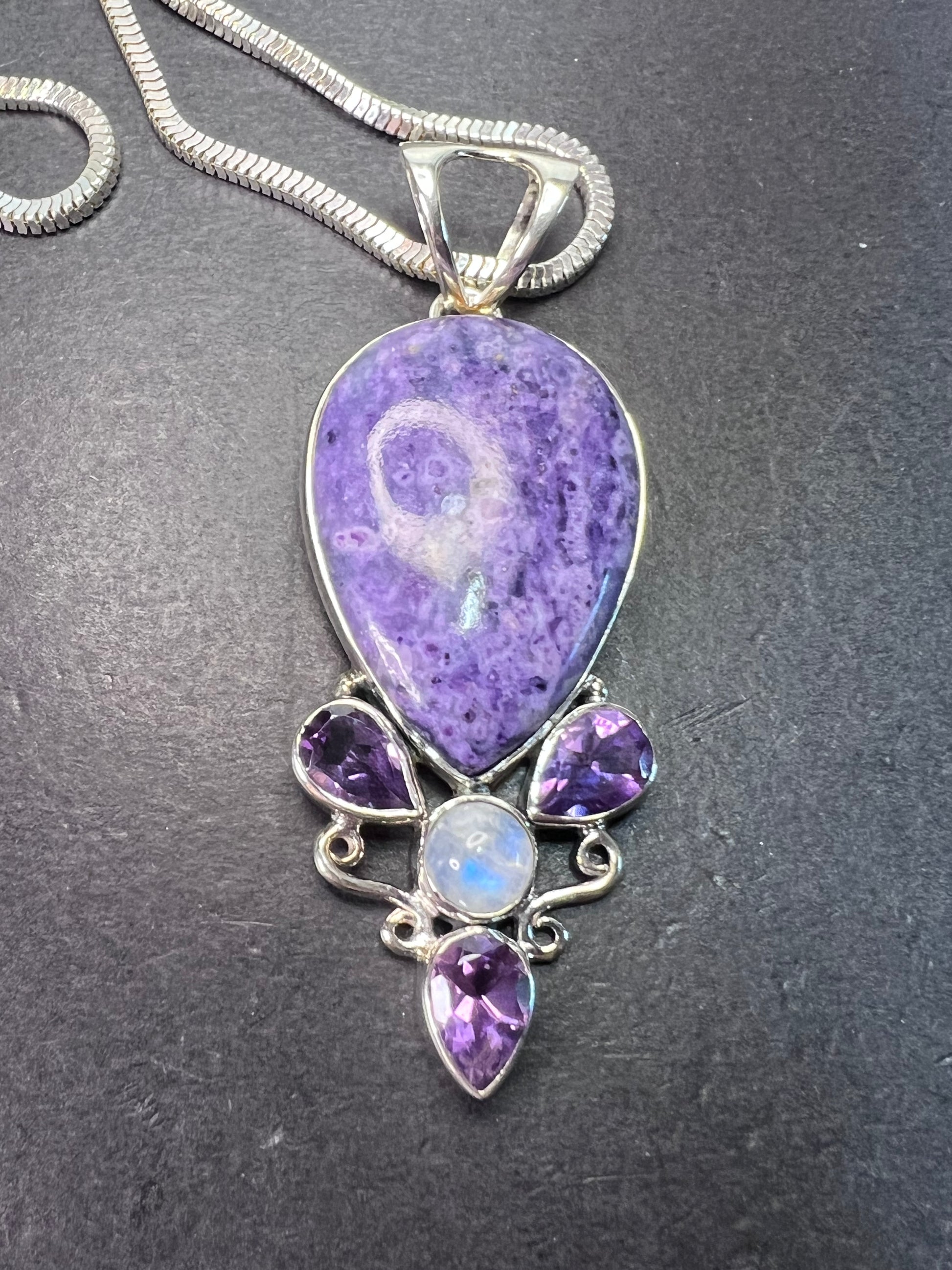 Made by Arya . Thick heavy sterling silver 20 inch chain. Big purple stone is stichtite . Smaller purple stones are amethyst. Rainbow moonstone in the middle. This is very well made and built to last