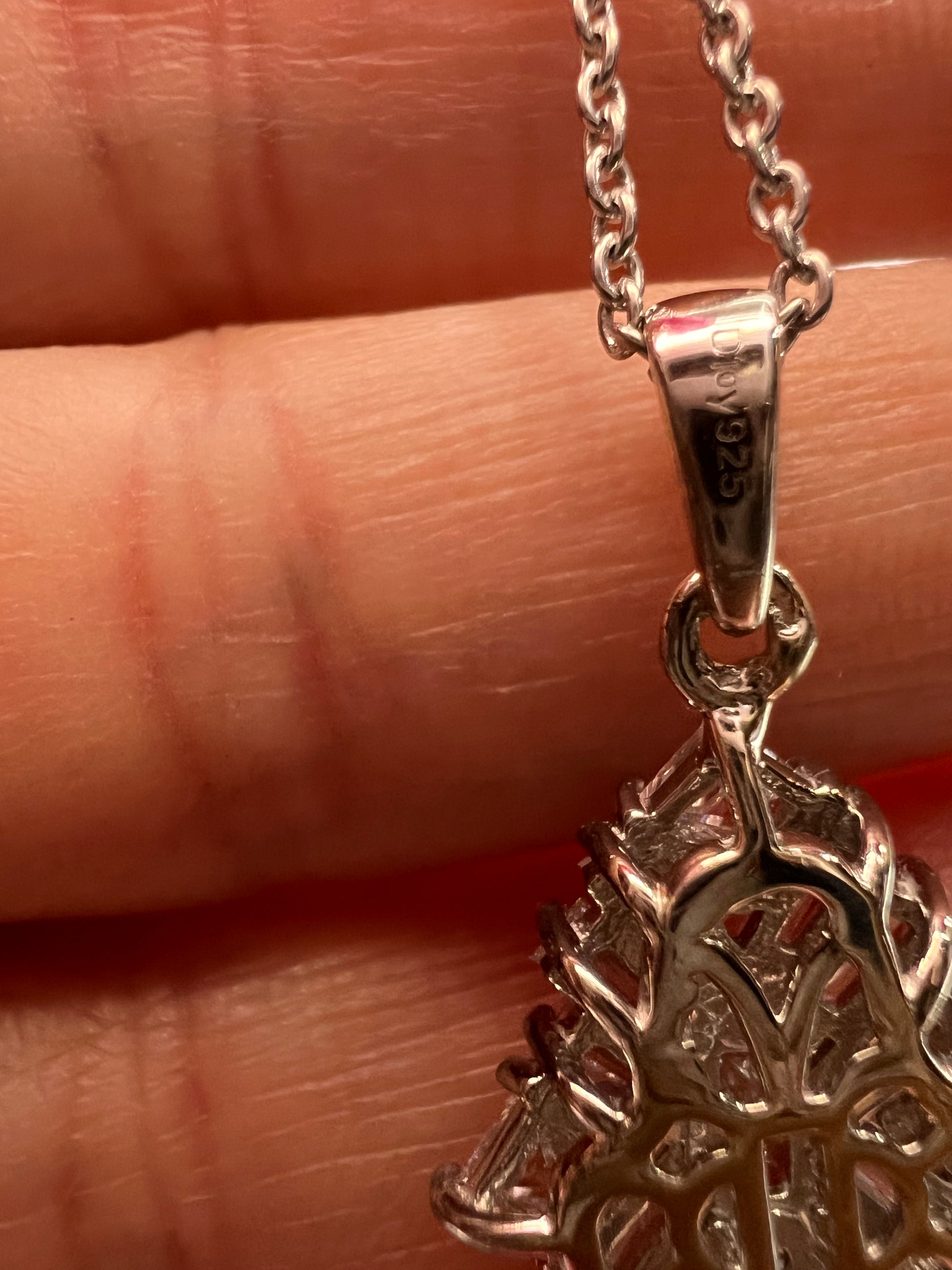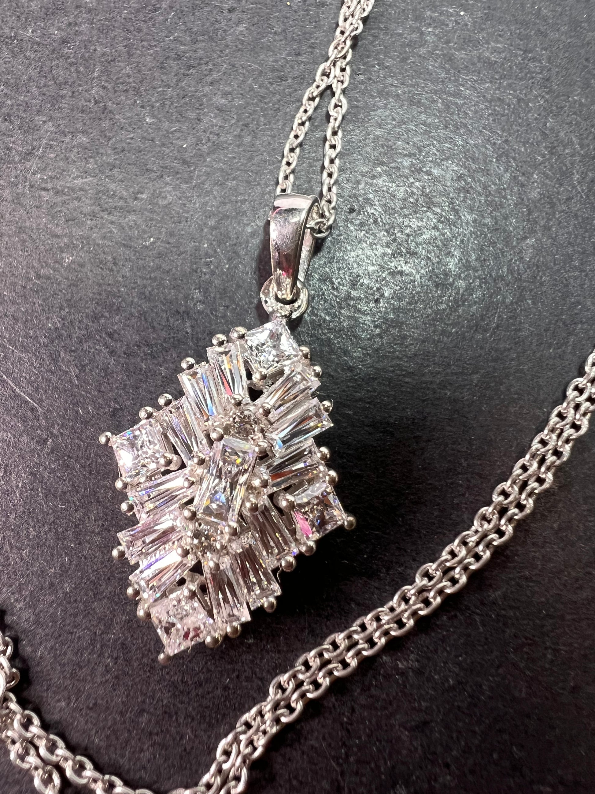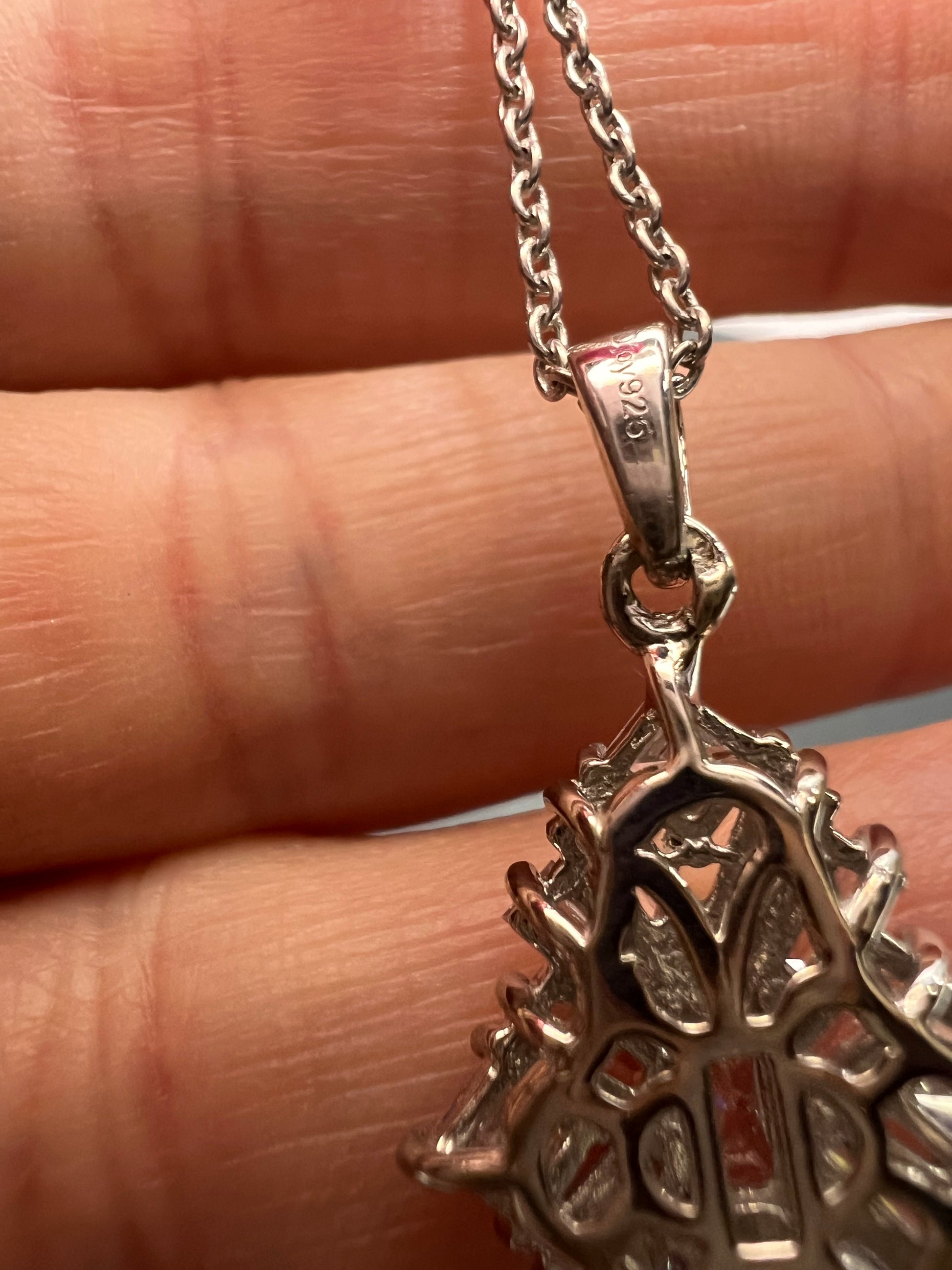 Swarovski cubic zirconias in a prong set rhodium over sterling silver setting. Chain measures 20 inches and is 925 too.